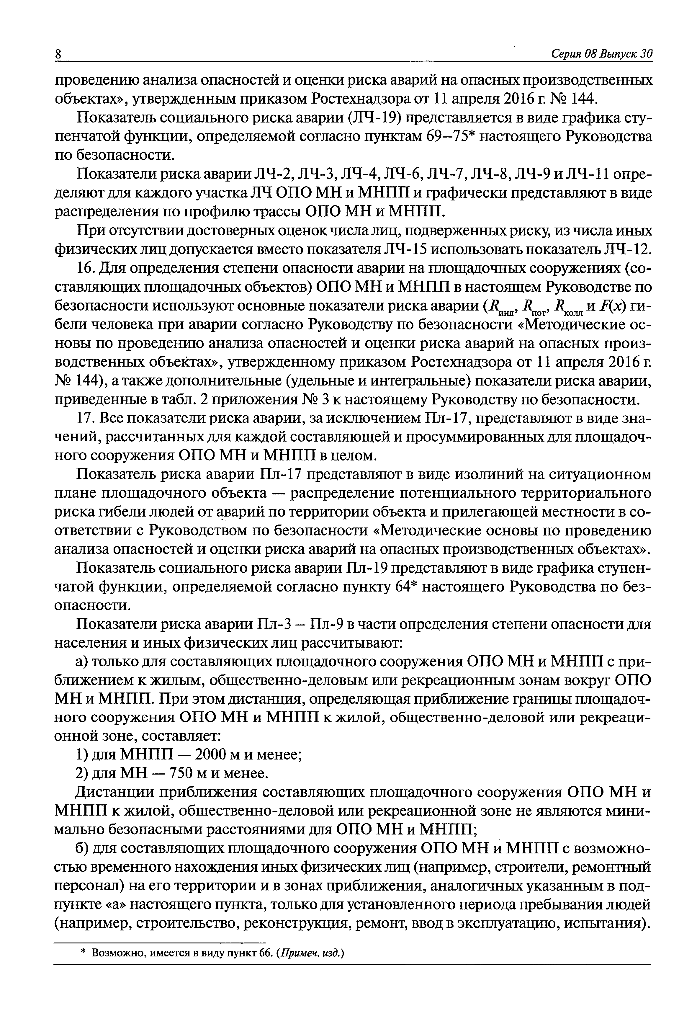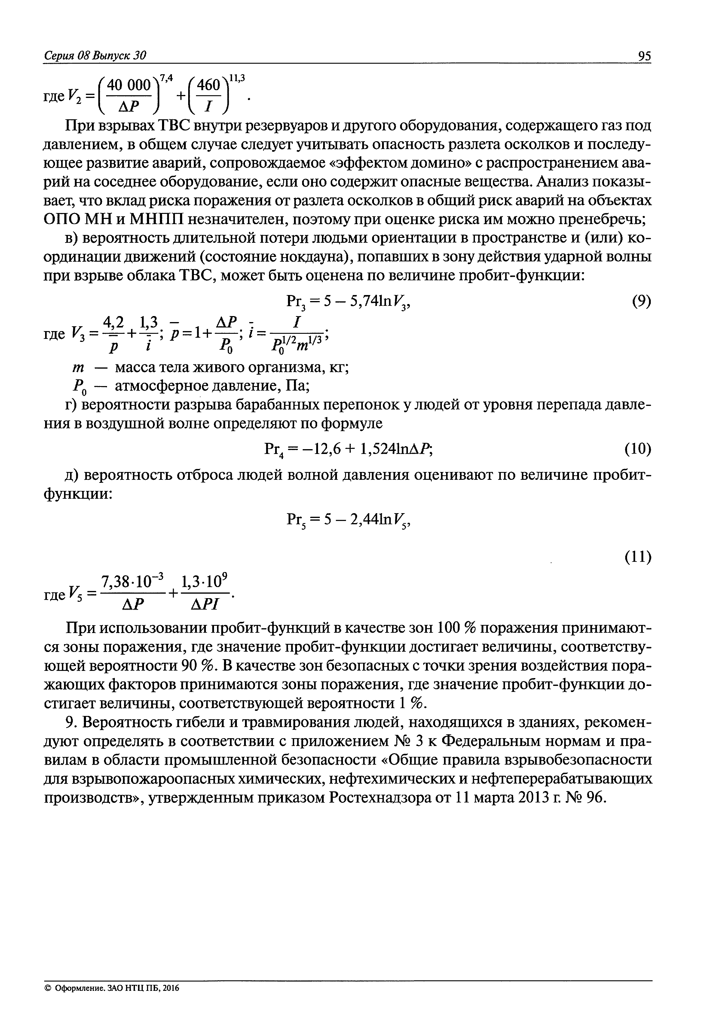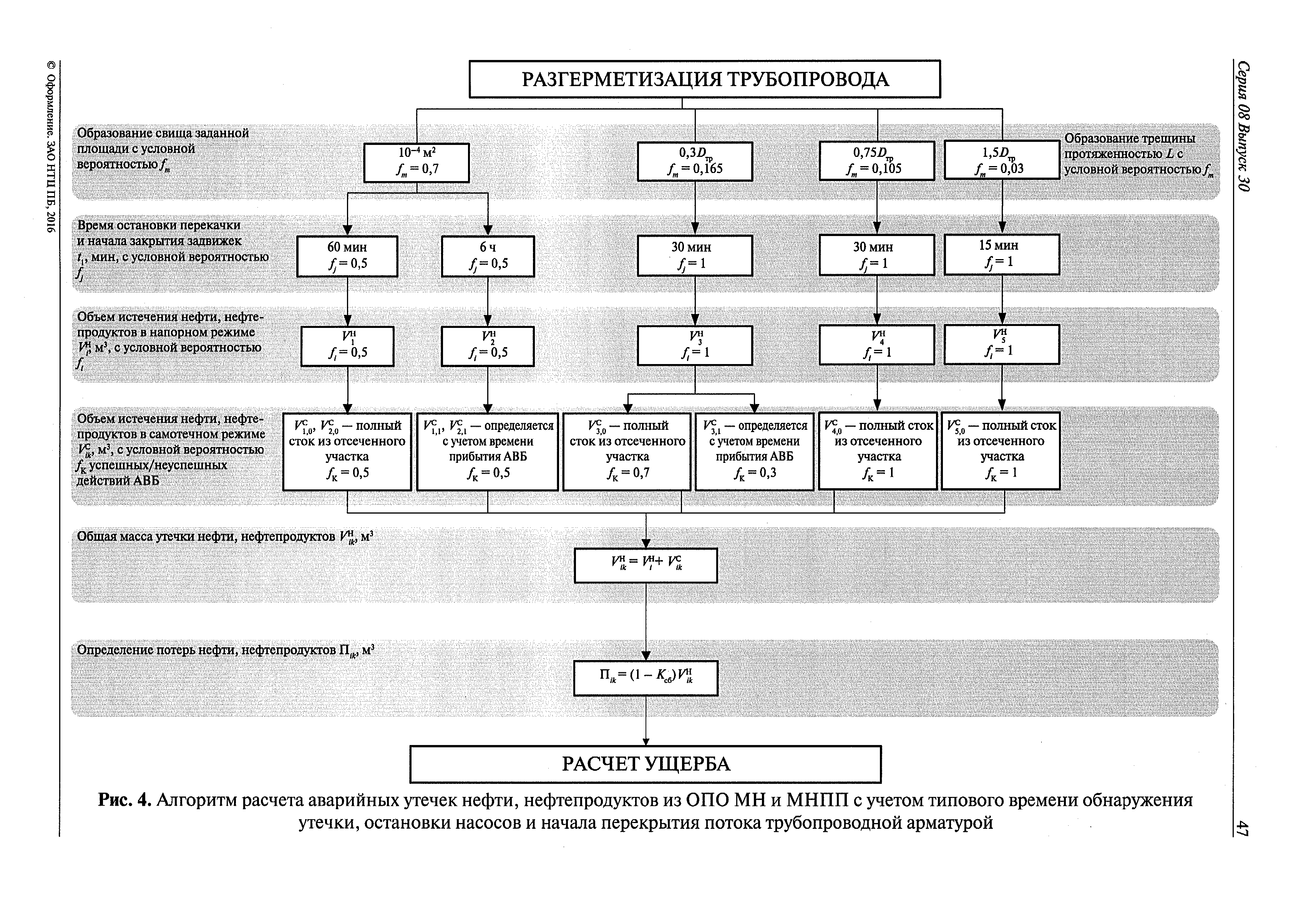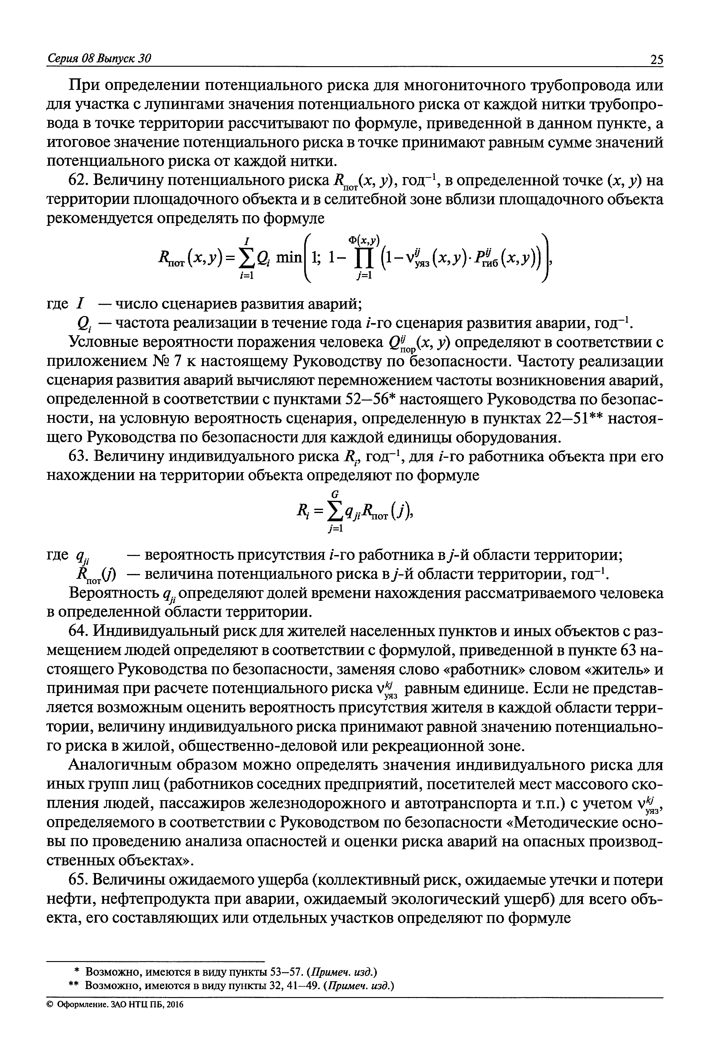 | Оглавление: | I Общие положения II Методические принципы оценки риска авария на опасных производственных объектах магистральных нефтепроводов и магистральных нефтепродуктопроводов III Этапы проведения количественного анализа риска аварий на опасных производственных объектах магистральных нефтепроводов и магистральных нефтепродуктопроводов IV Типовые сценарии аварий на площадочных сооружениях опасных производственных объектов магистральных нефтепроводов и магистральных нефтепродуктопроводов V Количественная оценка риска аварий на опасных производственных объектах магистральных нефтепроводов и магистральных нефтепродуктопроводов. Оценка частоты возможных сценариев аварий VI Оформление результатов количественного анализа риска аварий на опасных производственных объектах магистральных нефтепроводов и магистральных нефтепродуктопроводов Приложение 1. Перечень используемых сокращений и обозначений Приложение 2. Термины и их определения Приложение 3. Рисунки и таблицы Приложение 4. Перечень исходной информации, необходимой для проведения количественного анализа риска аварий на ОНО МН и МНПП Приложение 5. Балльная оценка факторов влияния состояния ОНО МН и МНПП на степень риска аварий Приложение 6. Оценка частоты аварий на линейной части ОНО МН и МНПП Приложение 7. Расчет вероятных зон действия поражающих факторов аварий Приложение 8. Расчет показателей риска аварий Приложение 9. Расчет объемов выброса нефти (нефтепродуктов) и площадей разлива при авариях на линейной части ОНО МН и МНПП и площадочных сооружениях ОНО МН и МНПП |