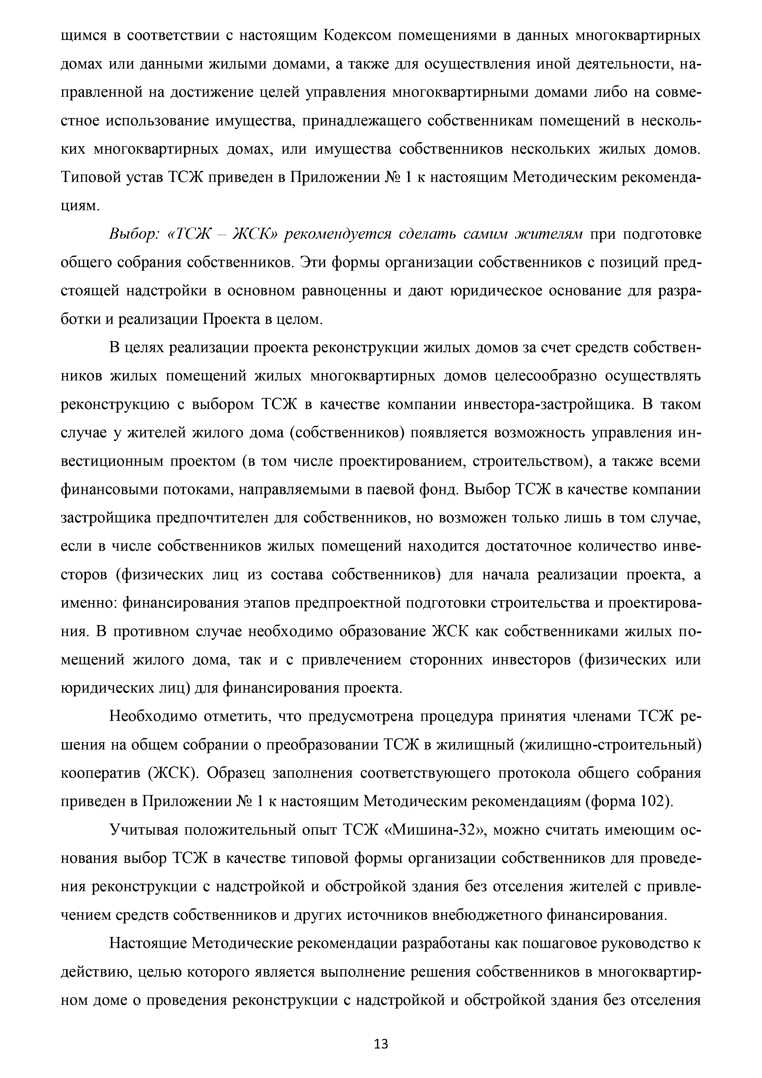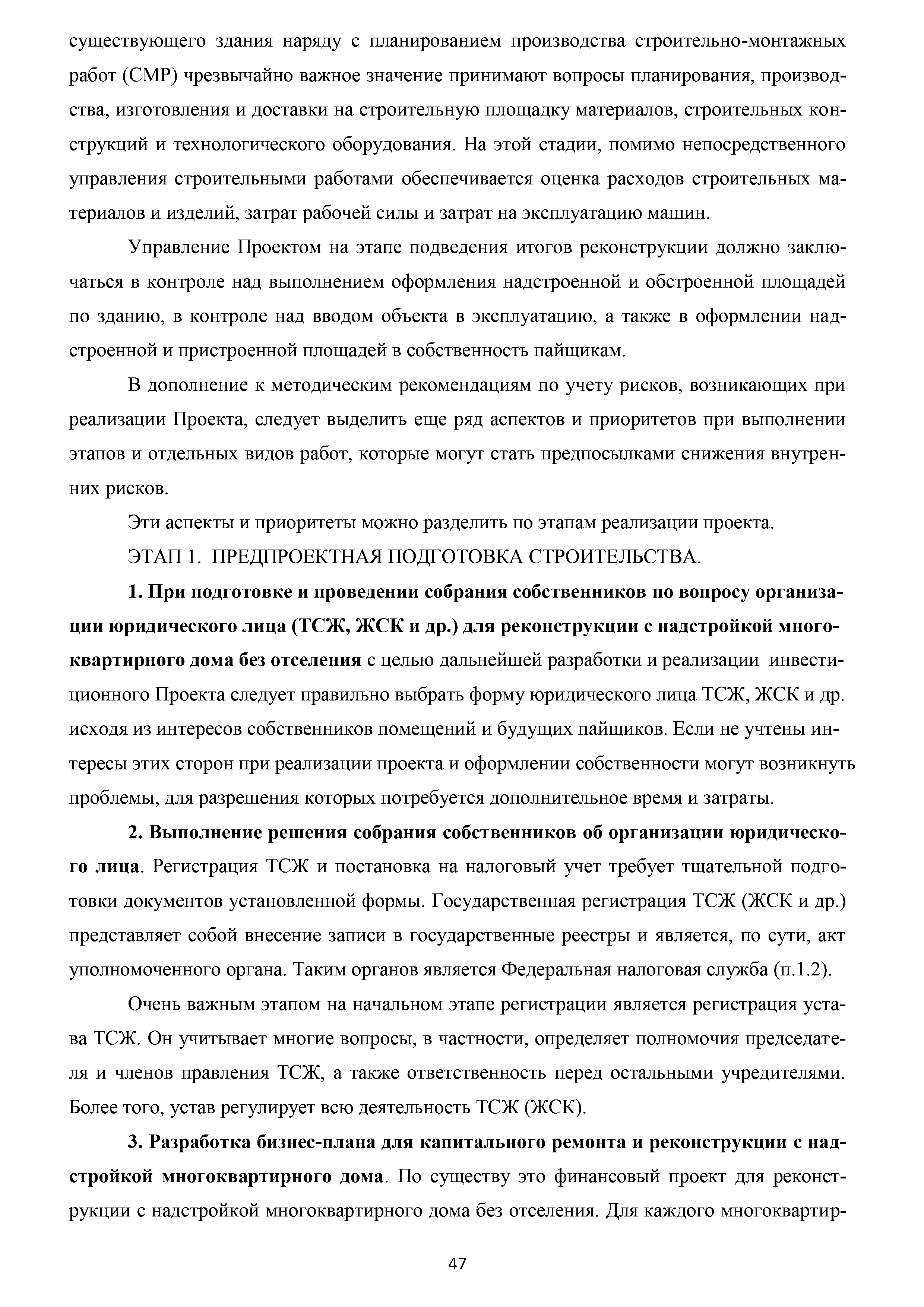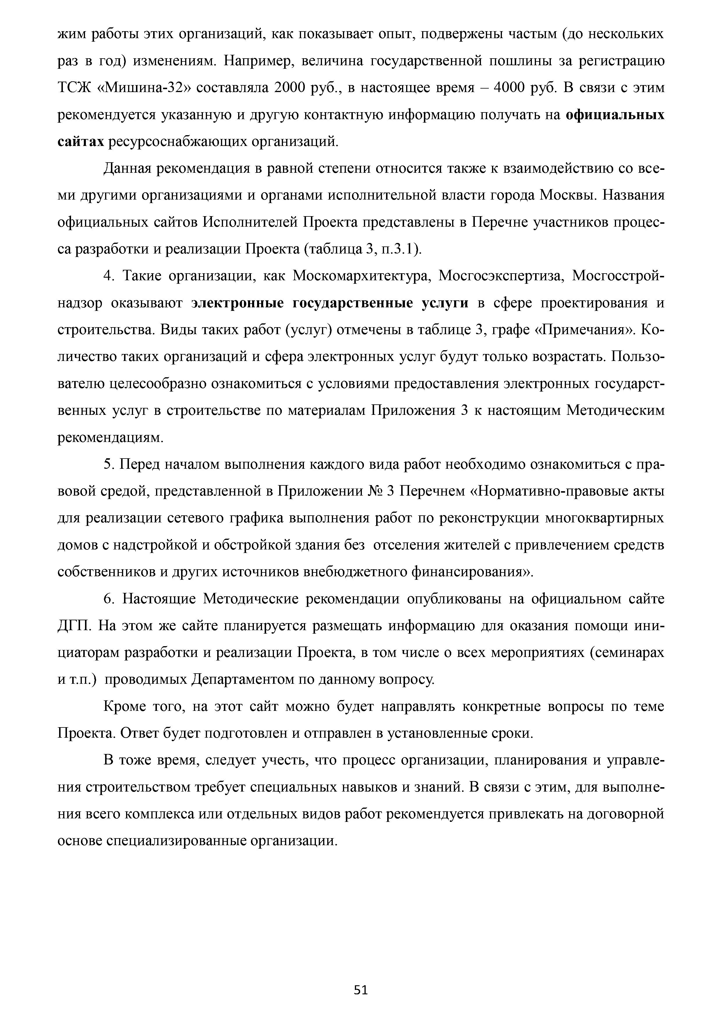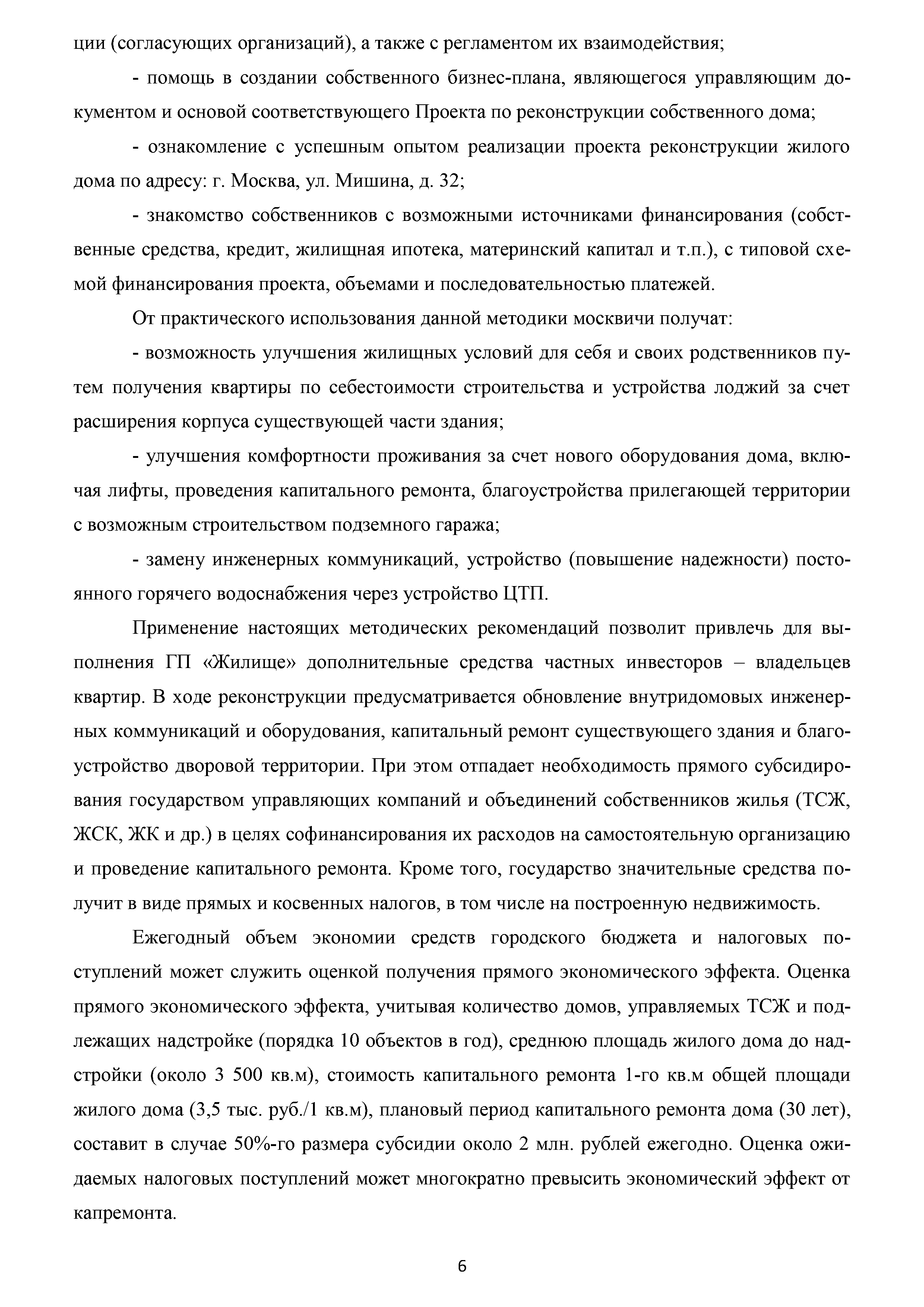 | Оглавление: | Аннотация Пояснительная записка Актуальность и значимость разработки Методических рекомендаций Цели и задачи Методических рекомендаций. Ожидаемый результат от их использования Область применения Характеристики типового жилого дома до и после реконструкции с надстройкой и обстройкой здания Содержание Методических рекомендаций по разработке и реализации проектов реконструкции жилых домов с надстройкой и обстройкой здания без отселения жителей с привлечением средств собственников и других источников внебюджетного финансирования 1. Формы организации жителей жилого дома, необходимые для разработки и реализации проекта реконструкции жилых домов с надстройкой и обстройкой здания без отселения жителей с привлечением средств собственников и других источников внебюджетного финансирования. Первые шаги 1.1. Шаг 1-й. Подготовка и проведение собрания собственников по вопросу организации юридического лица (ТСЖ и др.) с целью дальнейшей разработки и реализации Проекта 1.2. Шаг 2-й. Выполнение решения собрания собственников об организации юридического лица. Регистрация ТСЖ и постановка на налоговый учет 2. Участники процесса разработки и реализации Проекта 3. Этапы, стадии (группы) и виды работ. Сетевой график и законодательно-нормативная база выполнения работ 3.1. Перечень этапов, стадий и видов работ 3.2. Типовой сетевой график выполнения работ 4. Шаг 3-й. Методические рекомендации по бизнес-планированию разработки и реализации Проекта 4.1. Введение в бизнес-планирование 4.2. Рекомендации о последовательности подготовки и содержании бизнес-плана 4.3. Рекомендации по анализу рынка жилой недвижимости 4.4. Источники финансирования и финансовое планирование 4.4.1. Источники финансирования 4.4.2. Финансовое планирование 4.4.3. Типовая финансовая схема на примере ТСЖ «Мишина-32» 4.5. Риски. Рекомендации по управлению Проектом 5. Дальнейшие шаги. Взаимодействие коллектива собственников с ресурсоснабжающими и другими организациями, органами исполнительной власти города Москвы при разработке и реализации Проекта Приложение № 1. Типовые формы и образцы документов, используемых при разработке и реализации Проекта Приложение № 2. Нормативно-правовые акты для реализации сетевого графика выполнения работ по реконструкции многоквартирных домов с надстройкой и обстройкой здания без отселения жителей с привлечением средств собственников и других источников внебюджетного финансирования Приложение № 3. Условия предоставления электронных государственных услуг в строительстве |