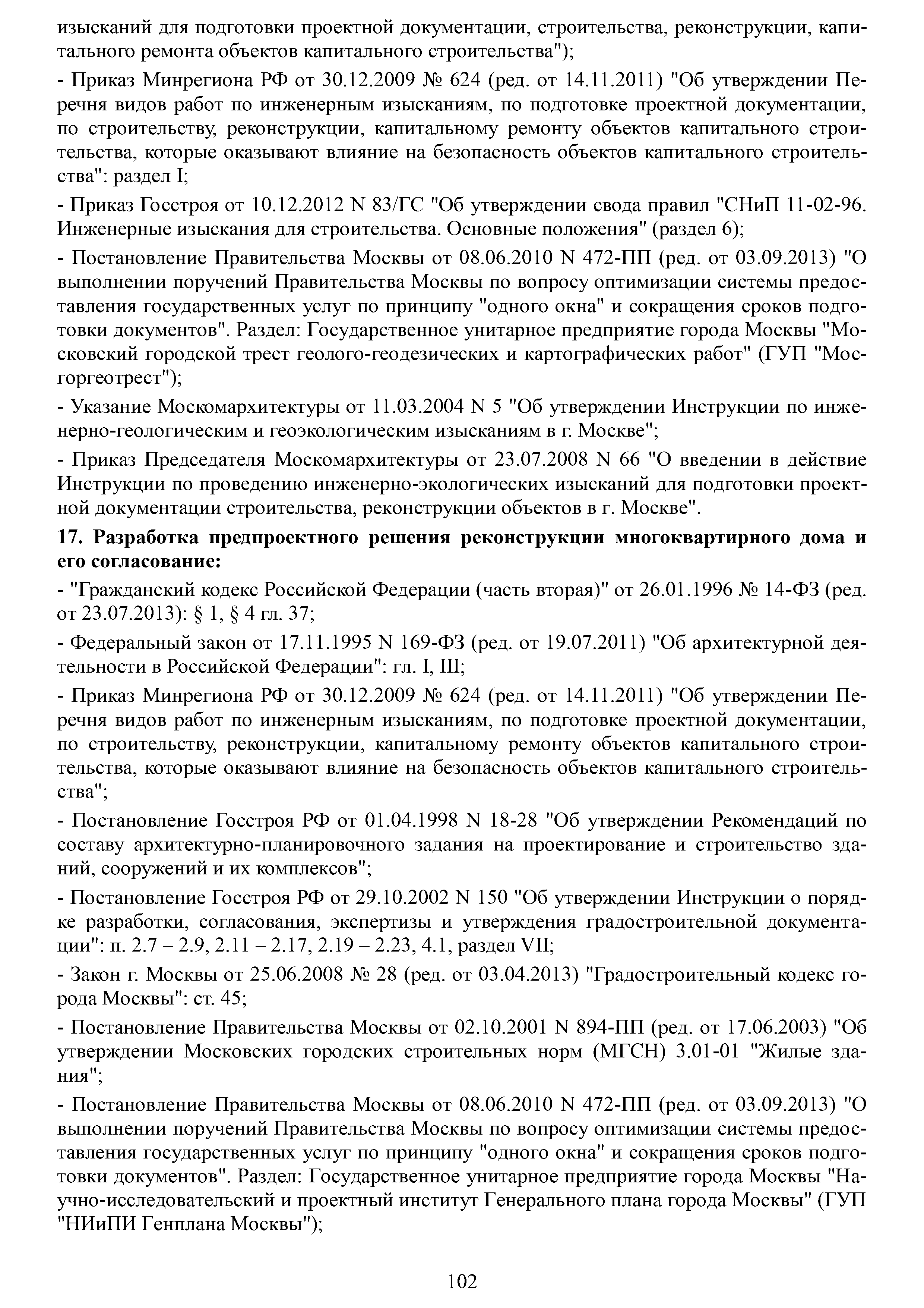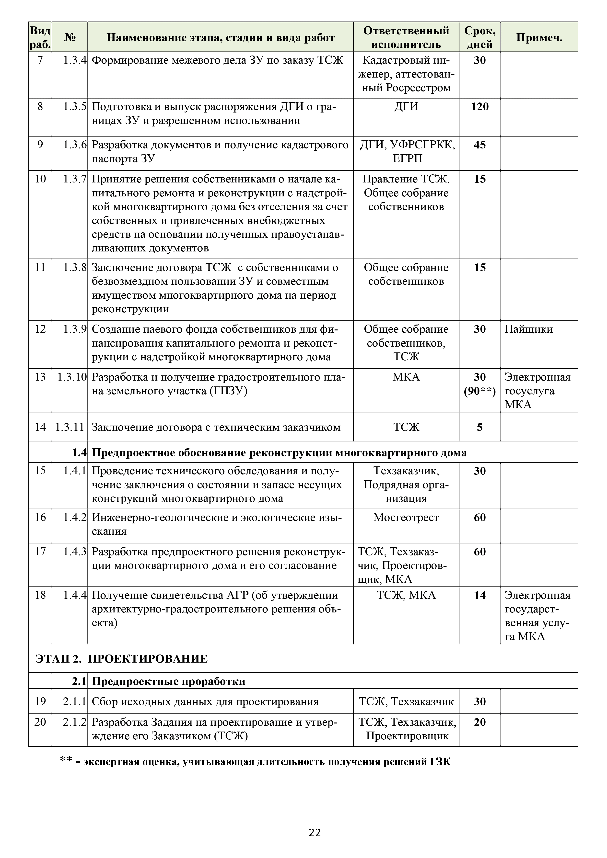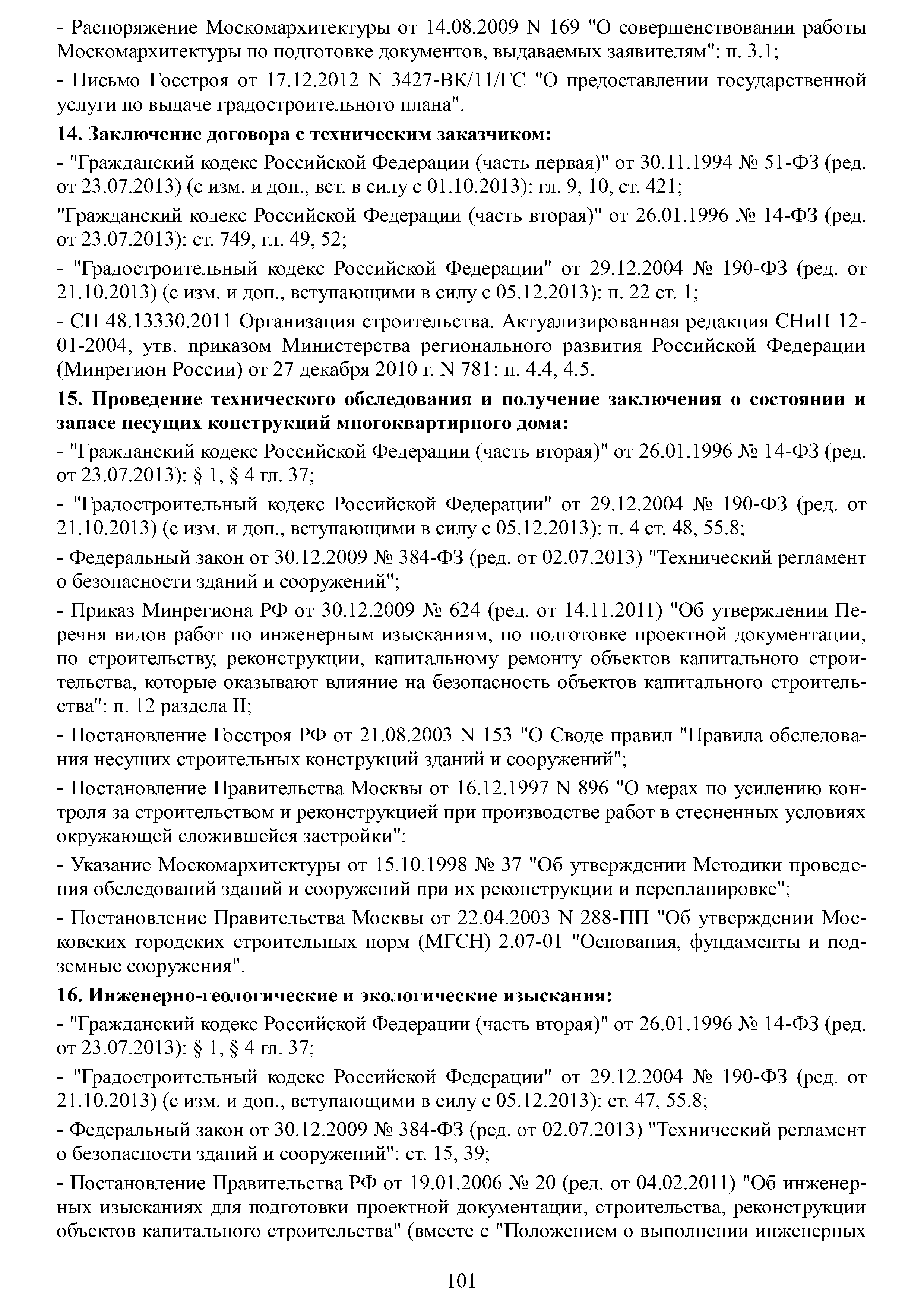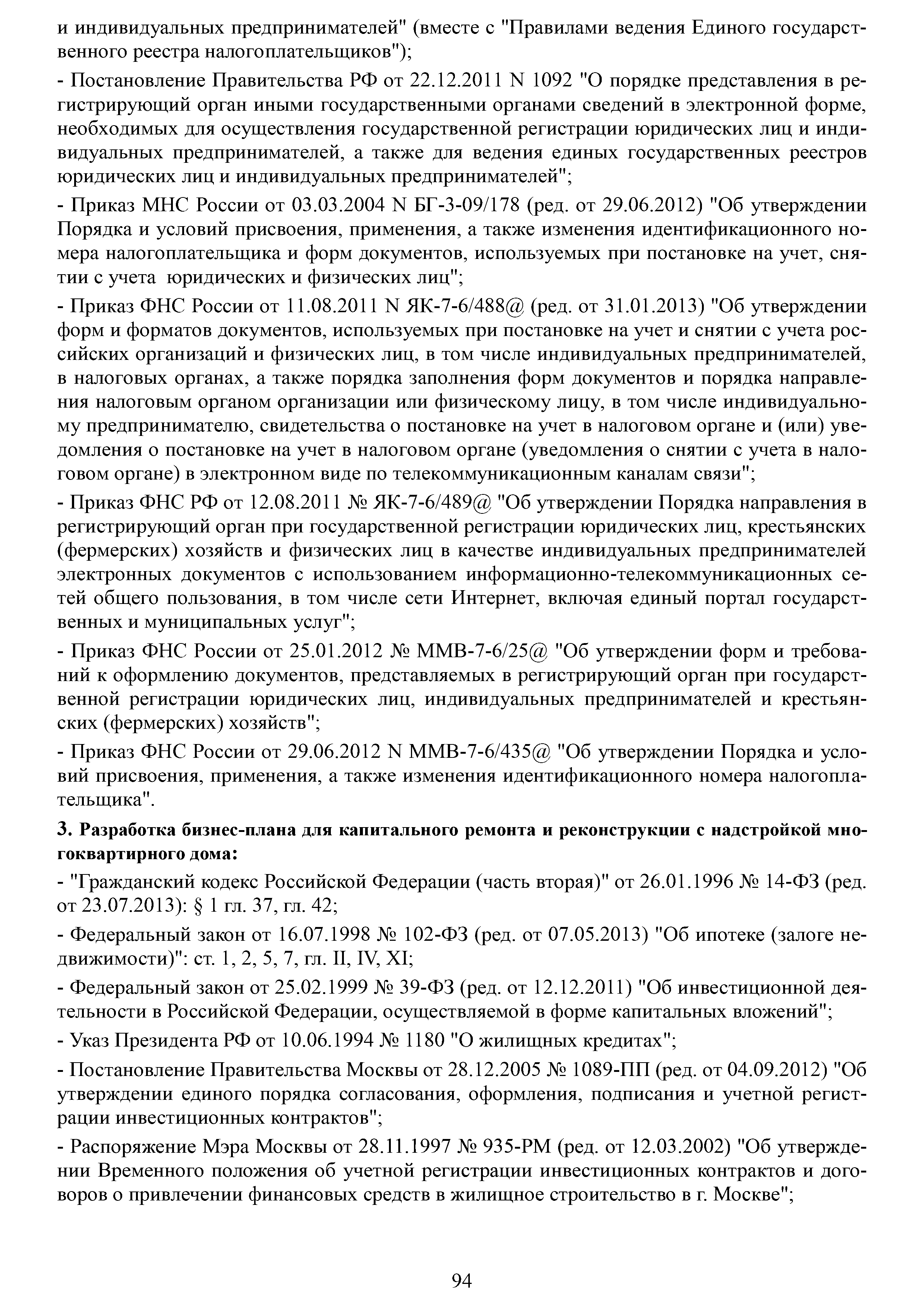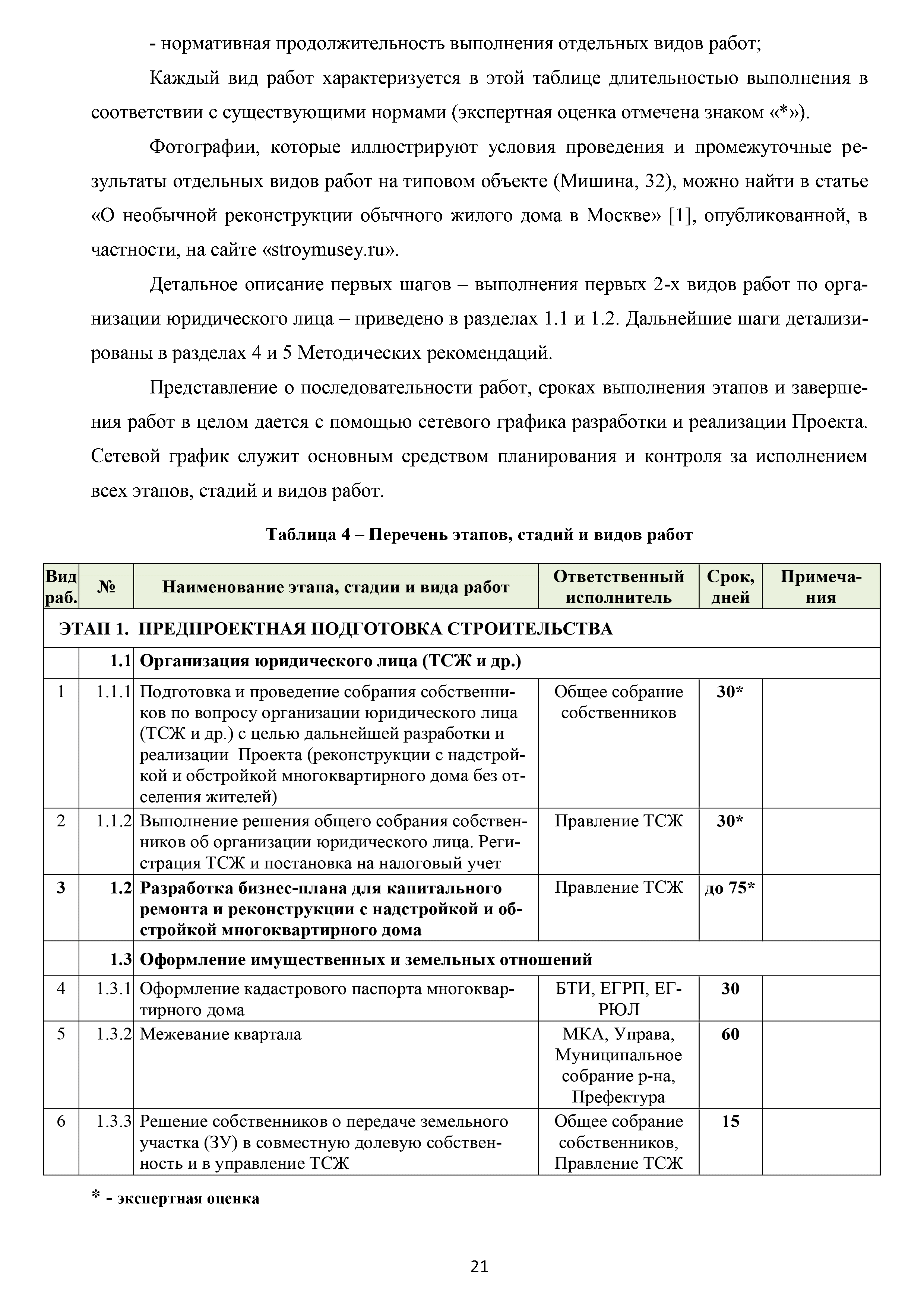 | Оглавление: | Аннотация Пояснительная записка Актуальность и значимость разработки Методических рекомендаций Цели и задачи Методических рекомендаций. Ожидаемый результат от их использования Область применения Характеристики типового жилого дома до и после реконструкции с надстройкой и обстройкой здания Содержание Методических рекомендаций по разработке и реализации проектов реконструкции жилых домов с надстройкой и обстройкой здания без отселения жителей с привлечением средств собственников и других источников внебюджетного финансирования 1. Формы организации жителей жилого дома, необходимые для разработки и реализации проекта реконструкции жилых домов с надстройкой и обстройкой здания без отселения жителей с привлечением средств собственников и других источников внебюджетного финансирования. Первые шаги 1.1. Шаг 1-й. Подготовка и проведение собрания собственников по вопросу организации юридического лица (ТСЖ и др.) с целью дальнейшей разработки и реализации Проекта 1.2. Шаг 2-й. Выполнение решения собрания собственников об организации юридического лица. Регистрация ТСЖ и постановка на налоговый учет 2. Участники процесса разработки и реализации Проекта 3. Этапы, стадии (группы) и виды работ. Сетевой график и законодательно-нормативная база выполнения работ 3.1. Перечень этапов, стадий и видов работ 3.2. Типовой сетевой график выполнения работ 4. Шаг 3-й. Методические рекомендации по бизнес-планированию разработки и реализации Проекта 4.1. Введение в бизнес-планирование 4.2. Рекомендации о последовательности подготовки и содержании бизнес-плана 4.3. Рекомендации по анализу рынка жилой недвижимости 4.4. Источники финансирования и финансовое планирование 4.4.1. Источники финансирования 4.4.2. Финансовое планирование 4.4.3. Типовая финансовая схема на примере ТСЖ «Мишина-32» 4.5. Риски. Рекомендации по управлению Проектом 5. Дальнейшие шаги. Взаимодействие коллектива собственников с ресурсоснабжающими и другими организациями, органами исполнительной власти города Москвы при разработке и реализации Проекта Приложение № 1. Типовые формы и образцы документов, используемых при разработке и реализации Проекта Приложение № 2. Нормативно-правовые акты для реализации сетевого графика выполнения работ по реконструкции многоквартирных домов с надстройкой и обстройкой здания без отселения жителей с привлечением средств собственников и других источников внебюджетного финансирования Приложение № 3. Условия предоставления электронных государственных услуг в строительстве |