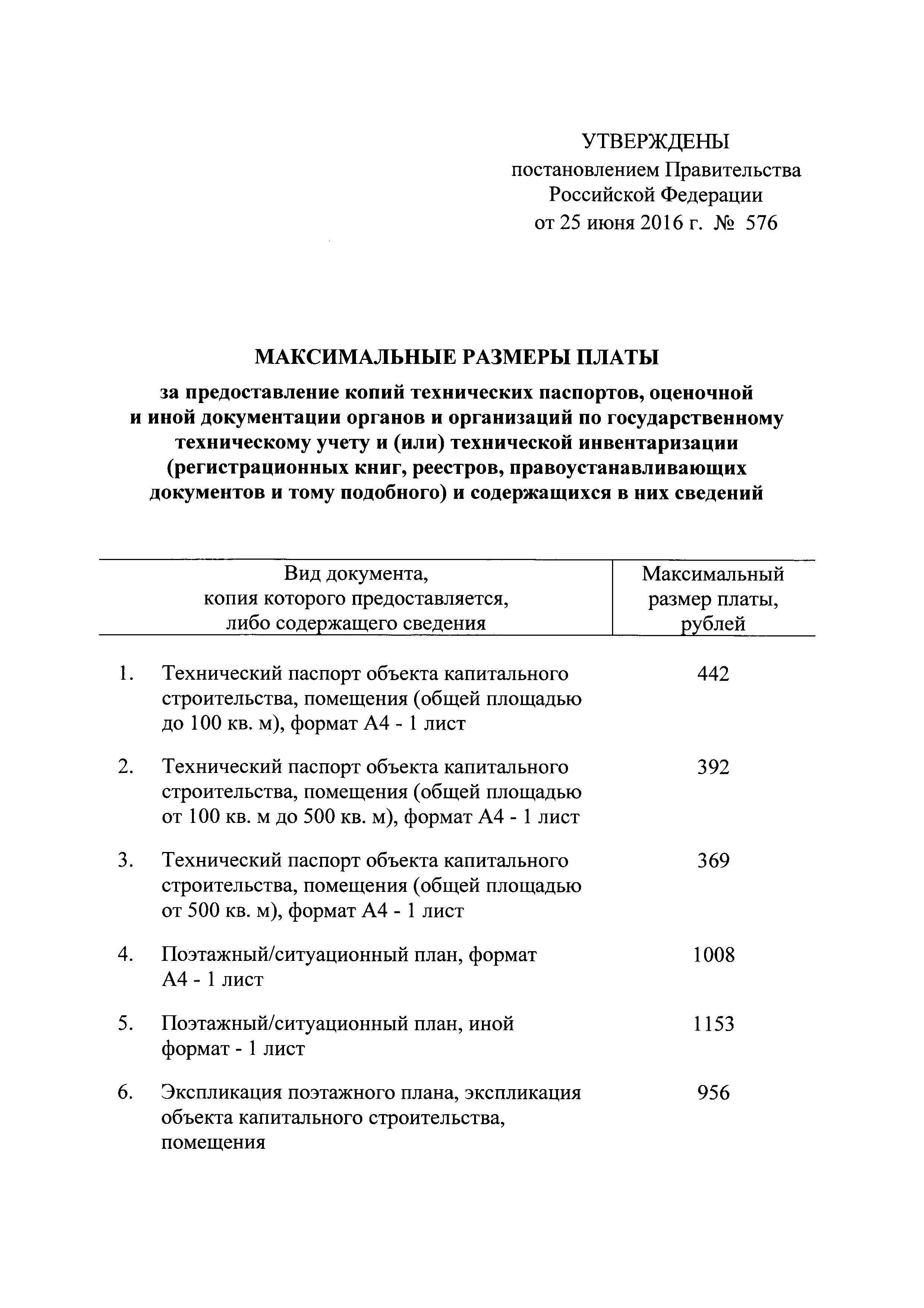 Максимальные размеры платы за предоставление копий технических паспортов, оценочной и иной документации органов и организаций по государственному техническому учету и (или) технической инвентаризации (регистрационных книг, реестров, правоустанавливающих документов и тому подобного) и содержащихся в них сведений| Статус: | действует | | Название рус.: | Максимальные размеры платы за предоставление копий технических паспортов, оценочной и иной документации органов и организаций по государственному техническому учету и (или) технической инвентаризации (регистрационных книг, реестров, правоустанавливающих документов и тому подобного) и содержащихся в них сведений | | Дата добавления в базу: | 01.02.2017 | | Дата актуализации: | 01.01.2021 | | Дата введения: | 06.07.2016 | | Утверждён: | 25.06.2016 Правительство Российской Федерации (576)