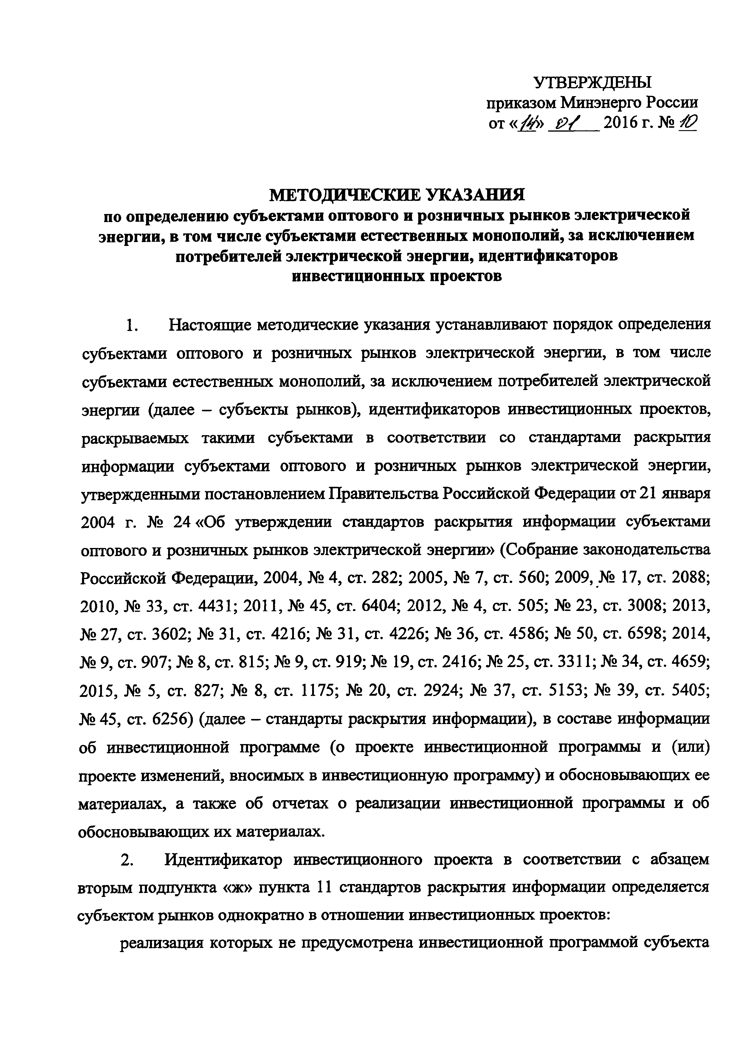 Методические указания по определению субъектами оптового и розничных рынков электрической энергии, в том числе субъектами естественных монополий, за исключением потребителей электрической энергии, идентификаторов инвестиционных проектов| Статус: | действует | | Название рус.: | Методические указания по определению субъектами оптового и розничных рынков электрической энергии, в том числе субъектами естественных монополий, за исключением потребителей электрической энергии, идентификаторов инвестиционных проектов | | Дата добавления в базу: | 01.02.2017 | | Дата актуализации: | 01.01.2021 | | Дата введения: | 17.06.2016 | | Утверждён: | 14.01.2016 Министерство энергетики РФ (Russian Federation Ministry of Energy 10)