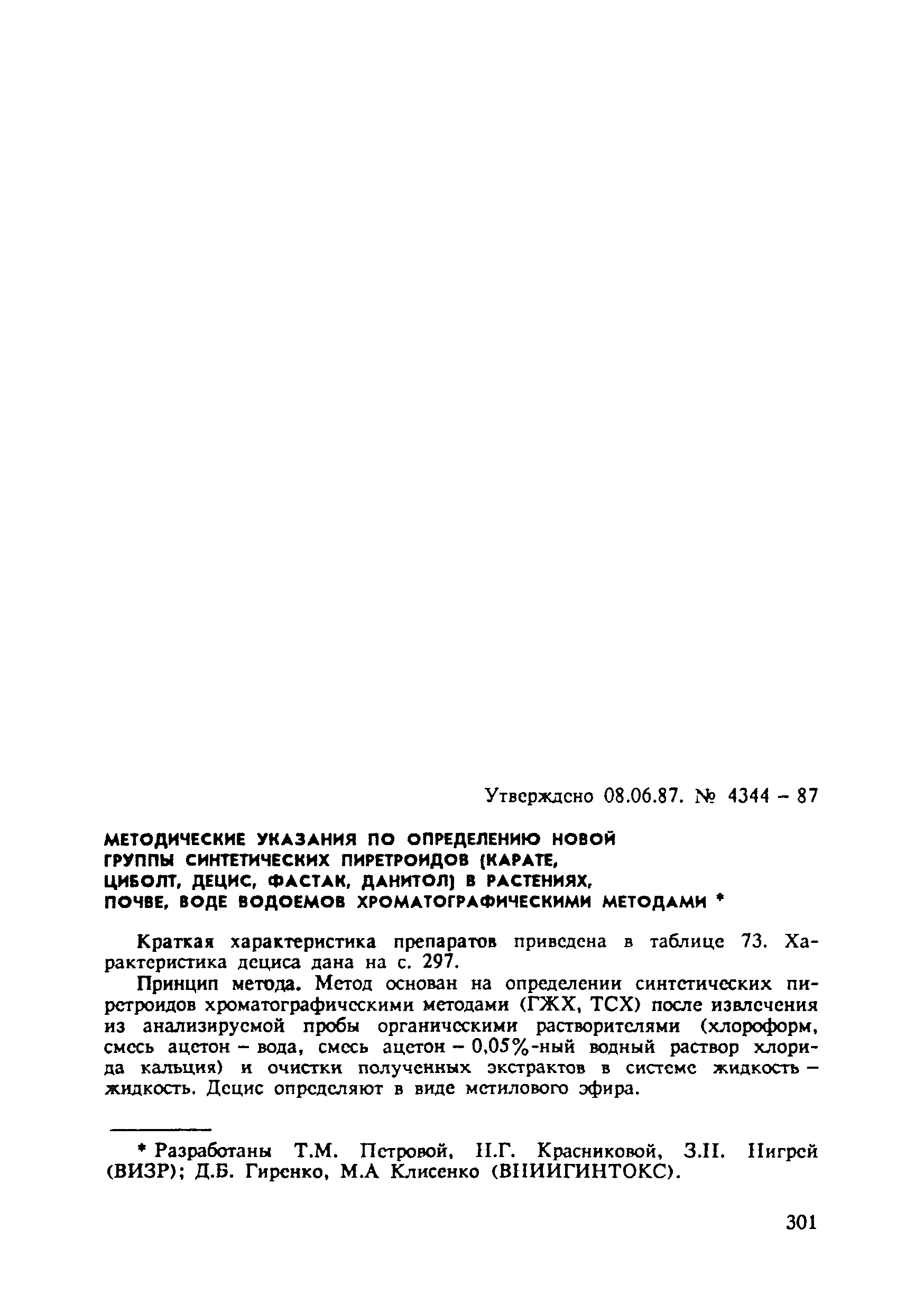 Методические указания по определению новой группы синтетических пиретроидов (карате, циболт, децис, фастак, данитол) в растениях, почве, воде водоемов хроматографическими методами| Статус: | действует | | Название рус.: | Методические указания по определению новой группы синтетических пиретроидов (карате, циболт, децис, фастак, данитол) в растениях, почве, воде водоемов хроматографическими методами | | Дата добавления в базу: | 01.02.2017 | | Дата актуализации: | 01.01.2021 | | Оглавление: | Характеристика синтетических пиретроидов Метрологическая характеристика методов определения синтетических пиретроидов Время удержания пиретроидов на различных колонках | | Разработан: | ВНИИГИНТОКС ВИЗР