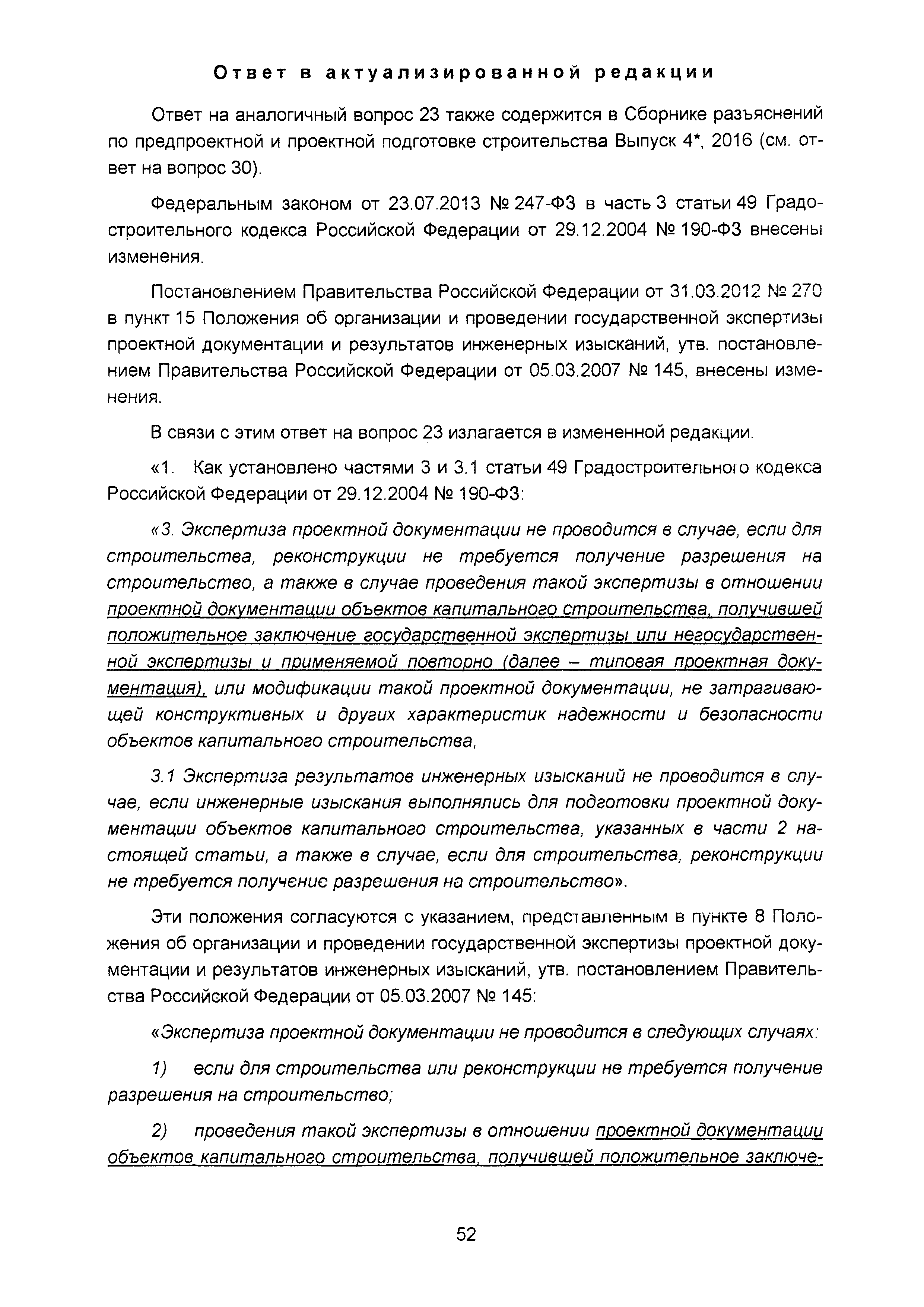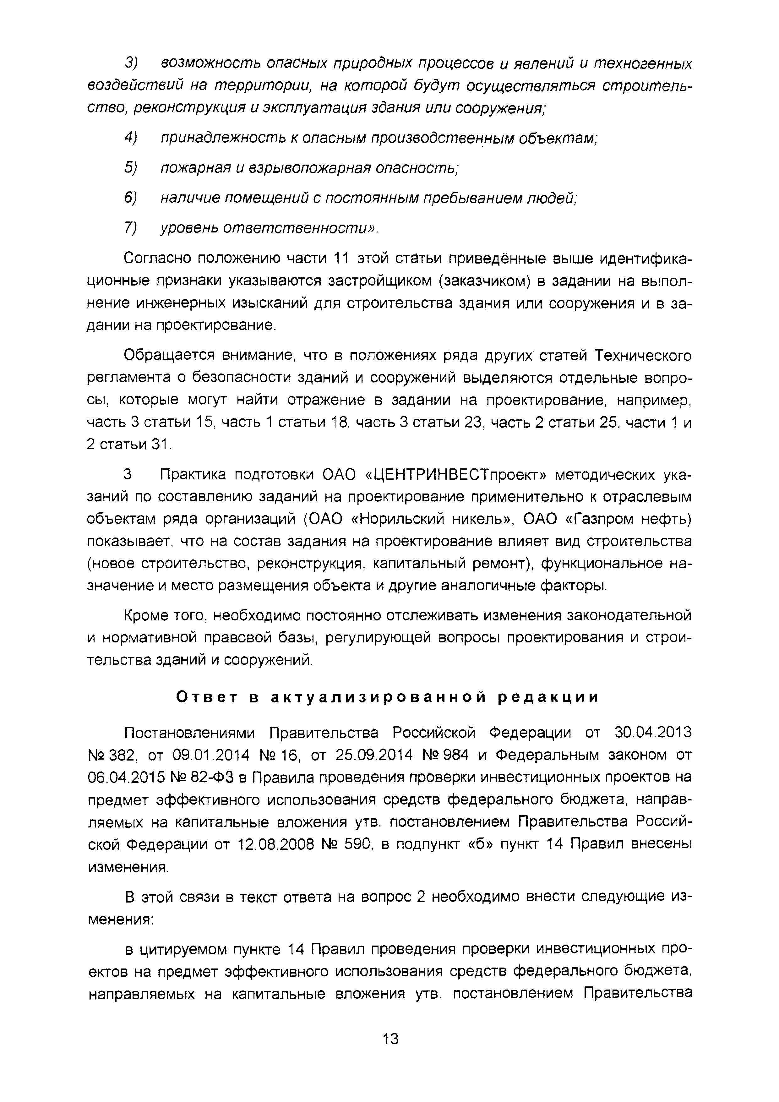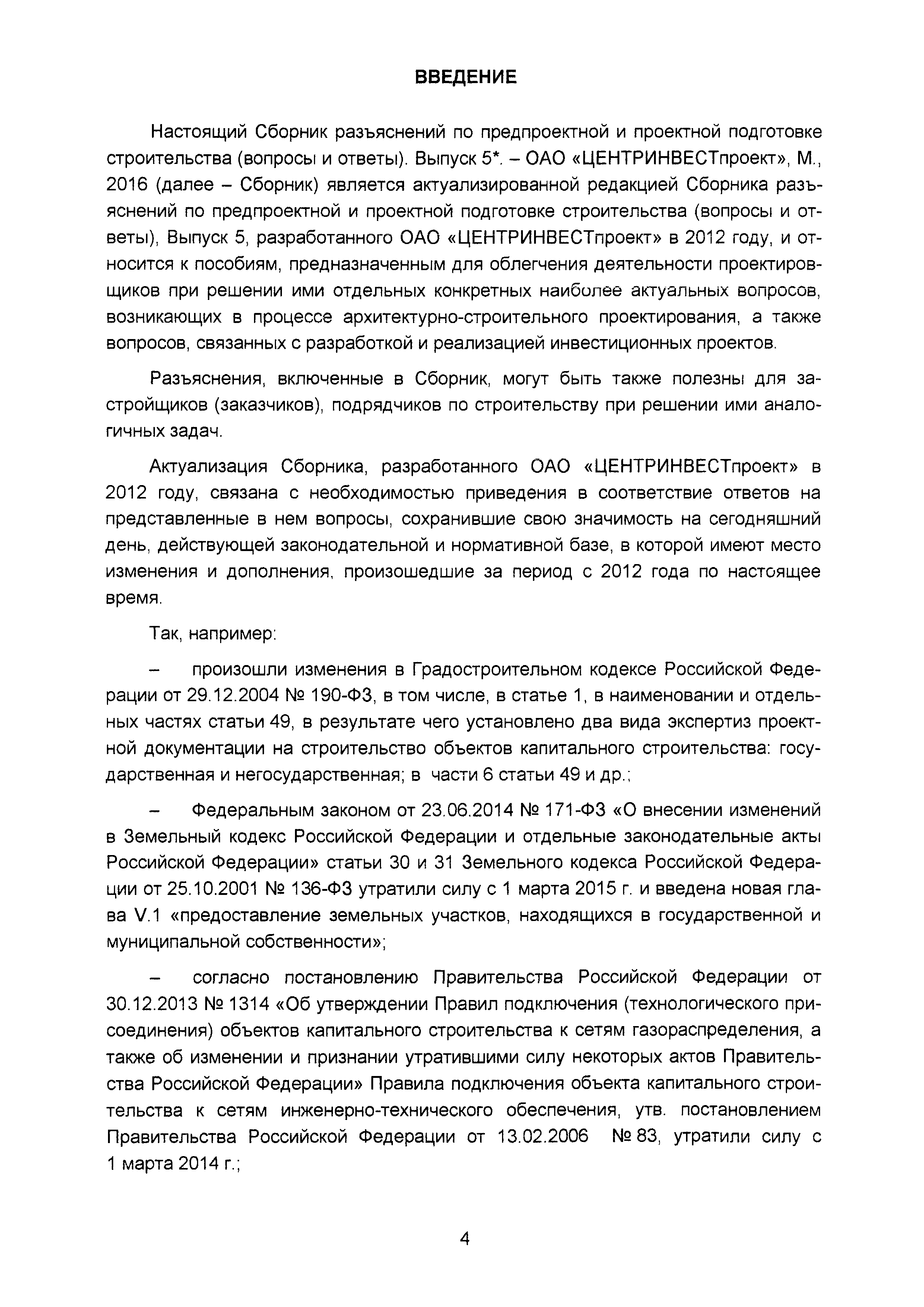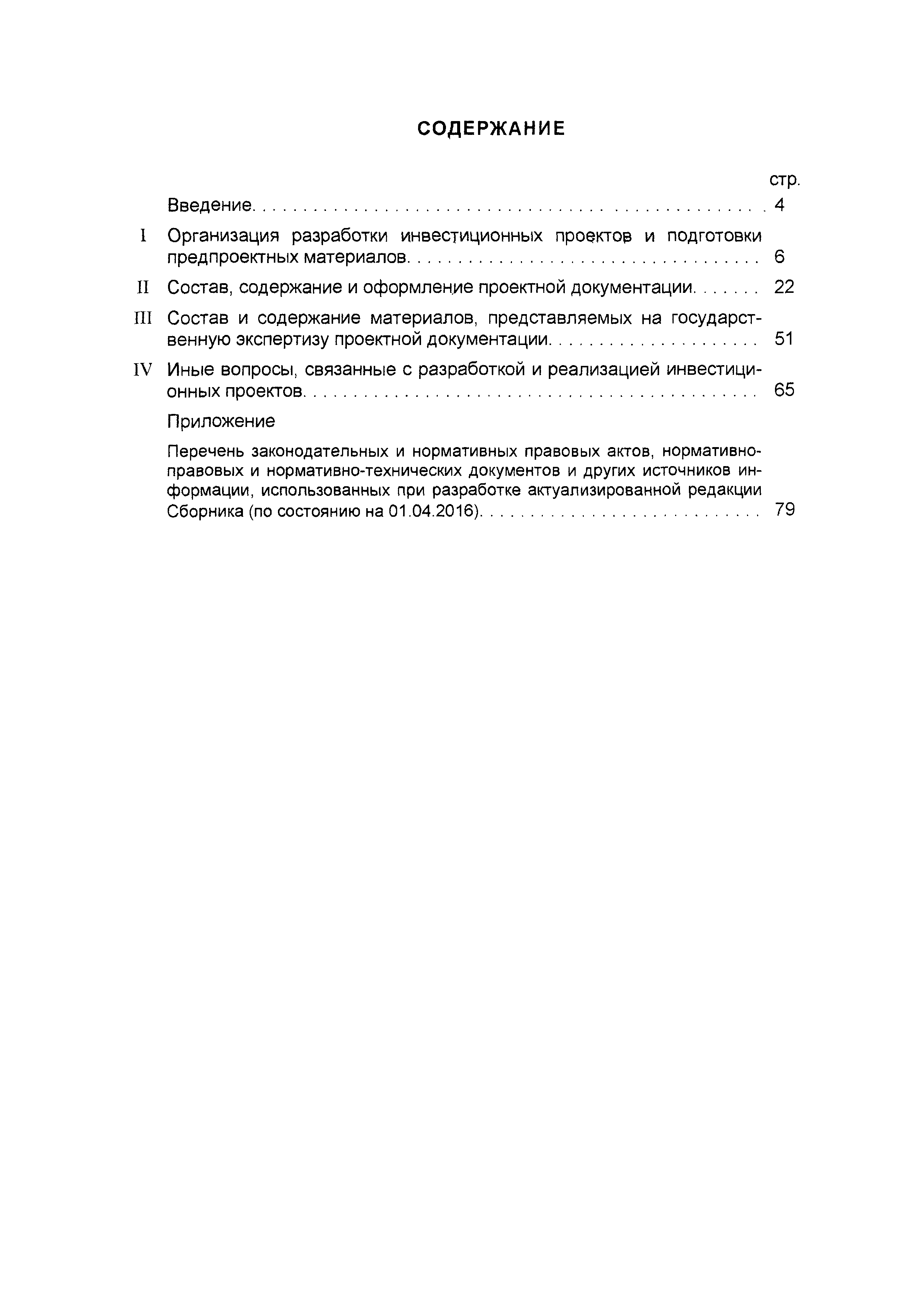 | Оглавление: | Введение I Организация разработки инвестиционных проектов и подготовки предпроектных материалов II Состав, содержание и оформление проектной документации III Состав и содержание материалов, представляемых на государственную экспертизу проектной документации IV Иные вопросы, связанные с разработкой и реализацией инвестиционных проектов Приложение. Перечень законодательных и нормативных правовых актов, нормативно-правовых и нормативно-технических документов и других источников информации, использованных при разработке актуализированной редакции Сборника (по состоянию на 01.04.2016) |