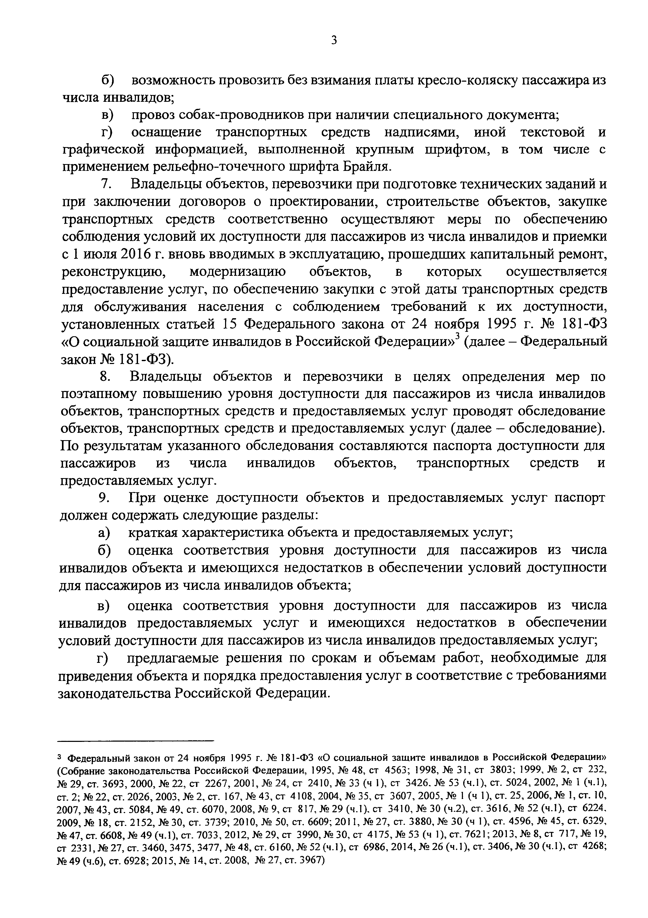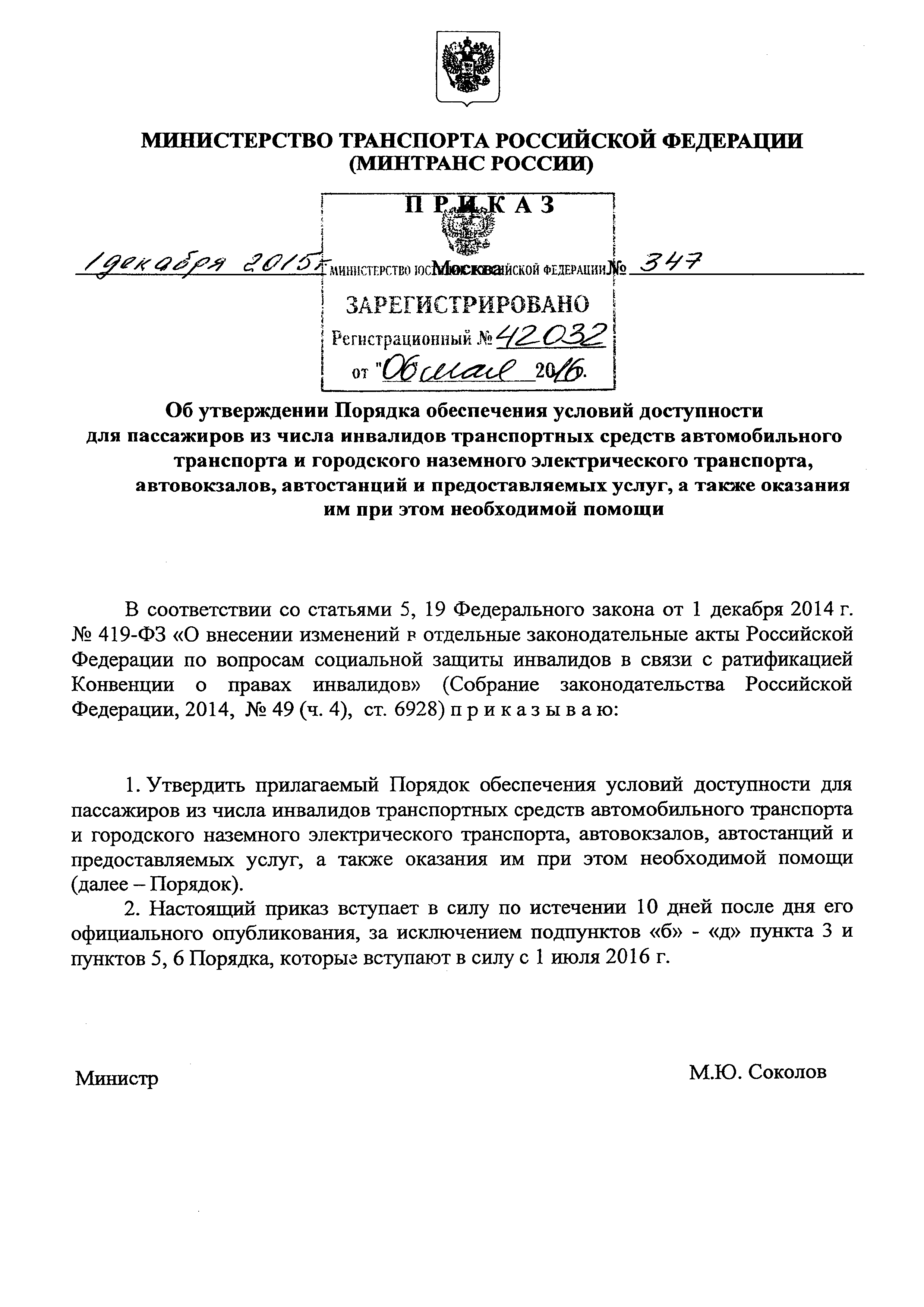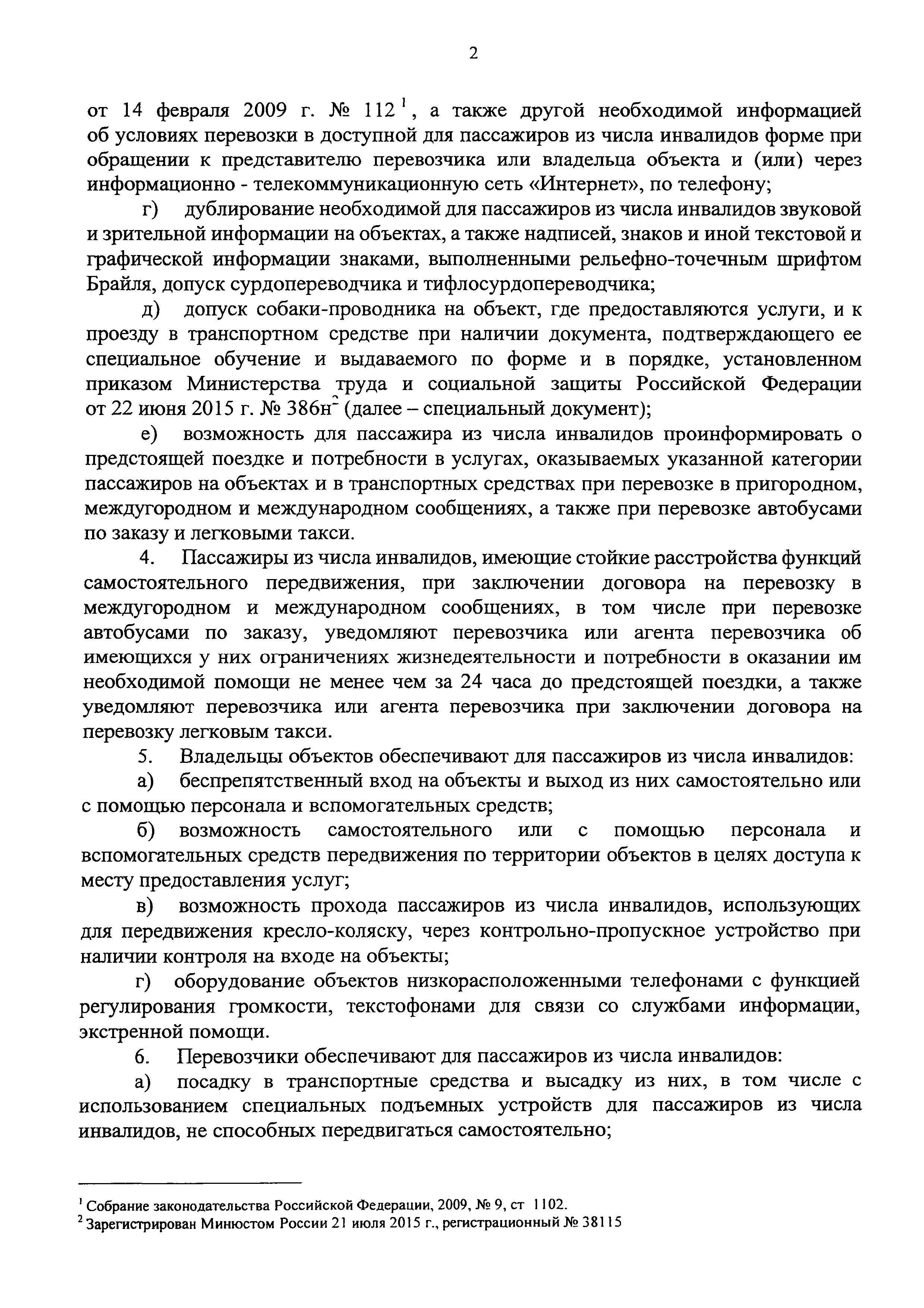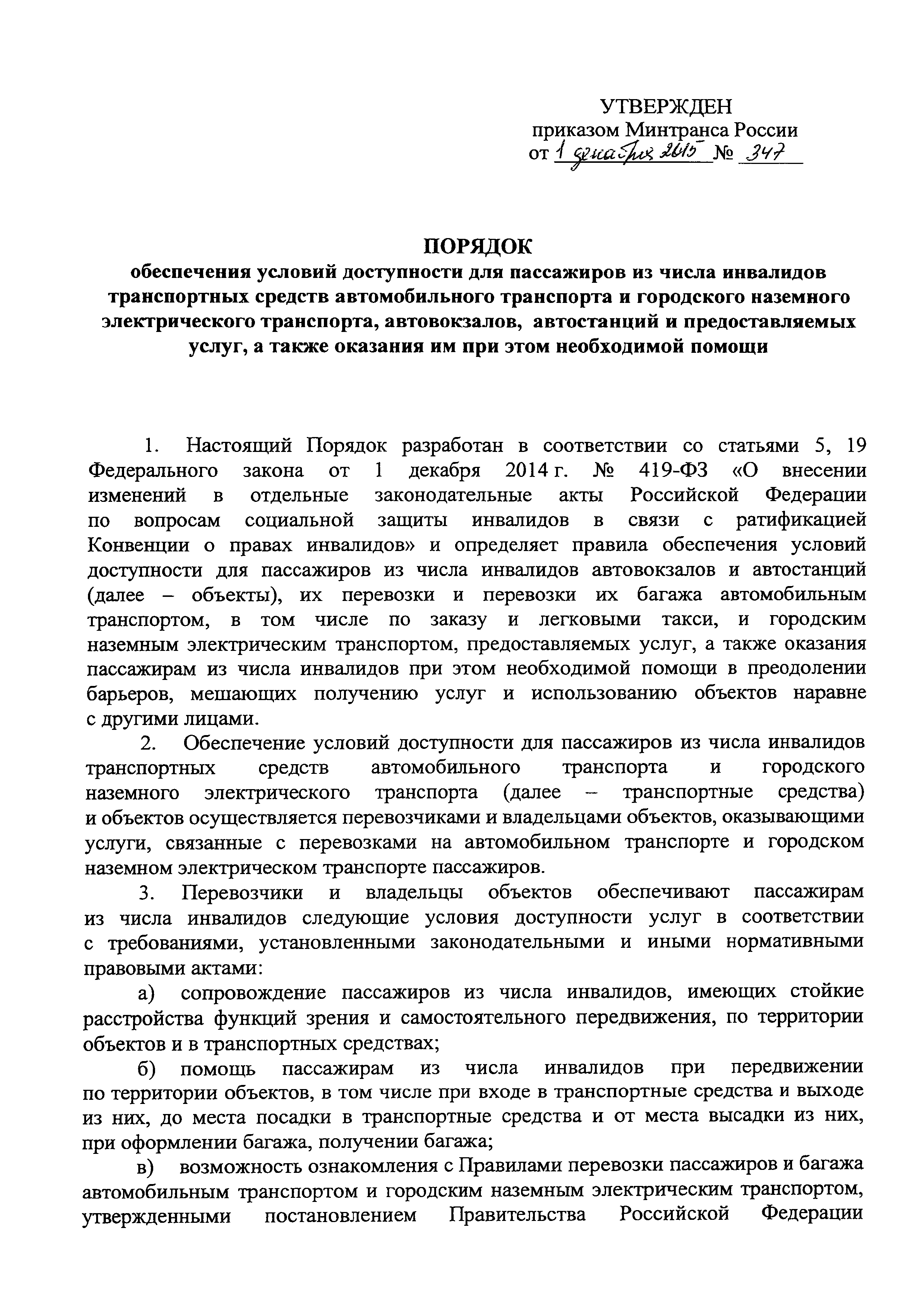 Порядок обеспечения условий доступности для пассажиров из числа инвалидов транспортных средств автомобильного транспорта и городского наземного электрического транспорта, автовокзалов, автостанций и предоставляемых услуг, а также оказания им при этом необходимой помощи| Статус: | действует | | Название рус.: | Порядок обеспечения условий доступности для пассажиров из числа инвалидов транспортных средств автомобильного транспорта и городского наземного электрического транспорта, автовокзалов, автостанций и предоставляемых услуг, а также оказания им при этом необходимой помощи | | Дата добавления в базу: | 01.02.2017 | | Дата актуализации: | 01.01.2021 | | Дата введения: | 22.05.2016 | | Дата окончания срока действия: | 01.01.2021 | | Оглавление: | Об утверждении Порядка обеспечения условий доступности для пассажиров из числа инвалидов транспортных средств автомобильного транспорта и городского наземного электрического транспорта, автовокзалов, автостанций и предоставляемых услуг, а также ... Порядок обеспечения условий доступности для пассажиров из числа инвалидов транспортных средств автомобильного транспорта и городского наземного электрического транспорта, автовокзалов, автостанций и предоставляемых услуг, а также оказания им при ... | | Утверждён: | 01.12.2015 Минтранс России (Russian Federation Mintrans 347)