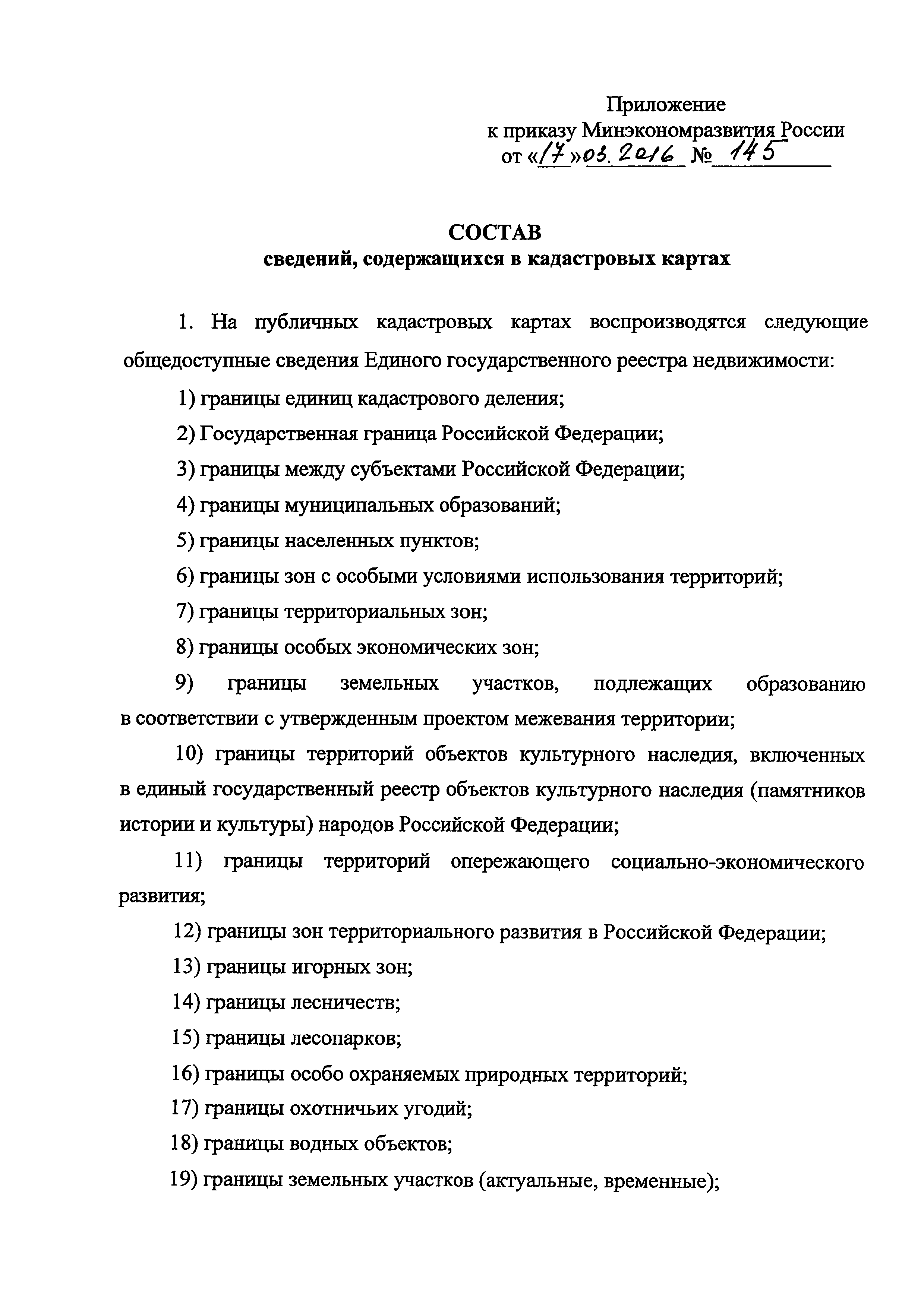 Состав сведений, содержащихся в кадастровых картах| Статус: | действует | | Название рус.: | Состав сведений, содержащихся в кадастровых картах | | Дата добавления в базу: | 01.02.2017 | | Дата актуализации: | 01.01.2021 | | Дата введения: | 01.01.2017 | | Утверждён: | 17.03.2016 Министерство экономического развития РФ (145)