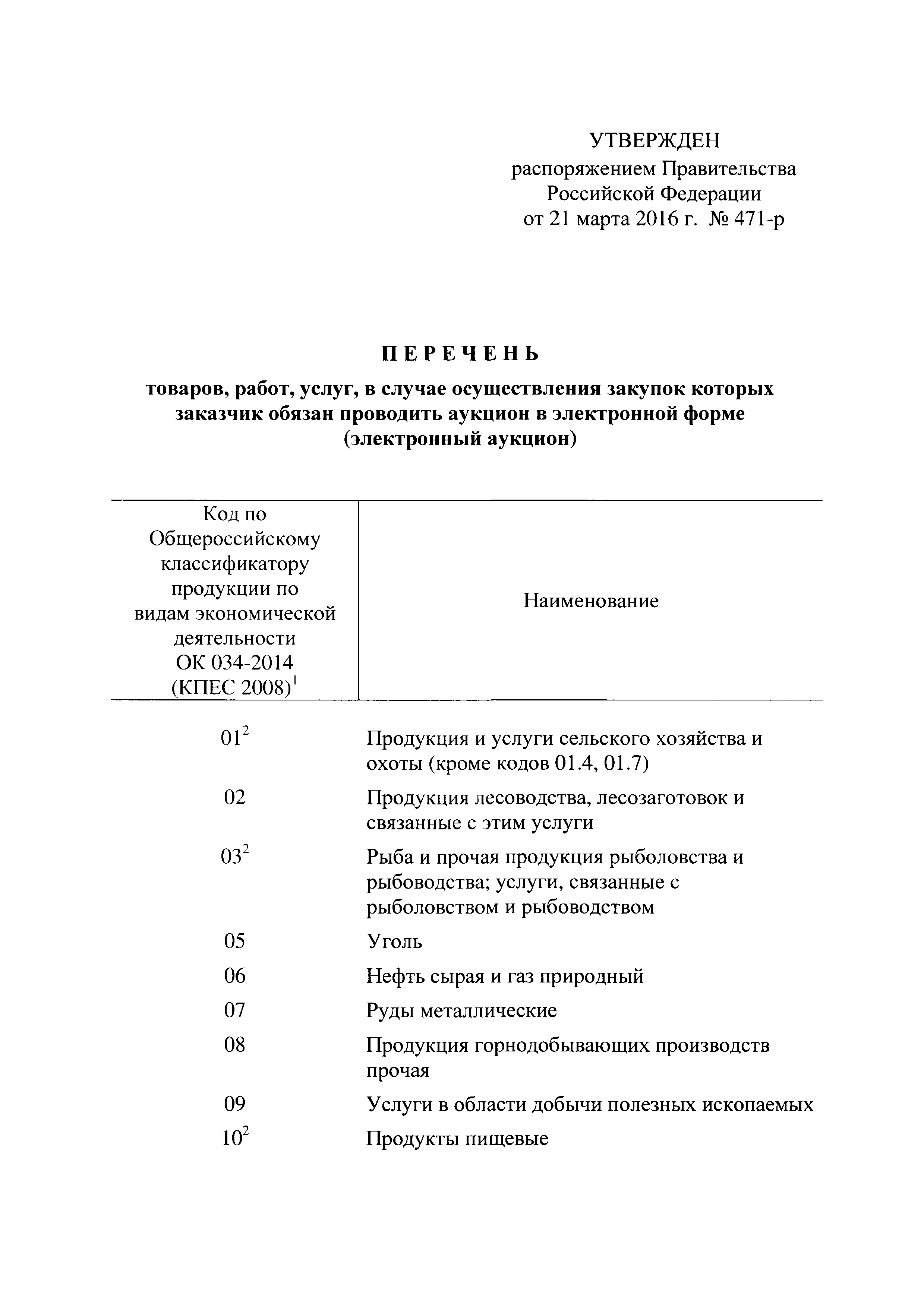 Перечень товаров, работ, услуг, в случае осуществления закупок которых заказчик обязан проводить аукцион в электронной форме (электронный аукцион)| Статус: | действует | | Название рус.: | Перечень товаров, работ, услуг, в случае осуществления закупок которых заказчик обязан проводить аукцион в электронной форме (электронный аукцион) | | Дата добавления в базу: | 01.02.2017 | | Дата актуализации: | 01.01.2021 | | Дата введения: | 21.03.2016 | | Утверждён: | 21.03.2016 Правительство Российской Федерации (471-р)