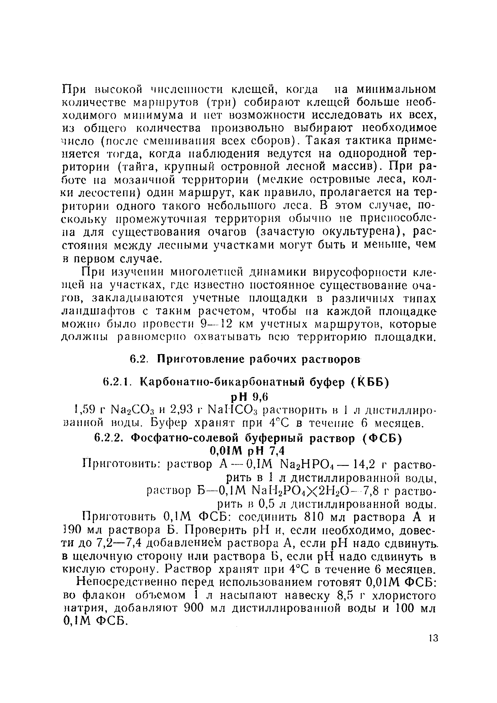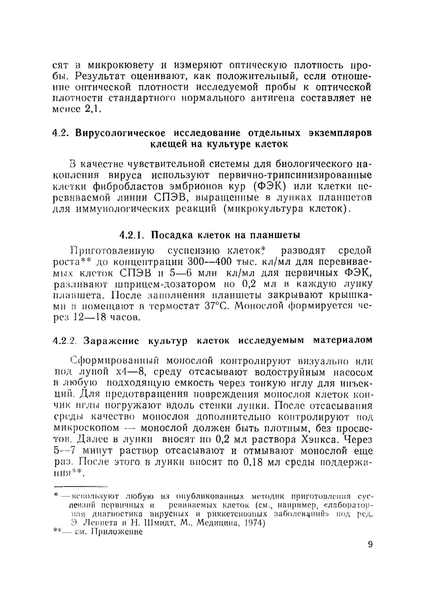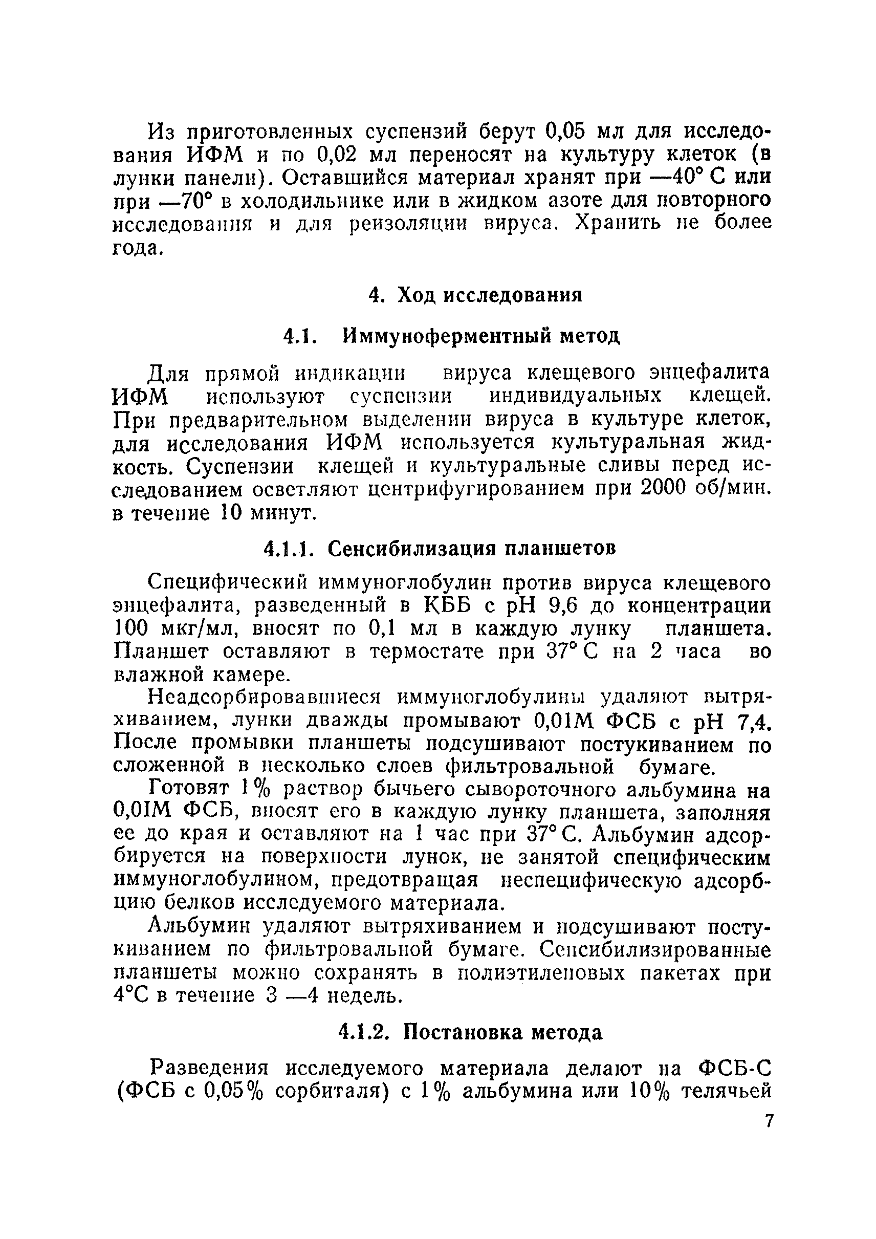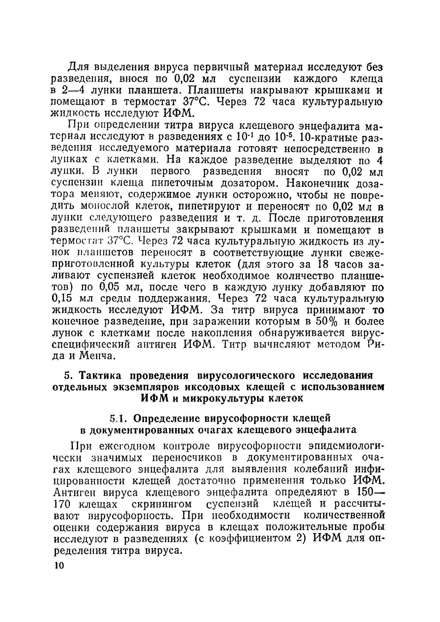 | Оглавление: | Введение 1 Применение в тексте сокращения 2 Лабораторное оборудование, реактивы, материалы 2.1 Спецификация оборудования 2.2 Реактивы 2.3 Материалы 3 Подготовка клещей для исследования 4 Ход исследования 4.1 Иммуноферментный метод 4.1.1. Сенсибилизация планшетов 4.1.2. Постановка метода 4.1.3. Учет и интерпретация результатов 4.2. Вирусологическое исследование отдельных экземпляров клещей на культуре клеток 4.2.1. Посадка клеток на планшеты 4.2.2. Заражение культур клеток исследуемым материалом 5 Тактика проведения вирусологического исследования отдельных экземпляров иксодовых клещей с использованием ИФМ и микрокультуры клеток 5.1. Определение вирусофорности клещей в документированных очагах клещевого энцефалита 5.2. Определение вирусофорности клещей в неизвестных (предполагаемых) очагах клещевого энцефалита 5.3. Проведение количественных вирусологических исследований с определением титра вируса клещевого энцефалита в отдельных экземплярах клещей 5.4. Выделение штаммов вируса клещевого энцефалита из отдельных экземпляров клещей для дальнейшего изучения их биологических свойств 5.5. Вирусологическое исследование клещей, присосавшихся к человеку 6 Приложение 6.1 Методика сбора клещей для оценки их вирусофорности 6.2. Приготовление рабочих растворов 6.3. Подготовка и стерилизация планшетов для микрокультуры клеток 6.4. Противоэпидемический режим |