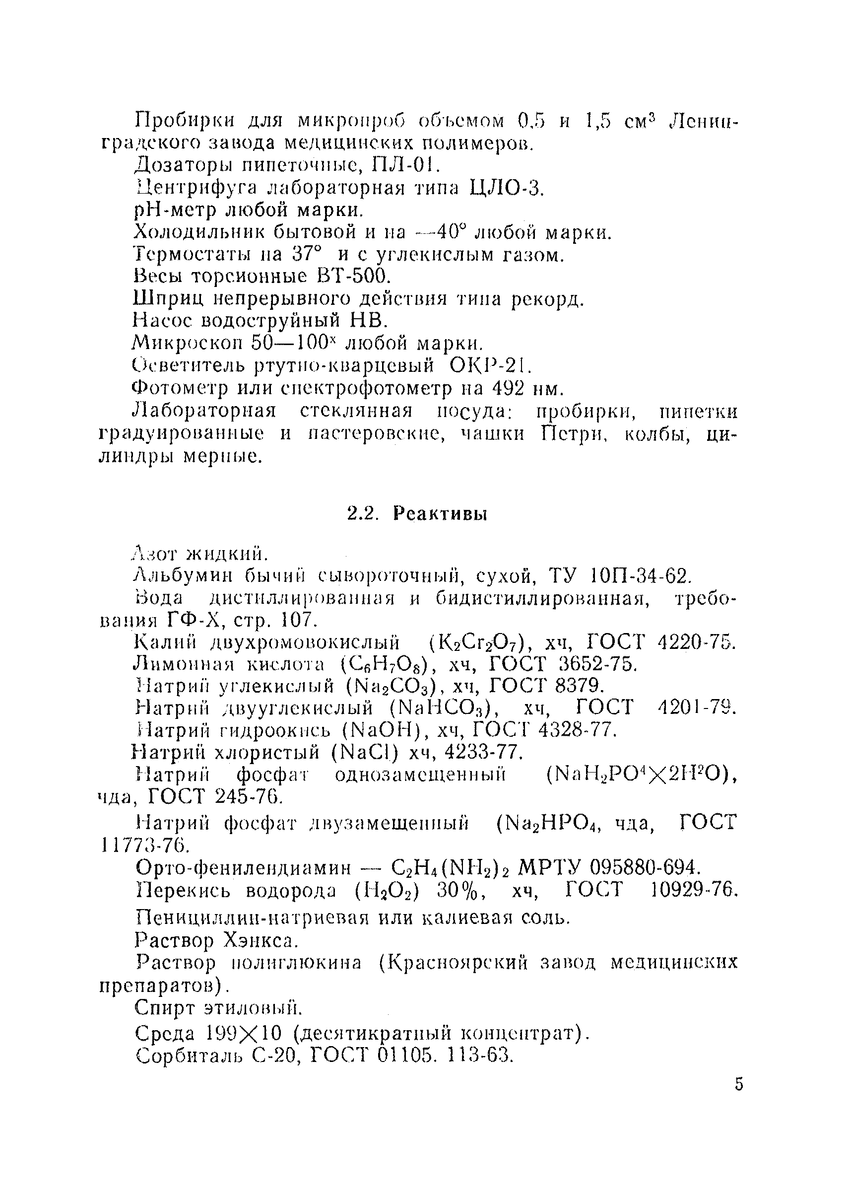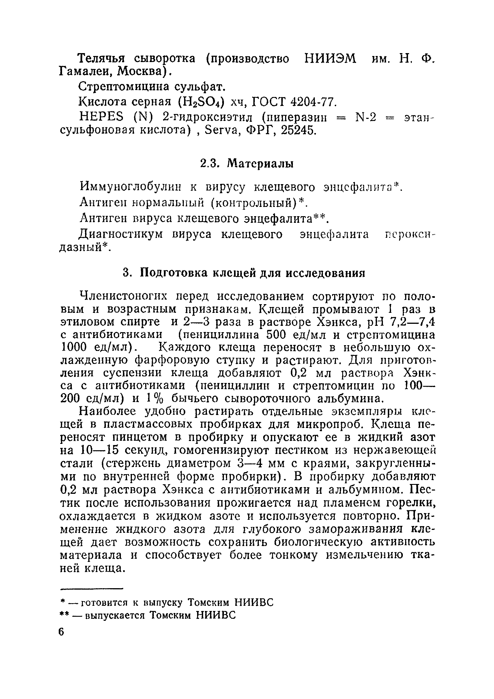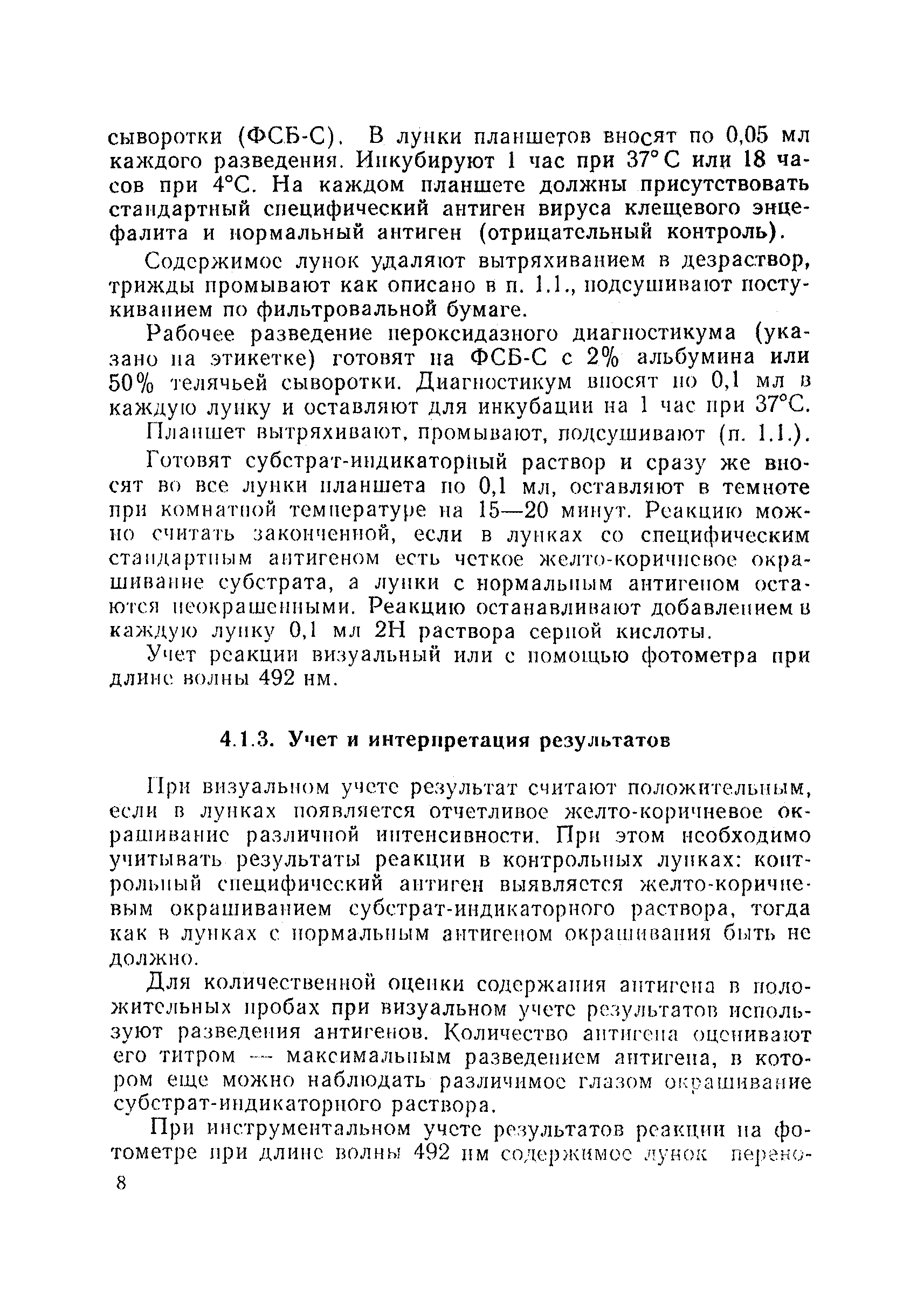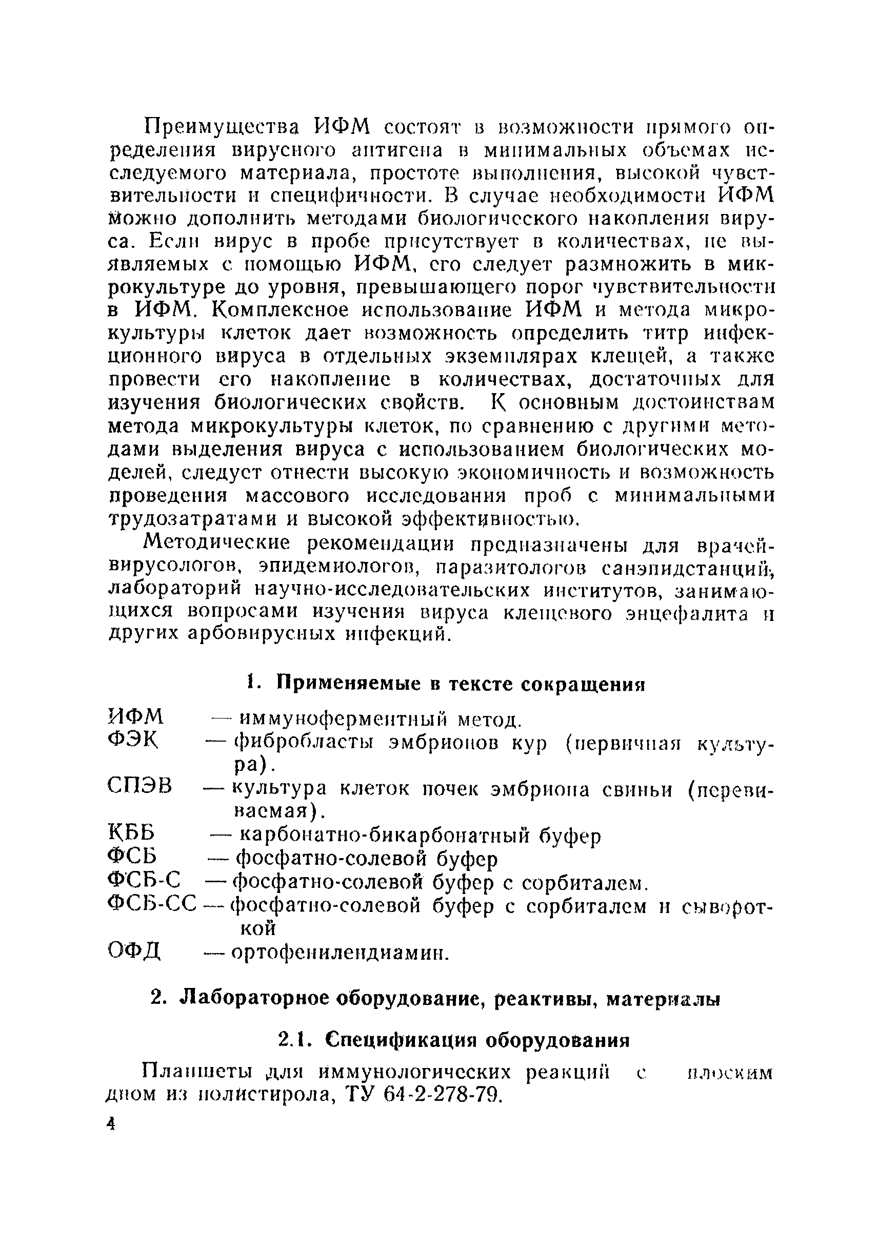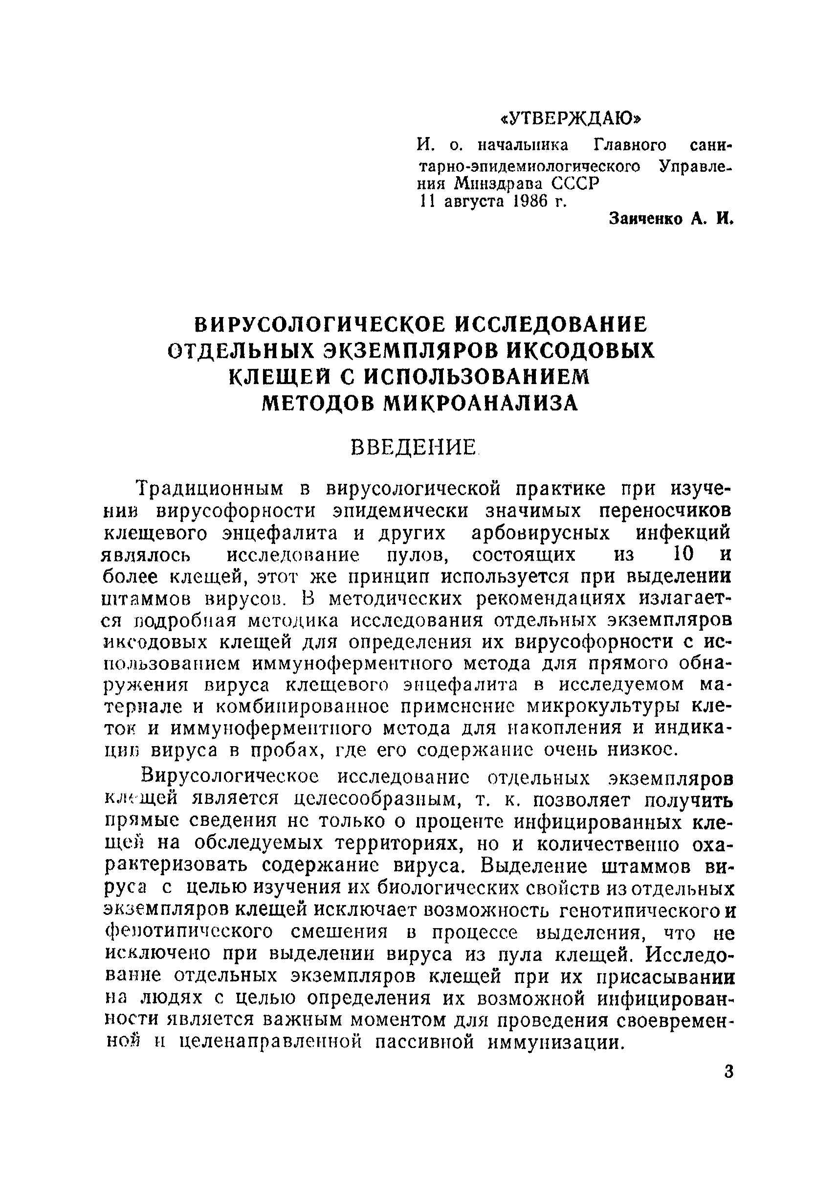 | Оглавление: | Введение 1 Применение в тексте сокращения 2 Лабораторное оборудование, реактивы, материалы 2.1 Спецификация оборудования 2.2 Реактивы 2.3 Материалы 3 Подготовка клещей для исследования 4 Ход исследования 4.1 Иммуноферментный метод 4.1.1. Сенсибилизация планшетов 4.1.2. Постановка метода 4.1.3. Учет и интерпретация результатов 4.2. Вирусологическое исследование отдельных экземпляров клещей на культуре клеток 4.2.1. Посадка клеток на планшеты 4.2.2. Заражение культур клеток исследуемым материалом 5 Тактика проведения вирусологического исследования отдельных экземпляров иксодовых клещей с использованием ИФМ и микрокультуры клеток 5.1. Определение вирусофорности клещей в документированных очагах клещевого энцефалита 5.2. Определение вирусофорности клещей в неизвестных (предполагаемых) очагах клещевого энцефалита 5.3. Проведение количественных вирусологических исследований с определением титра вируса клещевого энцефалита в отдельных экземплярах клещей 5.4. Выделение штаммов вируса клещевого энцефалита из отдельных экземпляров клещей для дальнейшего изучения их биологических свойств 5.5. Вирусологическое исследование клещей, присосавшихся к человеку 6 Приложение 6.1 Методика сбора клещей для оценки их вирусофорности 6.2. Приготовление рабочих растворов 6.3. Подготовка и стерилизация планшетов для микрокультуры клеток 6.4. Противоэпидемический режим |