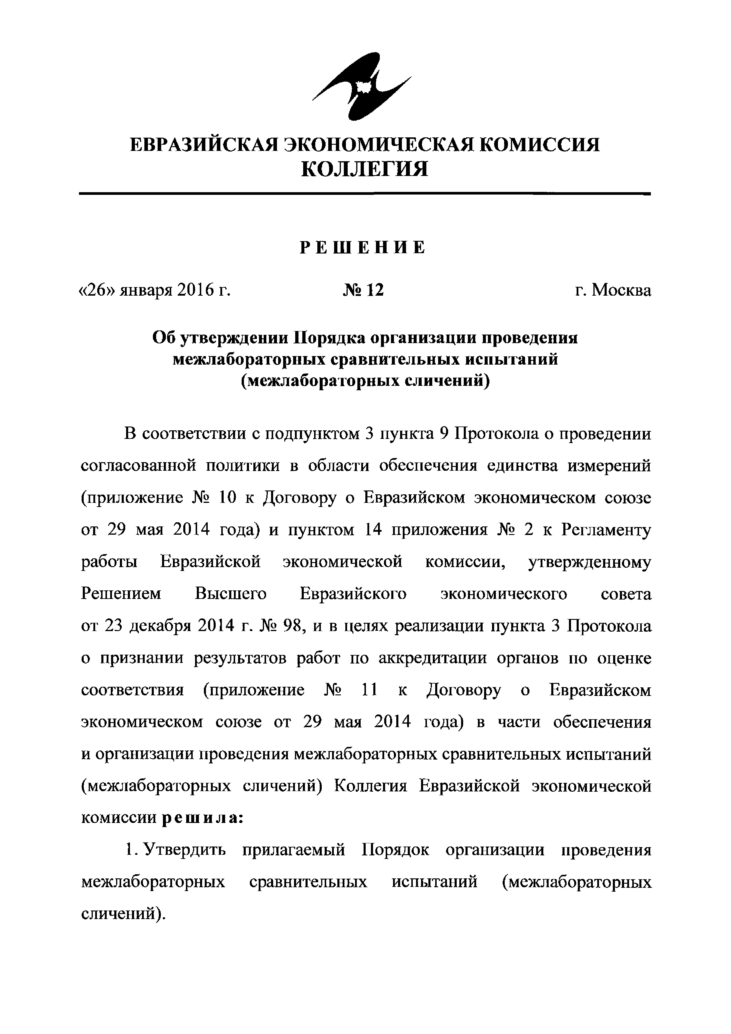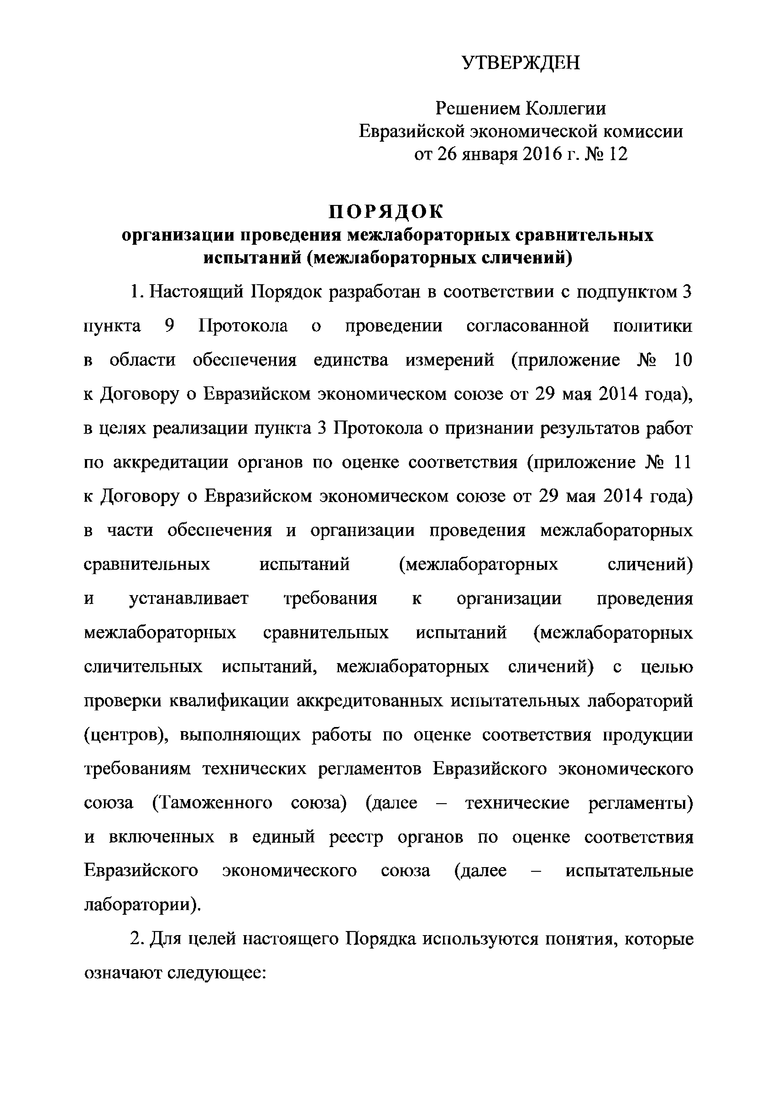 Порядок организации проведения межлабораторных сравнительных испытаний (межлабораторных сличений)| Статус: | действует | | Название рус.: | Порядок организации проведения межлабораторных сравнительных испытаний (межлабораторных сличений) | | Дата добавления в базу: | 01.02.2017 | | Дата актуализации: | 01.01.2021 | | Дата введения: | 29.01.2017 | | Утверждён: | 26.01.2016 Коллегия Евразийской экономической комиссии (12)