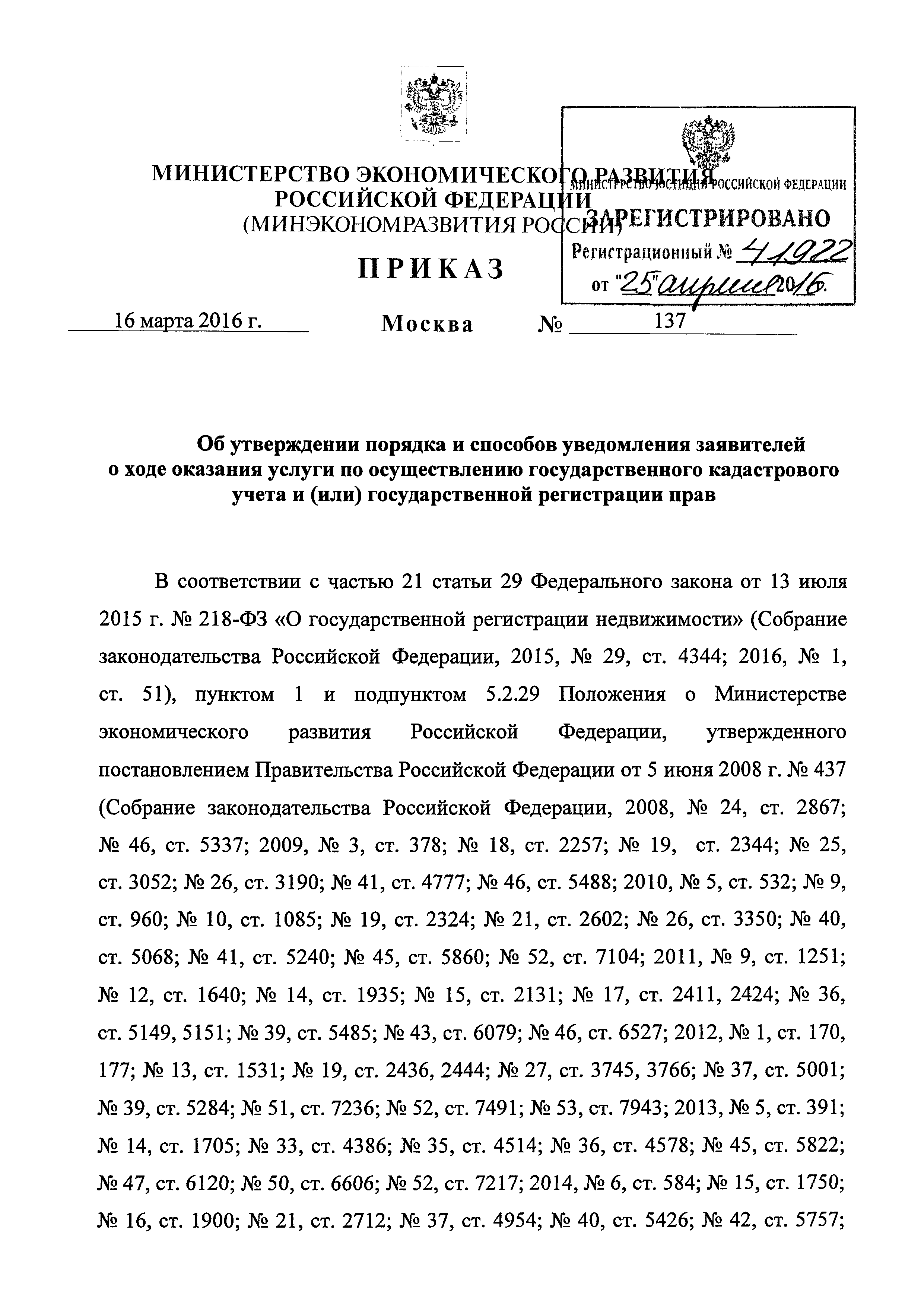 | Область применения: | Порядок определяет порядок и способы уведомления заявителей о ходе оказания услуги по осуществлению государственного кадастрового учета и (или) государственной регистрации прав на недвижимое имущество |