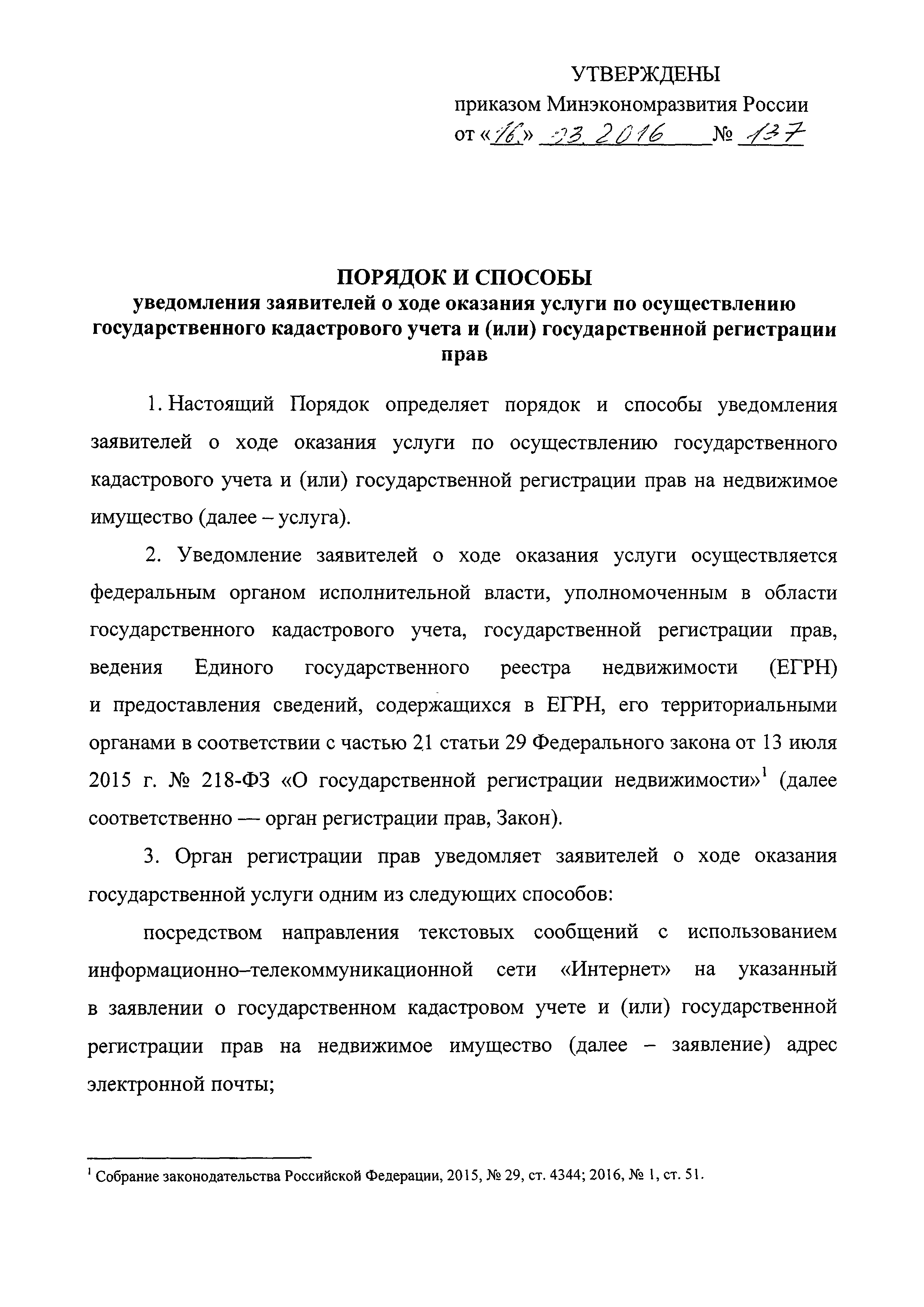 | Название рус.: | Порядок и способы уведомления заявителей о ходе оказания услуги по осуществлению государственного кадастрового учета и (или) государственной регистрации прав |