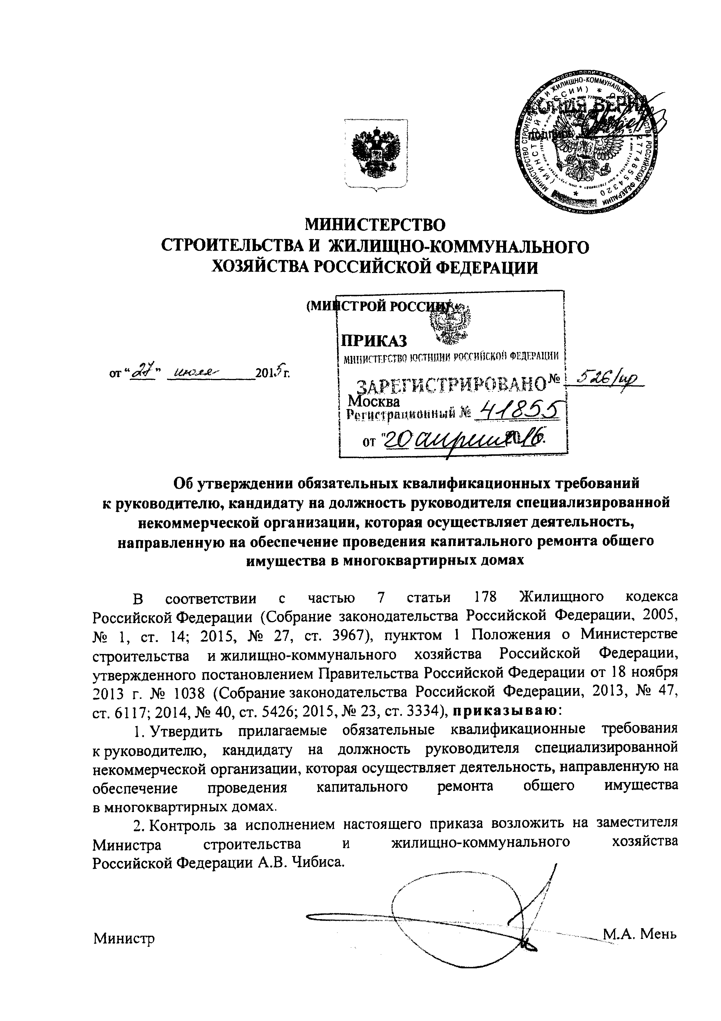 Обязательные квалификационные требования к руководителю, кандидату на должность руководителя специализированной некоммерческой организации, которая осуществляет деятельность, направленную на обеспечение проведения капитального ремонта общего имущества в многоквартирных домах| Статус: | действует | | Название рус.: | Обязательные квалификационные требования к руководителю, кандидату на должность руководителя специализированной некоммерческой организации, которая осуществляет деятельность, направленную на обеспечение проведения капитального ремонта общего имущества в многоквартирных домах | | Дата добавления в базу: | 01.02.2017 | | Дата актуализации: | 01.01.2021 | | Дата введения: | 06.05.2016 | | Утверждён: | 27.07.2015 Министерство строительства и жилищно-коммунального хозяйства Российской Федерации (526/пр)