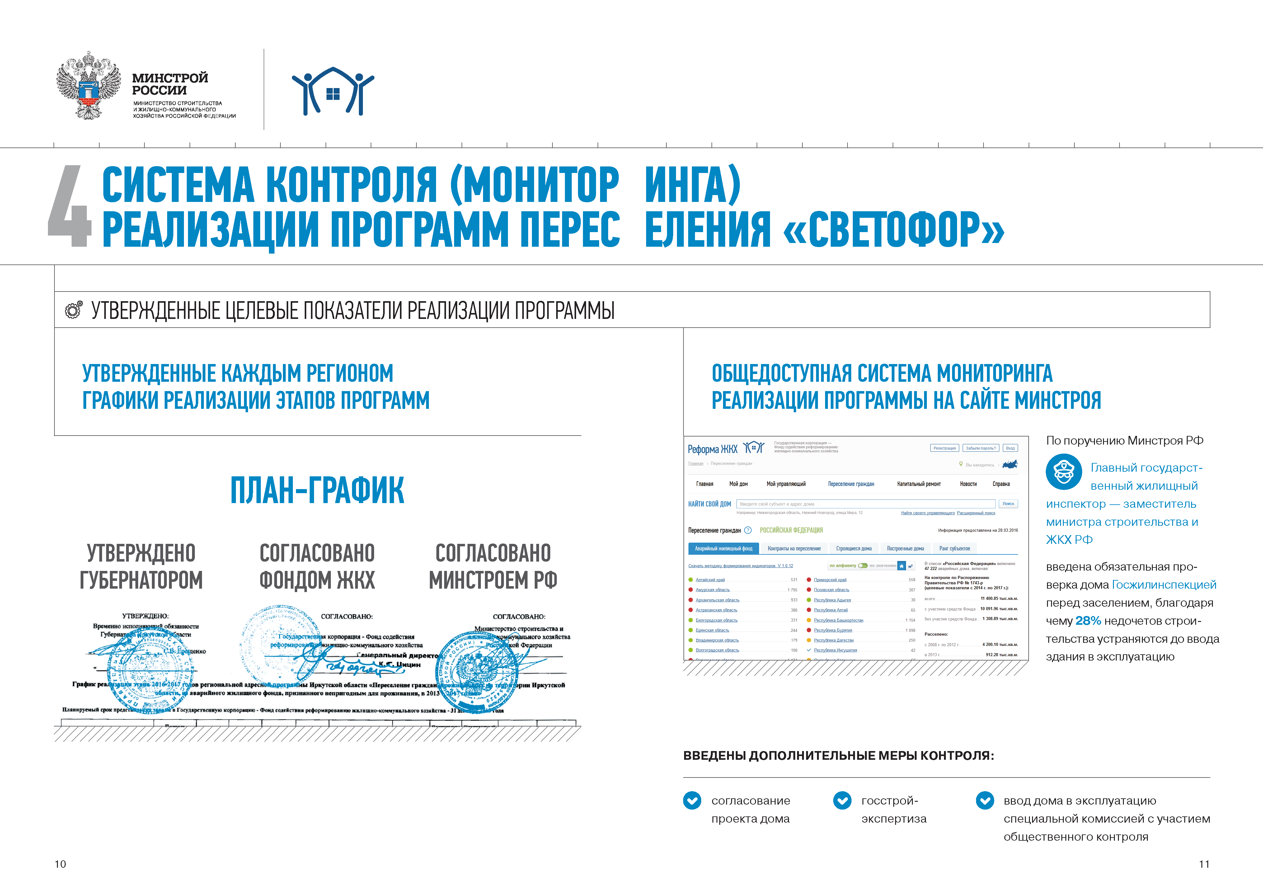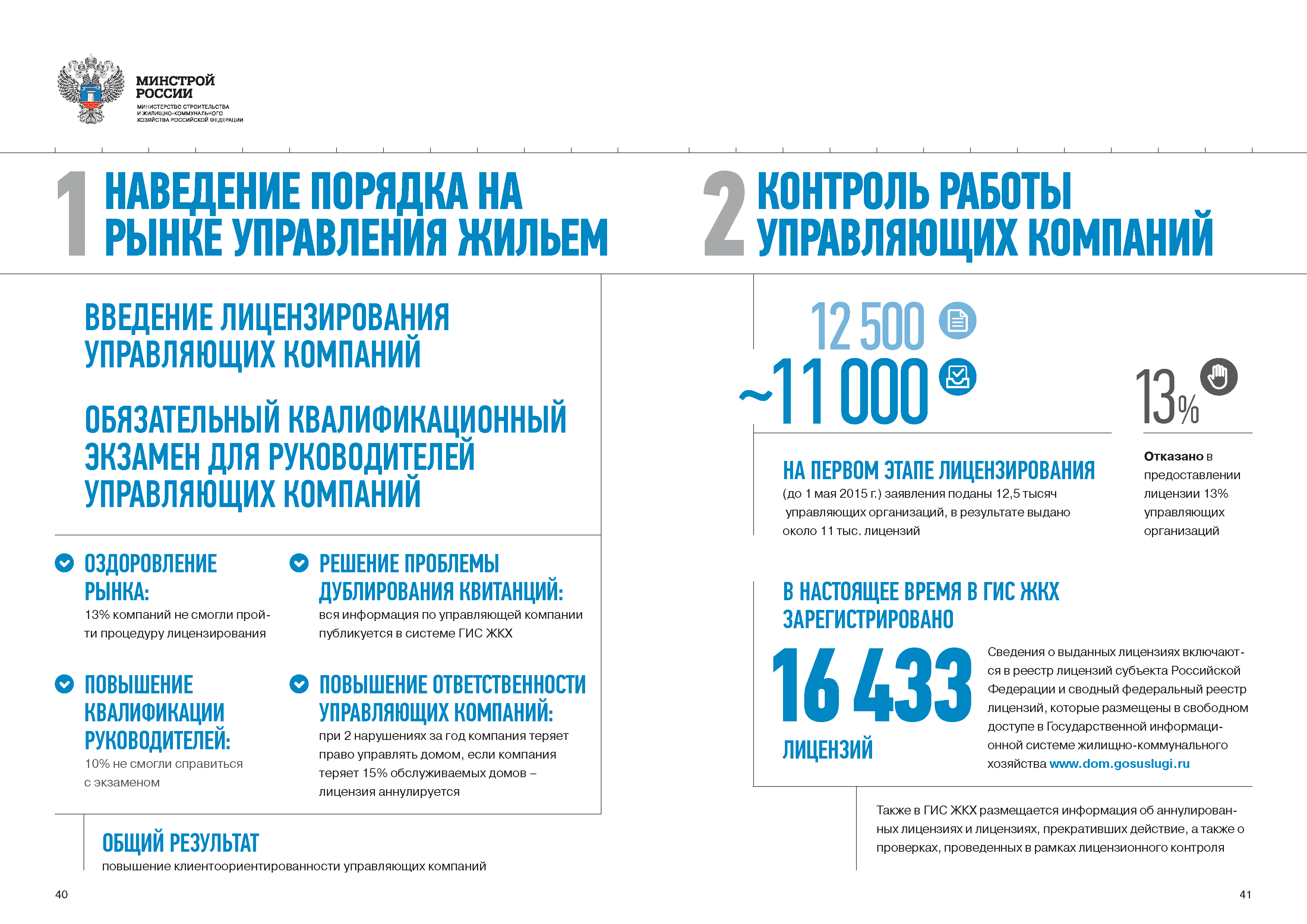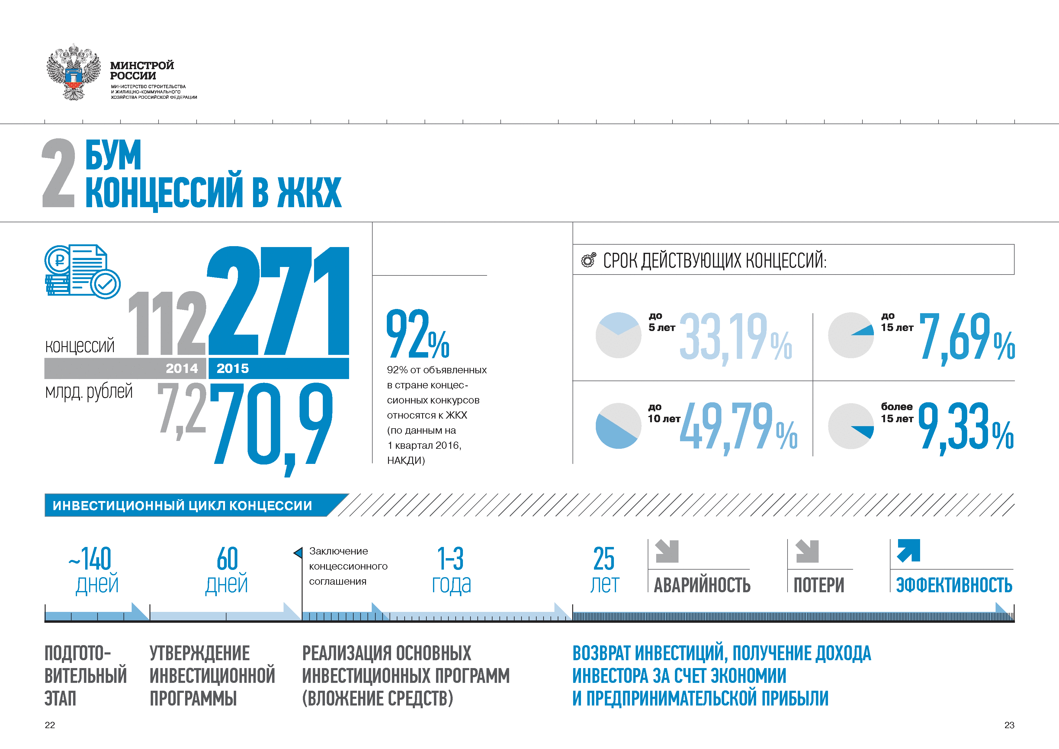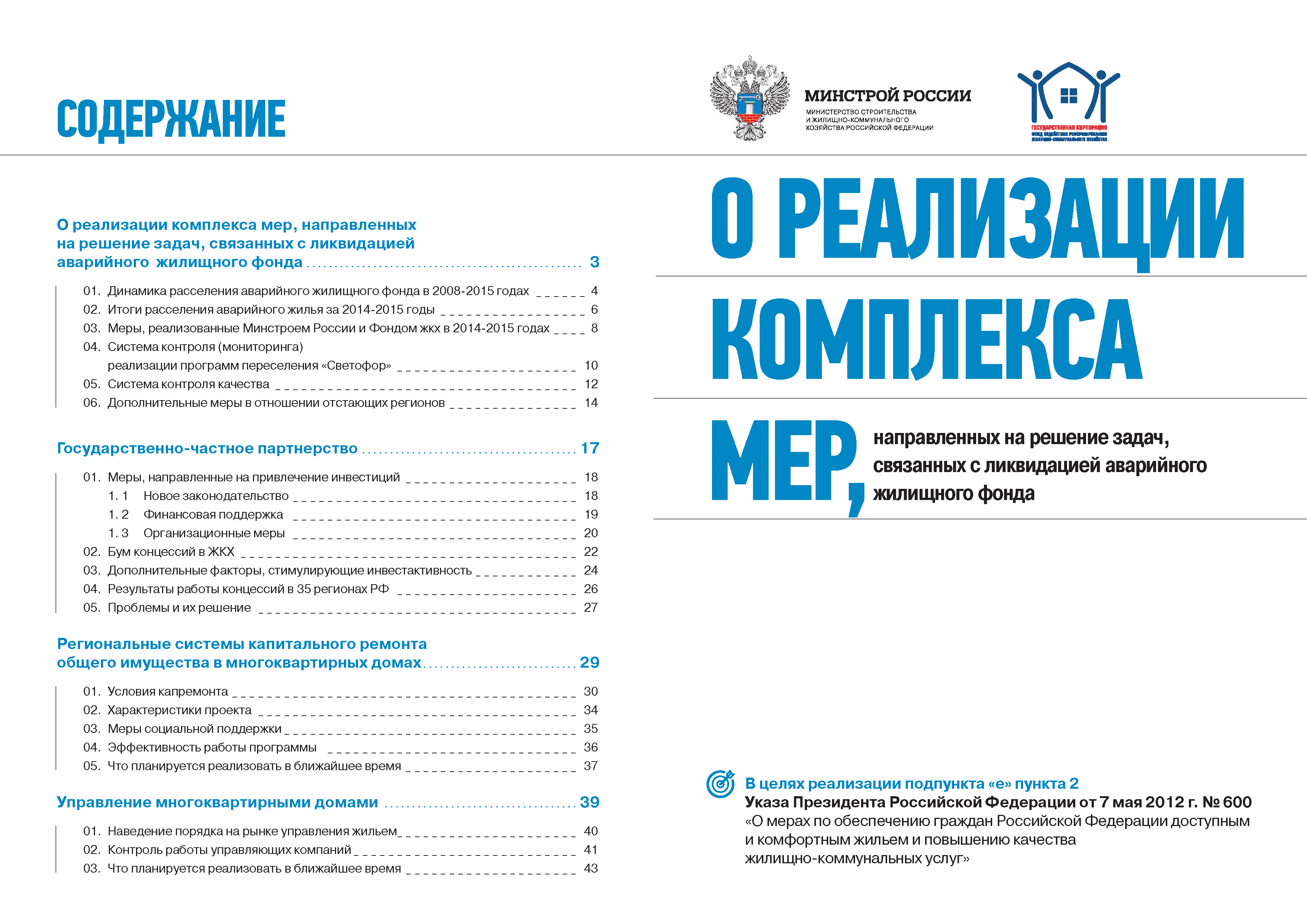 | Оглавление: | О реализации комплекса мер, направленных на решение задач, связанных с ликвидацией аварийного жилищного фонда 1. Динамика расселения аварийного жилищного фонда в 2008 - 2015 годах 2. Итоги расселения аварийного жилья за 2014 - 2015 годы 3. Меры, реализованные Минстроем России и Фондом жкх в 2014 - 2015 годах 4. Система контроля (мониторинга) реализации программ переселения "Светофор" 5. Система контроля качества 6. Дополнительные меры в отношении отстающих регионов Государственно-частное партнерство 1. Меры, направленные на привлечение инвестиций 1. 1 Новое законодательство 1. 2 Финансовая поддержка 1. 3 Организационные меры 2. Бум концессий в ЖКХ 3. Дополнительные факторы, стимулирующие инвестактивность 4. Результаты работы концессий в 35 регионах РФ 5. Проблемы и их решение Региональные системы капитального ремонта общего имущества в многоквартирных домах 1. Условия капремонта 2. Характеристики проекта 3. Меры социальной поддержки 4. Эффективность работы программы 5. Что планируется реализовать в ближайшее время Управление многоквартирными домами 1. Наведение порядка на рынке управления жильем 2. Контроль работы управляющих компаний 3. Что планируется реализовать в ближайшее время |