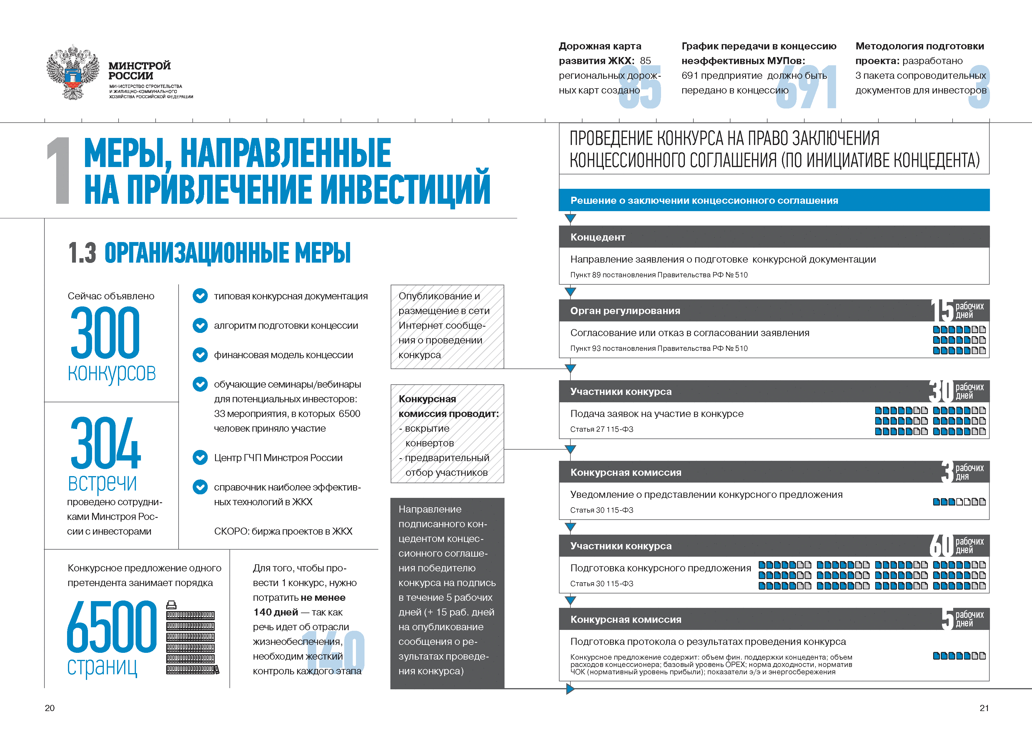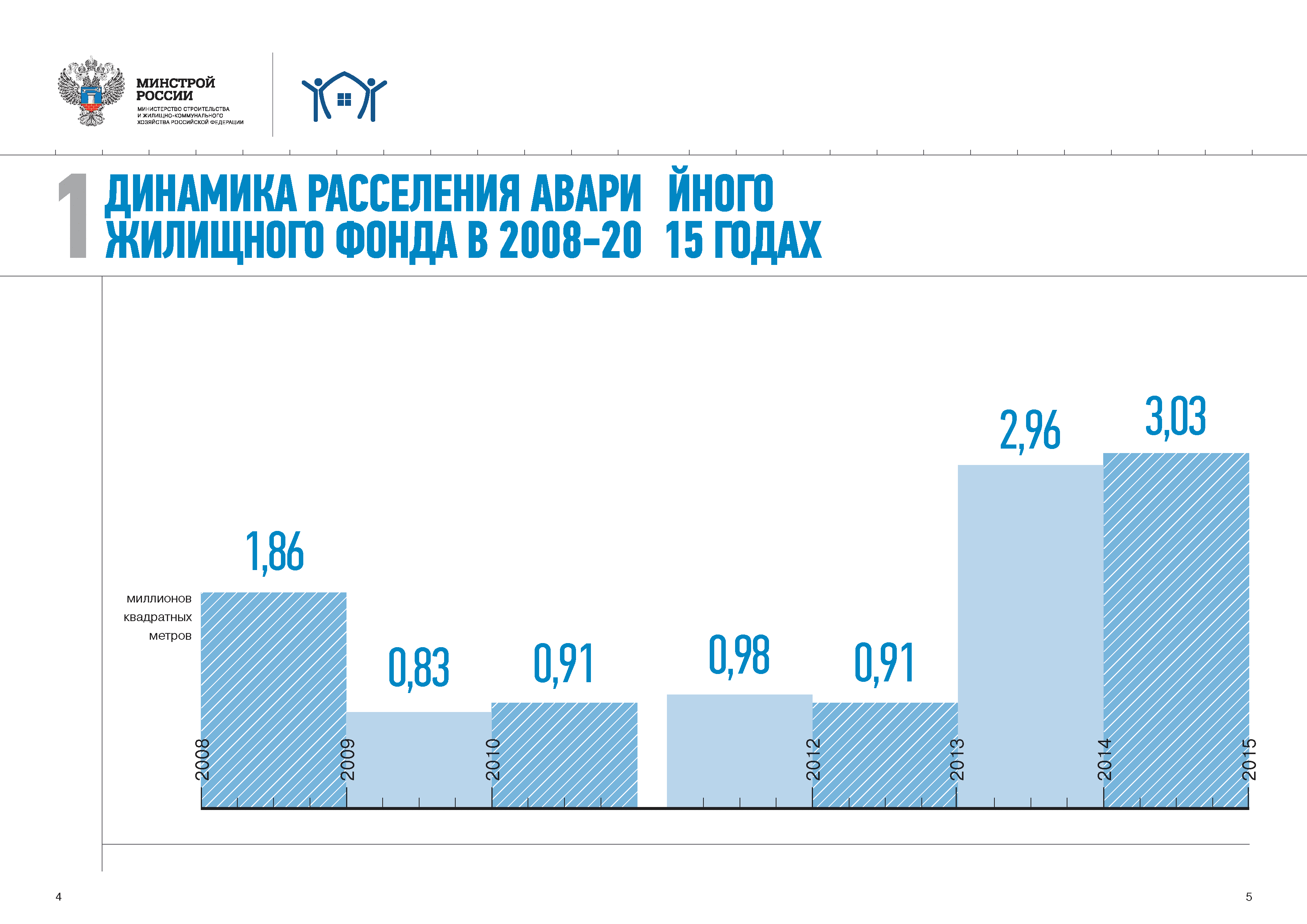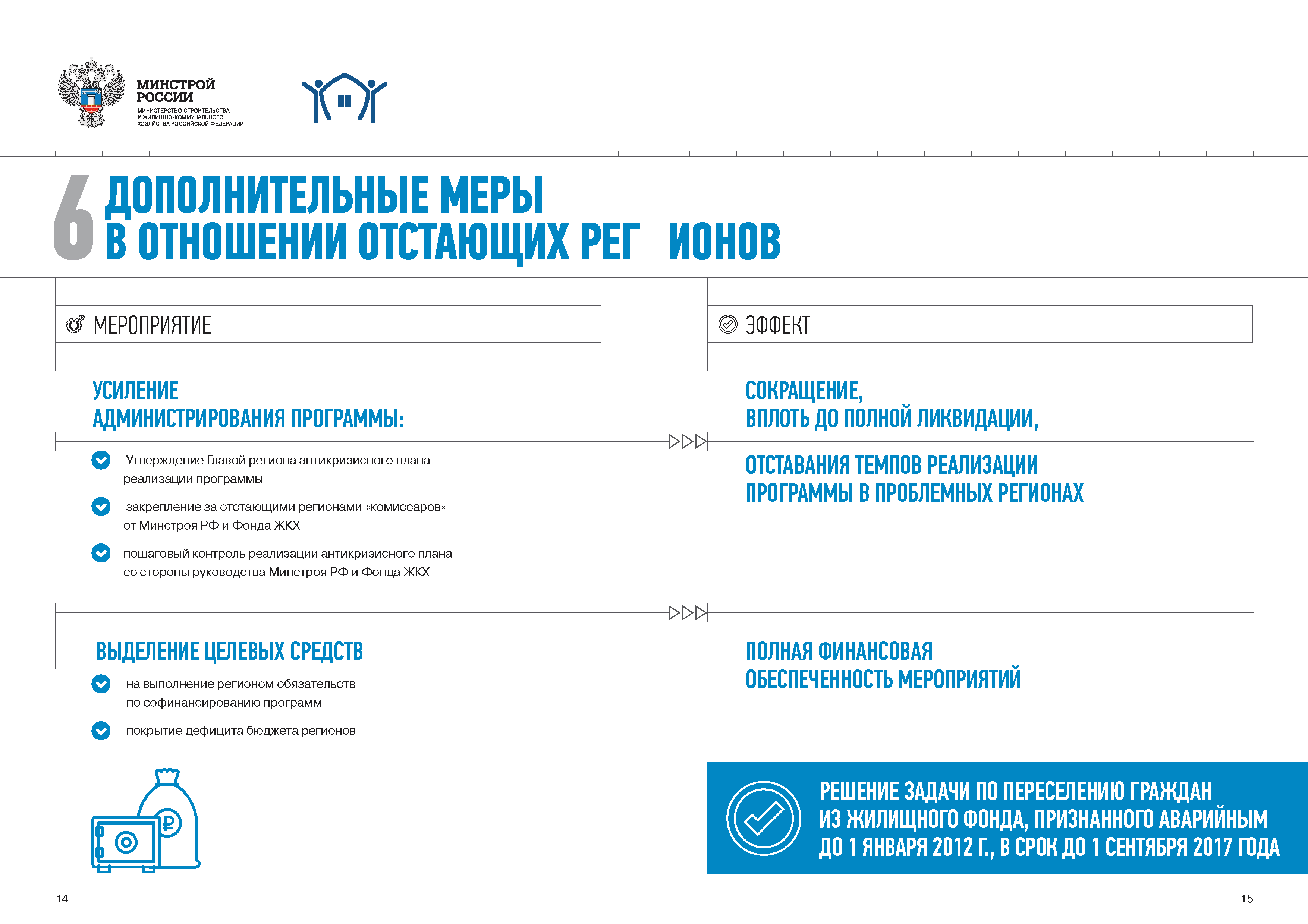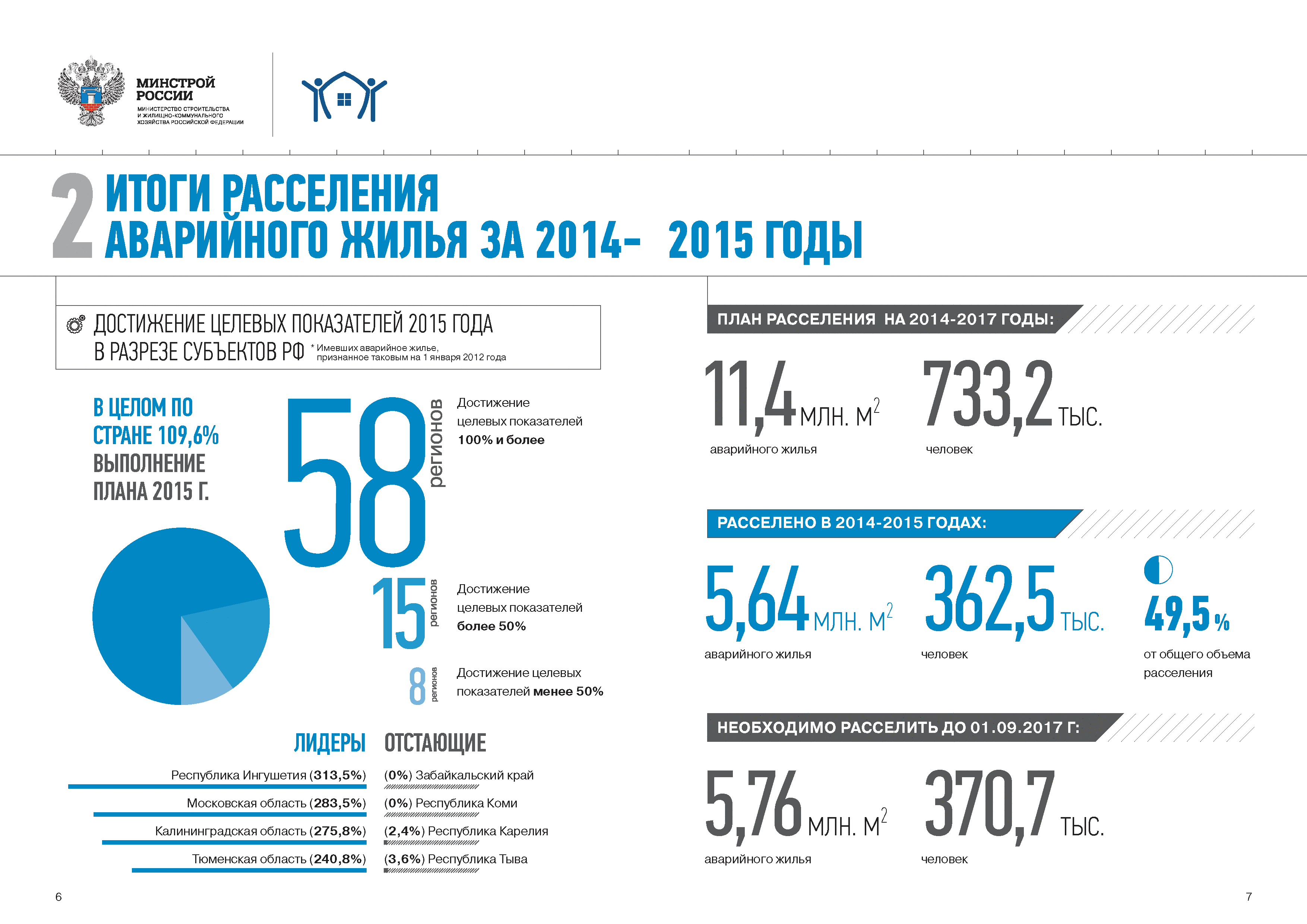 | Оглавление: | О реализации комплекса мер, направленных на решение задач, связанных с ликвидацией аварийного жилищного фонда 1. Динамика расселения аварийного жилищного фонда в 2008 - 2015 годах 2. Итоги расселения аварийного жилья за 2014 - 2015 годы 3. Меры, реализованные Минстроем России и Фондом жкх в 2014 - 2015 годах 4. Система контроля (мониторинга) реализации программ переселения "Светофор" 5. Система контроля качества 6. Дополнительные меры в отношении отстающих регионов Государственно-частное партнерство 1. Меры, направленные на привлечение инвестиций 1. 1 Новое законодательство 1. 2 Финансовая поддержка 1. 3 Организационные меры 2. Бум концессий в ЖКХ 3. Дополнительные факторы, стимулирующие инвестактивность 4. Результаты работы концессий в 35 регионах РФ 5. Проблемы и их решение Региональные системы капитального ремонта общего имущества в многоквартирных домах 1. Условия капремонта 2. Характеристики проекта 3. Меры социальной поддержки 4. Эффективность работы программы 5. Что планируется реализовать в ближайшее время Управление многоквартирными домами 1. Наведение порядка на рынке управления жильем 2. Контроль работы управляющих компаний 3. Что планируется реализовать в ближайшее время |