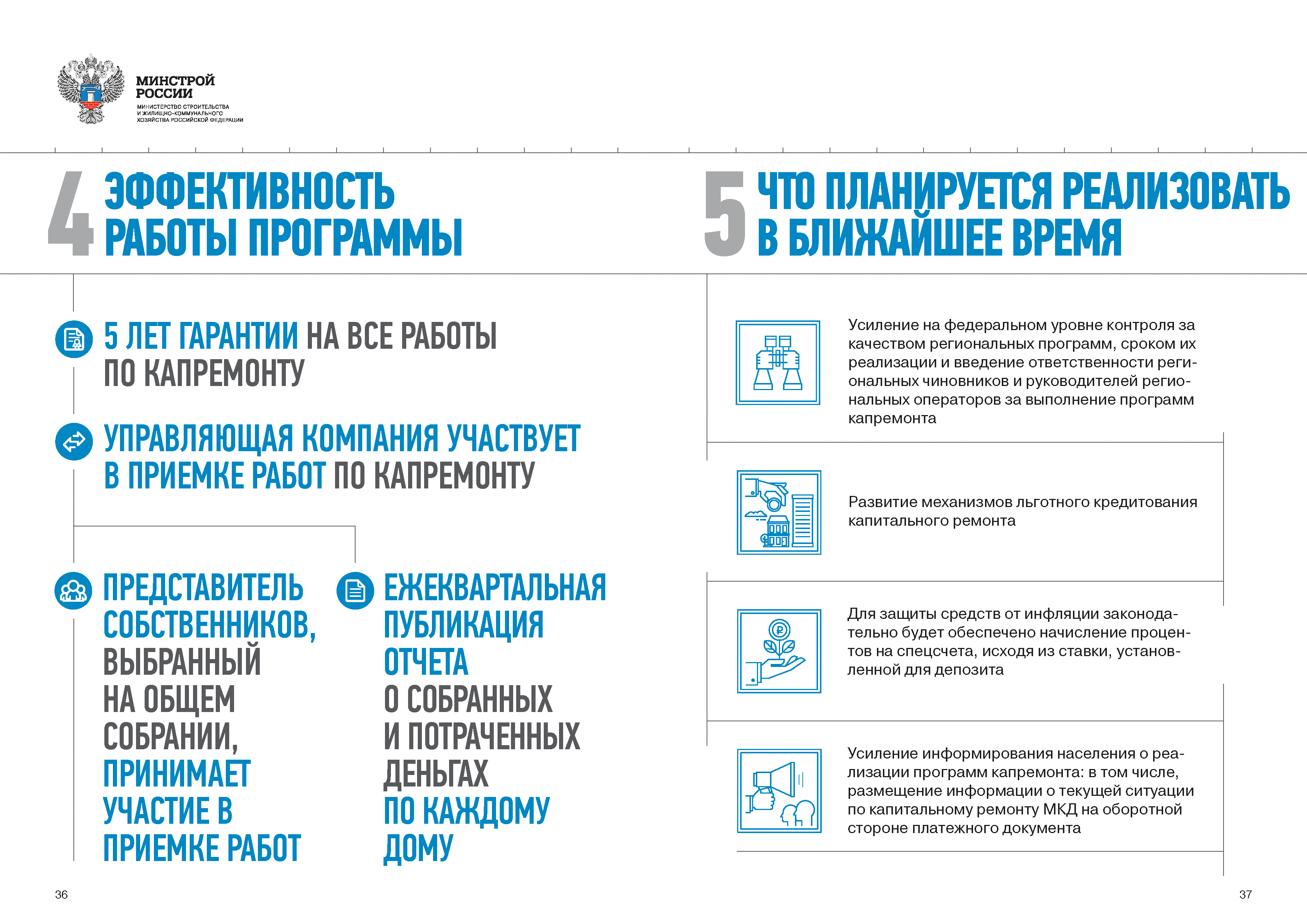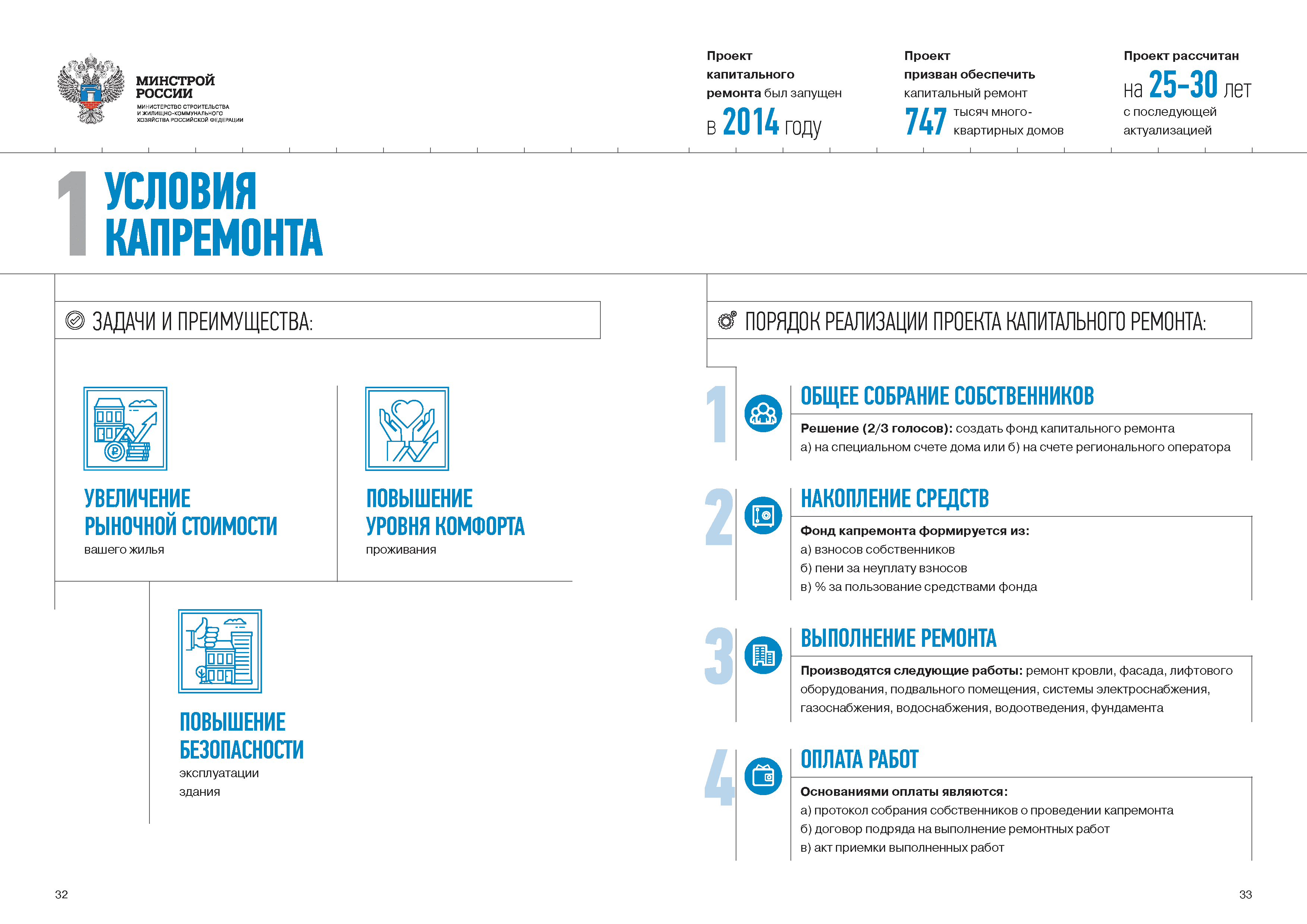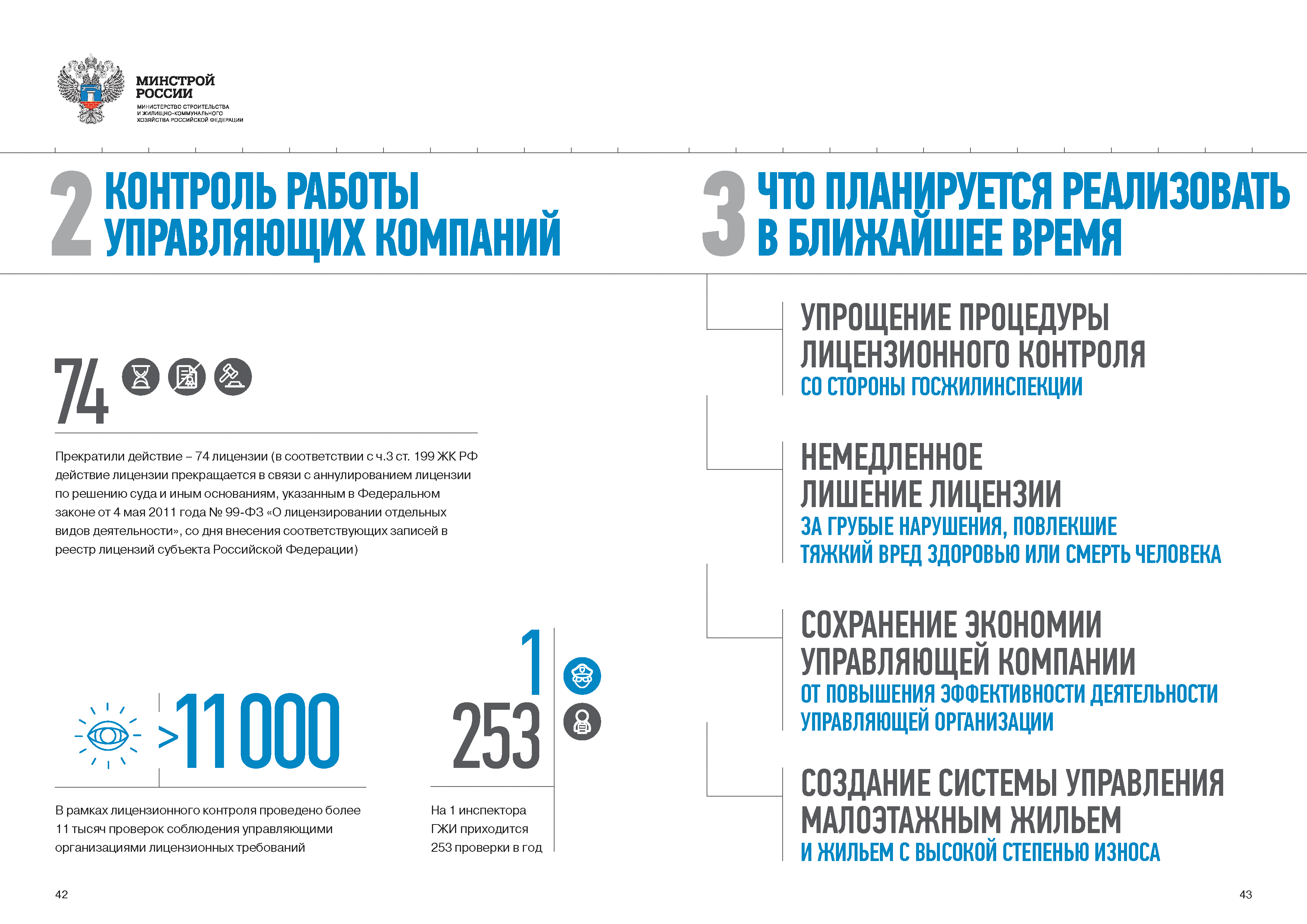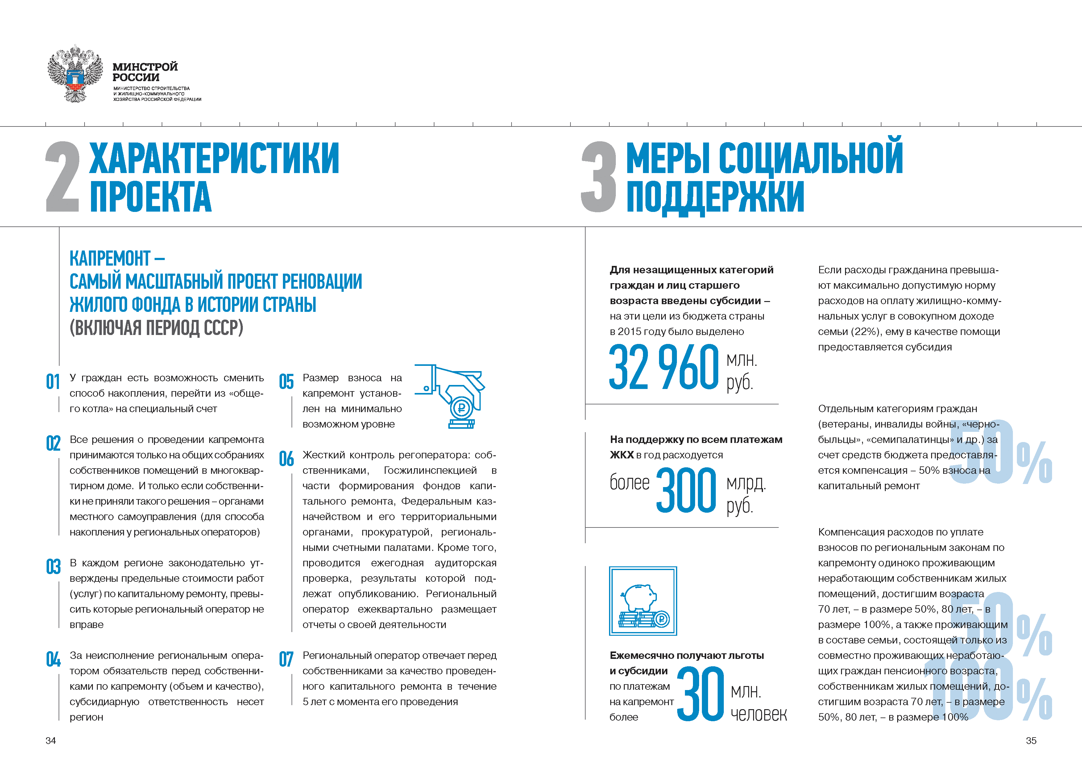 | Оглавление: | О реализации комплекса мер, направленных на решение задач, связанных с ликвидацией аварийного жилищного фонда 1. Динамика расселения аварийного жилищного фонда в 2008 - 2015 годах 2. Итоги расселения аварийного жилья за 2014 - 2015 годы 3. Меры, реализованные Минстроем России и Фондом жкх в 2014 - 2015 годах 4. Система контроля (мониторинга) реализации программ переселения "Светофор" 5. Система контроля качества 6. Дополнительные меры в отношении отстающих регионов Государственно-частное партнерство 1. Меры, направленные на привлечение инвестиций 1. 1 Новое законодательство 1. 2 Финансовая поддержка 1. 3 Организационные меры 2. Бум концессий в ЖКХ 3. Дополнительные факторы, стимулирующие инвестактивность 4. Результаты работы концессий в 35 регионах РФ 5. Проблемы и их решение Региональные системы капитального ремонта общего имущества в многоквартирных домах 1. Условия капремонта 2. Характеристики проекта 3. Меры социальной поддержки 4. Эффективность работы программы 5. Что планируется реализовать в ближайшее время Управление многоквартирными домами 1. Наведение порядка на рынке управления жильем 2. Контроль работы управляющих компаний 3. Что планируется реализовать в ближайшее время |