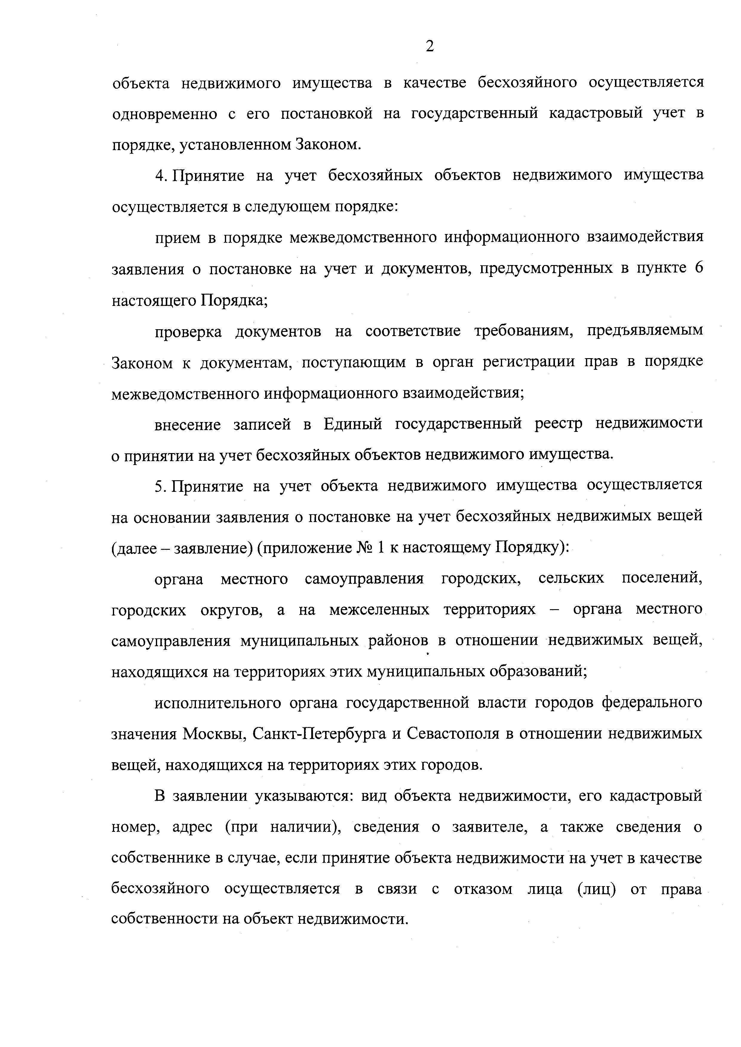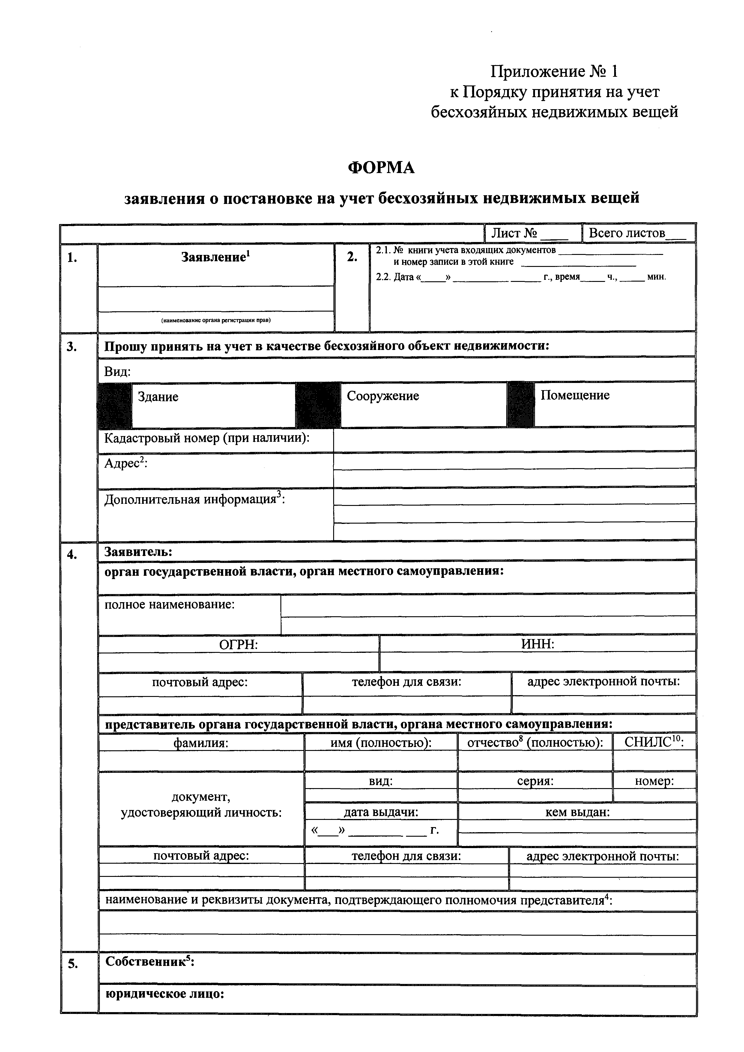 | Оглавление: | Приложение № 1. Форма заявления о постановке на учет бесхозяйных недвижимых вещей Приложение № 2. Форма уведомления о принятии на учет бесхозяйного объекта недвижимого имущества, от права собственности на который собственник отказался Приложение № 3. Форма уведомления о принятии на учет бесхозяйного объекта недвижимого имущества |