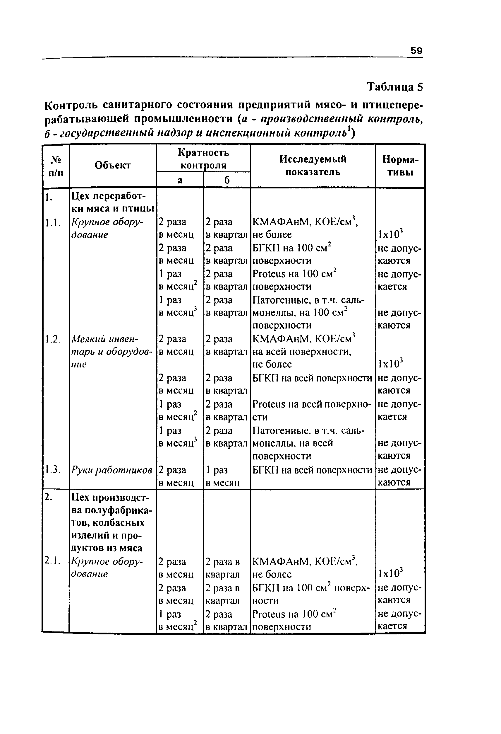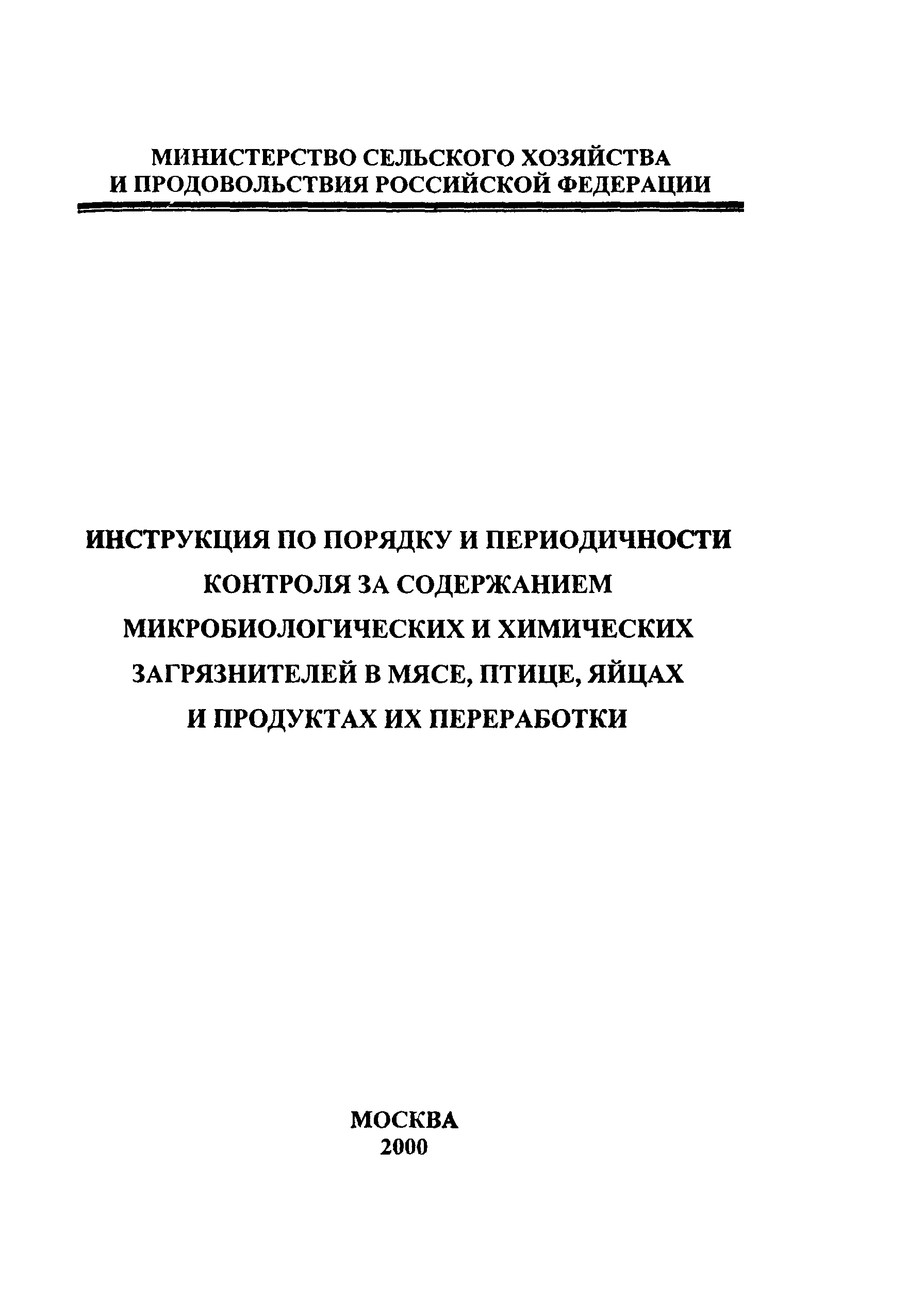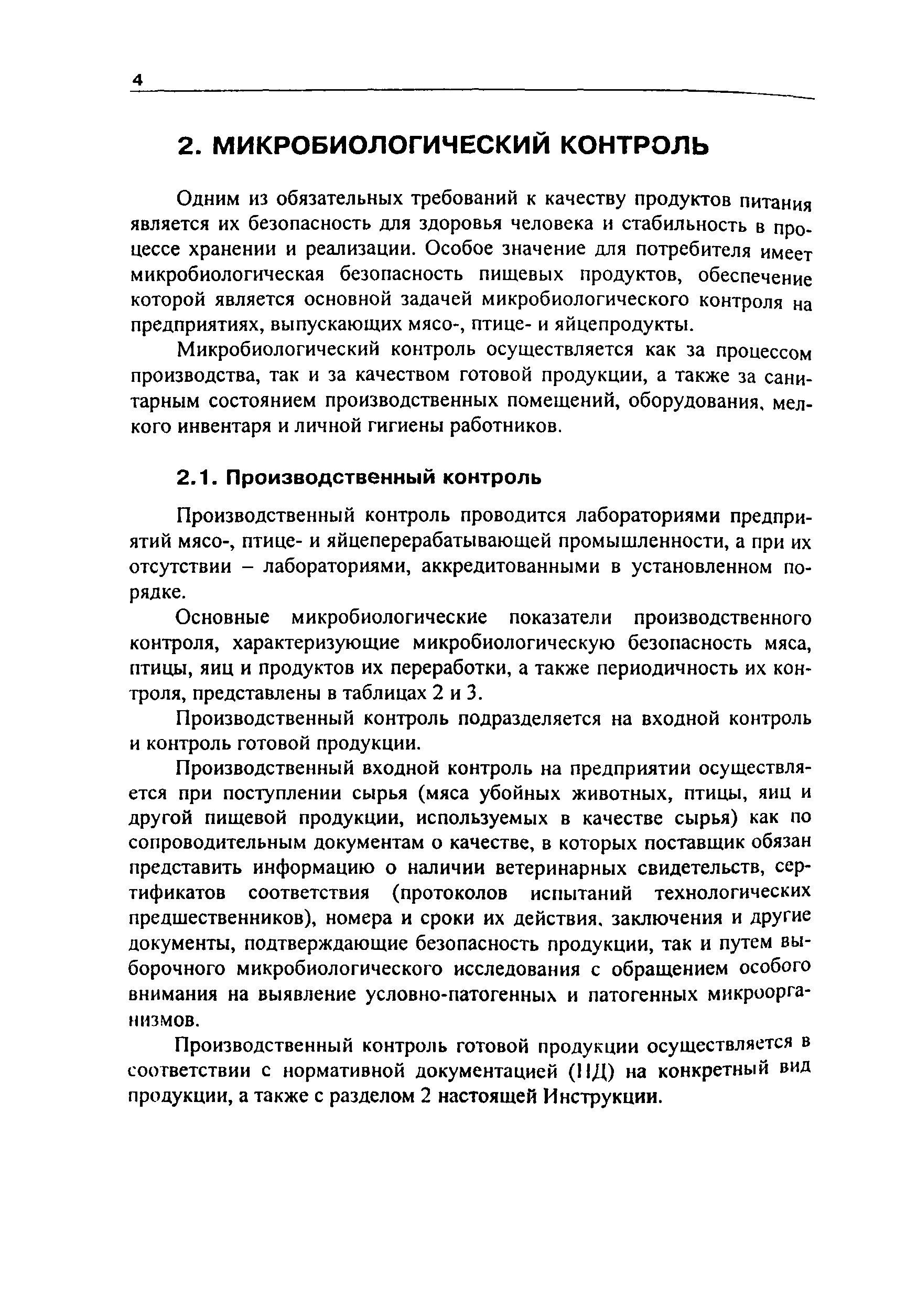 Инструкция по порядку и периодичности контроля за содержанием микробиологических и химических загрязнителей в мясе, птице, яйцах и продуктах их переработки| Статус: | действует | | Название рус.: | Инструкция по порядку и периодичности контроля за содержанием микробиологических и химических загрязнителей в мясе, птице, яйцах и продуктах их переработки | | Дата добавления в базу: | 01.02.2017 | | Дата актуализации: | 01.01.2021 | | Область применения: | Предназначена для мясо-, птице- и яйцеперерабатывающих предприятий всех форм собственности, занятых изготовлением животноводческой продукции (кроме специализированных продуктов детского питания), а также для органов и учреждений Госсанэпидслужбы РФ, осуществляющих соответственно производственный контроль и государственный санитарно-эпидемиологический надзор за производством и качеством этих продуктов. | | Оглавление: | 1. Общие положения 2. Микробиологический контроль 2.1. Производственный контроль 2.1.1. Производственный контроль мяса и мясных продуктов 2.1.2. Производственный контроль тушек, мяса птицы, птицепродуктов и яйцепродуктов 2.1.3. Производственный контроль вспомогательных материалов, сырья и других продуктов 2.2. Текущий государственный санитарно-эпидемиологический надзор 2.2.1. Общие положения 2.2.2. Текущий государственный санитарно-эпидемиологический надзор мяса убойных животных и продукции из него 2.2.3.Текущий государственный санитарно-эпидемиологический надзор тушек, мяса птицы, птицепродуктов, яиц и яйцепродуктов 2.3. Производственный контроль, текущий государственный санитарно-эпидемиологический надзор санитарного состояния предприятий мясо- и птицеперерабатывающей промышленности 2.3.1. Производственный контроль санитарного состояния предприятий 2.3.2. Текущий государственный санитарно-эпидемиологический надзор (и производственный контроль) предприятий 2.3.3. Взятие смывов и посев микроорганизмов 2.3.4. Контроль чистоты рук работников 2.3.5. Контроль санитарной одежды 2.3.6. Усиленный контроль санитарно-гигиенического содержания предприятий 3. Химические загрязнители | | Разработан: | Московский НИИ гигиены им. Ф.Ф. Эрисмана Госкомсанэпиднадзора России Департамент госсанэпиднадзора Минздрава России Институт питания РАМН ВНИИ мясной промышленности ВНИИ птицеперерабатывающей промышленности Минсельхозпрода РФ Минсельхозпрод России
