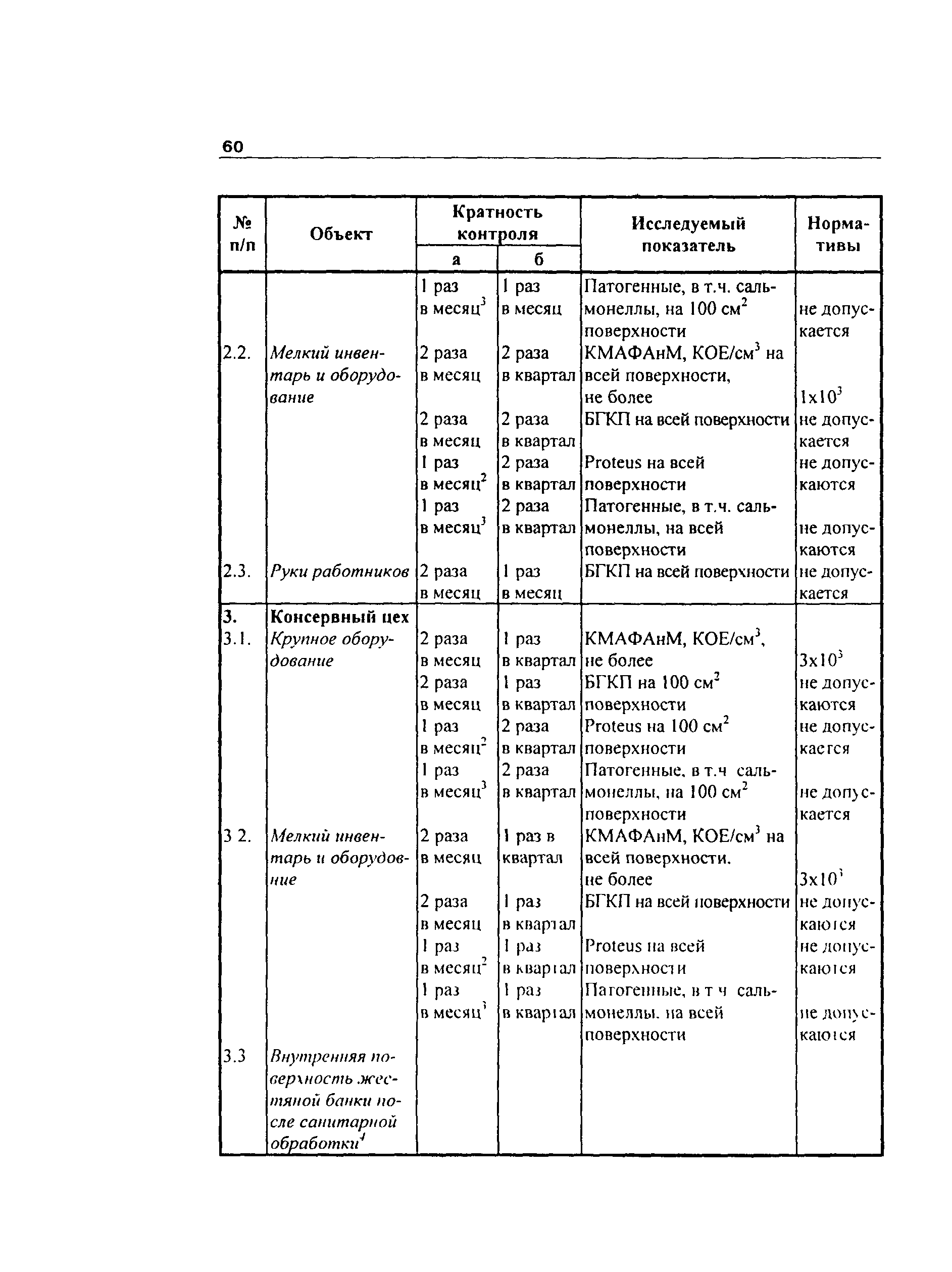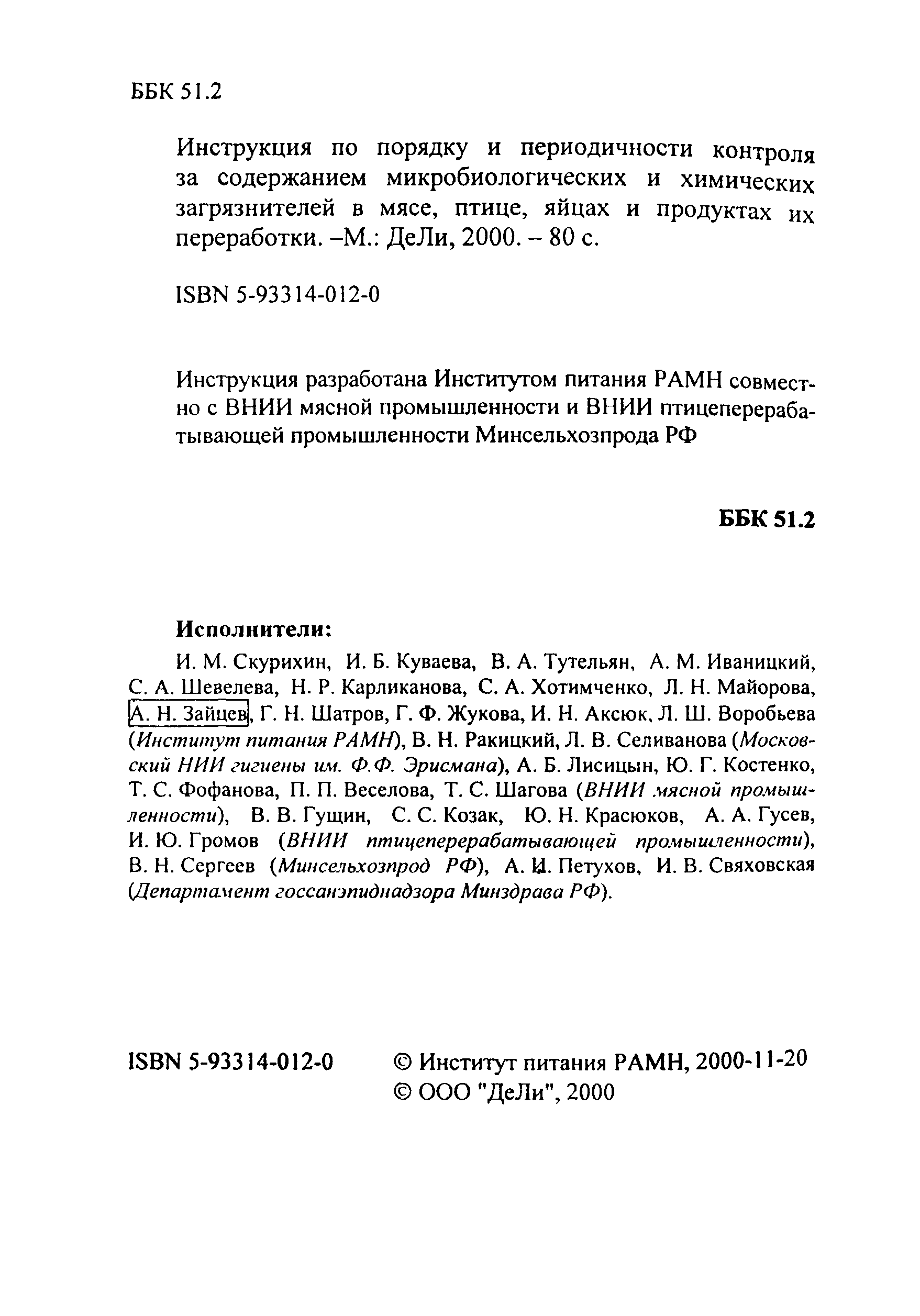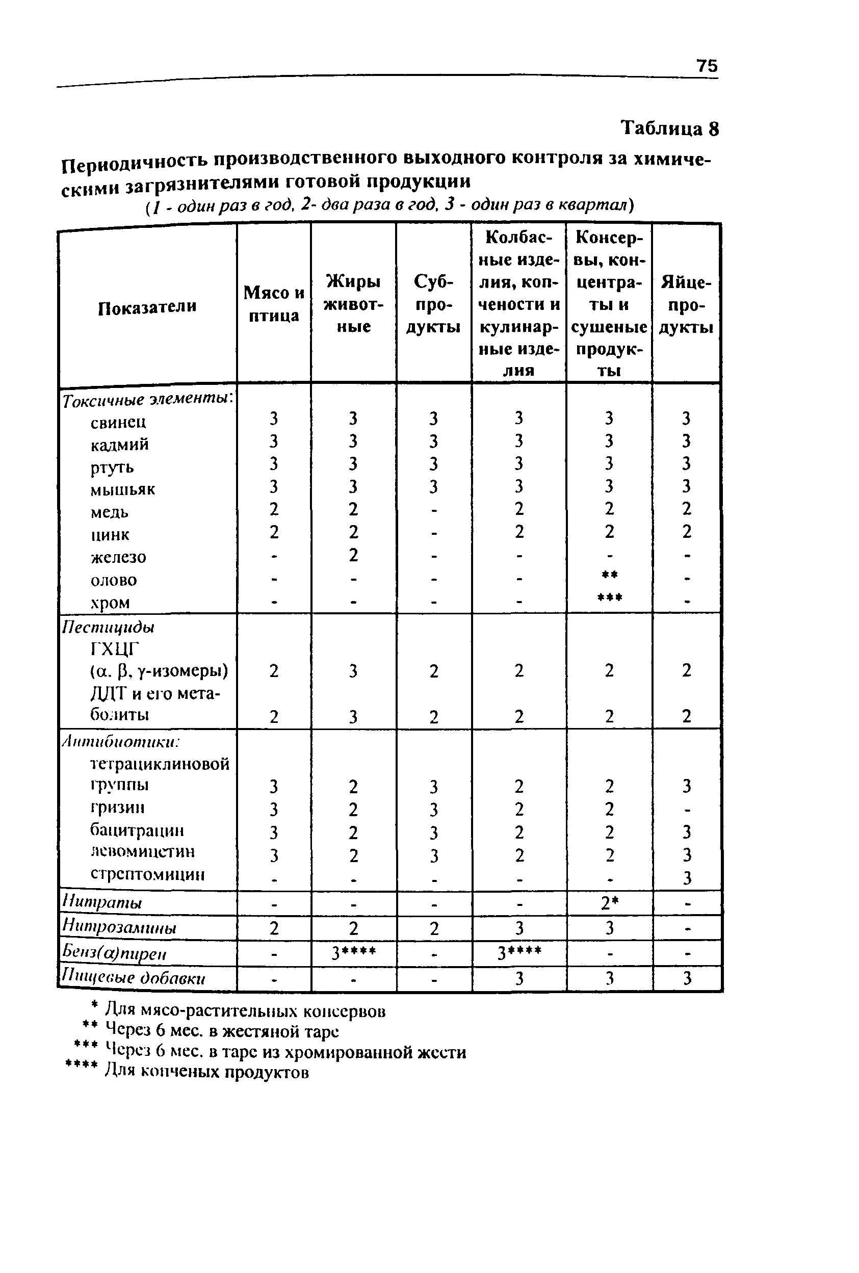 Инструкция по порядку и периодичности контроля за содержанием микробиологических и химических загрязнителей в мясе, птице, яйцах и продуктах их переработки| Статус: | действует | | Название рус.: | Инструкция по порядку и периодичности контроля за содержанием микробиологических и химических загрязнителей в мясе, птице, яйцах и продуктах их переработки | | Дата добавления в базу: | 01.02.2017 | | Дата актуализации: | 01.01.2021 | | Область применения: | Предназначена для мясо-, птице- и яйцеперерабатывающих предприятий всех форм собственности, занятых изготовлением животноводческой продукции (кроме специализированных продуктов детского питания), а также для органов и учреждений Госсанэпидслужбы РФ, осуществляющих соответственно производственный контроль и государственный санитарно-эпидемиологический надзор за производством и качеством этих продуктов. | | Оглавление: | 1. Общие положения 2. Микробиологический контроль 2.1. Производственный контроль 2.1.1. Производственный контроль мяса и мясных продуктов 2.1.2. Производственный контроль тушек, мяса птицы, птицепродуктов и яйцепродуктов 2.1.3. Производственный контроль вспомогательных материалов, сырья и других продуктов 2.2. Текущий государственный санитарно-эпидемиологический надзор 2.2.1. Общие положения 2.2.2. Текущий государственный санитарно-эпидемиологический надзор мяса убойных животных и продукции из него 2.2.3.Текущий государственный санитарно-эпидемиологический надзор тушек, мяса птицы, птицепродуктов, яиц и яйцепродуктов 2.3. Производственный контроль, текущий государственный санитарно-эпидемиологический надзор санитарного состояния предприятий мясо- и птицеперерабатывающей промышленности 2.3.1. Производственный контроль санитарного состояния предприятий 2.3.2. Текущий государственный санитарно-эпидемиологический надзор (и производственный контроль) предприятий 2.3.3. Взятие смывов и посев микроорганизмов 2.3.4. Контроль чистоты рук работников 2.3.5. Контроль санитарной одежды 2.3.6. Усиленный контроль санитарно-гигиенического содержания предприятий 3. Химические загрязнители | | Разработан: | Московский НИИ гигиены им. Ф.Ф. Эрисмана Госкомсанэпиднадзора России Департамент госсанэпиднадзора Минздрава России Институт питания РАМН ВНИИ мясной промышленности ВНИИ птицеперерабатывающей промышленности Минсельхозпрода РФ Минсельхозпрод России