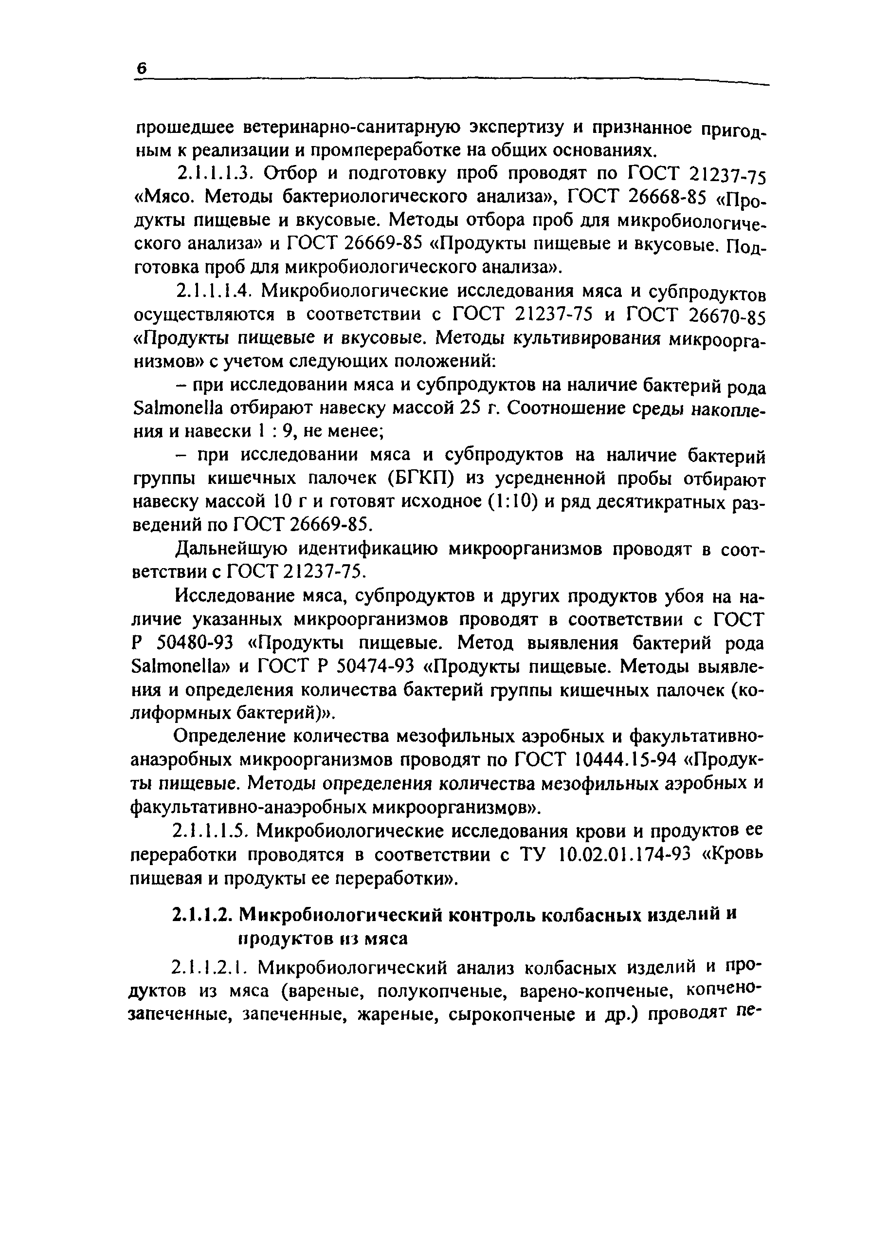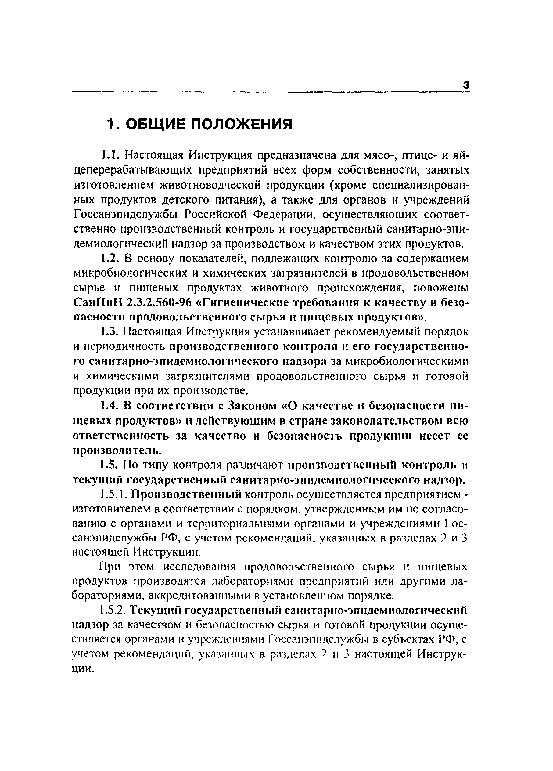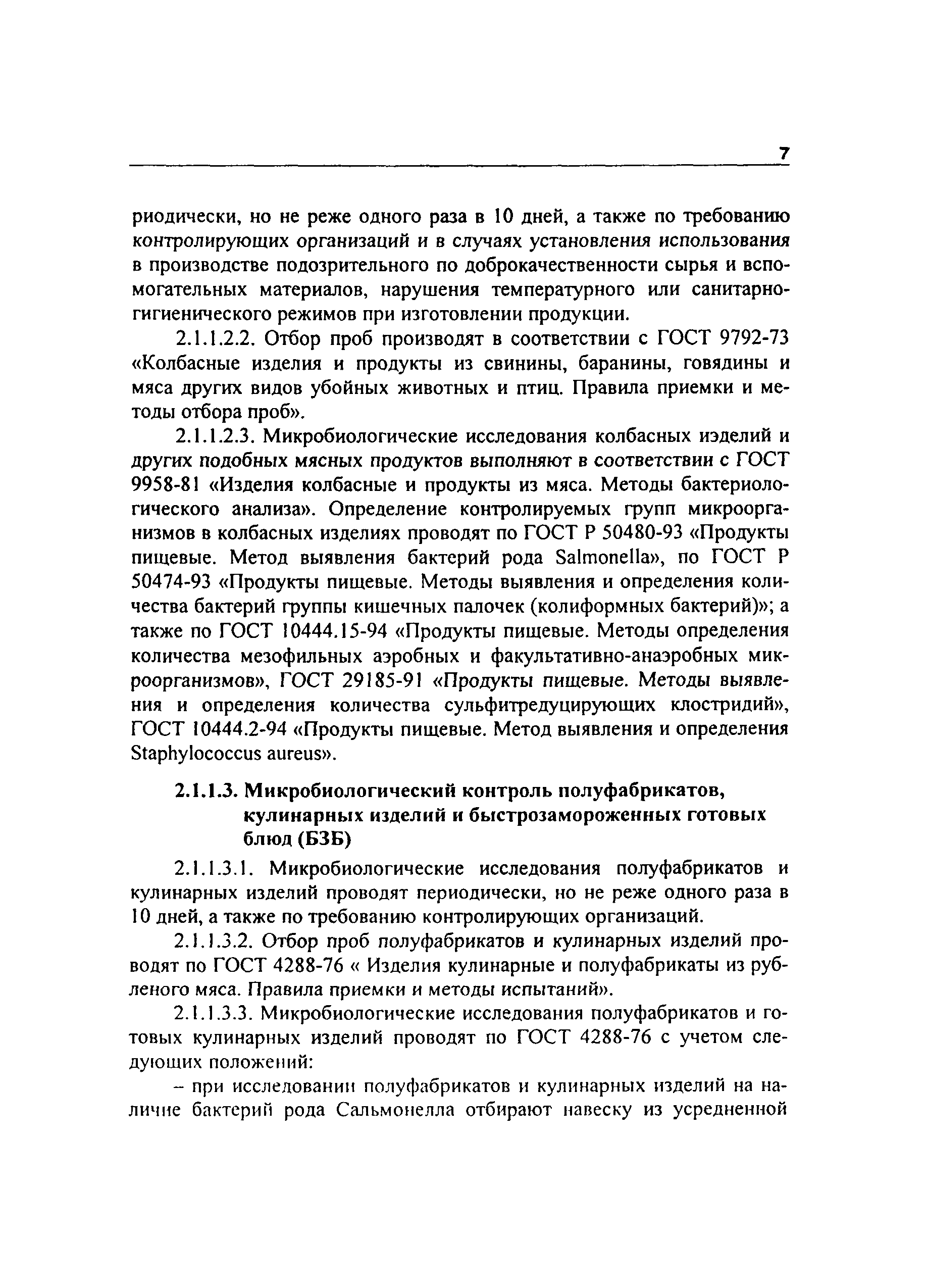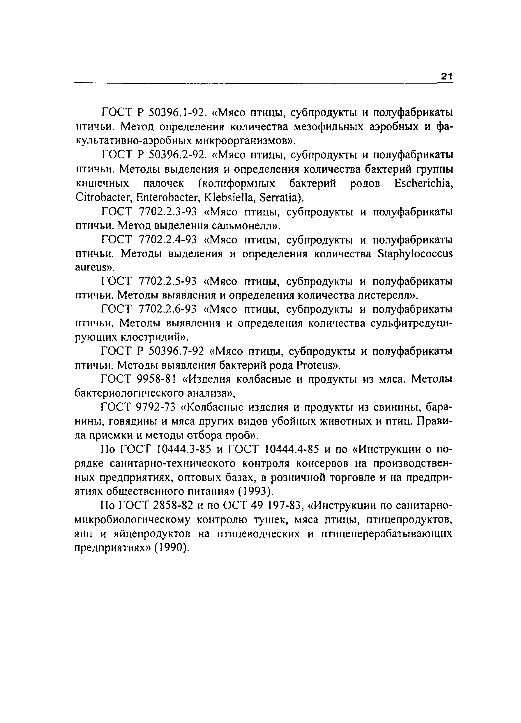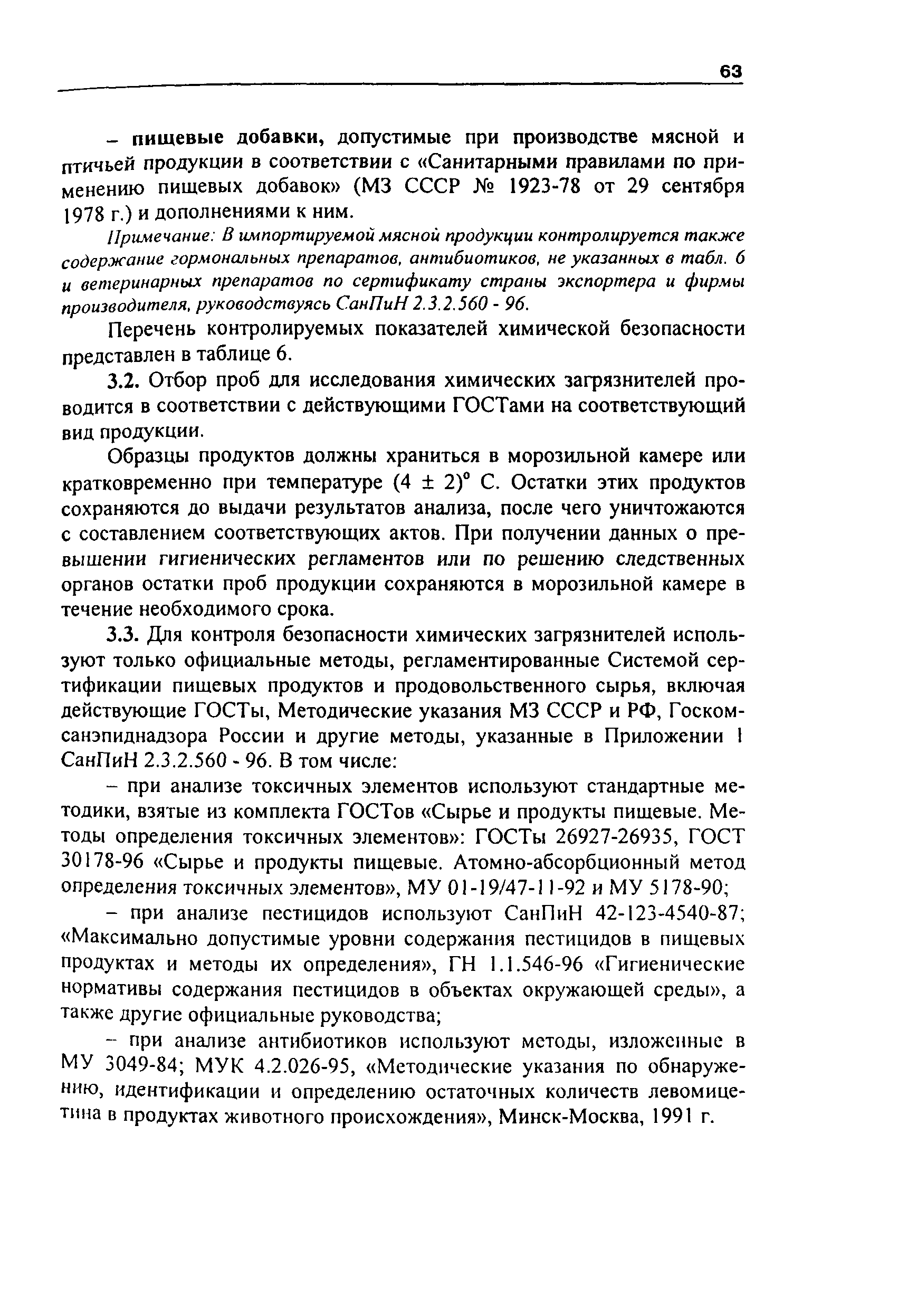 | | Нормативные ссылки: |  СанПиН 2.1.4.559-96 «Питьевая вода. Гигиенические требования к качеству воды централизованных систем питьевого водоснабжения. Контроль качества» ГОСТ 10444.12-88 «Продукты пищевые. Метод определения дрожжей и плесневых грибов»  ГОСТ 10444.15-94 «Продукты пищевые. Методы определения количества мезофильных аэробных и факультативно-анаэробных микроорганизмов» ГОСТ 10444.2-94 «Продукты пищевые. Методы выявления и определения количества Staphylococcus aureus» ГОСТ 10444.8-88 «Продукты пищевые. Метод определения Bacillus cereus»  ГОСТ 10444.9-88 «Продукты пищевые. Метод определения Сlostridium perfringens» ГОСТ 21237-75 «Мясо. Методы бактериологического анализа» ГОСТ 26668-85 «Продукты пищевые и вкусовые. Методы отбора проб для микробиологических анализов»  ГОСТ 26669-85 «Продукты пищевые и вкусовые. Подготовка проб для микробиологических анализов»  ГОСТ 26670-91 «Продукты пищевые. Методы культивирования микроорганизмов»  ГОСТ 26927-86 «Сырье и продукты пищевые. Методы определения ртути»  ГОСТ 26928-86 «Продукты пищевые. Метод определения железа»  ГОСТ 26930-86 «Сырье и продукты пищевые. Метод определения мышьяка»  ГОСТ 26931-86 «Сырье и продукты пищевые. Методы определения меди»  ГОСТ 26932-86 «Сырье и продукты пищевые. Методы определения свинца»  ГОСТ 26933-86 «Сырье и продукты пищевые. Методы определения кадмия»  ГОСТ 26934-86 «Сырье и продукты пищевые. Метод определения цинка» ГОСТ 26935-86 «Продукты пищевые консервированные. Метод определения олова»  ГОСТ 28560-90 «Продукты пищевые. Метод выявления бактерий родов Рrоtеus, Morganella, Providencia»  ГОСТ 28566-90 «Продукты пищевые. Метод выявления и определения количества энтерококков» ГОСТ 2858-82 «Порошок яичный. Технические условия» ГОСТ 29185-91 «Продукты пищевые. Методы выявления и определения количества сульфитредуцирующих клостридий»  ГОСТ 30178-96 «Сырье и продукты пищевые. Атомно-абсорбционный метод определения токсичных элементов» ГОСТ 4288-76 «Изделия кулинарные и полуфабрикаты из рубленого мяса. Правила приемки и методы испытаний» ГОСТ 7702.2.0-95 «Мясо птицы, субпродукты и полуфабрикаты птичьи. Методы отбора проб и подготовка к микробиологическим исследованиям» ГОСТ 7702.2.3-93 «Мясо птицы, субпродукты и полуфабрикаты птичьи. Метод выявления сальмонелл» ГОСТ 7702.2.4-93 «Мясо птицы, субпродукты и полуфабрикаты птичьи. Методы выявления и определения количества Stарhуlососсus аurеus» ГОСТ 7702.2.5-93 «Мясо птицы, субпродукты и полуфабрикаты птичьи. Методы выявления и определения количества листерелл» ГОСТ 7702.2.6-93 «Мясо птицы, субпродукты и полуфабрикаты птичьи. Методы выявления и определения количества сульфитредуцирующих клостридий» ГОСТ 8756.0-70 «Продукты пищевые консервированные. Отбор проб и подготовка их к испытанию» ГОСТ 9792-73 «Колбасные изделия и продукты из свинины, баранины, говядины и мяса других видов убойных животных и птиц. Правила приемки и методы отбора проб» ГОСТ 9958-81 «Колбасные изделия и продукты из мяса. Методы бактериологического анализа» ГОСТ Р 50396.2-92 «Мясо птицы, субпродукты и полуфабрикаты птичьи. Методы выявления и определения количества бактерий группы кишечных палочек (колиформных бактерий родов Еsсhеriсhiа, Сitrоbасtеr, Еntеrоbасtеr, Кlеbsiеllа, Sеrrаtiа)»  ГН 1.1.546-96 «Гигиенические нормативы содержания пестицидов в объектах окружающей среды (перечень)»  МУ 5178-90 «Методические указания по обнаружению и определению содержания общей ртути в пищевых продуктах методом 