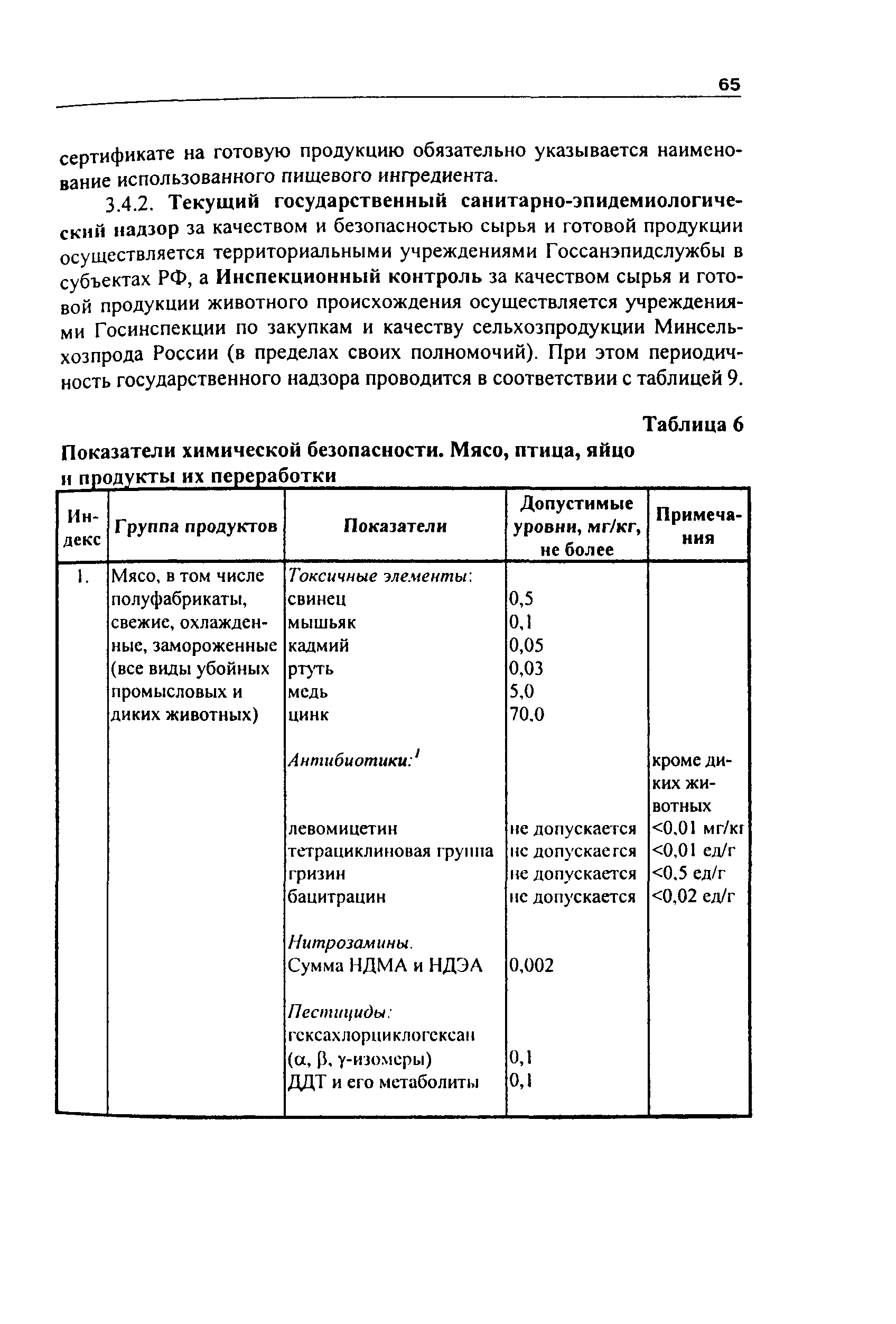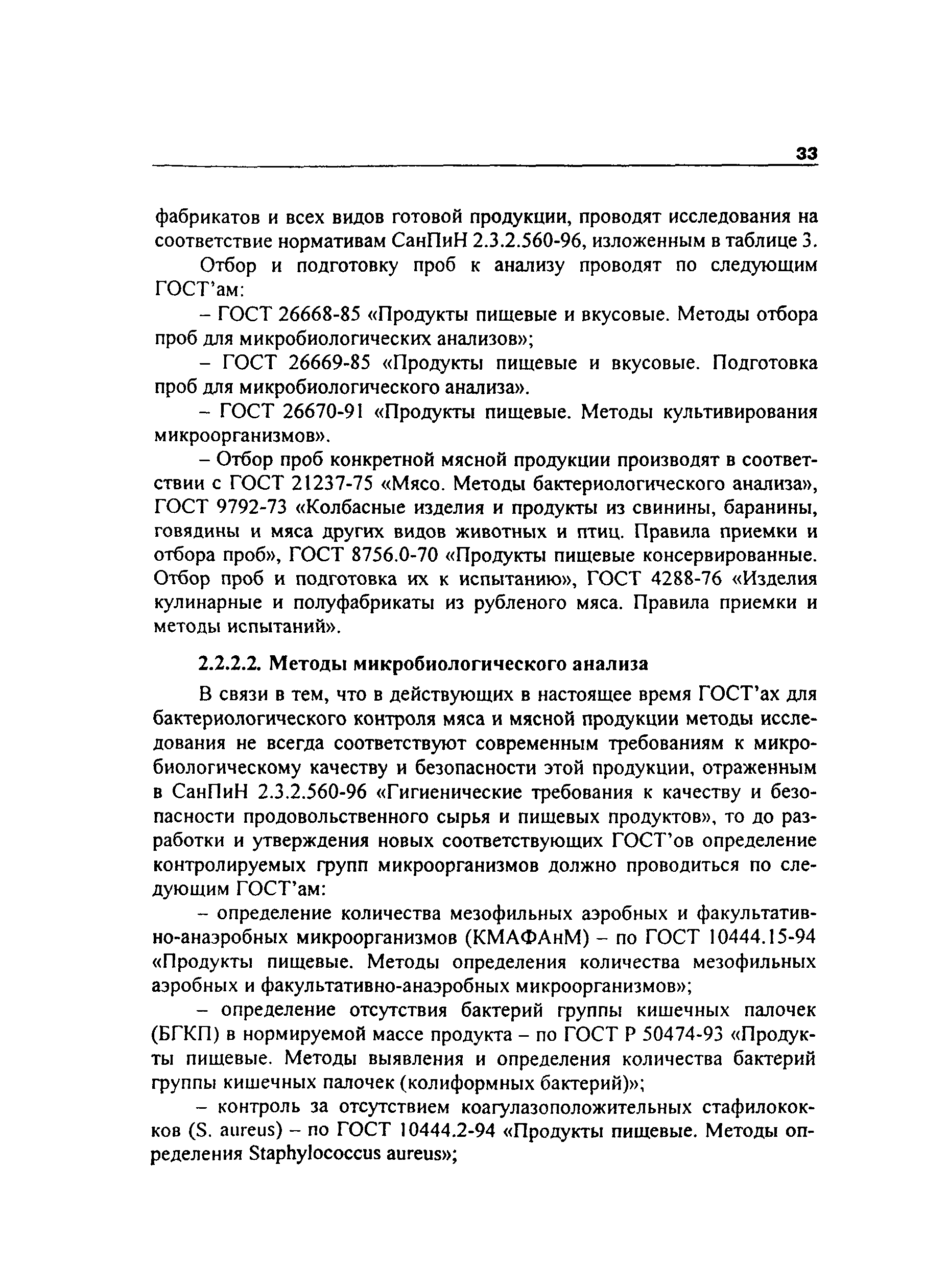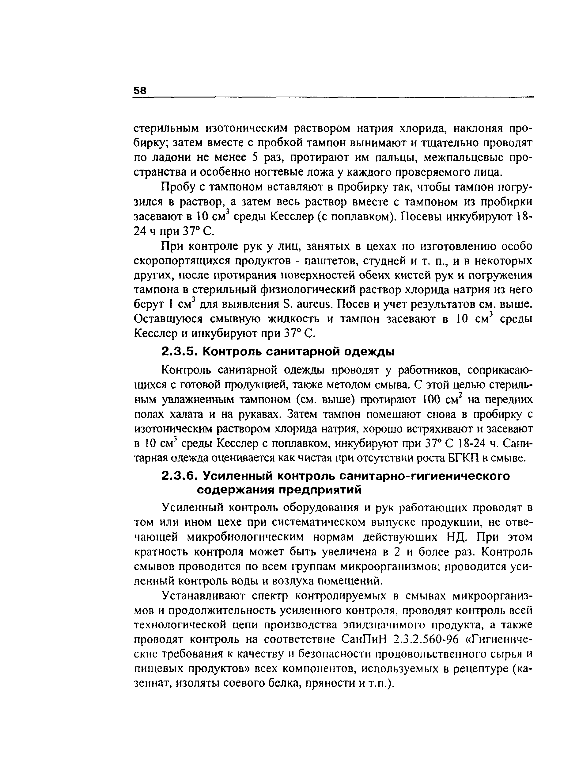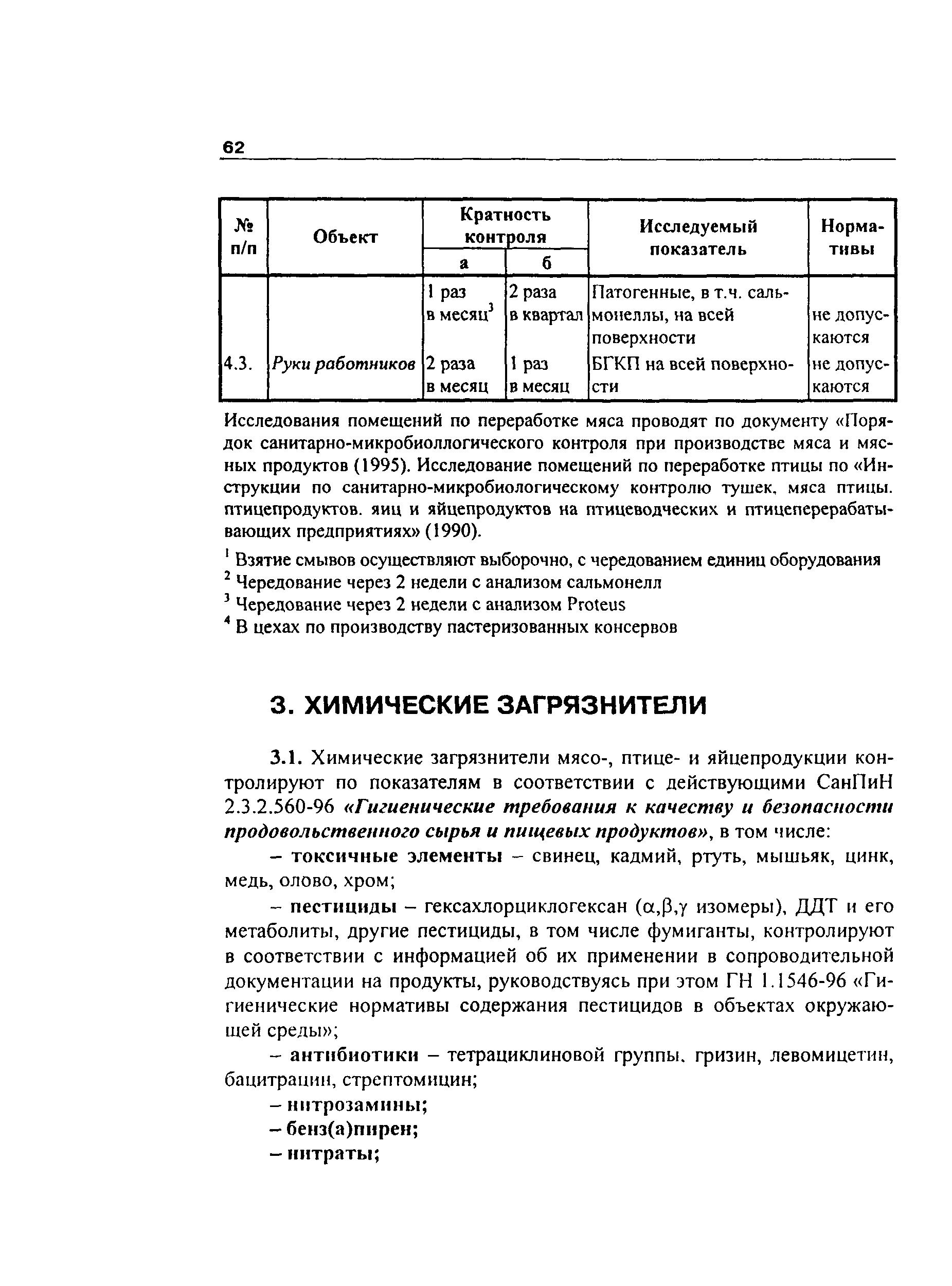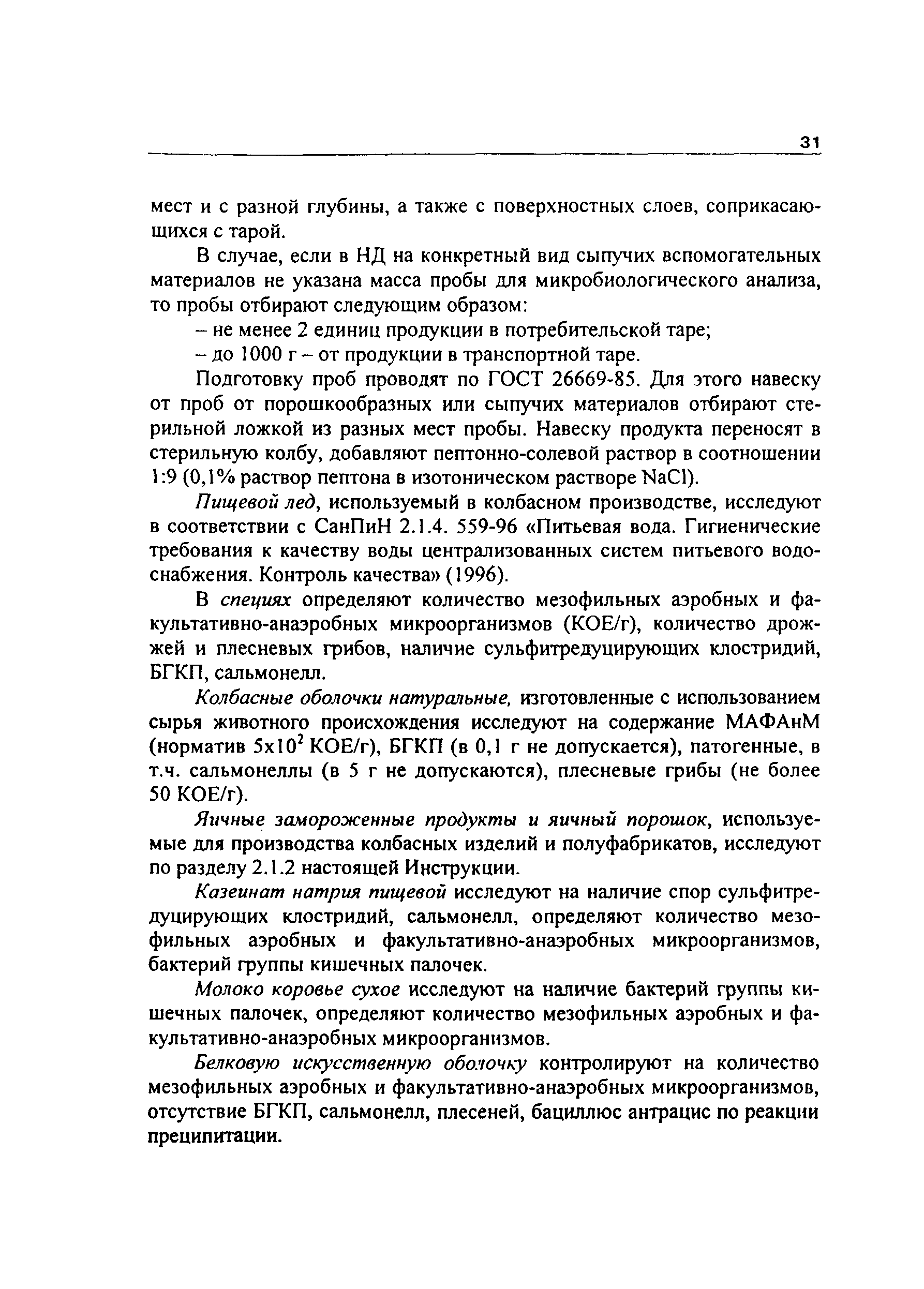 | | Нормативные ссылки: |  СанПиН 2.1.4.559-96 «Питьевая вода. Гигиенические требования к качеству воды централизованных систем питьевого водоснабжения. Контроль качества» ГОСТ 10444.12-88 «Продукты пищевые. Метод определения дрожжей и плесневых грибов»  ГОСТ 10444.15-94 «Продукты пищевые. Методы определения количества мезофильных аэробных и факультативно-анаэробных микроорганизмов» ГОСТ 10444.2-94 «Продукты пищевые. Методы выявления и определения количества Staphylococcus aureus» ГОСТ 10444.8-88 «Продукты пищевые. Метод определения Bacillus cereus»  ГОСТ 10444.9-88 «Продукты пищевые. Метод определения Сlostridium perfringens» ГОСТ 21237-75 «Мясо. Методы бактериологического анализа» ГОСТ 26668-85 «Продукты пищевые и вкусовые. Методы отбора проб для микробиологических анализов»  ГОСТ 26669-85 «Продукты пищевые и вкусовые. Подготовка проб для микробиологических анализов»  ГОСТ 26670-91 «Продукты пищевые. Методы культивирования микроорганизмов»  ГОСТ 26927-86 «Сырье и продукты пищевые. Методы определения ртути»  ГОСТ 26928-86 «Продукты пищевые. Метод определения железа»  ГОСТ 26930-86 «Сырье и продукты пищевые. Метод определения мышьяка»  ГОСТ 26931-86 «Сырье и продукты пищевые. Методы определения меди»  ГОСТ 26932-86 «Сырье и продукты пищевые. Методы определения свинца»  ГОСТ 26933-86 «Сырье и продукты пищевые. Методы определения кадмия»  ГОСТ 26934-86 «Сырье и продукты пищевые. Метод определения цинка» ГОСТ 26935-86 «Продукты пищевые консервированные. Метод определения олова»  ГОСТ 28560-90 «Продукты пищевые. Метод выявления бактерий родов Рrоtеus, Morganella, Providencia»  ГОСТ 28566-90 «Продукты пищевые. Метод выявления и определения количества энтерококков» ГОСТ 2858-82 «Порошок яичный. Технические условия» ГОСТ 29185-91 «Продукты пищевые. Методы выявления и определения количества сульфитредуцирующих клостридий»  ГОСТ 30178-96 «Сырье и продукты пищевые. Атомно-абсорбционный метод определения токсичных элементов» ГОСТ 4288-76 «Изделия кулинарные и полуфабрикаты из рубленого мяса. Правила приемки и методы испытаний» ГОСТ 7702.2.0-95 «Мясо птицы, субпродукты и полуфабрикаты птичьи. Методы отбора проб и подготовка к микробиологическим исследованиям» ГОСТ 7702.2.3-93 «Мясо птицы, субпродукты и полуфабрикаты птичьи. Метод выявления сальмонелл» ГОСТ 7702.2.4-93 «Мясо птицы, субпродукты и полуфабрикаты птичьи. Методы выявления и определения количества Stарhуlососсus аurеus» ГОСТ 7702.2.5-93 «Мясо птицы, субпродукты и полуфабрикаты птичьи. Методы выявления и определения количества листерелл» ГОСТ 7702.2.6-93 «Мясо птицы, субпродукты и полуфабрикаты птичьи. Методы выявления и определения количества сульфитредуцирующих клостридий» ГОСТ 8756.0-70 «Продукты пищевые консервированные. Отбор проб и подготовка их к испытанию» ГОСТ 9792-73 «Колбасные изделия и продукты из свинины, баранины, говядины и мяса других видов убойных животных и птиц. Правила приемки и методы отбора проб» ГОСТ 9958-81 «Колбасные изделия и продукты из мяса. Методы бактериологического анализа» ГОСТ Р 50396.2-92 «Мясо птицы, субпродукты и полуфабрикаты птичьи. Методы выявления и определения количества бактерий группы кишечных палочек (колиформных бактерий родов Еsсhеriсhiа, Сitrоbасtеr, Еntеrоbасtеr, Кlеbsiеllа, Sеrrаtiа)»  ГН 1.1.546-96 «Гигиенические нормативы содержания пестицидов в объектах окружающей среды (перечень)»  МУ 5178-90 «Методические указания по обнаружению и определению содержания общей ртути в пищевых продуктах методом 