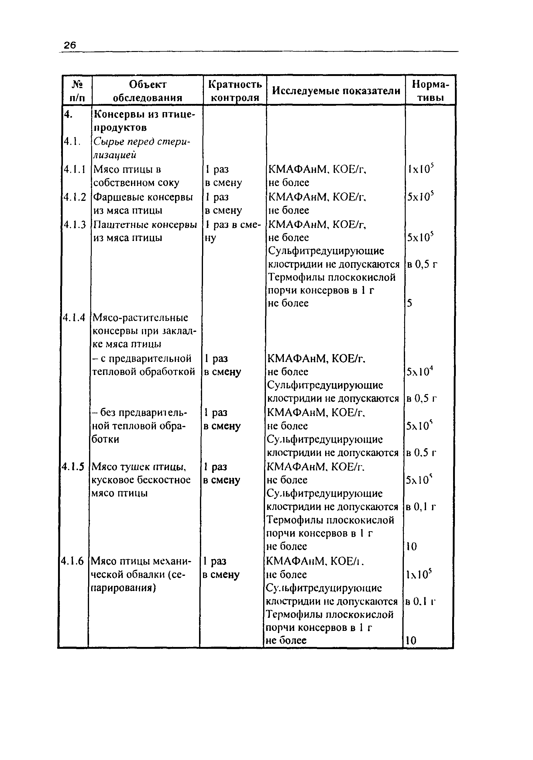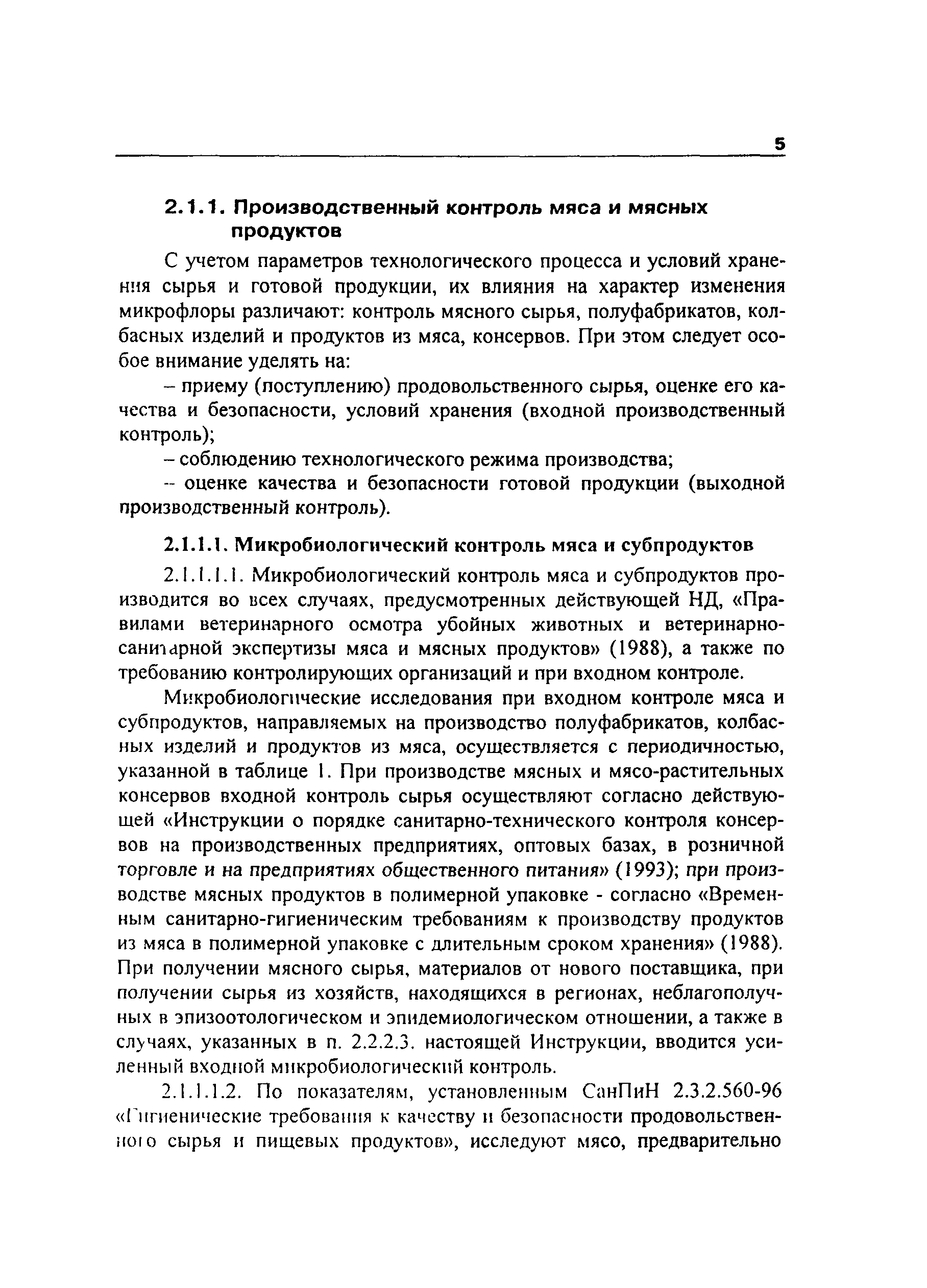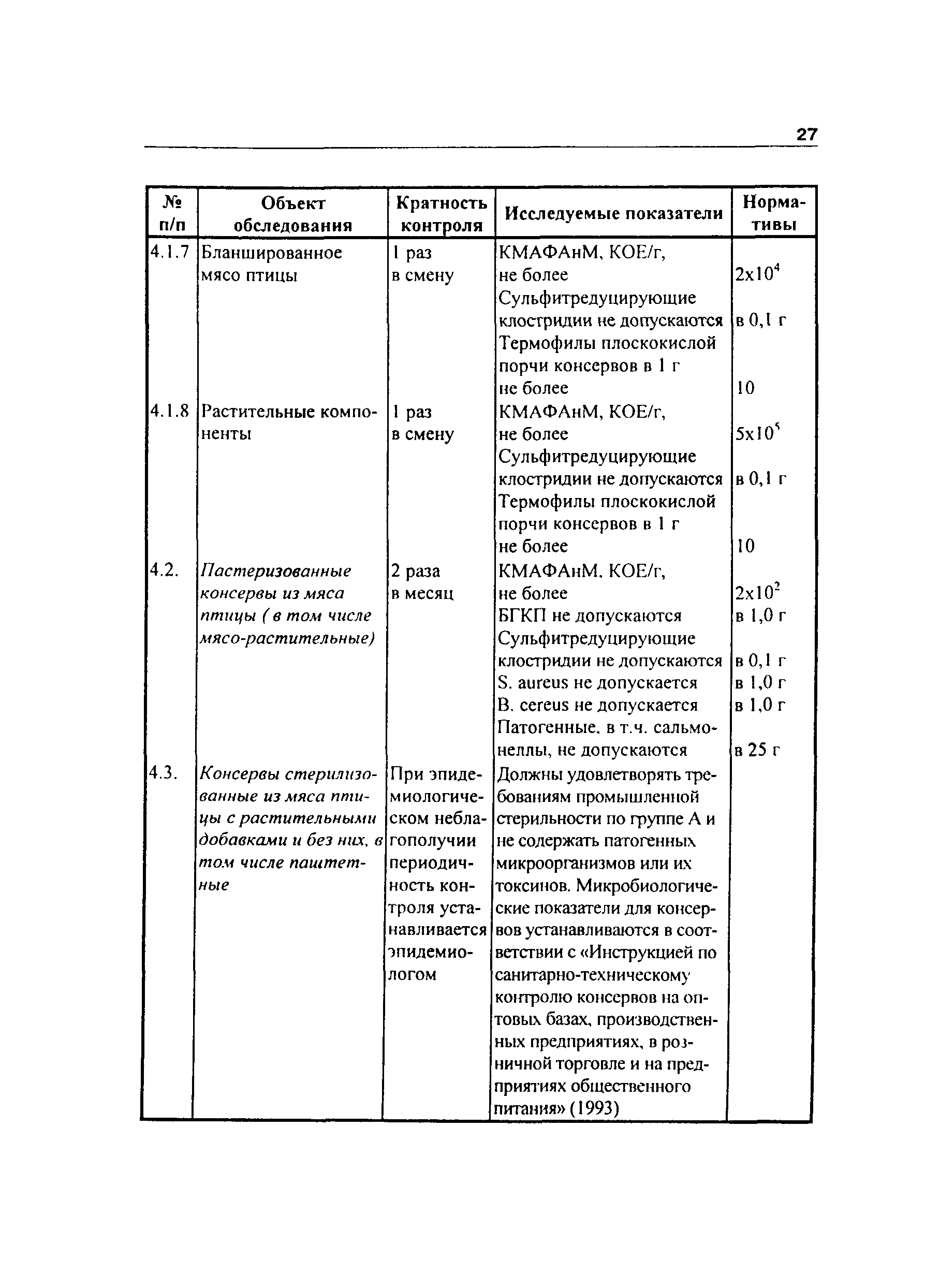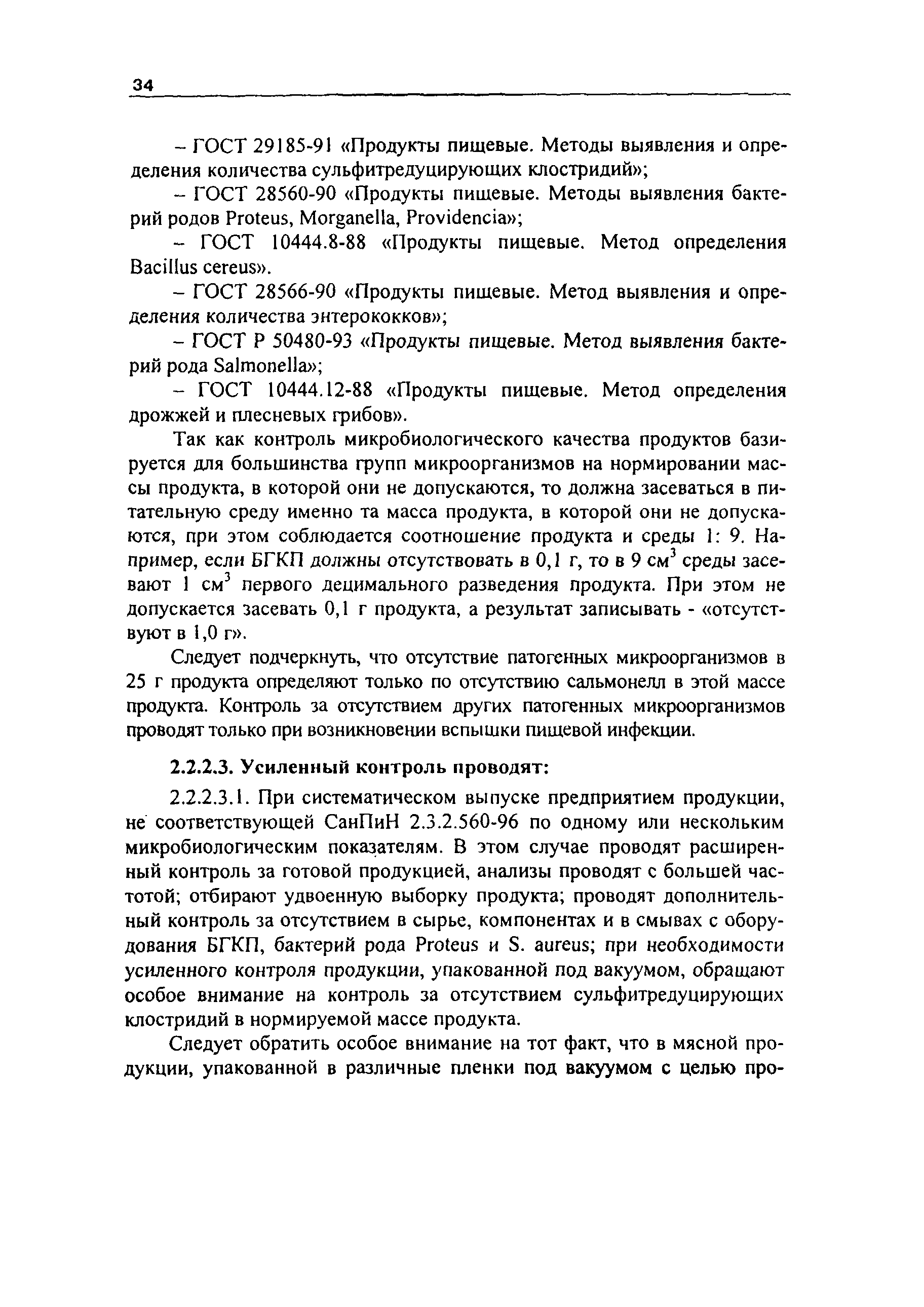 | | Нормативные ссылки: |  СанПиН 2.1.4.559-96 «Питьевая вода. Гигиенические требования к качеству воды централизованных систем питьевого водоснабжения. Контроль качества» ГОСТ 10444.12-88 «Продукты пищевые. Метод определения дрожжей и плесневых грибов»  ГОСТ 10444.15-94 «Продукты пищевые. Методы определения количества мезофильных аэробных и факультативно-анаэробных микроорганизмов» ГОСТ 10444.2-94 «Продукты пищевые. Методы выявления и определения количества Staphylococcus aureus» ГОСТ 10444.8-88 «Продукты пищевые. Метод определения Bacillus cereus»  ГОСТ 10444.9-88 «Продукты пищевые. Метод определения Сlostridium perfringens» ГОСТ 21237-75 «Мясо. Методы бактериологического анализа» ГОСТ 26668-85 «Продукты пищевые и вкусовые. Методы отбора проб для микробиологических анализов»  ГОСТ 26669-85 «Продукты пищевые и вкусовые. Подготовка проб для микробиологических анализов»  ГОСТ 26670-91 «Продукты пищевые. Методы культивирования микроорганизмов»  ГОСТ 26927-86 «Сырье и продукты пищевые. Методы определения ртути»  ГОСТ 26928-86 «Продукты пищевые. Метод определения железа»  ГОСТ 26930-86 «Сырье и продукты пищевые. Метод определения мышьяка»  ГОСТ 26931-86 «Сырье и продукты пищевые. Методы определения меди»  ГОСТ 26932-86 «Сырье и продукты пищевые. Методы определения свинца»  ГОСТ 26933-86 «Сырье и продукты пищевые. Методы определения кадмия»  ГОСТ 26934-86 «Сырье и продукты пищевые. Метод определения цинка» ГОСТ 26935-86 «Продукты пищевые консервированные. Метод определения олова»  ГОСТ 28560-90 «Продукты пищевые. Метод выявления бактерий родов Рrоtеus, Morganella, Providencia»  ГОСТ 28566-90 «Продукты пищевые. Метод выявления и определения количества энтерококков» ГОСТ 2858-82 «Порошок яичный. Технические условия» ГОСТ 29185-91 «Продукты пищевые. Методы выявления и определения количества сульфитредуцирующих клостридий»  ГОСТ 30178-96 «Сырье и продукты пищевые. Атомно-абсорбционный метод определения токсичных элементов» ГОСТ 4288-76 «Изделия кулинарные и полуфабрикаты из рубленого мяса. Правила приемки и методы испытаний» ГОСТ 7702.2.0-95 «Мясо птицы, субпродукты и полуфабрикаты птичьи. Методы отбора проб и подготовка к микробиологическим исследованиям» ГОСТ 7702.2.3-93 «Мясо птицы, субпродукты и полуфабрикаты птичьи. Метод выявления сальмонелл» ГОСТ 7702.2.4-93 «Мясо птицы, субпродукты и полуфабрикаты птичьи. Методы выявления и определения количества Stарhуlососсus аurеus» ГОСТ 7702.2.5-93 «Мясо птицы, субпродукты и полуфабрикаты птичьи. Методы выявления и определения количества листерелл» ГОСТ 7702.2.6-93 «Мясо птицы, субпродукты и полуфабрикаты птичьи. Методы выявления и определения количества сульфитредуцирующих клостридий» ГОСТ 8756.0-70 «Продукты пищевые консервированные. Отбор проб и подготовка их к испытанию» ГОСТ 9792-73 «Колбасные изделия и продукты из свинины, баранины, говядины и мяса других видов убойных животных и птиц. Правила приемки и методы отбора проб» ГОСТ 9958-81 «Колбасные изделия и продукты из мяса. Методы бактериологического анализа» ГОСТ Р 50396.2-92 «Мясо птицы, субпродукты и полуфабрикаты птичьи. Методы выявления и определения количества бактерий группы кишечных палочек (колиформных бактерий родов Еsсhеriсhiа, Сitrоbасtеr, Еntеrоbасtеr, Кlеbsiеllа, Sеrrаtiа)»  ГН 1.1.546-96 «Гигиенические нормативы содержания пестицидов в объектах окружающей среды (перечень)»  МУ 5178-90 «Методические указания по обнаружению и определению содержания общей ртути в пищевых продуктах методом 