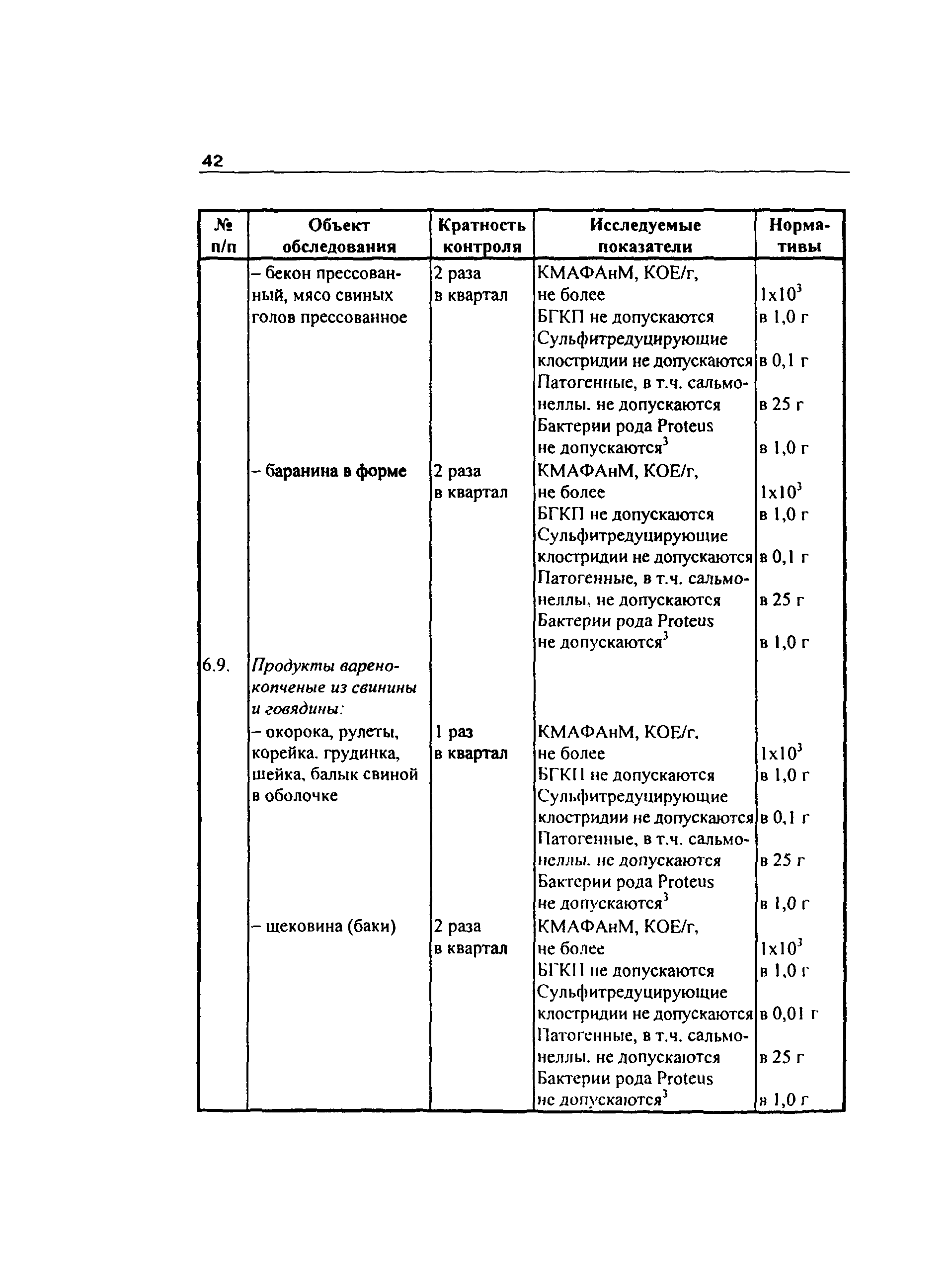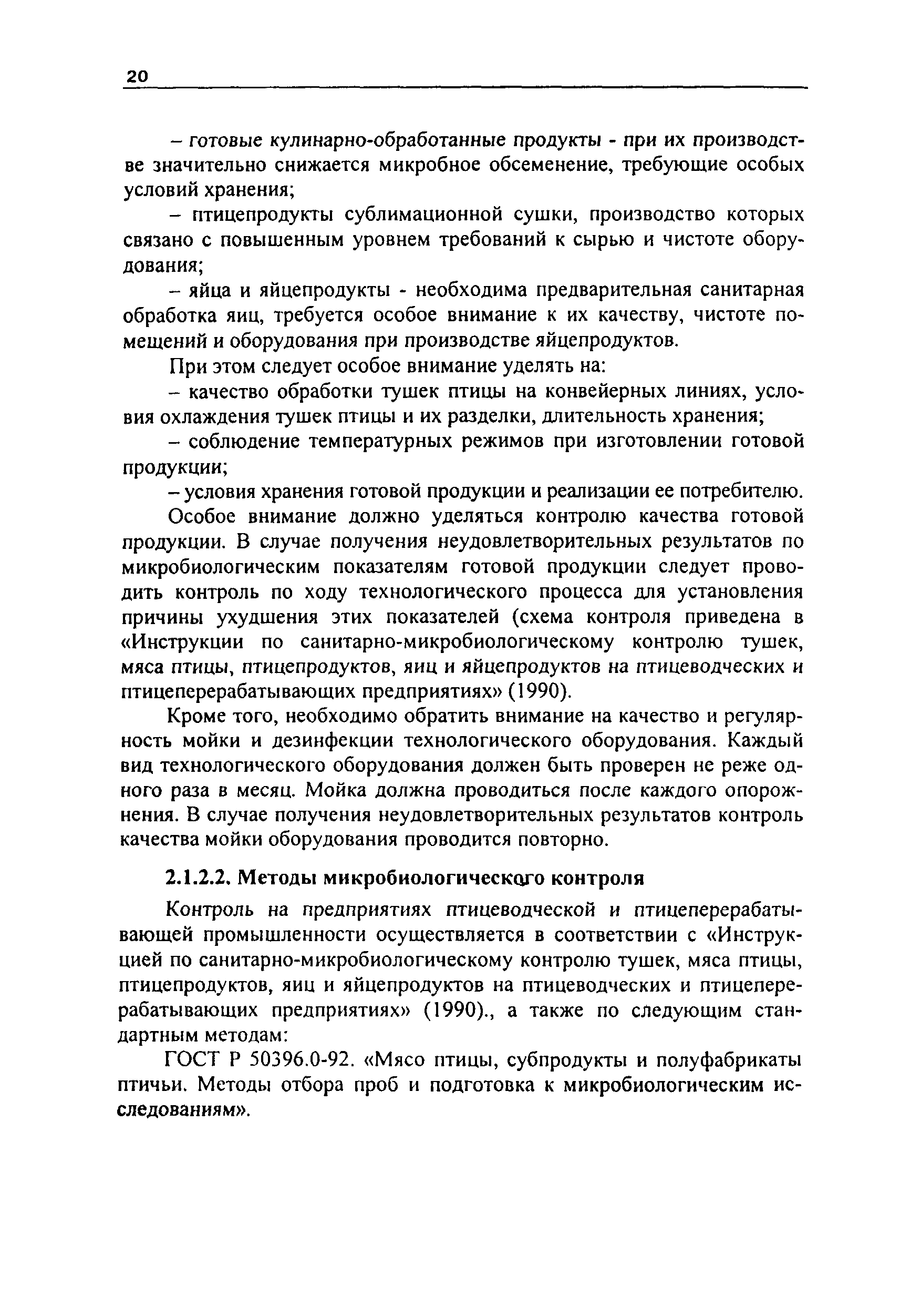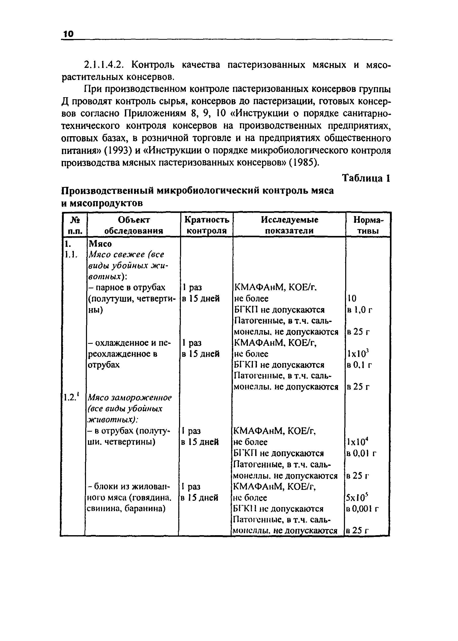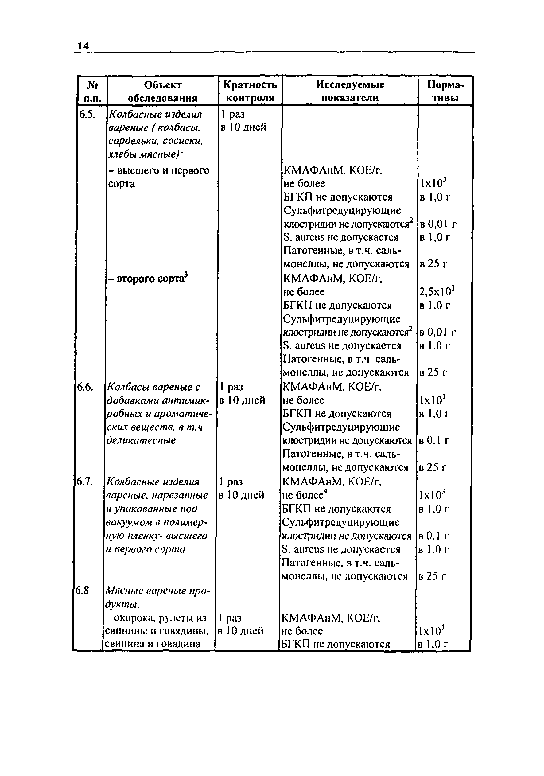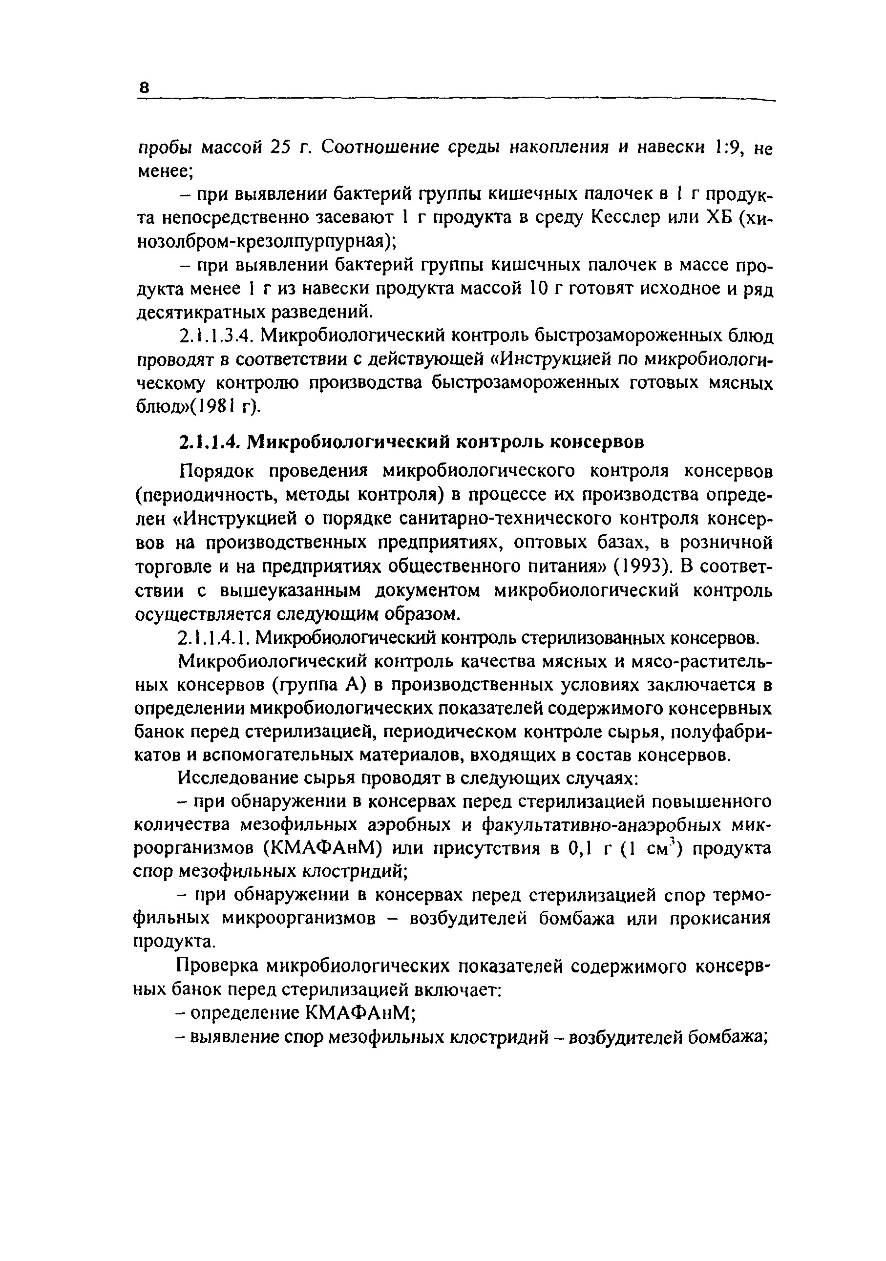 | | Нормативные ссылки: |  СанПиН 2.1.4.559-96 «Питьевая вода. Гигиенические требования к качеству воды централизованных систем питьевого водоснабжения. Контроль качества» ГОСТ 10444.12-88 «Продукты пищевые. Метод определения дрожжей и плесневых грибов»  ГОСТ 10444.15-94 «Продукты пищевые. Методы определения количества мезофильных аэробных и факультативно-анаэробных микроорганизмов» ГОСТ 10444.2-94 «Продукты пищевые. Методы выявления и определения количества Staphylococcus aureus» ГОСТ 10444.8-88 «Продукты пищевые. Метод определения Bacillus cereus»  ГОСТ 10444.9-88 «Продукты пищевые. Метод определения Сlostridium perfringens» ГОСТ 21237-75 «Мясо. Методы бактериологического анализа» ГОСТ 26668-85 «Продукты пищевые и вкусовые. Методы отбора проб для микробиологических анализов»  ГОСТ 26669-85 «Продукты пищевые и вкусовые. Подготовка проб для микробиологических анализов»  ГОСТ 26670-91 «Продукты пищевые. Методы культивирования микроорганизмов»  ГОСТ 26927-86 «Сырье и продукты пищевые. Методы определения ртути»  ГОСТ 26928-86 «Продукты пищевые. Метод определения железа»  ГОСТ 26930-86 «Сырье и продукты пищевые. Метод определения мышьяка»  ГОСТ 26931-86 «Сырье и продукты пищевые. Методы определения меди»  ГОСТ 26932-86 «Сырье и продукты пищевые. Методы определения свинца»  ГОСТ 26933-86 «Сырье и продукты пищевые. Методы определения кадмия»  ГОСТ 26934-86 «Сырье и продукты пищевые. Метод определения цинка» ГОСТ 26935-86 «Продукты пищевые консервированные. Метод определения олова»  ГОСТ 28560-90 «Продукты пищевые. Метод выявления бактерий родов Рrоtеus, Morganella, Providencia»  ГОСТ 28566-90 «Продукты пищевые. Метод выявления и определения количества энтерококков» ГОСТ 2858-82 «Порошок яичный. Технические условия» ГОСТ 29185-91 «Продукты пищевые. Методы выявления и определения количества сульфитредуцирующих клостридий»  ГОСТ 30178-96 «Сырье и продукты пищевые. Атомно-абсорбционный метод определения токсичных элементов» ГОСТ 4288-76 «Изделия кулинарные и полуфабрикаты из рубленого мяса. Правила приемки и методы испытаний» ГОСТ 7702.2.0-95 «Мясо птицы, субпродукты и полуфабрикаты птичьи. Методы отбора проб и подготовка к микробиологическим исследованиям» ГОСТ 7702.2.3-93 «Мясо птицы, субпродукты и полуфабрикаты птичьи. Метод выявления сальмонелл» ГОСТ 7702.2.4-93 «Мясо птицы, субпродукты и полуфабрикаты птичьи. Методы выявления и определения количества Stарhуlососсus аurеus» ГОСТ 7702.2.5-93 «Мясо птицы, субпродукты и полуфабрикаты птичьи. Методы выявления и определения количества листерелл» ГОСТ 7702.2.6-93 «Мясо птицы, субпродукты и полуфабрикаты птичьи. Методы выявления и определения количества сульфитредуцирующих клостридий» ГОСТ 8756.0-70 «Продукты пищевые консервированные. Отбор проб и подготовка их к испытанию» ГОСТ 9792-73 «Колбасные изделия и продукты из свинины, баранины, говядины и мяса других видов убойных животных и птиц. Правила приемки и методы отбора проб» ГОСТ 9958-81 «Колбасные изделия и продукты из мяса. Методы бактериологического анализа» ГОСТ Р 50396.2-92 «Мясо птицы, субпродукты и полуфабрикаты птичьи. Методы выявления и определения количества бактерий группы кишечных палочек (колиформных бактерий родов Еsсhеriсhiа, Сitrоbасtеr, Еntеrоbасtеr, Кlеbsiеllа, Sеrrаtiа)»  ГН 1.1.546-96 «Гигиенические нормативы содержания пестицидов в объектах окружающей среды (перечень)»  МУ 5178-90 «Методические указания по обнаружению и определению содержания общей ртути в пищевых продуктах методом 