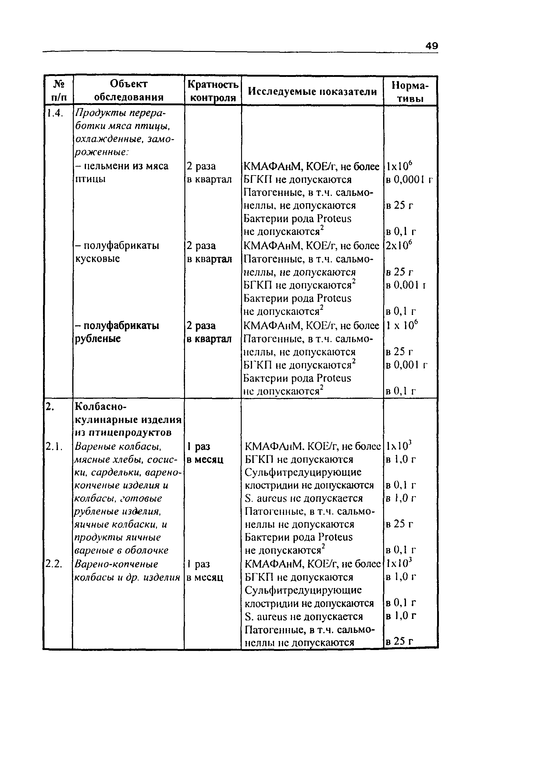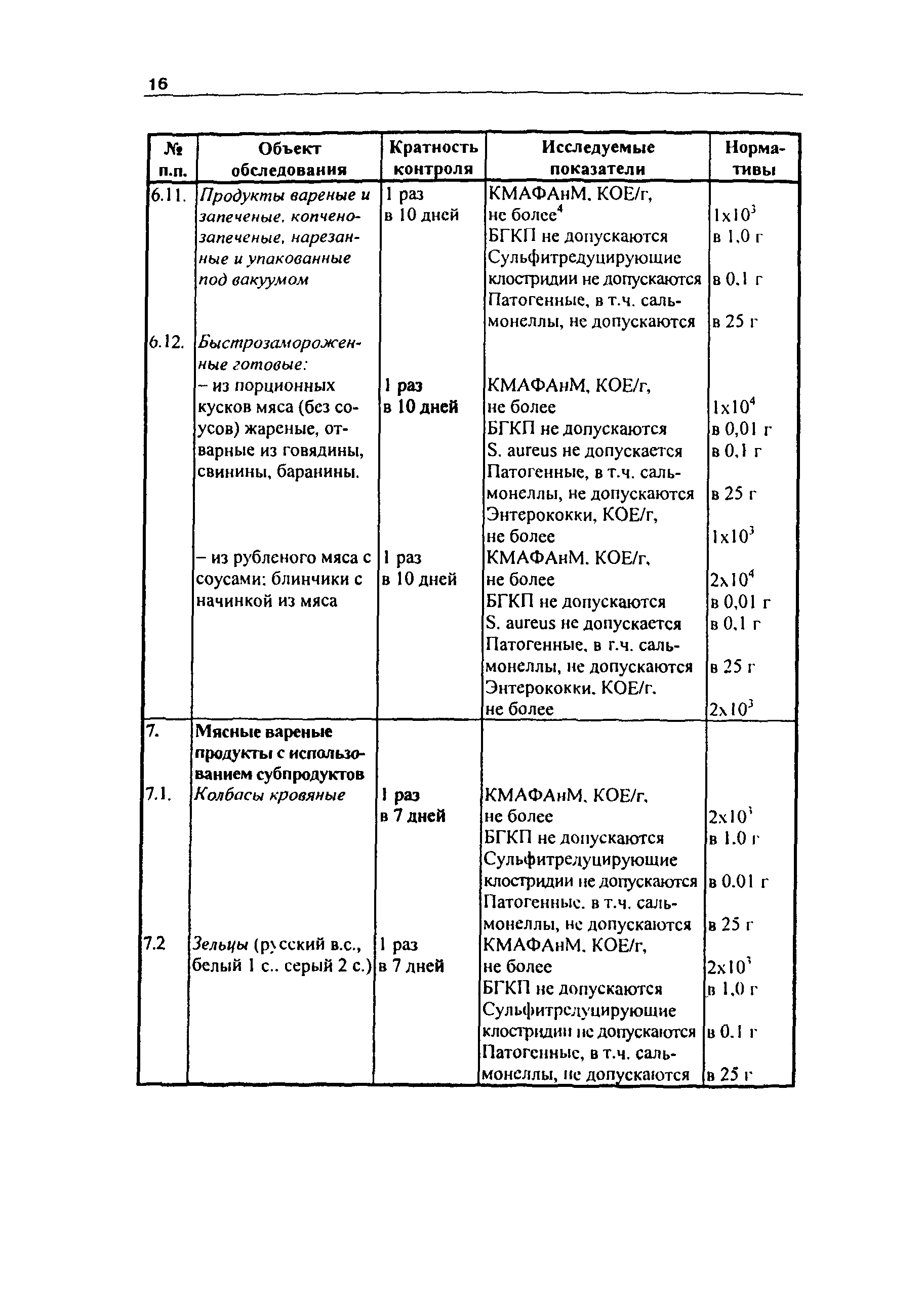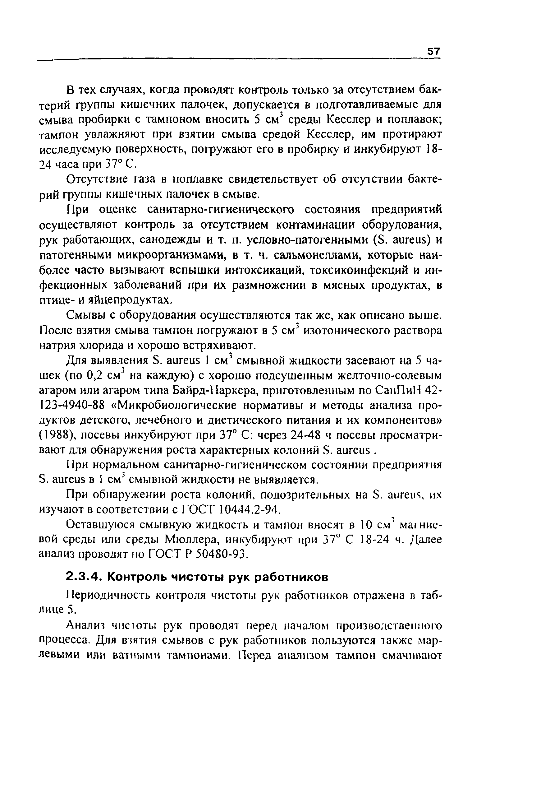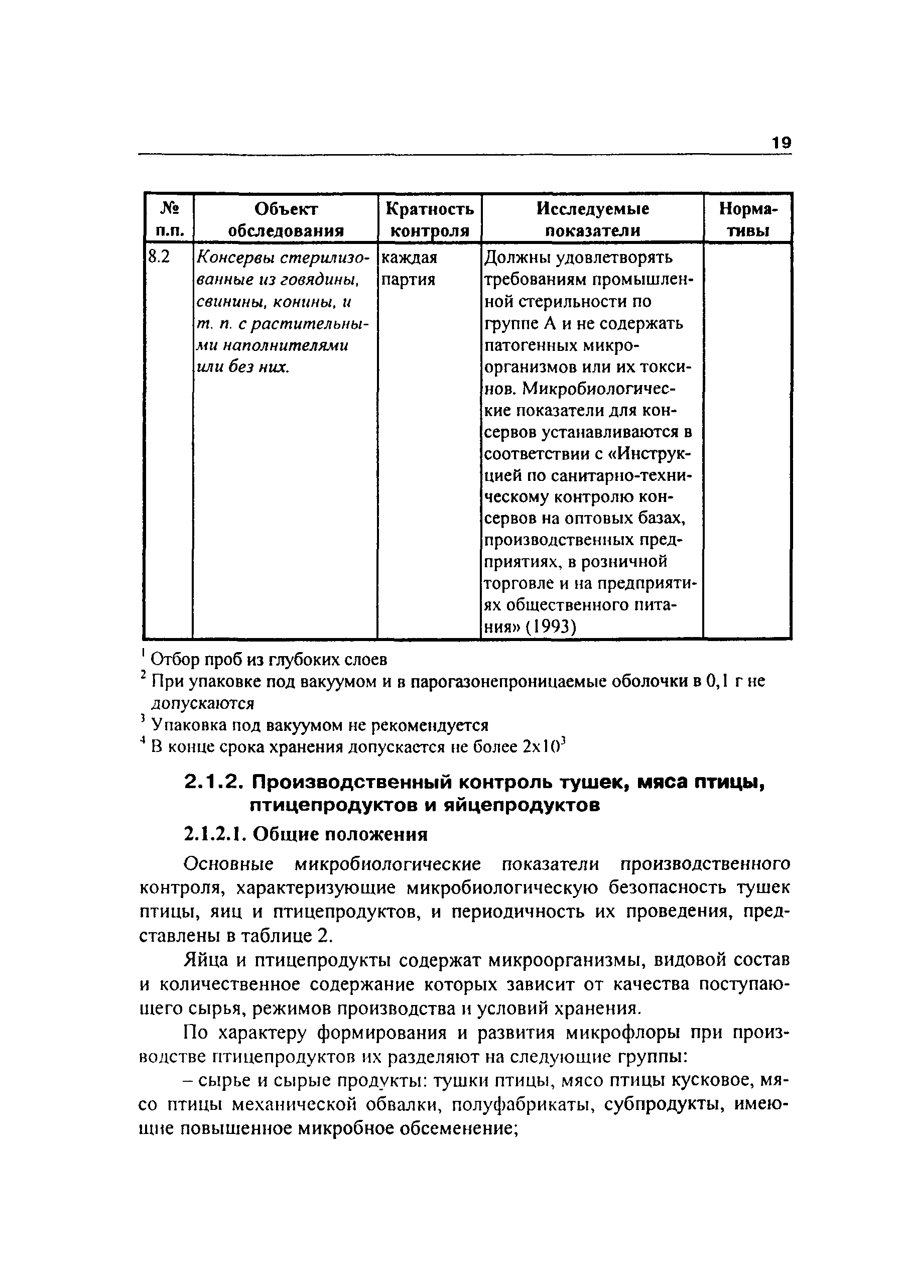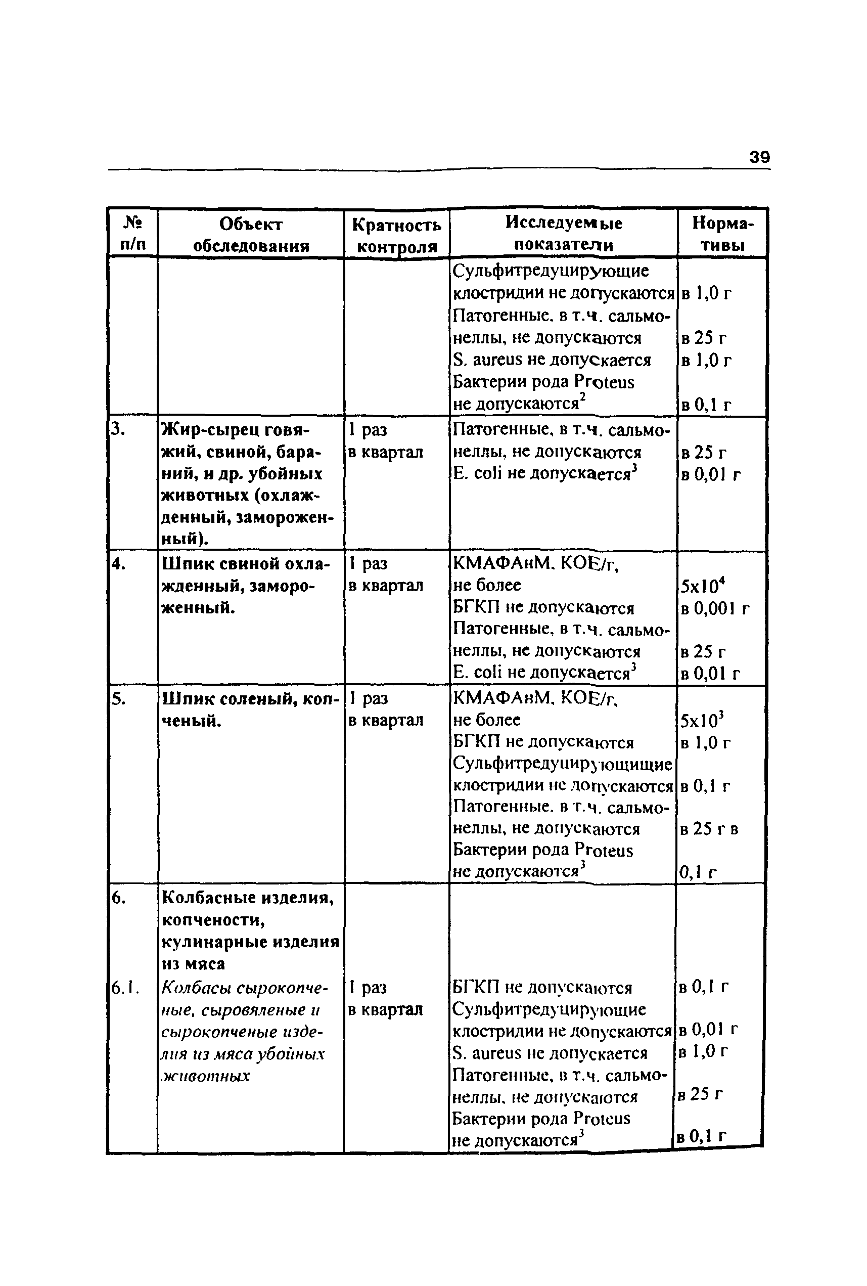 | | Нормативные ссылки: |  СанПиН 2.1.4.559-96 «Питьевая вода. Гигиенические требования к качеству воды централизованных систем питьевого водоснабжения. Контроль качества» ГОСТ 10444.12-88 «Продукты пищевые. Метод определения дрожжей и плесневых грибов»  ГОСТ 10444.15-94 «Продукты пищевые. Методы определения количества мезофильных аэробных и факультативно-анаэробных микроорганизмов» ГОСТ 10444.2-94 «Продукты пищевые. Методы выявления и определения количества Staphylococcus aureus» ГОСТ 10444.8-88 «Продукты пищевые. Метод определения Bacillus cereus»  ГОСТ 10444.9-88 «Продукты пищевые. Метод определения Сlostridium perfringens» ГОСТ 21237-75 «Мясо. Методы бактериологического анализа» ГОСТ 26668-85 «Продукты пищевые и вкусовые. Методы отбора проб для микробиологических анализов»  ГОСТ 26669-85 «Продукты пищевые и вкусовые. Подготовка проб для микробиологических анализов»  ГОСТ 26670-91 «Продукты пищевые. Методы культивирования микроорганизмов»  ГОСТ 26927-86 «Сырье и продукты пищевые. Методы определения ртути»  ГОСТ 26928-86 «Продукты пищевые. Метод определения железа»  ГОСТ 26930-86 «Сырье и продукты пищевые. Метод определения мышьяка»  ГОСТ 26931-86 «Сырье и продукты пищевые. Методы определения меди»  ГОСТ 26932-86 «Сырье и продукты пищевые. Методы определения свинца»  ГОСТ 26933-86 «Сырье и продукты пищевые. Методы определения кадмия»  ГОСТ 26934-86 «Сырье и продукты пищевые. Метод определения цинка» ГОСТ 26935-86 «Продукты пищевые консервированные. Метод определения олова»  ГОСТ 28560-90 «Продукты пищевые. Метод выявления бактерий родов Рrоtеus, Morganella, Providencia»  ГОСТ 28566-90 «Продукты пищевые. Метод выявления и определения количества энтерококков» ГОСТ 2858-82 «Порошок яичный. Технические условия» ГОСТ 29185-91 «Продукты пищевые. Методы выявления и определения количества сульфитредуцирующих клостридий»  ГОСТ 30178-96 «Сырье и продукты пищевые. Атомно-абсорбционный метод определения токсичных элементов» ГОСТ 4288-76 «Изделия кулинарные и полуфабрикаты из рубленого мяса. Правила приемки и методы испытаний» ГОСТ 7702.2.0-95 «Мясо птицы, субпродукты и полуфабрикаты птичьи. Методы отбора проб и подготовка к микробиологическим исследованиям» ГОСТ 7702.2.3-93 «Мясо птицы, субпродукты и полуфабрикаты птичьи. Метод выявления сальмонелл» ГОСТ 7702.2.4-93 «Мясо птицы, субпродукты и полуфабрикаты птичьи. Методы выявления и определения количества Stарhуlососсus аurеus» ГОСТ 7702.2.5-93 «Мясо птицы, субпродукты и полуфабрикаты птичьи. Методы выявления и определения количества листерелл» ГОСТ 7702.2.6-93 «Мясо птицы, субпродукты и полуфабрикаты птичьи. Методы выявления и определения количества сульфитредуцирующих клостридий» ГОСТ 8756.0-70 «Продукты пищевые консервированные. Отбор проб и подготовка их к испытанию» ГОСТ 9792-73 «Колбасные изделия и продукты из свинины, баранины, говядины и мяса других видов убойных животных и птиц. Правила приемки и методы отбора проб» ГОСТ 9958-81 «Колбасные изделия и продукты из мяса. Методы бактериологического анализа» ГОСТ Р 50396.2-92 «Мясо птицы, субпродукты и полуфабрикаты птичьи. Методы выявления и определения количества бактерий группы кишечных палочек (колиформных бактерий родов Еsсhеriсhiа, Сitrоbасtеr, Еntеrоbасtеr, Кlеbsiеllа, Sеrrаtiа)»  ГН 1.1.546-96 «Гигиенические нормативы содержания пестицидов в объектах окружающей среды (перечень)»  МУ 5178-90 «Методические указания по обнаружению и определению содержания общей ртути в пищевых продуктах методом 