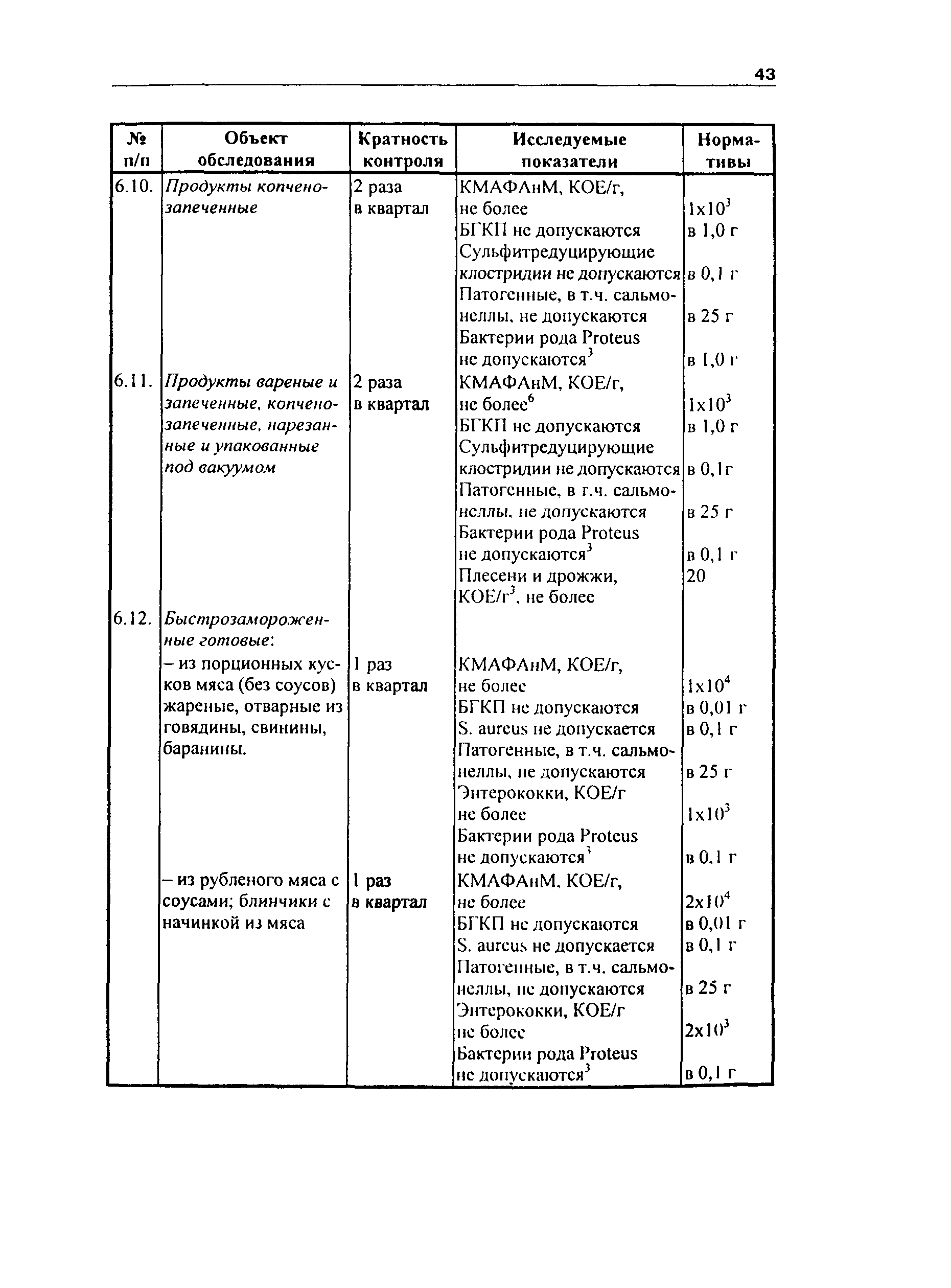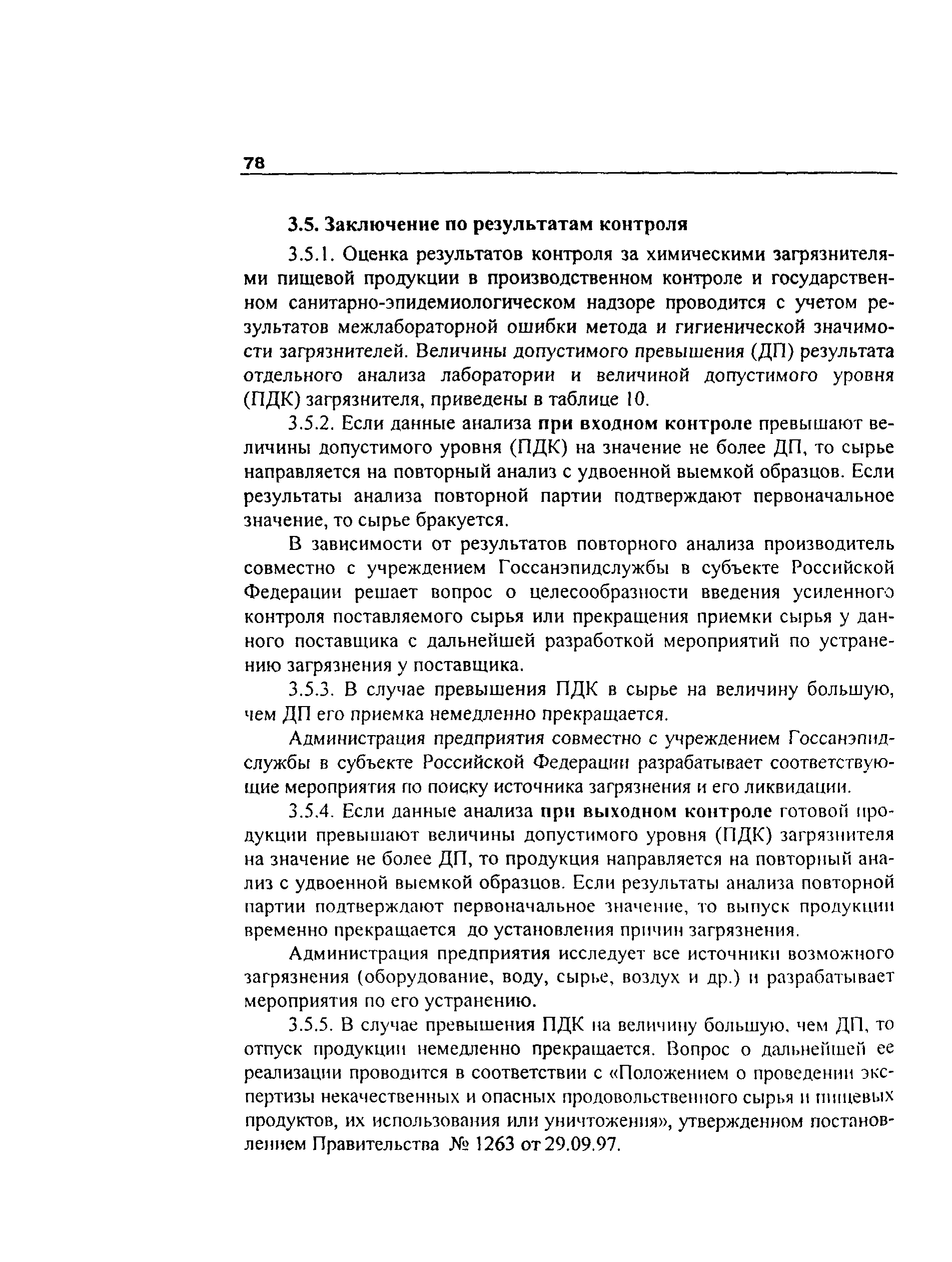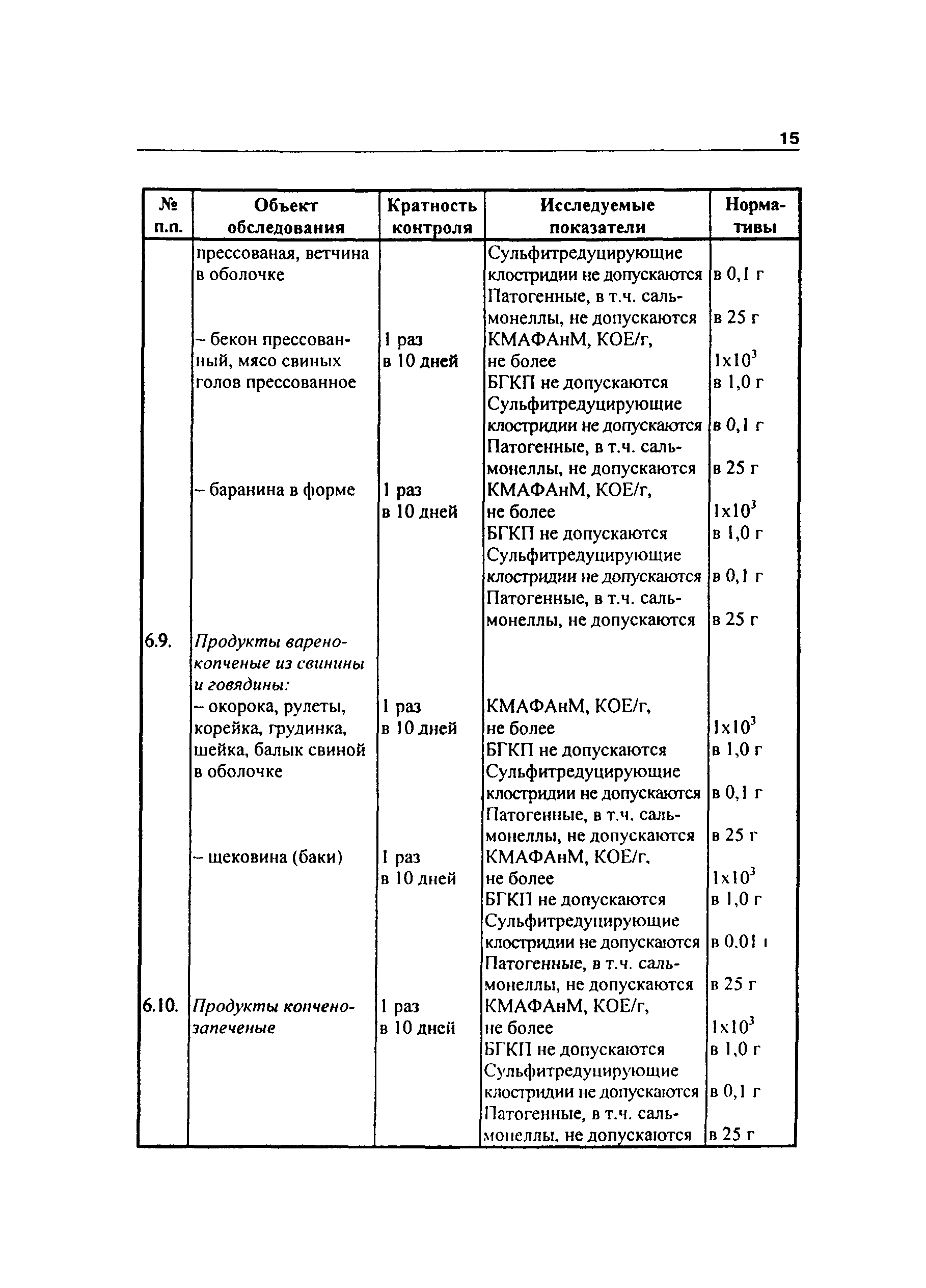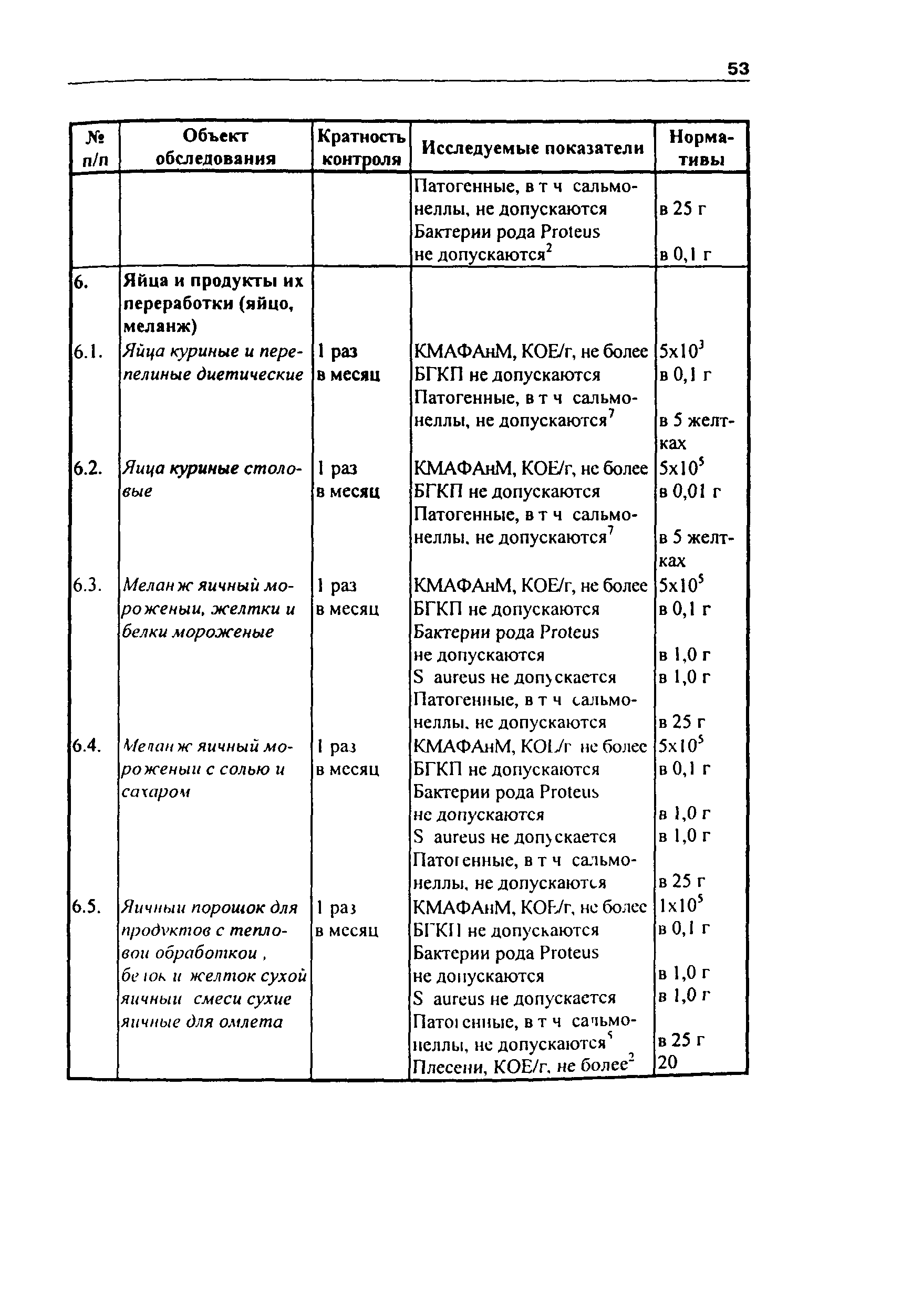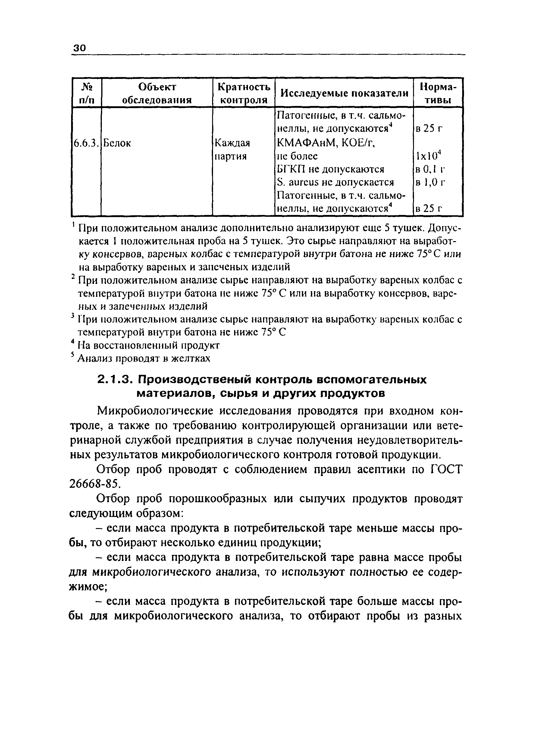 | | Нормативные ссылки: |  СанПиН 2.1.4.559-96 «Питьевая вода. Гигиенические требования к качеству воды централизованных систем питьевого водоснабжения. Контроль качества» ГОСТ 10444.12-88 «Продукты пищевые. Метод определения дрожжей и плесневых грибов»  ГОСТ 10444.15-94 «Продукты пищевые. Методы определения количества мезофильных аэробных и факультативно-анаэробных микроорганизмов» ГОСТ 10444.2-94 «Продукты пищевые. Методы выявления и определения количества Staphylococcus aureus» ГОСТ 10444.8-88 «Продукты пищевые. Метод определения Bacillus cereus»  ГОСТ 10444.9-88 «Продукты пищевые. Метод определения Сlostridium perfringens» ГОСТ 21237-75 «Мясо. Методы бактериологического анализа» ГОСТ 26668-85 «Продукты пищевые и вкусовые. Методы отбора проб для микробиологических анализов»  ГОСТ 26669-85 «Продукты пищевые и вкусовые. Подготовка проб для микробиологических анализов»  ГОСТ 26670-91 «Продукты пищевые. Методы культивирования микроорганизмов»  ГОСТ 26927-86 «Сырье и продукты пищевые. Методы определения ртути»  ГОСТ 26928-86 «Продукты пищевые. Метод определения железа»  ГОСТ 26930-86 «Сырье и продукты пищевые. Метод определения мышьяка»  ГОСТ 26931-86 «Сырье и продукты пищевые. Методы определения меди»  ГОСТ 26932-86 «Сырье и продукты пищевые. Методы определения свинца»  ГОСТ 26933-86 «Сырье и продукты пищевые. Методы определения кадмия»  ГОСТ 26934-86 «Сырье и продукты пищевые. Метод определения цинка» ГОСТ 26935-86 «Продукты пищевые консервированные. Метод определения олова»  ГОСТ 28560-90 «Продукты пищевые. Метод выявления бактерий родов Рrоtеus, Morganella, Providencia»  ГОСТ 28566-90 «Продукты пищевые. Метод выявления и определения количества энтерококков» ГОСТ 2858-82 «Порошок яичный. Технические условия» ГОСТ 29185-91 «Продукты пищевые. Методы выявления и определения количества сульфитредуцирующих клостридий»  ГОСТ 30178-96 «Сырье и продукты пищевые. Атомно-абсорбционный метод определения токсичных элементов» ГОСТ 4288-76 «Изделия кулинарные и полуфабрикаты из рубленого мяса. Правила приемки и методы испытаний» ГОСТ 7702.2.0-95 «Мясо птицы, субпродукты и полуфабрикаты птичьи. Методы отбора проб и подготовка к микробиологическим исследованиям» ГОСТ 7702.2.3-93 «Мясо птицы, субпродукты и полуфабрикаты птичьи. Метод выявления сальмонелл» ГОСТ 7702.2.4-93 «Мясо птицы, субпродукты и полуфабрикаты птичьи. Методы выявления и определения количества Stарhуlососсus аurеus» ГОСТ 7702.2.5-93 «Мясо птицы, субпродукты и полуфабрикаты птичьи. Методы выявления и определения количества листерелл» ГОСТ 7702.2.6-93 «Мясо птицы, субпродукты и полуфабрикаты птичьи. Методы выявления и определения количества сульфитредуцирующих клостридий» ГОСТ 8756.0-70 «Продукты пищевые консервированные. Отбор проб и подготовка их к испытанию» ГОСТ 9792-73 «Колбасные изделия и продукты из свинины, баранины, говядины и мяса других видов убойных животных и птиц. Правила приемки и методы отбора проб» ГОСТ 9958-81 «Колбасные изделия и продукты из мяса. Методы бактериологического анализа» ГОСТ Р 50396.2-92 «Мясо птицы, субпродукты и полуфабрикаты птичьи. Методы выявления и определения количества бактерий группы кишечных палочек (колиформных бактерий родов Еsсhеriсhiа, Сitrоbасtеr, Еntеrоbасtеr, Кlеbsiеllа, Sеrrаtiа)»  ГН 1.1.546-96 «Гигиенические нормативы содержания пестицидов в объектах окружающей среды (перечень)»  МУ 5178-90 «Методические указания по обнаружению и определению содержания общей ртути в пищевых продуктах методом 