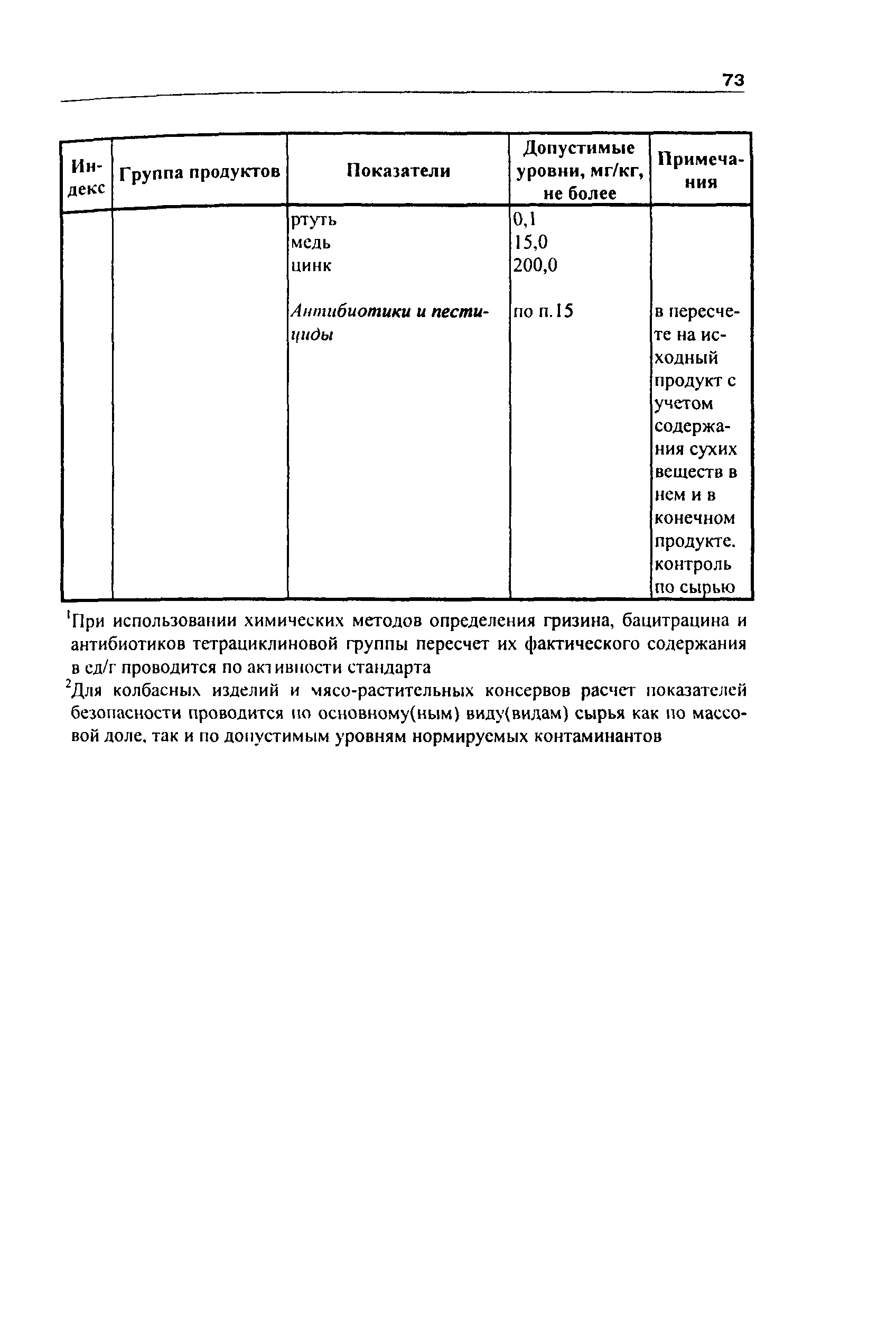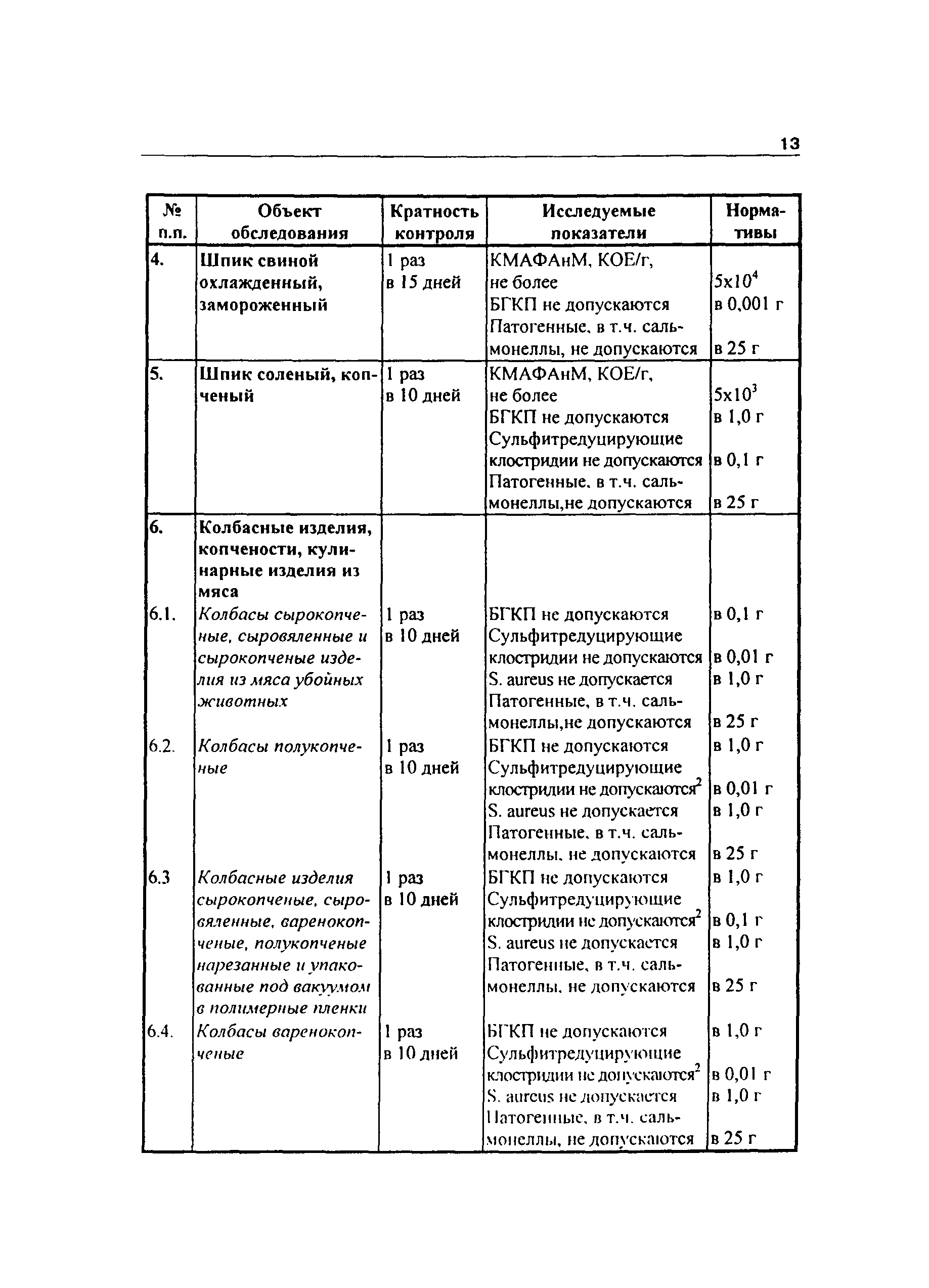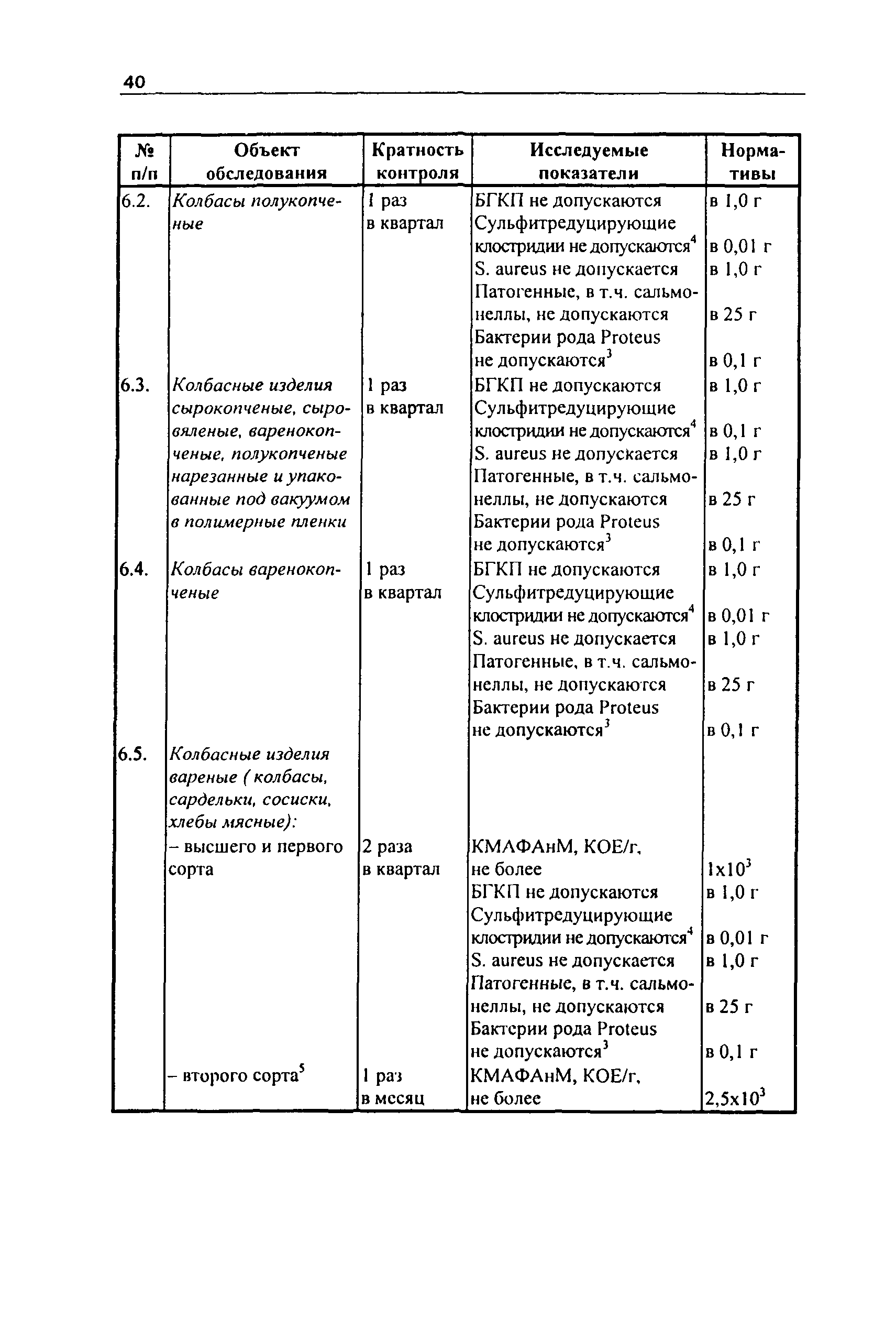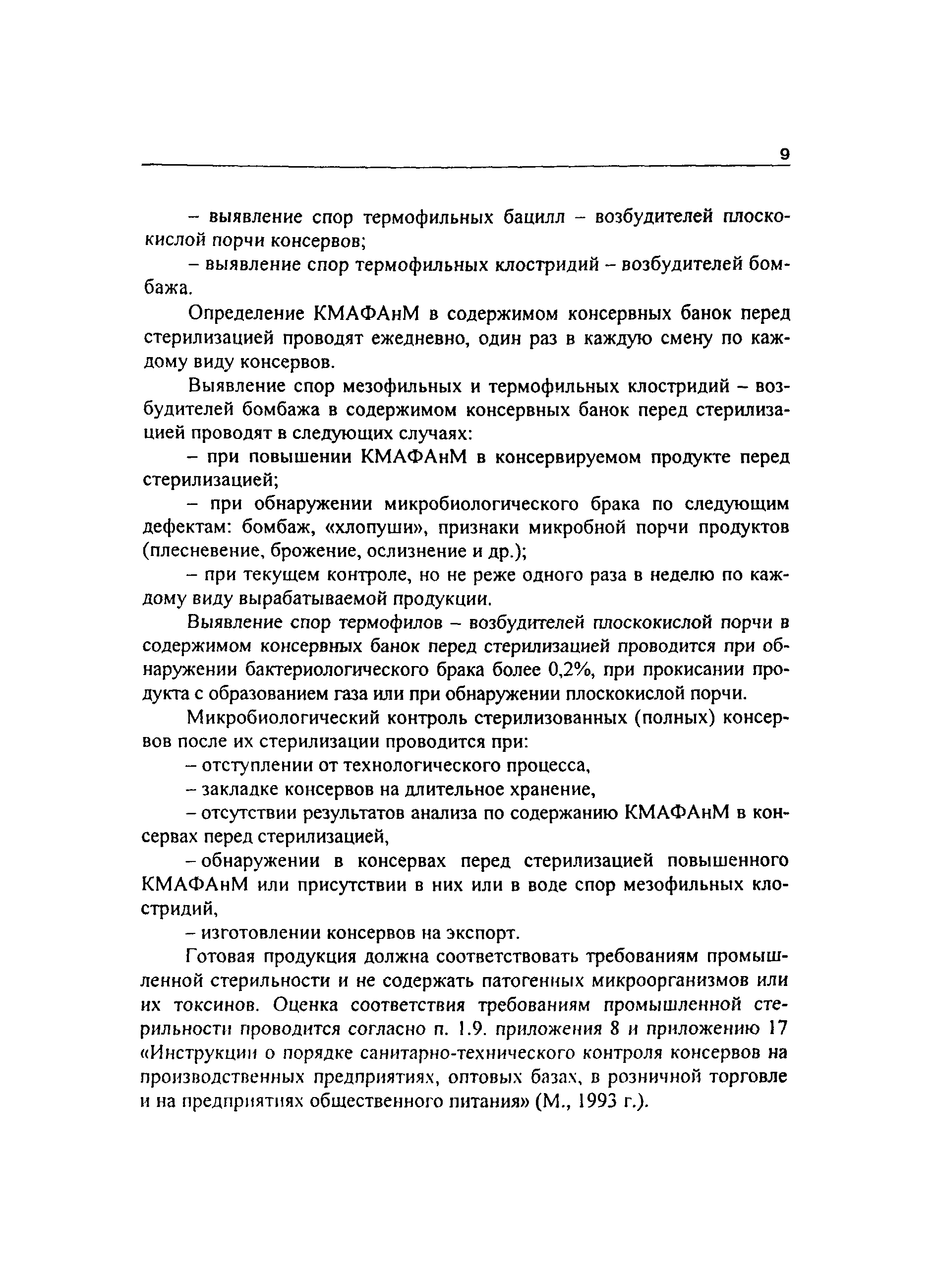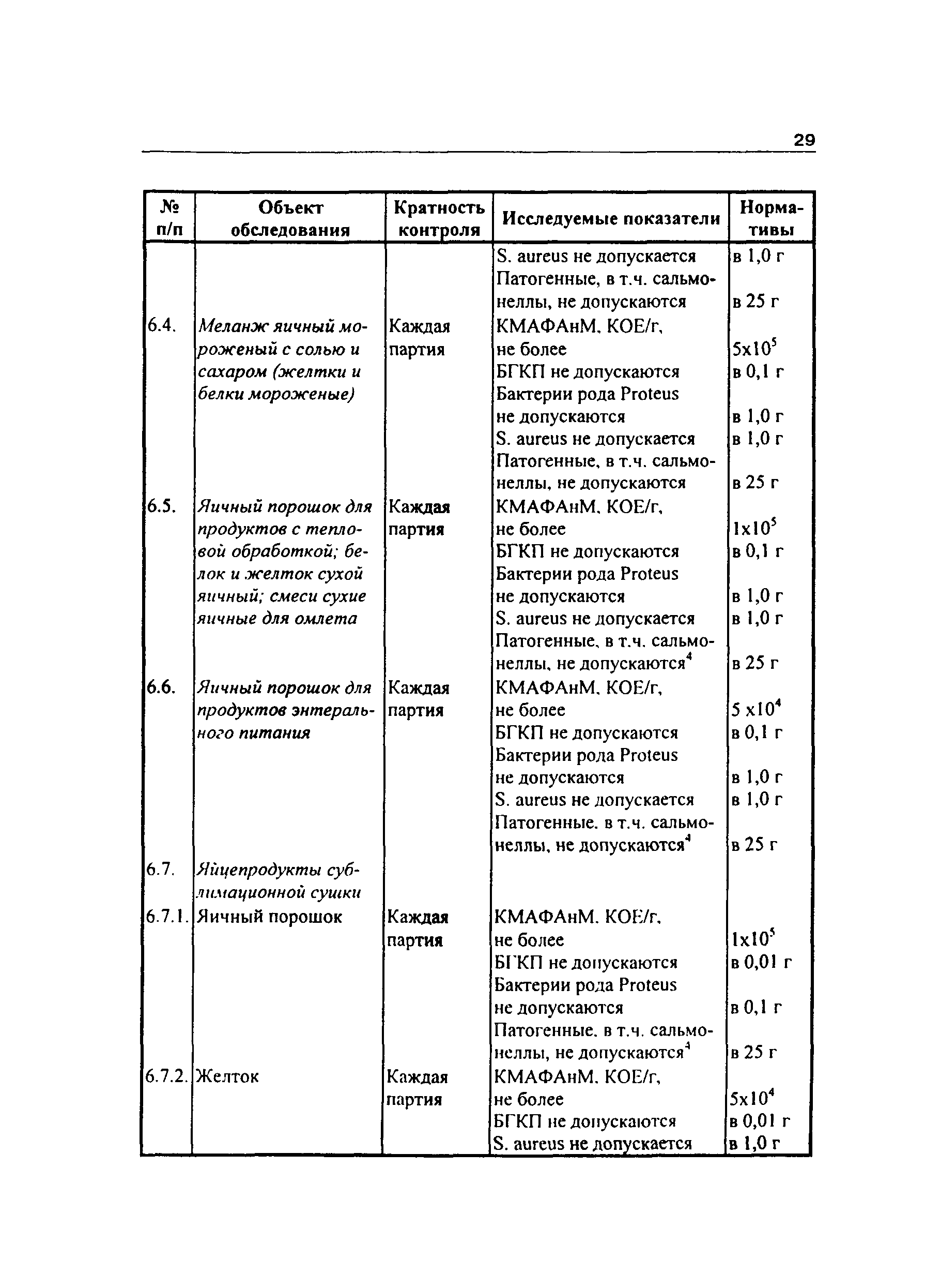 | | Нормативные ссылки: |  СанПиН 2.1.4.559-96 «Питьевая вода. Гигиенические требования к качеству воды централизованных систем питьевого водоснабжения. Контроль качества» ГОСТ 10444.12-88 «Продукты пищевые. Метод определения дрожжей и плесневых грибов»  ГОСТ 10444.15-94 «Продукты пищевые. Методы определения количества мезофильных аэробных и факультативно-анаэробных микроорганизмов» ГОСТ 10444.2-94 «Продукты пищевые. Методы выявления и определения количества Staphylococcus aureus» ГОСТ 10444.8-88 «Продукты пищевые. Метод определения Bacillus cereus»  ГОСТ 10444.9-88 «Продукты пищевые. Метод определения Сlostridium perfringens» ГОСТ 21237-75 «Мясо. Методы бактериологического анализа» ГОСТ 26668-85 «Продукты пищевые и вкусовые. Методы отбора проб для микробиологических анализов»  ГОСТ 26669-85 «Продукты пищевые и вкусовые. Подготовка проб для микробиологических анализов»  ГОСТ 26670-91 «Продукты пищевые. Методы культивирования микроорганизмов»  ГОСТ 26927-86 «Сырье и продукты пищевые. Методы определения ртути»  ГОСТ 26928-86 «Продукты пищевые. Метод определения железа»  ГОСТ 26930-86 «Сырье и продукты пищевые. Метод определения мышьяка»  ГОСТ 26931-86 «Сырье и продукты пищевые. Методы определения меди»  ГОСТ 26932-86 «Сырье и продукты пищевые. Методы определения свинца»  ГОСТ 26933-86 «Сырье и продукты пищевые. Методы определения кадмия»  ГОСТ 26934-86 «Сырье и продукты пищевые. Метод определения цинка» ГОСТ 26935-86 «Продукты пищевые консервированные. Метод определения олова»  ГОСТ 28560-90 «Продукты пищевые. Метод выявления бактерий родов Рrоtеus, Morganella, Providencia»  ГОСТ 28566-90 «Продукты пищевые. Метод выявления и определения количества энтерококков» ГОСТ 2858-82 «Порошок яичный. Технические условия» ГОСТ 29185-91 «Продукты пищевые. Методы выявления и определения количества сульфитредуцирующих клостридий»  ГОСТ 30178-96 «Сырье и продукты пищевые. Атомно-абсорбционный метод определения токсичных элементов» ГОСТ 4288-76 «Изделия кулинарные и полуфабрикаты из рубленого мяса. Правила приемки и методы испытаний» ГОСТ 7702.2.0-95 «Мясо птицы, субпродукты и полуфабрикаты птичьи. Методы отбора проб и подготовка к микробиологическим исследованиям» ГОСТ 7702.2.3-93 «Мясо птицы, субпродукты и полуфабрикаты птичьи. Метод выявления сальмонелл» ГОСТ 7702.2.4-93 «Мясо птицы, субпродукты и полуфабрикаты птичьи. Методы выявления и определения количества Stарhуlососсus аurеus» ГОСТ 7702.2.5-93 «Мясо птицы, субпродукты и полуфабрикаты птичьи. Методы выявления и определения количества листерелл» ГОСТ 7702.2.6-93 «Мясо птицы, субпродукты и полуфабрикаты птичьи. Методы выявления и определения количества сульфитредуцирующих клостридий» ГОСТ 8756.0-70 «Продукты пищевые консервированные. Отбор проб и подготовка их к испытанию» ГОСТ 9792-73 «Колбасные изделия и продукты из свинины, баранины, говядины и мяса других видов убойных животных и птиц. Правила приемки и методы отбора проб» ГОСТ 9958-81 «Колбасные изделия и продукты из мяса. Методы бактериологического анализа» ГОСТ Р 50396.2-92 «Мясо птицы, субпродукты и полуфабрикаты птичьи. Методы выявления и определения количества бактерий группы кишечных палочек (колиформных бактерий родов Еsсhеriсhiа, Сitrоbасtеr, Еntеrоbасtеr, Кlеbsiеllа, Sеrrаtiа)»  ГН 1.1.546-96 «Гигиенические нормативы содержания пестицидов в объектах окружающей среды (перечень)»  МУ 5178-90 «Методические указания по обнаружению и определению содержания общей ртути в пищевых продуктах методом 