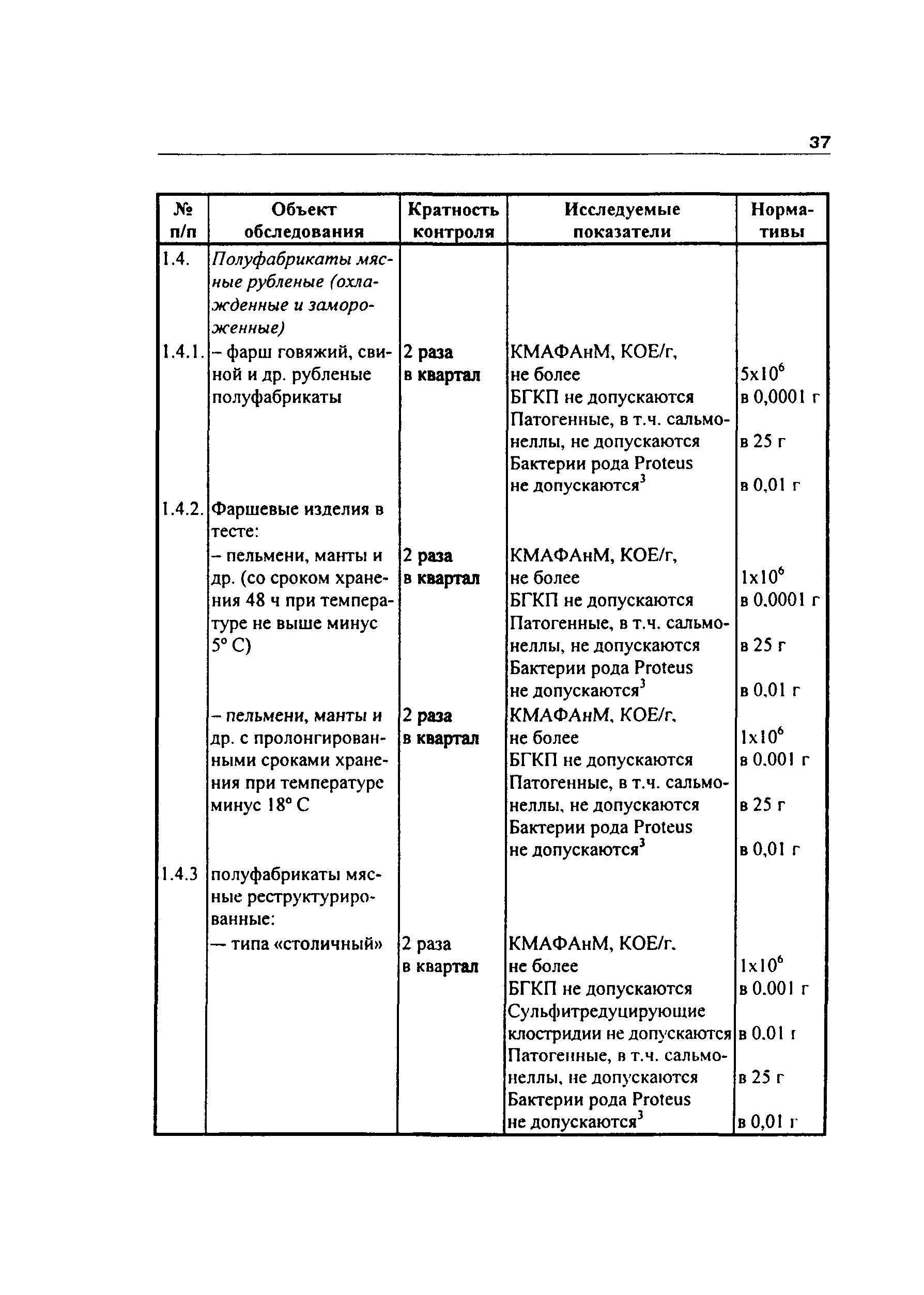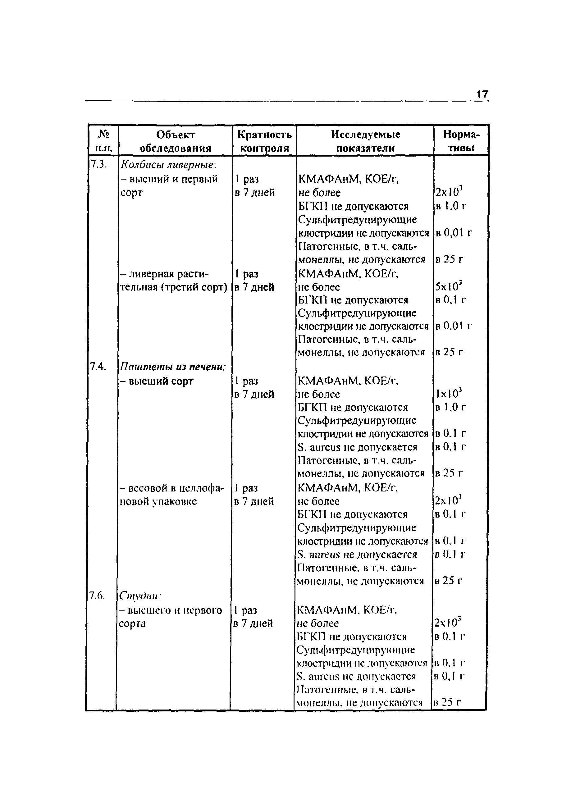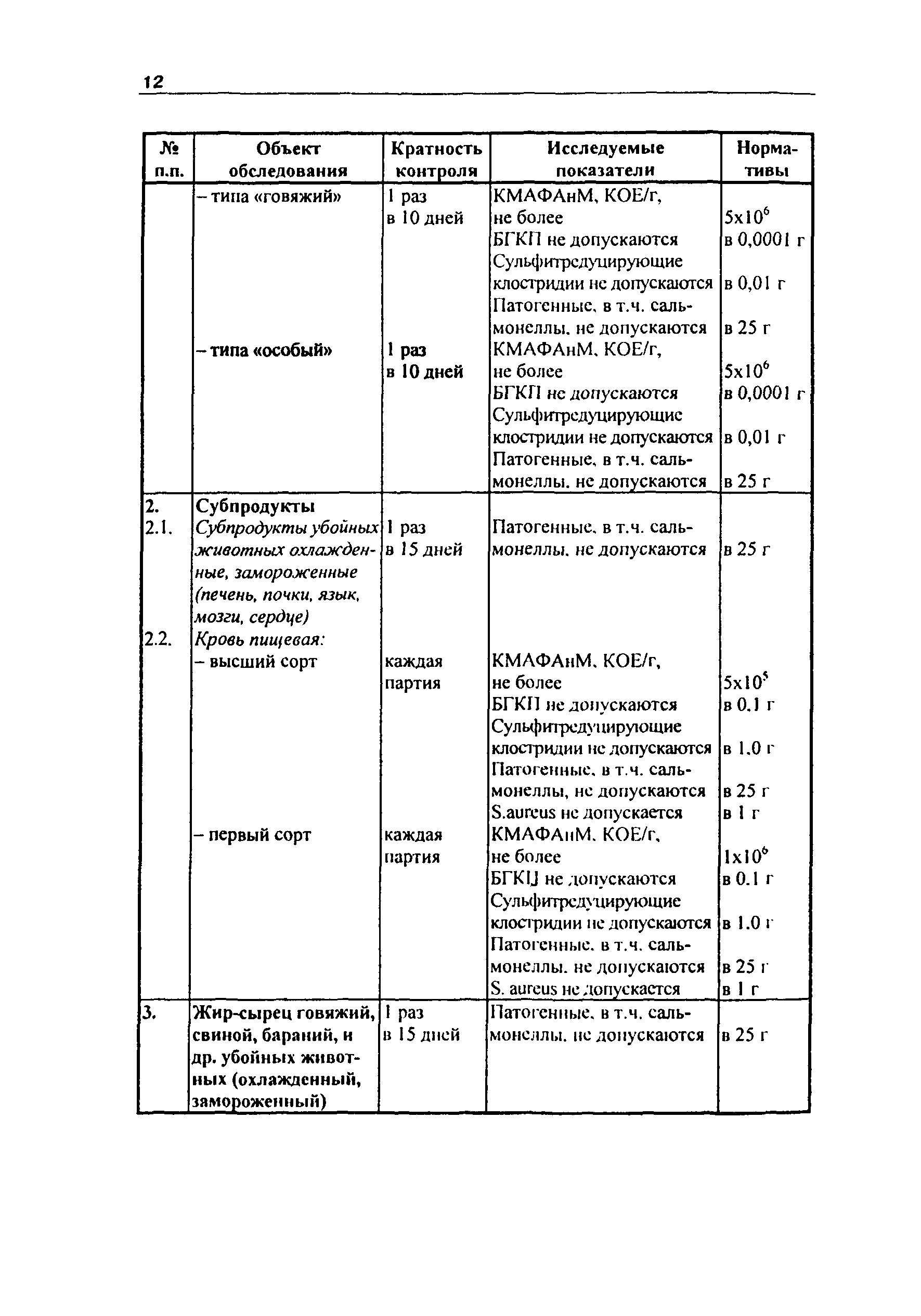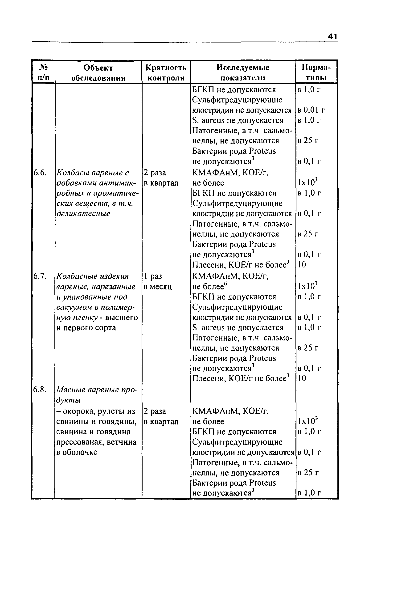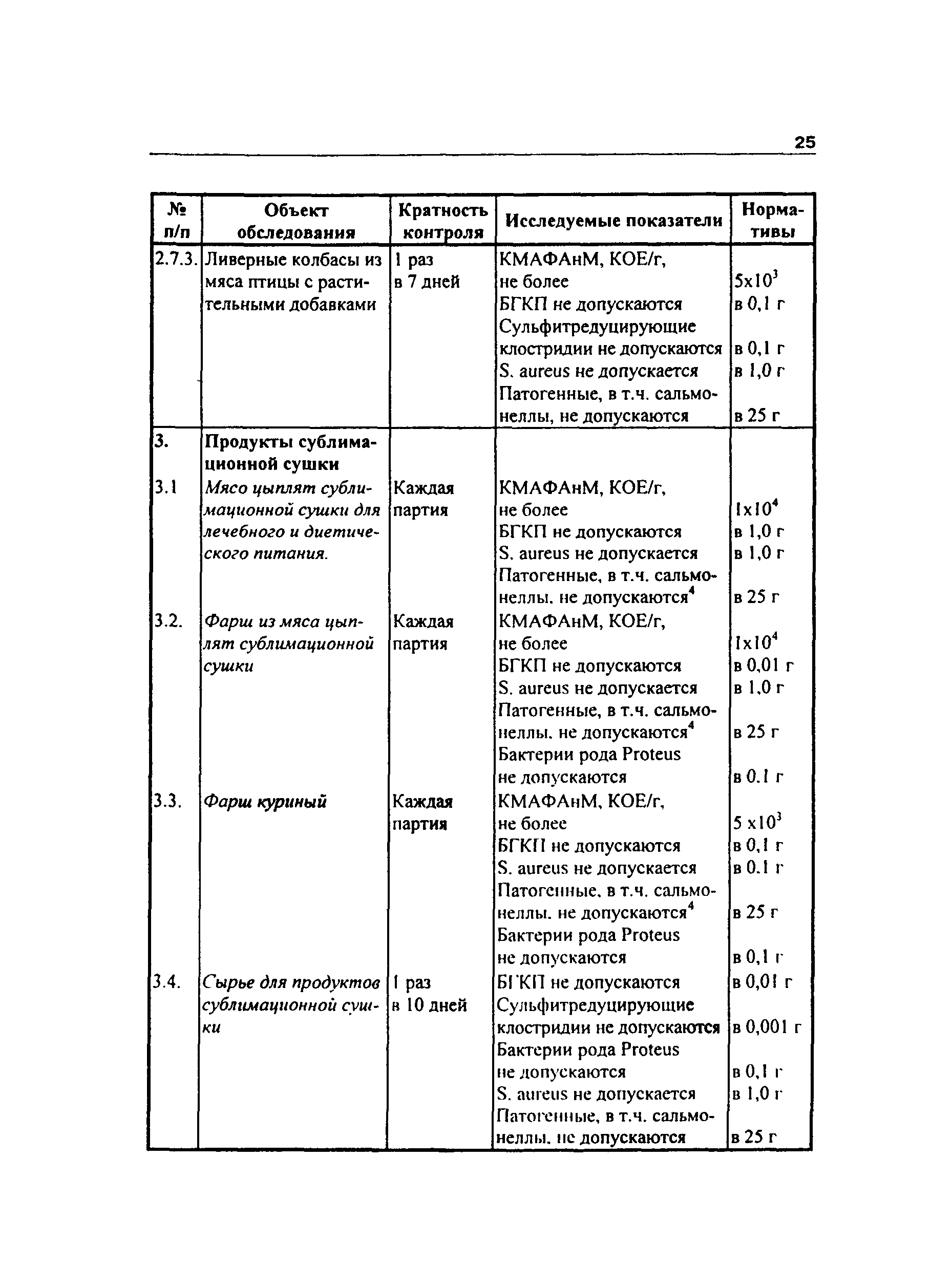 | | Нормативные ссылки: |  СанПиН 2.1.4.559-96 «Питьевая вода. Гигиенические требования к качеству воды централизованных систем питьевого водоснабжения. Контроль качества» ГОСТ 10444.12-88 «Продукты пищевые. Метод определения дрожжей и плесневых грибов»  ГОСТ 10444.15-94 «Продукты пищевые. Методы определения количества мезофильных аэробных и факультативно-анаэробных микроорганизмов» ГОСТ 10444.2-94 «Продукты пищевые. Методы выявления и определения количества Staphylococcus aureus» ГОСТ 10444.8-88 «Продукты пищевые. Метод определения Bacillus cereus»  ГОСТ 10444.9-88 «Продукты пищевые. Метод определения Сlostridium perfringens» ГОСТ 21237-75 «Мясо. Методы бактериологического анализа» ГОСТ 26668-85 «Продукты пищевые и вкусовые. Методы отбора проб для микробиологических анализов»  ГОСТ 26669-85 «Продукты пищевые и вкусовые. Подготовка проб для микробиологических анализов»  ГОСТ 26670-91 «Продукты пищевые. Методы культивирования микроорганизмов»  ГОСТ 26927-86 «Сырье и продукты пищевые. Методы определения ртути»  ГОСТ 26928-86 «Продукты пищевые. Метод определения железа»  ГОСТ 26930-86 «Сырье и продукты пищевые. Метод определения мышьяка»  ГОСТ 26931-86 «Сырье и продукты пищевые. Методы определения меди»  ГОСТ 26932-86 «Сырье и продукты пищевые. Методы определения свинца»  ГОСТ 26933-86 «Сырье и продукты пищевые. Методы определения кадмия»  ГОСТ 26934-86 «Сырье и продукты пищевые. Метод определения цинка» ГОСТ 26935-86 «Продукты пищевые консервированные. Метод определения олова»  ГОСТ 28560-90 «Продукты пищевые. Метод выявления бактерий родов Рrоtеus, Morganella, Providencia»  ГОСТ 28566-90 «Продукты пищевые. Метод выявления и определения количества энтерококков» ГОСТ 2858-82 «Порошок яичный. Технические условия» ГОСТ 29185-91 «Продукты пищевые. Методы выявления и определения количества сульфитредуцирующих клостридий»  ГОСТ 30178-96 «Сырье и продукты пищевые. Атомно-абсорбционный метод определения токсичных элементов» ГОСТ 4288-76 «Изделия кулинарные и полуфабрикаты из рубленого мяса. Правила приемки и методы испытаний» ГОСТ 7702.2.0-95 «Мясо птицы, субпродукты и полуфабрикаты птичьи. Методы отбора проб и подготовка к микробиологическим исследованиям» ГОСТ 7702.2.3-93 «Мясо птицы, субпродукты и полуфабрикаты птичьи. Метод выявления сальмонелл» ГОСТ 7702.2.4-93 «Мясо птицы, субпродукты и полуфабрикаты птичьи. Методы выявления и определения количества Stарhуlососсus аurеus» ГОСТ 7702.2.5-93 «Мясо птицы, субпродукты и полуфабрикаты птичьи. Методы выявления и определения количества листерелл» ГОСТ 7702.2.6-93 «Мясо птицы, субпродукты и полуфабрикаты птичьи. Методы выявления и определения количества сульфитредуцирующих клостридий» ГОСТ 8756.0-70 «Продукты пищевые консервированные. Отбор проб и подготовка их к испытанию» ГОСТ 9792-73 «Колбасные изделия и продукты из свинины, баранины, говядины и мяса других видов убойных животных и птиц. Правила приемки и методы отбора проб» ГОСТ 9958-81 «Колбасные изделия и продукты из мяса. Методы бактериологического анализа» ГОСТ Р 50396.2-92 «Мясо птицы, субпродукты и полуфабрикаты птичьи. Методы выявления и определения количества бактерий группы кишечных палочек (колиформных бактерий родов Еsсhеriсhiа, Сitrоbасtеr, Еntеrоbасtеr, Кlеbsiеllа, Sеrrаtiа)»  ГН 1.1.546-96 «Гигиенические нормативы содержания пестицидов в объектах окружающей среды (перечень)»  МУ 5178-90 «Методические указания по обнаружению и определению содержания общей ртути в пищевых продуктах методом 