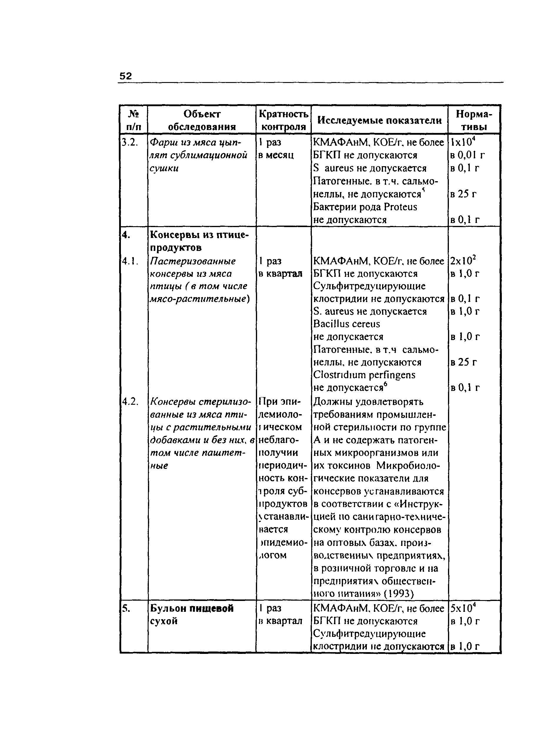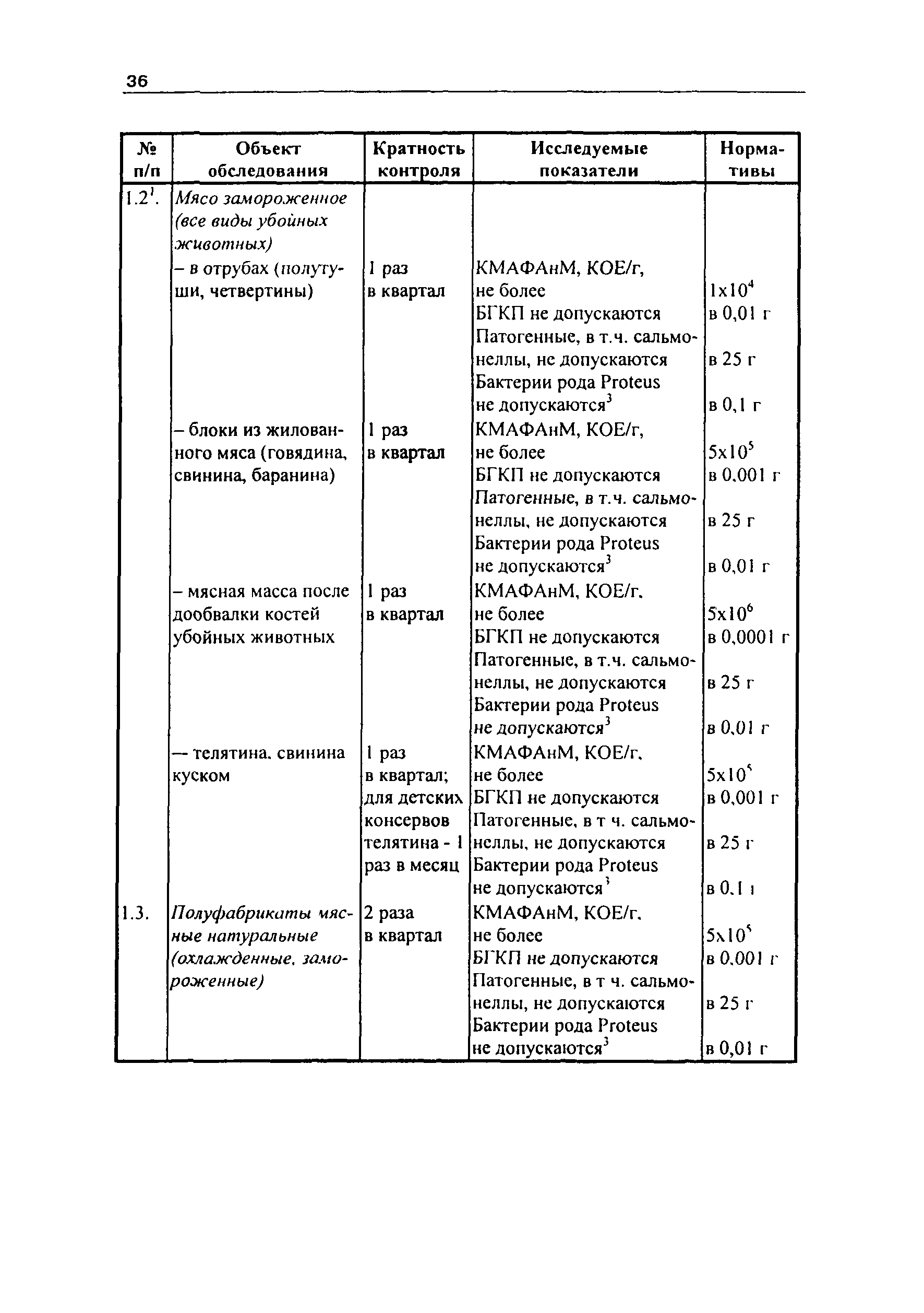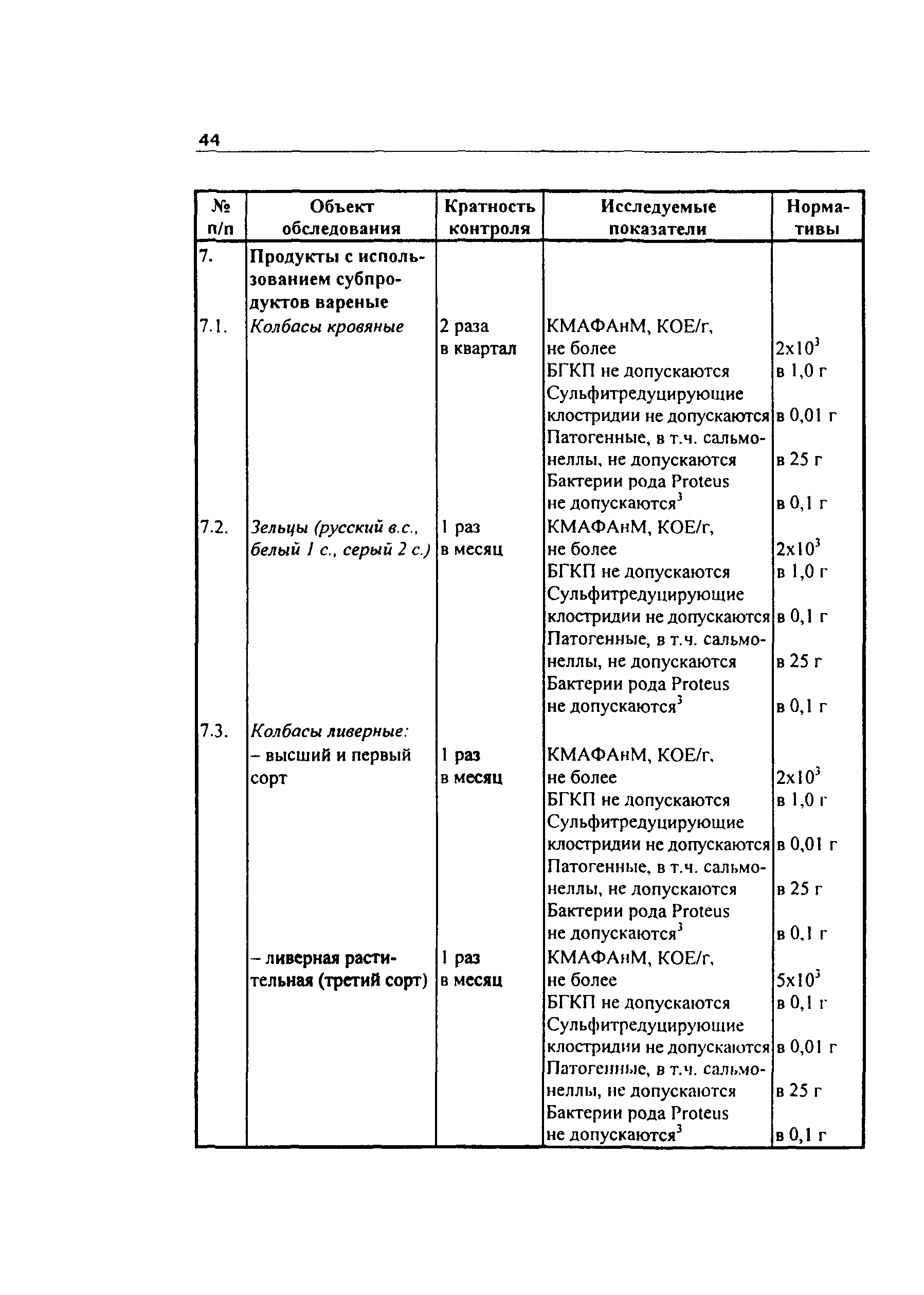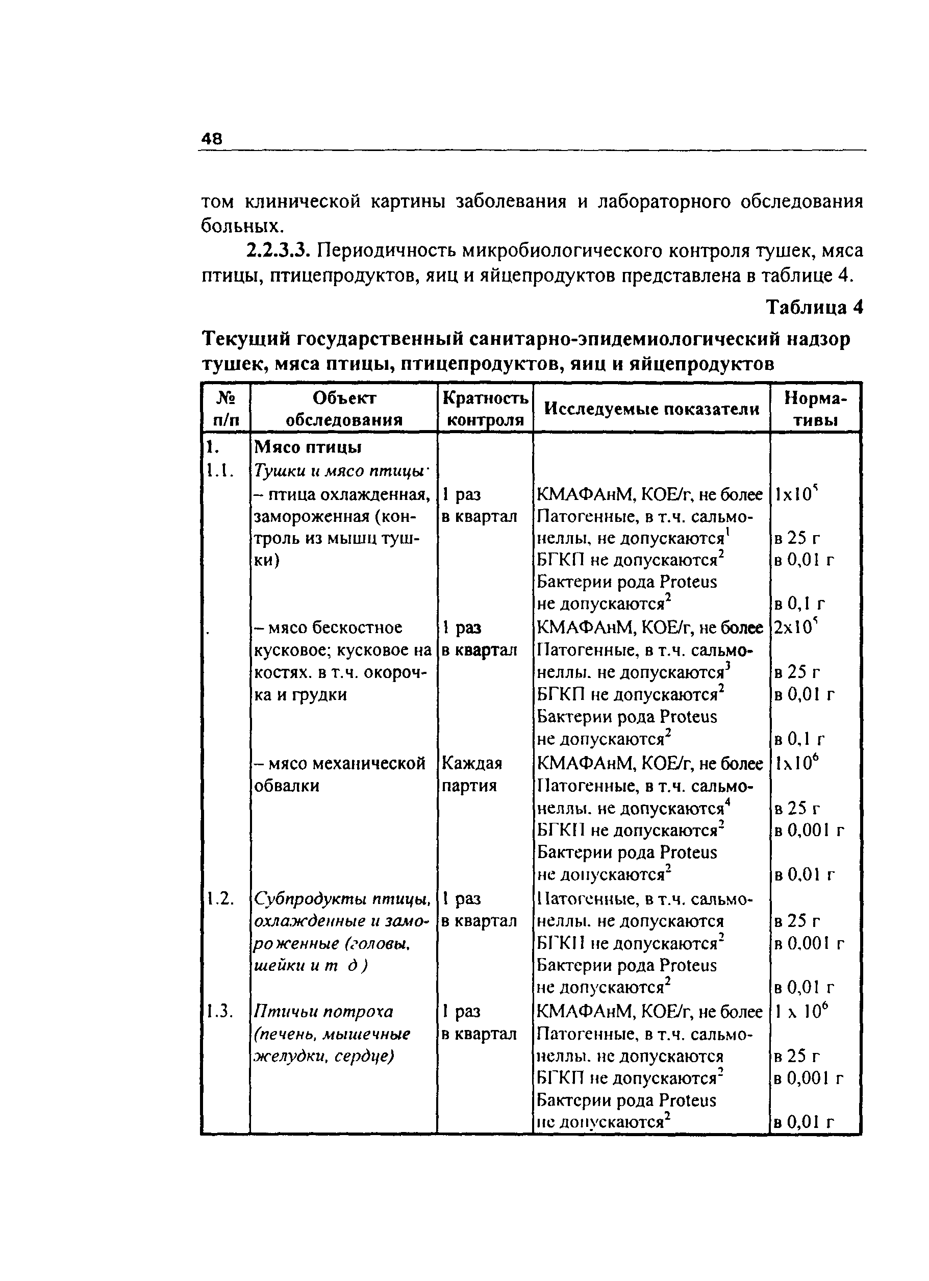 | | Нормативные ссылки: |  СанПиН 2.1.4.559-96 «Питьевая вода. Гигиенические требования к качеству воды централизованных систем питьевого водоснабжения. Контроль качества» ГОСТ 10444.12-88 «Продукты пищевые. Метод определения дрожжей и плесневых грибов»  ГОСТ 10444.15-94 «Продукты пищевые. Методы определения количества мезофильных аэробных и факультативно-анаэробных микроорганизмов» ГОСТ 10444.2-94 «Продукты пищевые. Методы выявления и определения количества Staphylococcus aureus» ГОСТ 10444.8-88 «Продукты пищевые. Метод определения Bacillus cereus»  ГОСТ 10444.9-88 «Продукты пищевые. Метод определения Сlostridium perfringens» ГОСТ 21237-75 «Мясо. Методы бактериологического анализа» ГОСТ 26668-85 «Продукты пищевые и вкусовые. Методы отбора проб для микробиологических анализов»  ГОСТ 26669-85 «Продукты пищевые и вкусовые. Подготовка проб для микробиологических анализов»  ГОСТ 26670-91 «Продукты пищевые. Методы культивирования микроорганизмов»  ГОСТ 26927-86 «Сырье и продукты пищевые. Методы определения ртути»  ГОСТ 26928-86 «Продукты пищевые. Метод определения железа»  ГОСТ 26930-86 «Сырье и продукты пищевые. Метод определения мышьяка»  ГОСТ 26931-86 «Сырье и продукты пищевые. Методы определения меди»  ГОСТ 26932-86 «Сырье и продукты пищевые. Методы определения свинца»  ГОСТ 26933-86 «Сырье и продукты пищевые. Методы определения кадмия»  ГОСТ 26934-86 «Сырье и продукты пищевые. Метод определения цинка» ГОСТ 26935-86 «Продукты пищевые консервированные. Метод определения олова»  ГОСТ 28560-90 «Продукты пищевые. Метод выявления бактерий родов Рrоtеus, Morganella, Providencia»  ГОСТ 28566-90 «Продукты пищевые. Метод выявления и определения количества энтерококков» ГОСТ 2858-82 «Порошок яичный. Технические условия» ГОСТ 29185-91 «Продукты пищевые. Методы выявления и определения количества сульфитредуцирующих клостридий»  ГОСТ 30178-96 «Сырье и продукты пищевые. Атомно-абсорбционный метод определения токсичных элементов» ГОСТ 4288-76 «Изделия кулинарные и полуфабрикаты из рубленого мяса. Правила приемки и методы испытаний» ГОСТ 7702.2.0-95 «Мясо птицы, субпродукты и полуфабрикаты птичьи. Методы отбора проб и подготовка к микробиологическим исследованиям» ГОСТ 7702.2.3-93 «Мясо птицы, субпродукты и полуфабрикаты птичьи. Метод выявления сальмонелл» ГОСТ 7702.2.4-93 «Мясо птицы, субпродукты и полуфабрикаты птичьи. Методы выявления и определения количества Stарhуlососсus аurеus» ГОСТ 7702.2.5-93 «Мясо птицы, субпродукты и полуфабрикаты птичьи. Методы выявления и определения количества листерелл» ГОСТ 7702.2.6-93 «Мясо птицы, субпродукты и полуфабрикаты птичьи. Методы выявления и определения количества сульфитредуцирующих клостридий» ГОСТ 8756.0-70 «Продукты пищевые консервированные. Отбор проб и подготовка их к испытанию» ГОСТ 9792-73 «Колбасные изделия и продукты из свинины, баранины, говядины и мяса других видов убойных животных и птиц. Правила приемки и методы отбора проб» ГОСТ 9958-81 «Колбасные изделия и продукты из мяса. Методы бактериологического анализа» ГОСТ Р 50396.2-92 «Мясо птицы, субпродукты и полуфабрикаты птичьи. Методы выявления и определения количества бактерий группы кишечных палочек (колиформных бактерий родов Еsсhеriсhiа, Сitrоbасtеr, Еntеrоbасtеr, Кlеbsiеllа, Sеrrаtiа)»  ГН 1.1.546-96 «Гигиенические нормативы содержания пестицидов в объектах окружающей среды (перечень)»  МУ 5178-90 «Методические указания по обнаружению и определению содержания общей ртути в пищевых продуктах методом 