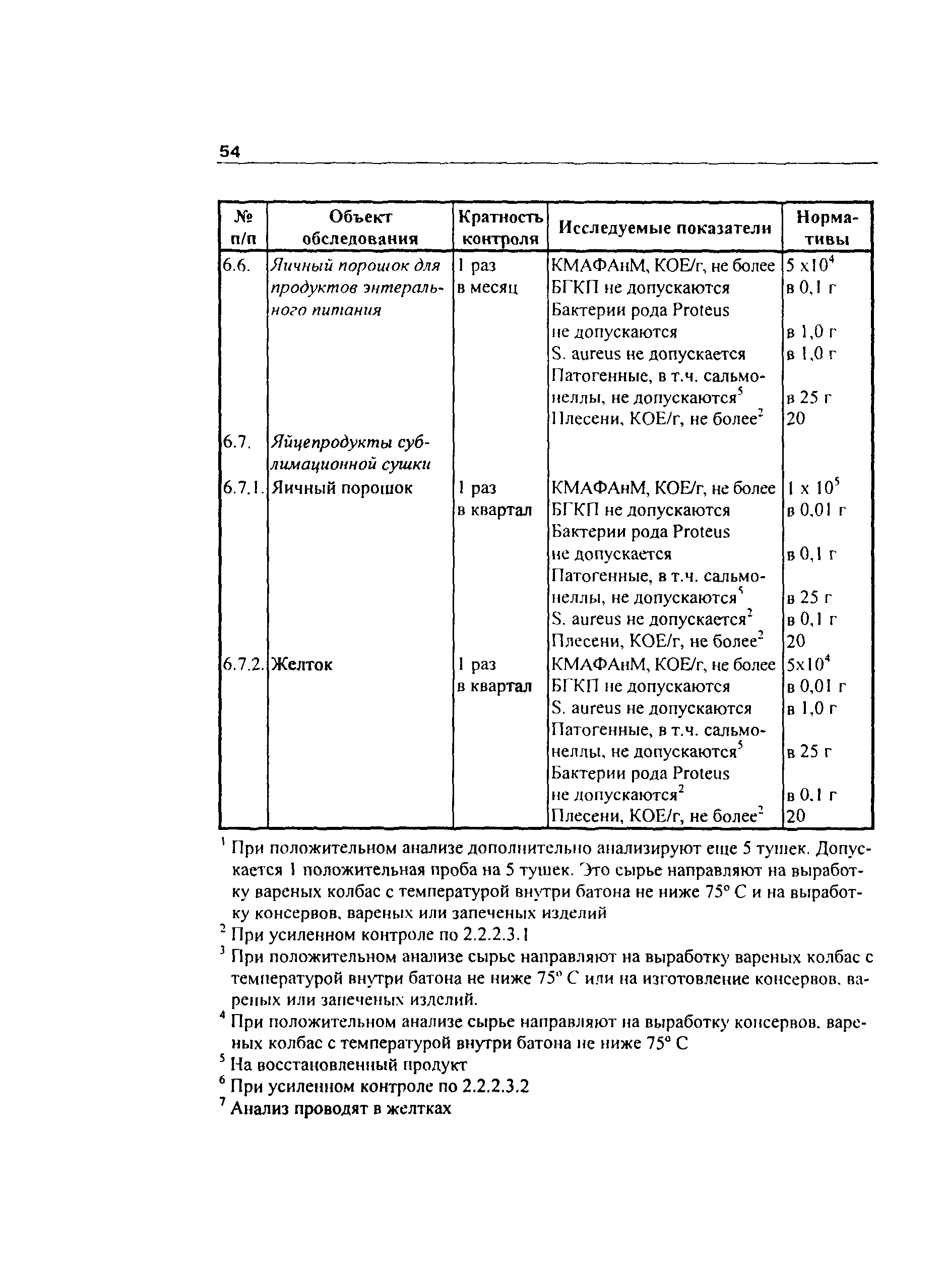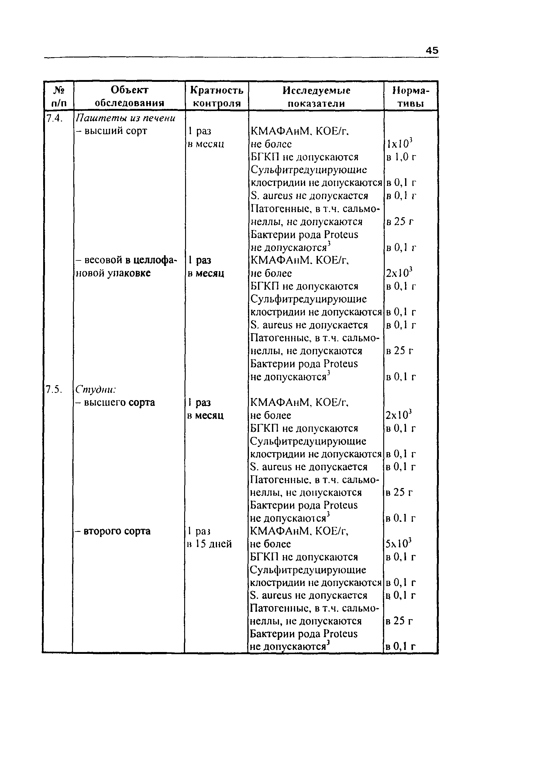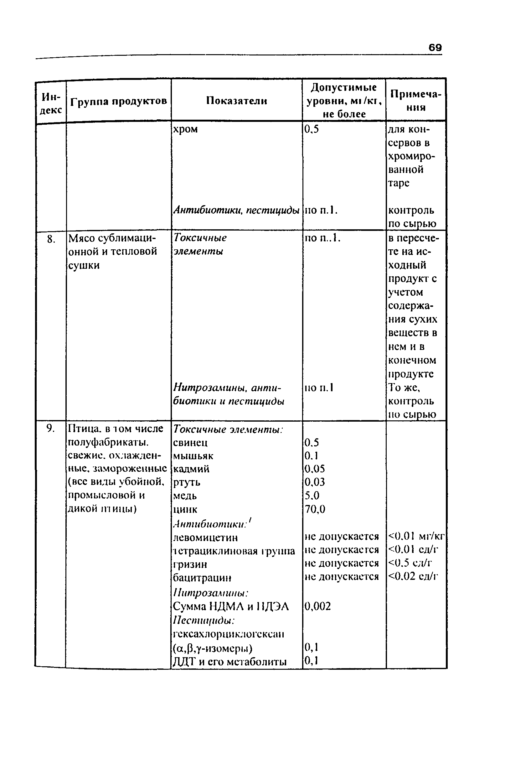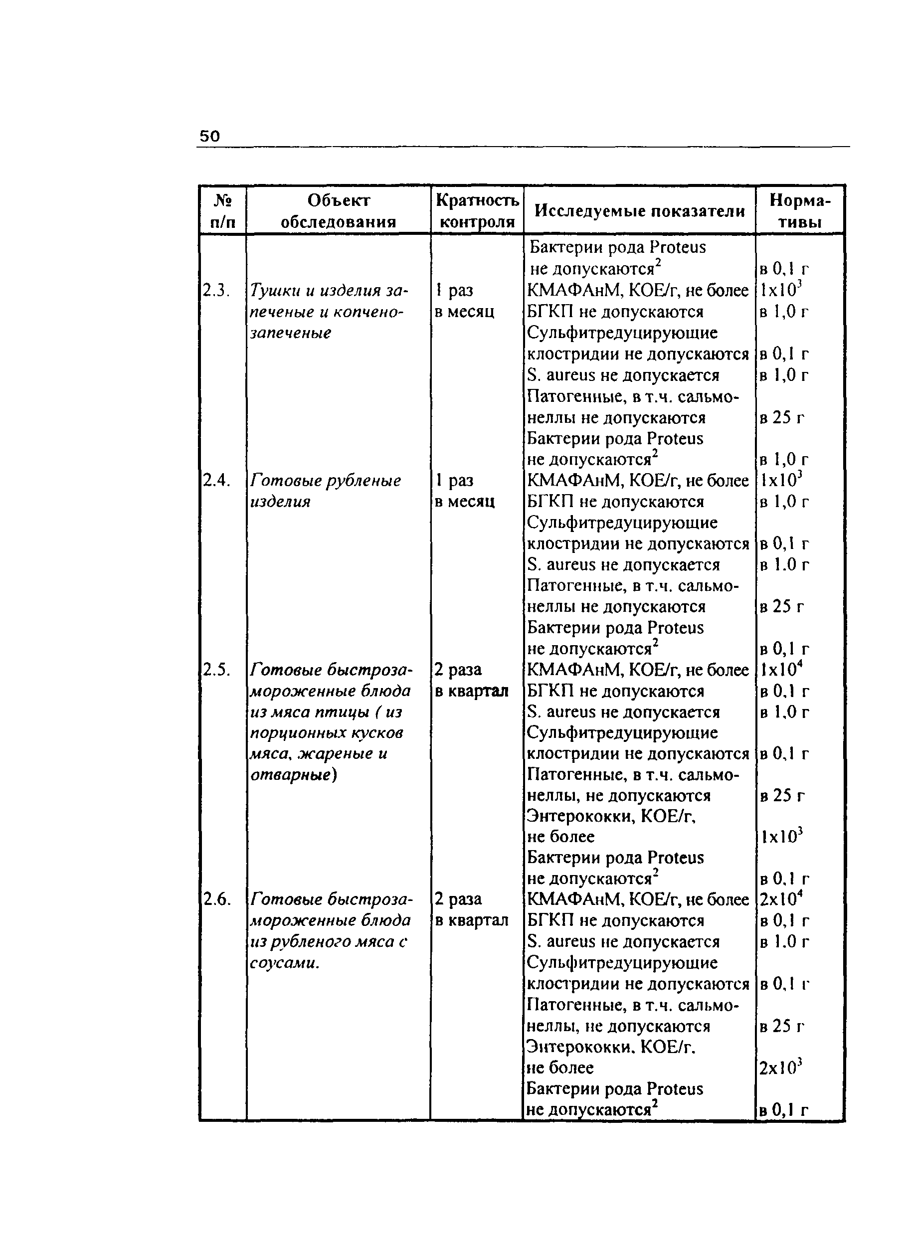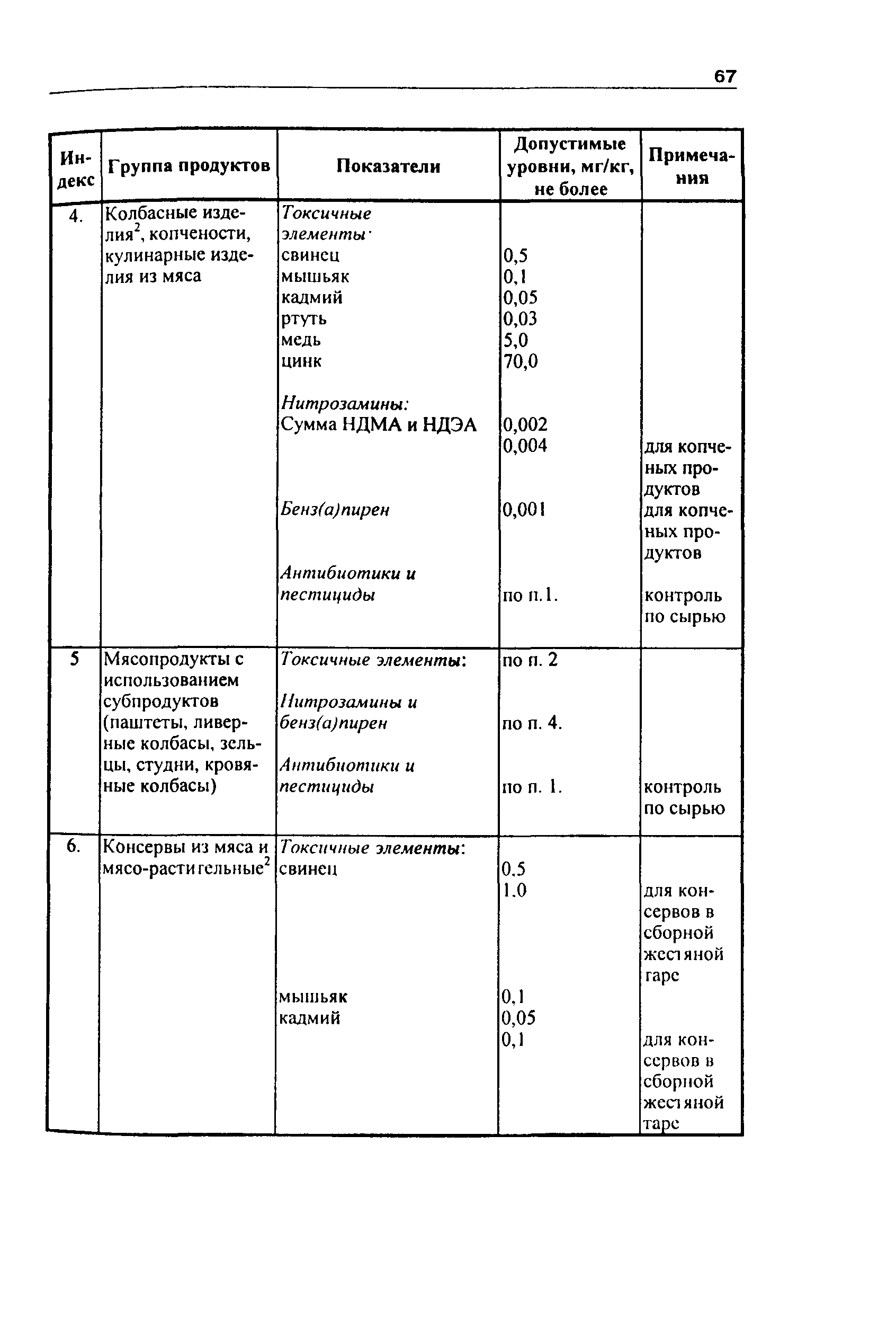 | | Нормативные ссылки: |  СанПиН 2.1.4.559-96 «Питьевая вода. Гигиенические требования к качеству воды централизованных систем питьевого водоснабжения. Контроль качества» ГОСТ 10444.12-88 «Продукты пищевые. Метод определения дрожжей и плесневых грибов»  ГОСТ 10444.15-94 «Продукты пищевые. Методы определения количества мезофильных аэробных и факультативно-анаэробных микроорганизмов» ГОСТ 10444.2-94 «Продукты пищевые. Методы выявления и определения количества Staphylococcus aureus» ГОСТ 10444.8-88 «Продукты пищевые. Метод определения Bacillus cereus»  ГОСТ 10444.9-88 «Продукты пищевые. Метод определения Сlostridium perfringens» ГОСТ 21237-75 «Мясо. Методы бактериологического анализа» ГОСТ 26668-85 «Продукты пищевые и вкусовые. Методы отбора проб для микробиологических анализов»  ГОСТ 26669-85 «Продукты пищевые и вкусовые. Подготовка проб для микробиологических анализов»  ГОСТ 26670-91 «Продукты пищевые. Методы культивирования микроорганизмов»  ГОСТ 26927-86 «Сырье и продукты пищевые. Методы определения ртути»  ГОСТ 26928-86 «Продукты пищевые. Метод определения железа»  ГОСТ 26930-86 «Сырье и продукты пищевые. Метод определения мышьяка»  ГОСТ 26931-86 «Сырье и продукты пищевые. Методы определения меди»  ГОСТ 26932-86 «Сырье и продукты пищевые. Методы определения свинца»  ГОСТ 26933-86 «Сырье и продукты пищевые. Методы определения кадмия»  ГОСТ 26934-86 «Сырье и продукты пищевые. Метод определения цинка» ГОСТ 26935-86 «Продукты пищевые консервированные. Метод определения олова»  ГОСТ 28560-90 «Продукты пищевые. Метод выявления бактерий родов Рrоtеus, Morganella, Providencia»  ГОСТ 28566-90 «Продукты пищевые. Метод выявления и определения количества энтерококков» ГОСТ 2858-82 «Порошок яичный. Технические условия» ГОСТ 29185-91 «Продукты пищевые. Методы выявления и определения количества сульфитредуцирующих клостридий»  ГОСТ 30178-96 «Сырье и продукты пищевые. Атомно-абсорбционный метод определения токсичных элементов» ГОСТ 4288-76 «Изделия кулинарные и полуфабрикаты из рубленого мяса. Правила приемки и методы испытаний» ГОСТ 7702.2.0-95 «Мясо птицы, субпродукты и полуфабрикаты птичьи. Методы отбора проб и подготовка к микробиологическим исследованиям» ГОСТ 7702.2.3-93 «Мясо птицы, субпродукты и полуфабрикаты птичьи. Метод выявления сальмонелл» ГОСТ 7702.2.4-93 «Мясо птицы, субпродукты и полуфабрикаты птичьи. Методы выявления и определения количества Stарhуlососсus аurеus» ГОСТ 7702.2.5-93 «Мясо птицы, субпродукты и полуфабрикаты птичьи. Методы выявления и определения количества листерелл» ГОСТ 7702.2.6-93 «Мясо птицы, субпродукты и полуфабрикаты птичьи. Методы выявления и определения количества сульфитредуцирующих клостридий» ГОСТ 8756.0-70 «Продукты пищевые консервированные. Отбор проб и подготовка их к испытанию» ГОСТ 9792-73 «Колбасные изделия и продукты из свинины, баранины, говядины и мяса других видов убойных животных и птиц. Правила приемки и методы отбора проб» ГОСТ 9958-81 «Колбасные изделия и продукты из мяса. Методы бактериологического анализа» ГОСТ Р 50396.2-92 «Мясо птицы, субпродукты и полуфабрикаты птичьи. Методы выявления и определения количества бактерий группы кишечных палочек (колиформных бактерий родов Еsсhеriсhiа, Сitrоbасtеr, Еntеrоbасtеr, Кlеbsiеllа, Sеrrаtiа)»  ГН 1.1.546-96 «Гигиенические нормативы содержания пестицидов в объектах окружающей среды (перечень)»  МУ 5178-90 «Методические указания по обнаружению и определению содержания общей ртути в пищевых продуктах методом 