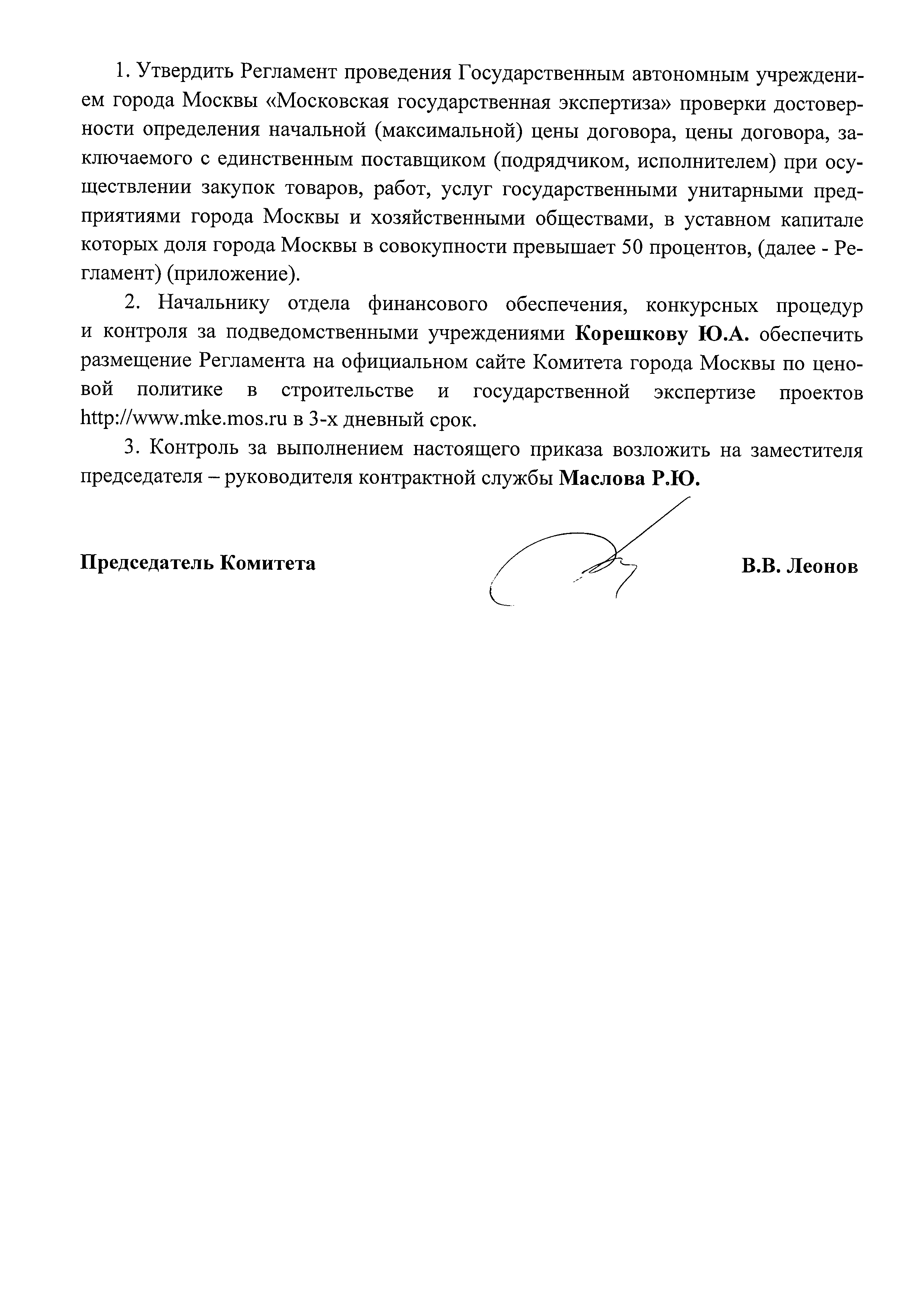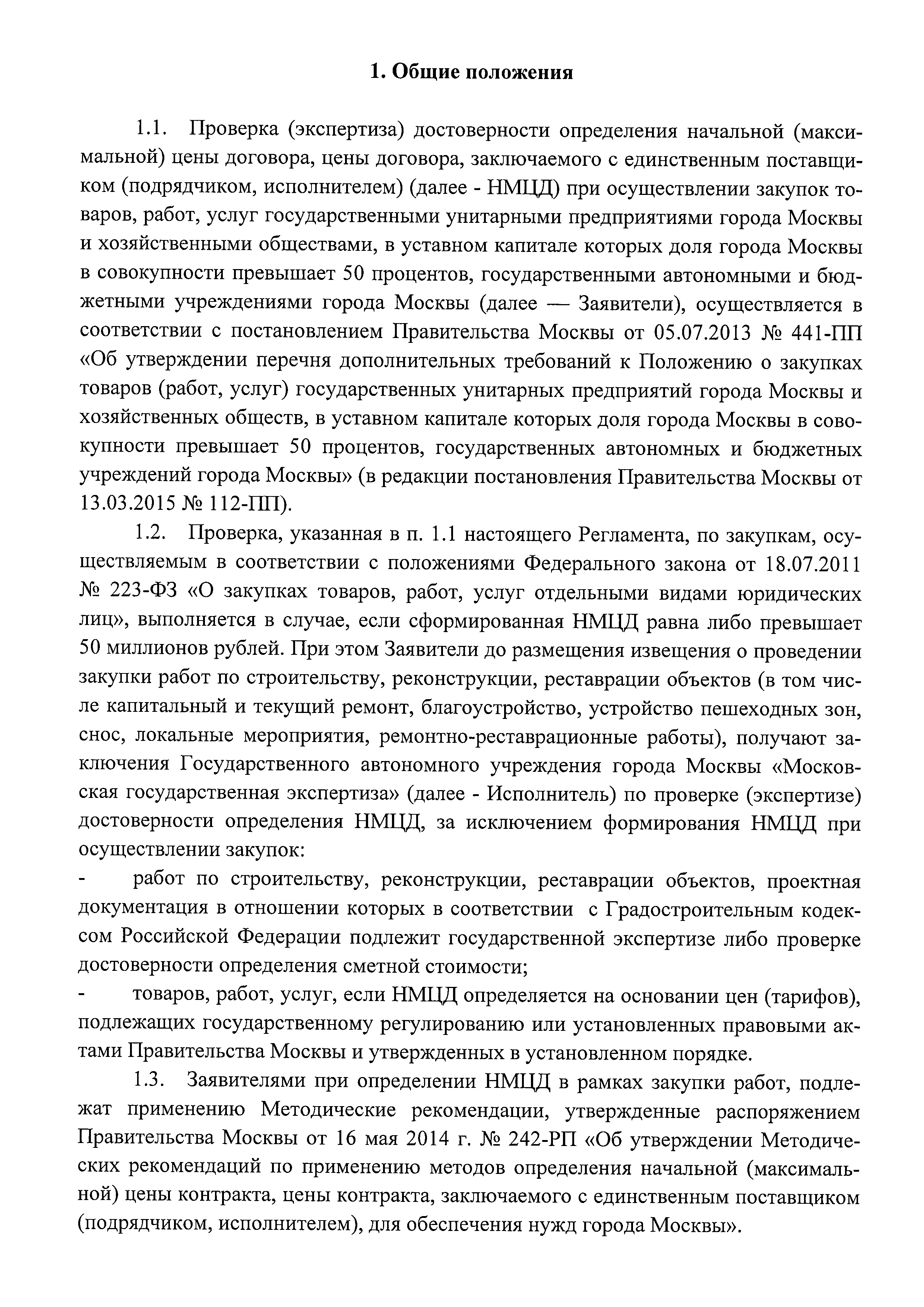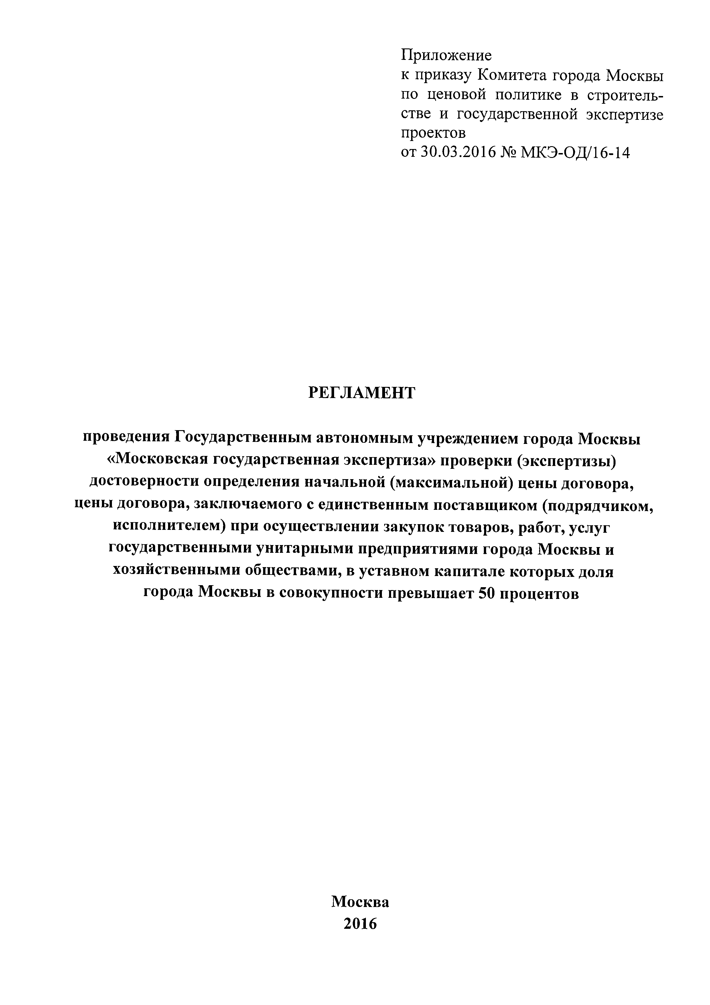 | Название рус.: | Регламент проведения Государственным автономным учреждением города Москвы "Московская государственная экспертиза" проверки (экспертизы) достоверности определения начальной (максимальной) цены договора, цены договора, заключаемого с единственным поставщиком (подрядчиком, исполнителем) при осуществлении закупок товаров, работ, услуг государственными унитарными предприятиями города Москвы и хозяйственными обществами, в уставном капитале которых доля города Москвы в совокупности превышает 50 процентов |