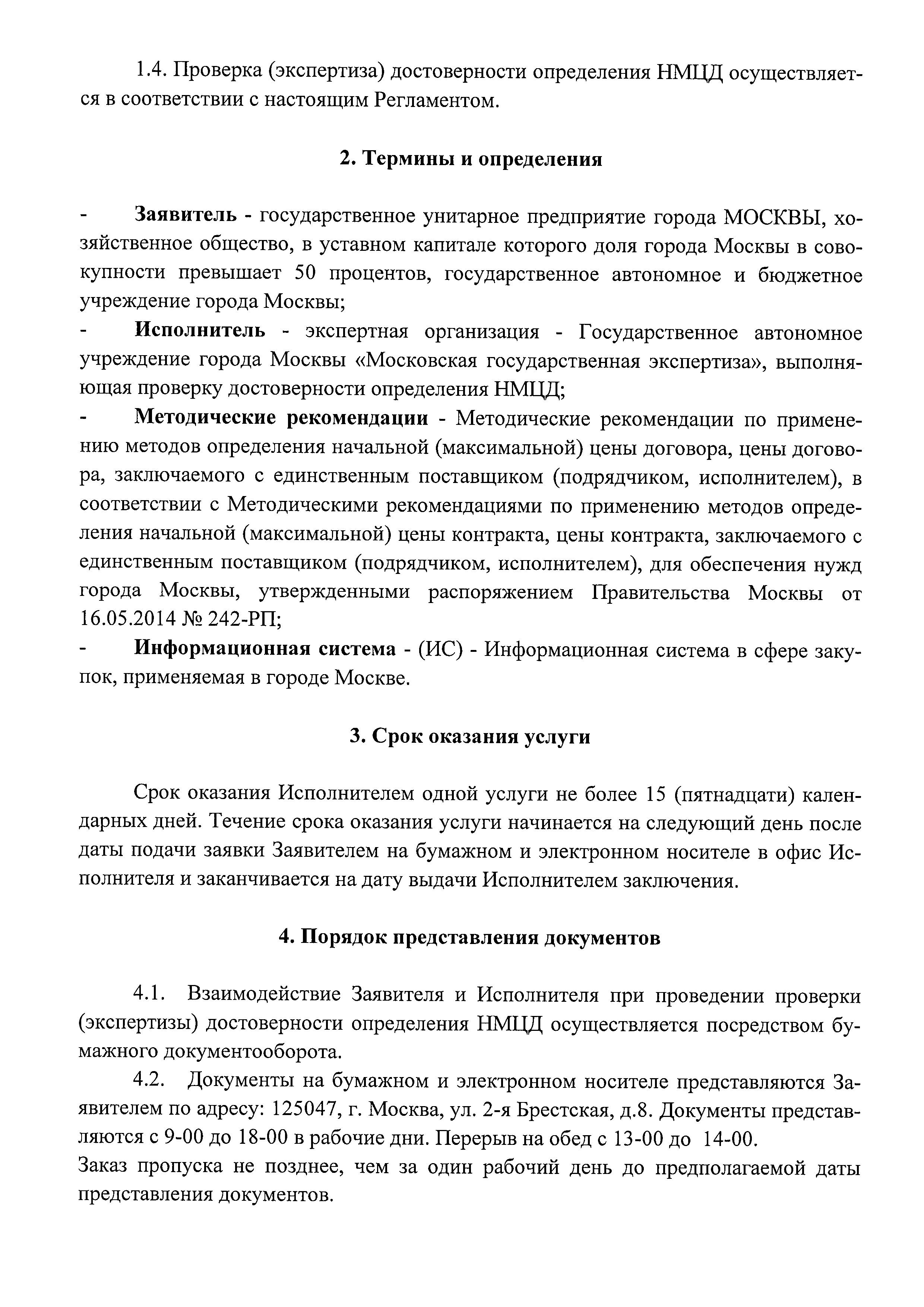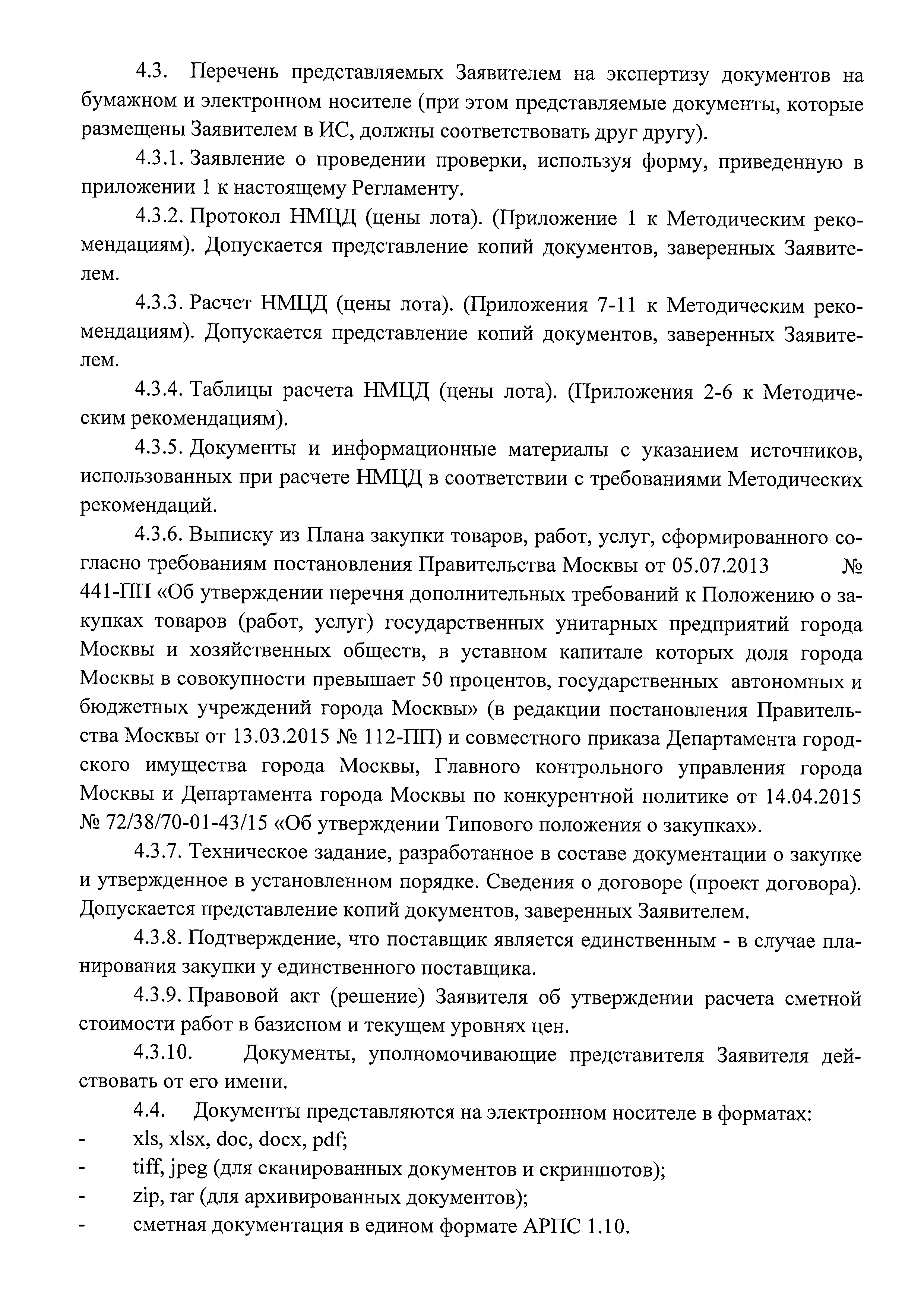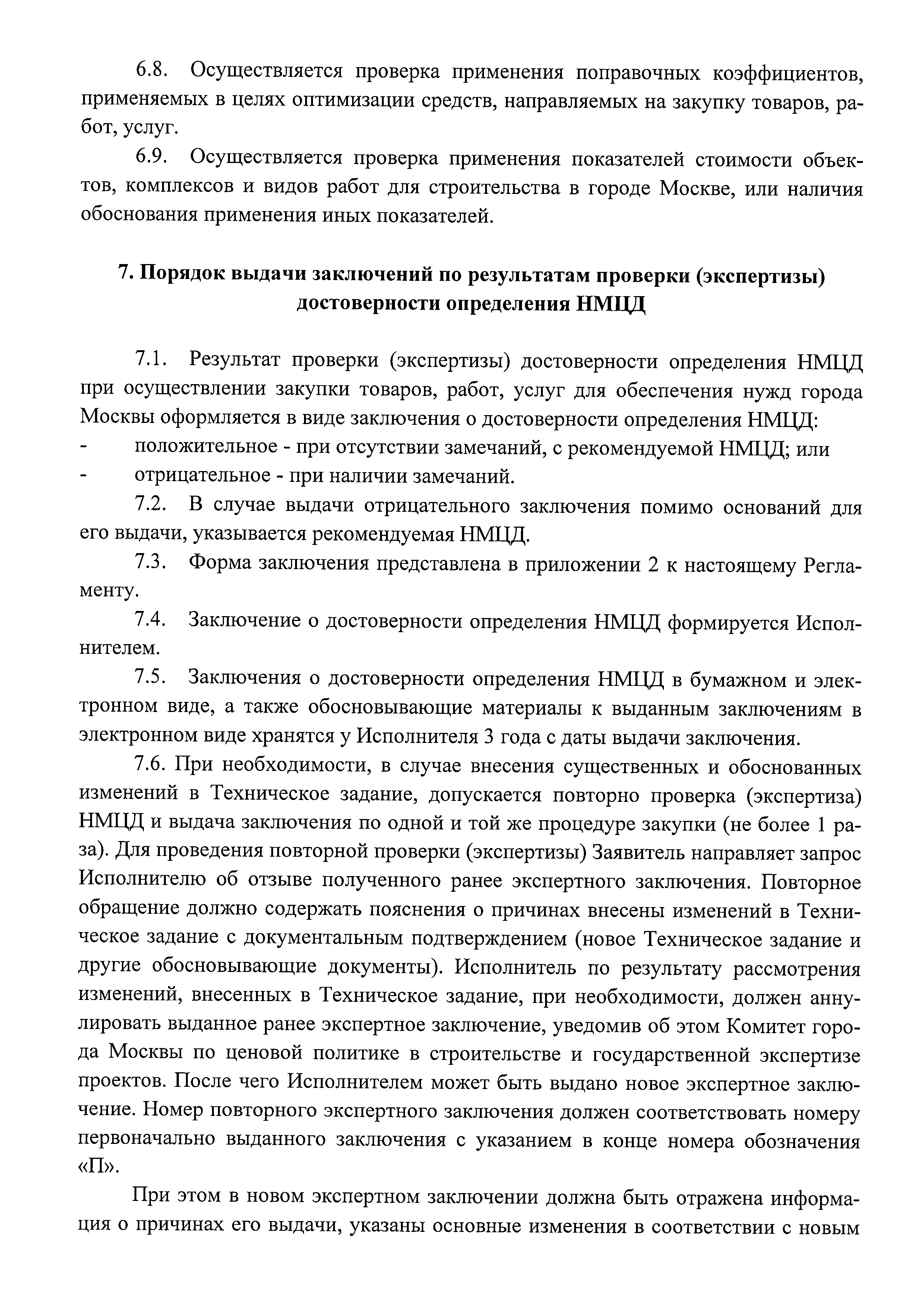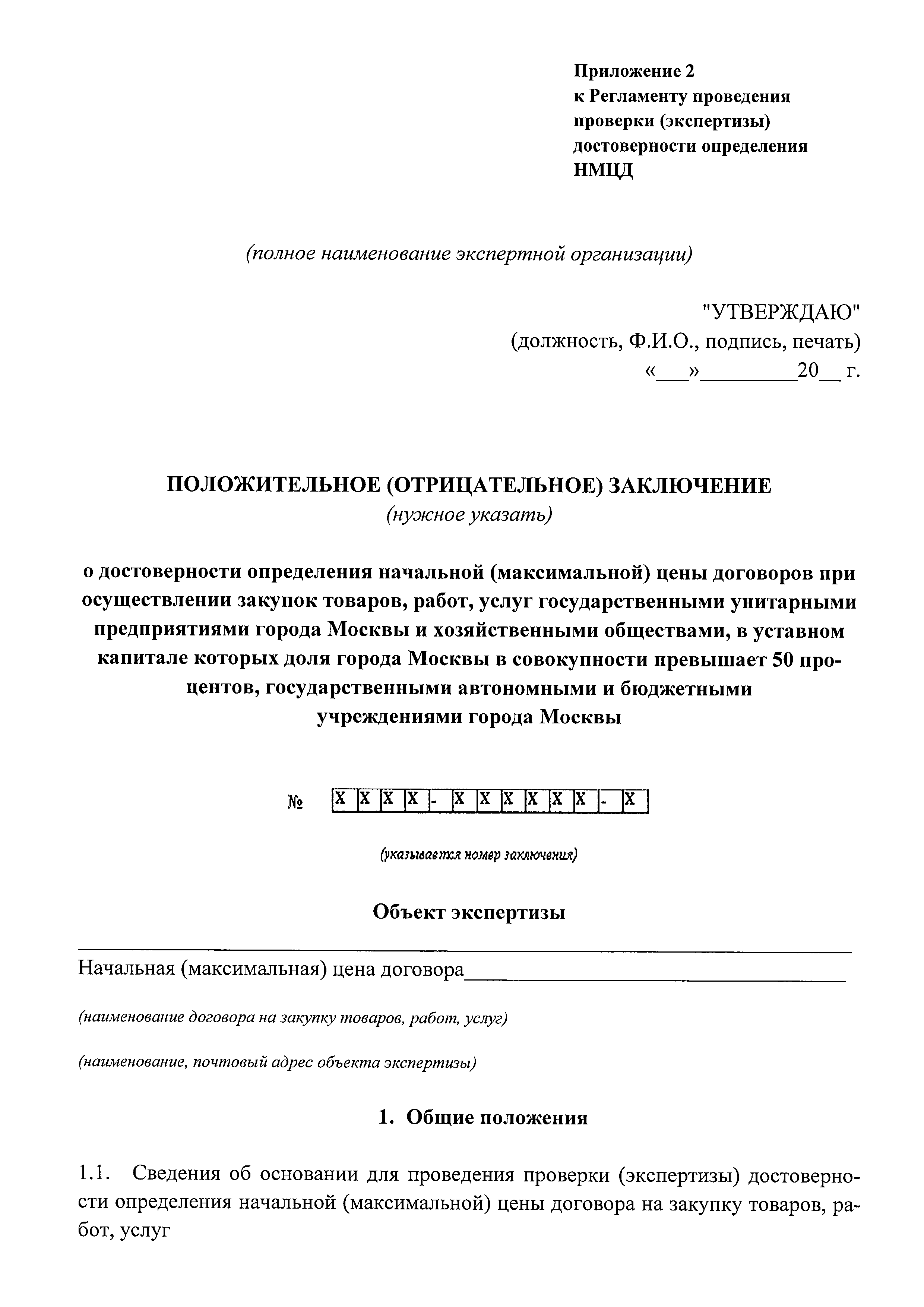 | Оглавление: | 1. Общие положения 2. Термины и определения 3. Срок оказания услуги 4. Порядок представления документов 5. Порядок приема документов 6. Порядок проведения проверки (экспертизы) достоверности определения НМЦД на закупку работ, в отношении объектов, проектная документация по которым в соответствии с Градостроительным кодексом Российской Федерации не подлежит государственной экспертизе либо сметная стоимость которых не подлежит проверке достоверности 7. Порядок выдачи заключений по результатам проверки (экспертизы) достоверности определения НМЦД 8. Отчетные материалы Исполнителя Приложение 1. Заявление о проведении проверки (экспертизы) достоверности определения начальной (максимальной) цены договора при осуществлении закупки товаров, работ, услуг государственными унитарными предприятиями города Москвы и хозяйственными обществами, в уставном капитале которых доля города Москвы в совокупности превышает 50 процентов, государственными автономными и бюджетными учреждениями города Москвы Приложение. Опись документов, представляемых для проведения проверки (экспертизы) достоверности определения начальной (максимальной) цены договора Приложение 2. Положительное (отрицательное) заключение о достоверности определения начальной (максимальной) цены договоров при осуществлении закупок товаров, работ, услуг государственными унитарными предприятиями города Москвы и хозяйственными обществами, в уставном капитале которых доля города Москвы в совокупности превышает 50 процентов, государственными автономными и бюджетными учреждениями города Москвы |
