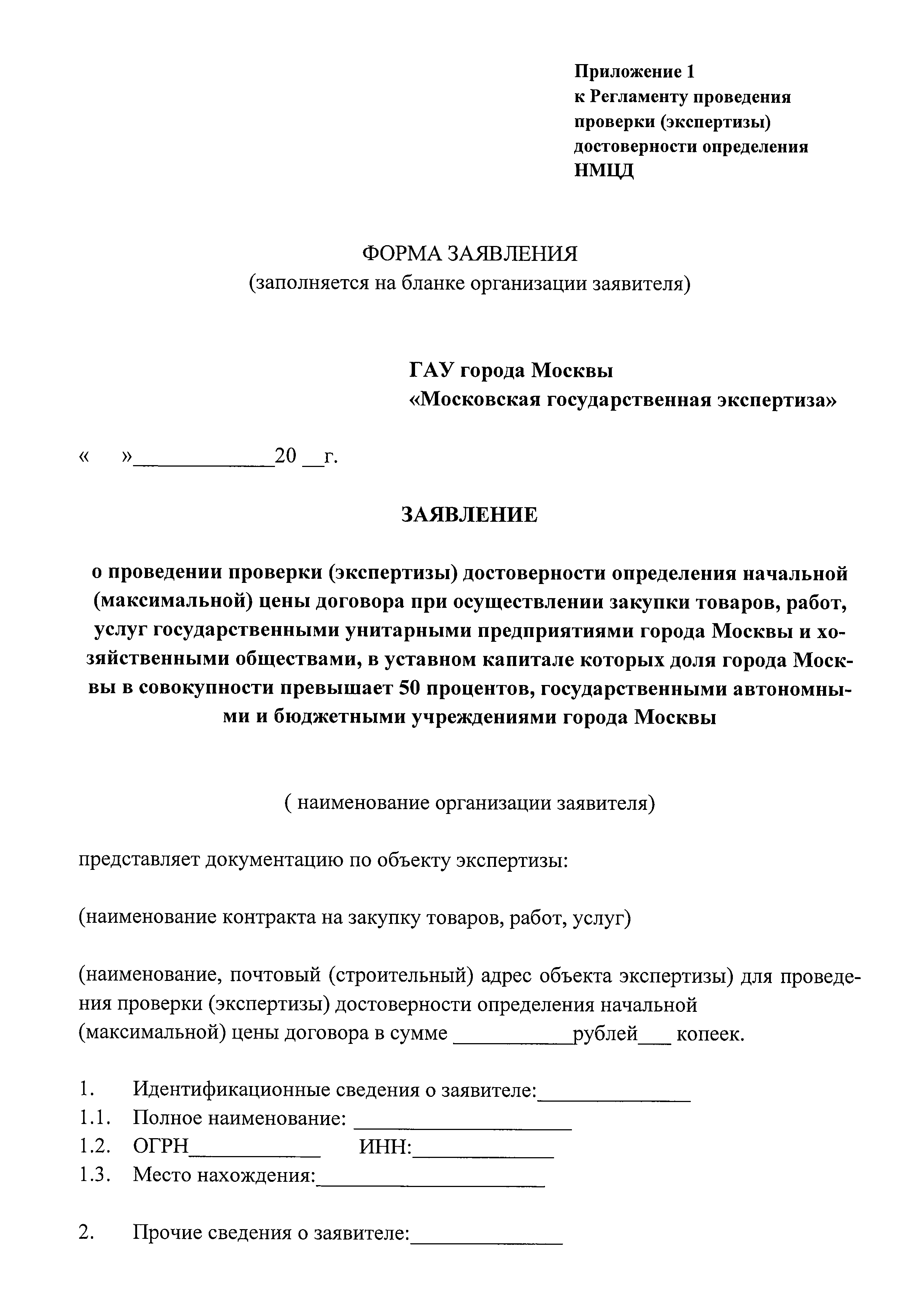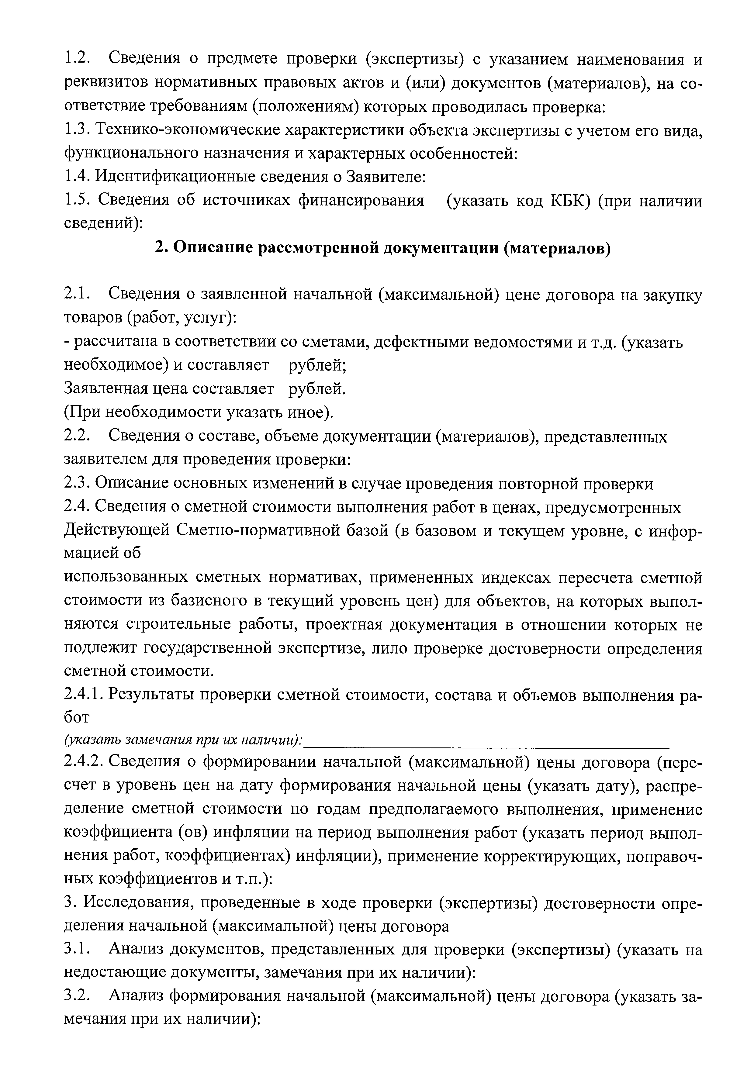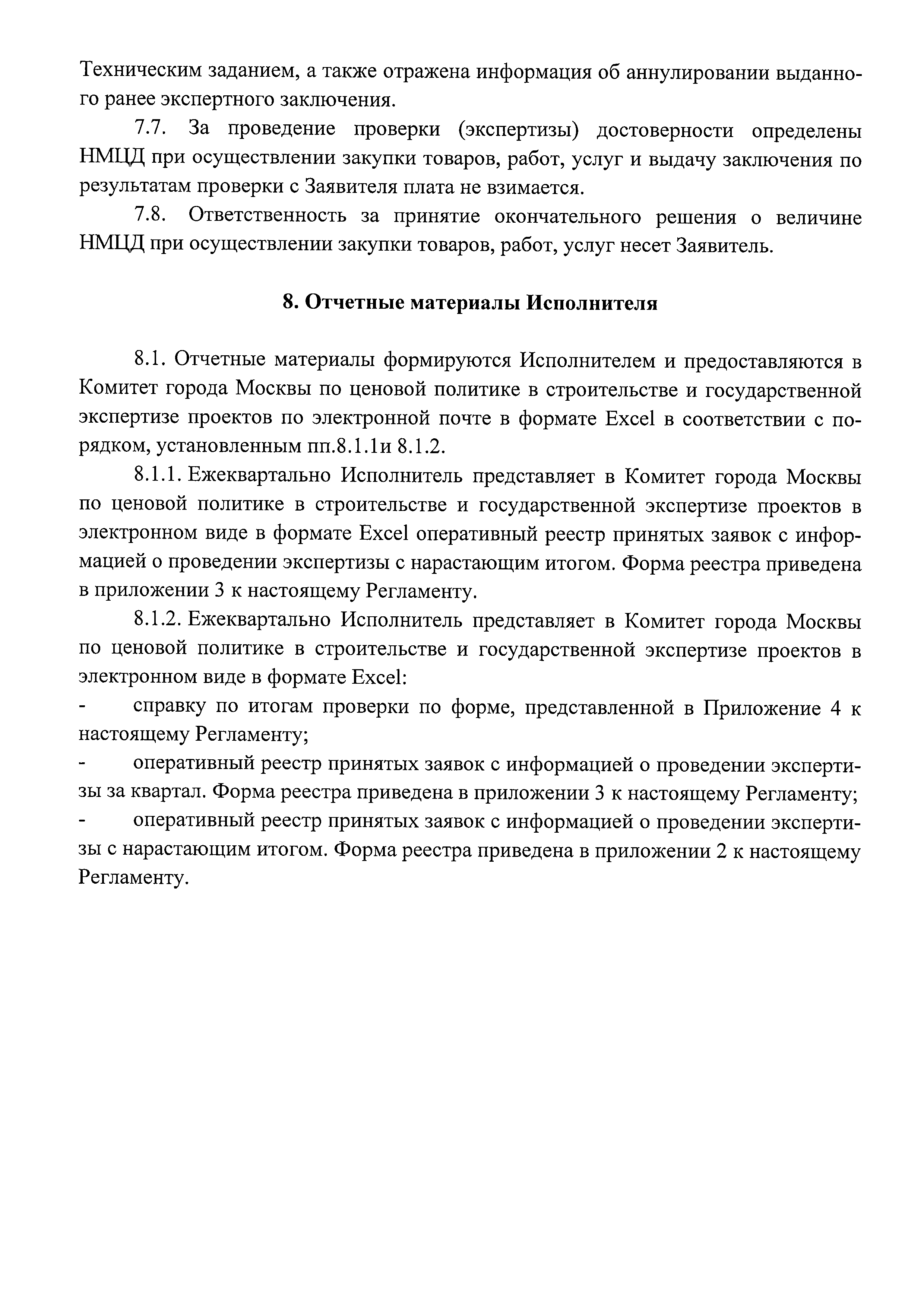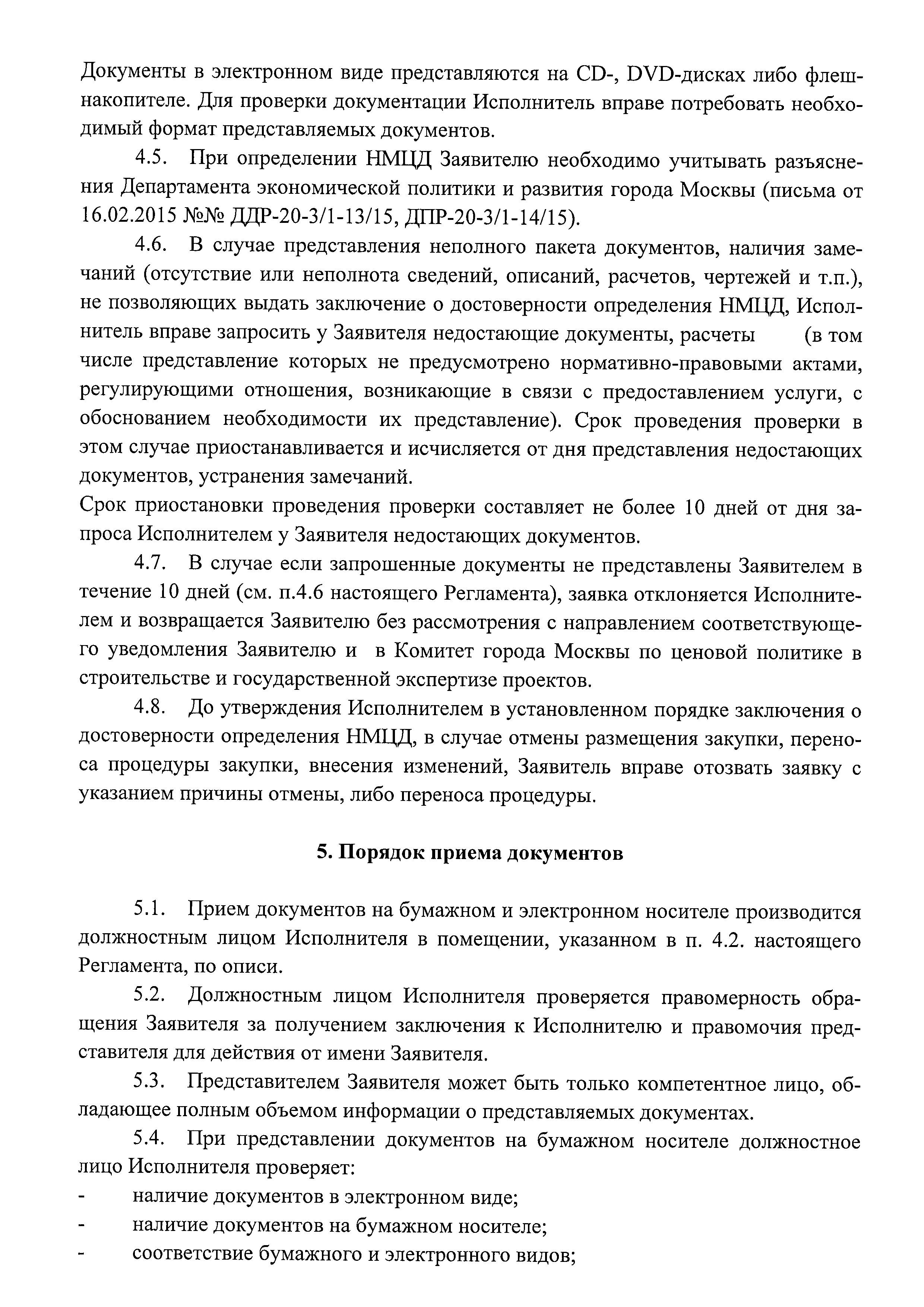 | Оглавление: | 1. Общие положения 2. Термины и определения 3. Срок оказания услуги 4. Порядок представления документов 5. Порядок приема документов 6. Порядок проведения проверки (экспертизы) достоверности определения НМЦД на закупку работ, в отношении объектов, проектная документация по которым в соответствии с Градостроительным кодексом Российской Федерации не подлежит государственной экспертизе либо сметная стоимость которых не подлежит проверке достоверности 7. Порядок выдачи заключений по результатам проверки (экспертизы) достоверности определения НМЦД 8. Отчетные материалы Исполнителя Приложение 1. Заявление о проведении проверки (экспертизы) достоверности определения начальной (максимальной) цены договора при осуществлении закупки товаров, работ, услуг государственными унитарными предприятиями города Москвы и хозяйственными обществами, в уставном капитале которых доля города Москвы в совокупности превышает 50 процентов, государственными автономными и бюджетными учреждениями города Москвы Приложение. Опись документов, представляемых для проведения проверки (экспертизы) достоверности определения начальной (максимальной) цены договора Приложение 2. Положительное (отрицательное) заключение о достоверности определения начальной (максимальной) цены договоров при осуществлении закупок товаров, работ, услуг государственными унитарными предприятиями города Москвы и хозяйственными обществами, в уставном капитале которых доля города Москвы в совокупности превышает 50 процентов, государственными автономными и бюджетными учреждениями города Москвы |