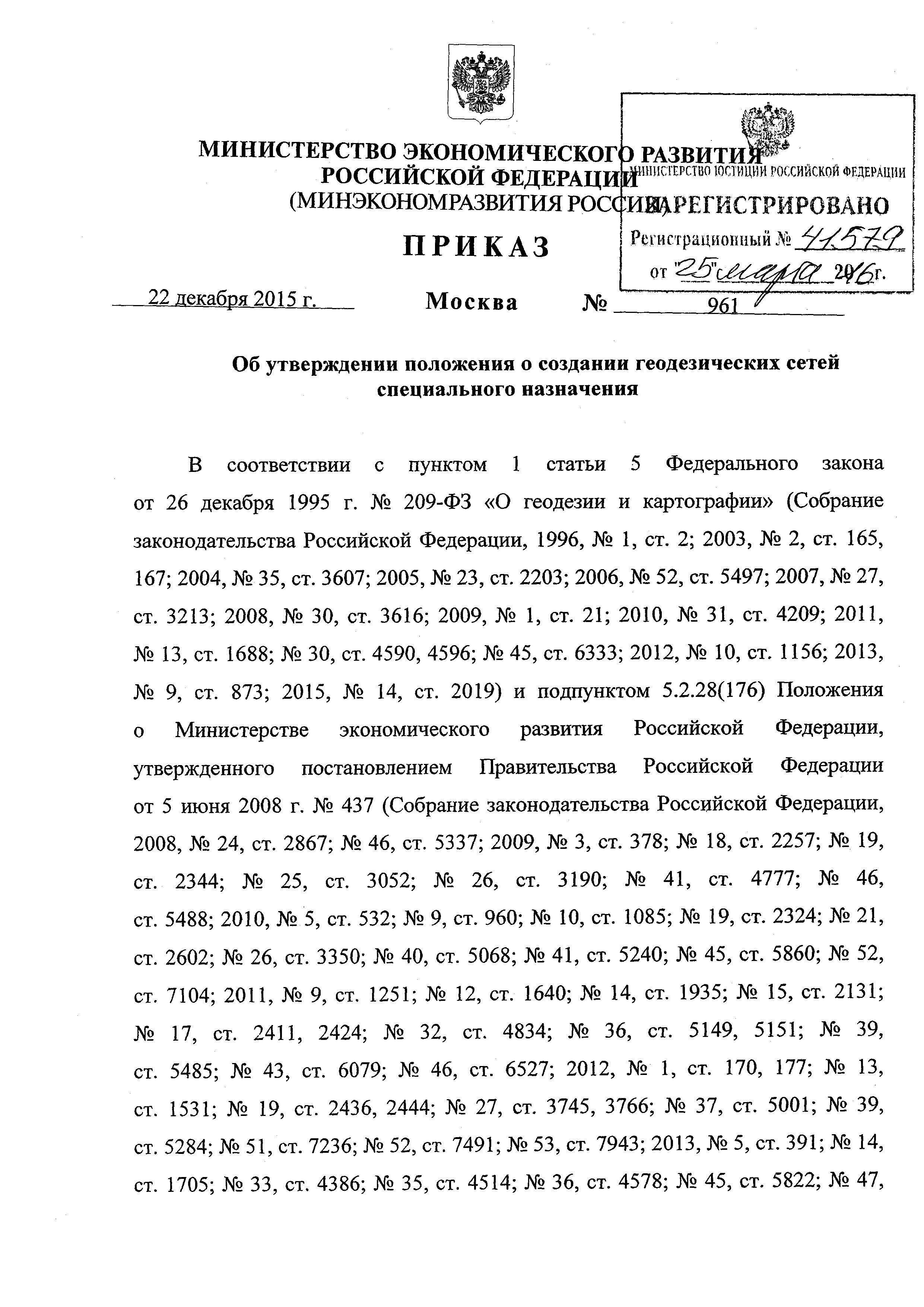 | Область применения: | Положение определяет порядок создания геодезических сетей специального назначения, создаваемых в целях повышения точности результатов выполнения геодезических работ, включая геодезические работы в составе инженерных изысканий, выполняемых для подготовки проектной документации, строительства, реконструкции, объектов капитального строительства, кадастровых, маркшейдерских работ, землеустройства, работ по установлению, изменению и уточнению прохождения государственной границы Российской Федерации, границ между субъектами Российской Федерации и границ муниципальных образований |