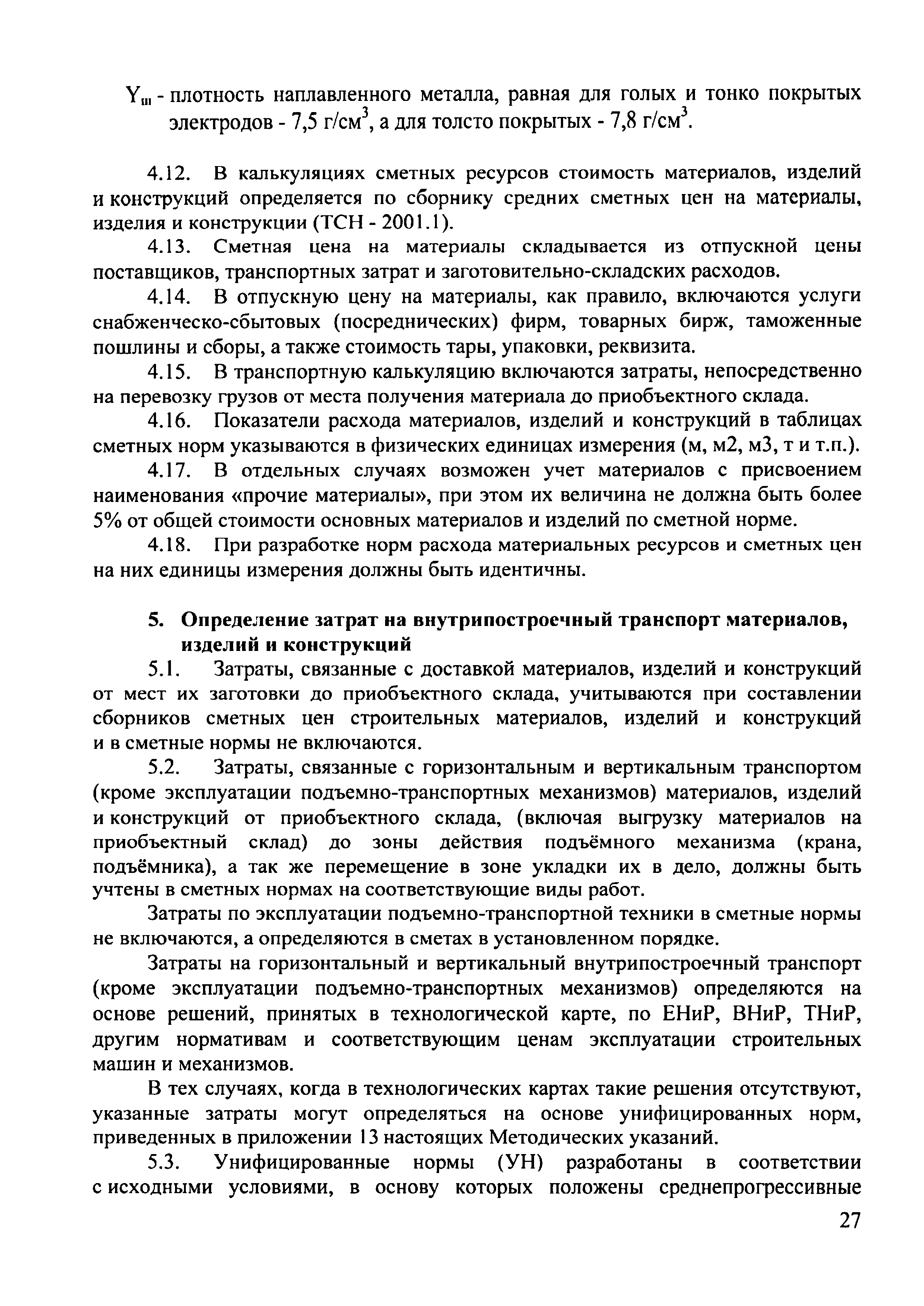 | Оглавление: | Содержание 1. Область применения 2. Термины и определения 3. Общие положения 4. Порядок планирования разработки (актуализации) проектов ТСН 5. Организация внеплановой разработки (актуализации) ТСН 6. Разработка и утверждение технологических карт и проектов ТЭСНРР 7. Порядок выполнения мероприятий по сопровождению базы ТСН-2001 Приложение А. Годовой план разработки (актуализации) территориальных сметных нормативов для города Москвы Приложение Б. Заявление о разработке (актуализации) сметного норматива Приложение В. Состав комплекта документов, представляемых в Москомэкспертизу для организации разработки ТСН Приложение Г. Методические указания по разработке элементных сметных нормативов, применяемых при определении сметной стоимости объектов капитального строительства, строительство (реконструкция, капитальный ремонт, техническое перевооружение, реставрация) которых финансируется с привлечением средств бюджета города Москвы Содержание 1. Общие положения 2. Определение норм затрат труда 3. Определение норм затрат машинного времени 4. Определение сметной стоимости и норм расхода строительных материалов, изделий и конструкций 5. Определение затрат на внутрипостроечный транспорт материалов, изделий и конструкций Приложение 1. Нормативы на подготовительно-заключительную работу и отдых при проектировании норм затрат труда Приложение 2. Среднечасовой уровень оплаты труда рабочих Приложение 3. Перечень работ с тяжелыми и вредными, особо тяжелыми и особо вредными условиями труда, на которых повышаются часовые тарифные ставки рабочим за условия труда в строительстве и на ремонтно-строительных работах Приложение 4. Пример определения норм машинного времени механизированного процесса расчетно-аналитическим методом Приложение 5. Коэффициенты перехода от производственных норм к сметным нормам затрат машинного времени Приложение 6. Типовые нормы трудноустранимых потерь и отходов материалов и изделий в процессе строительного производства Приложение 7. Типовые нормы трудноустранимых потерь стали при изготовлении сброрных железобетонных конструкций Приложение 8. Типовые нормы трудноустранимых потерь стали при укладке арматуры в монолитные железобетонные конструкции Приложение 9. Типовые нормы трудноустранимых потерь труб при прокладке трубопроводов Приложение 10. Типовые нормы трудноустранимых потерь бетона при сооружении бетонных и железобетонных конструкций Приложение 11. Типовые нормы трудноустранимых потерь электродов на огарки Приложение 12. Оборачиваемость повторно применяемых материалов Приложение 13. Унифицированные нормы на внутрипостроечный транспорт материалов, изделий и конструкций от приобъектного склада до рабочего места Приложение 14. Типовые нормы естественной убыли строительных материалов при транспортировании Приложение 15. Калькуляция сметных ресурсов Приложение Д. Реестр территориальных сметных нормативов, подлежащих применению при определении сметной стоимости объектов капитального строительства, строительство (реконструкция, капитальный ремонт, техническое перевооружение, реставрация) которых финансируется с привлечением средств бюджета города Москвы Приложение Е. Библиографический список |