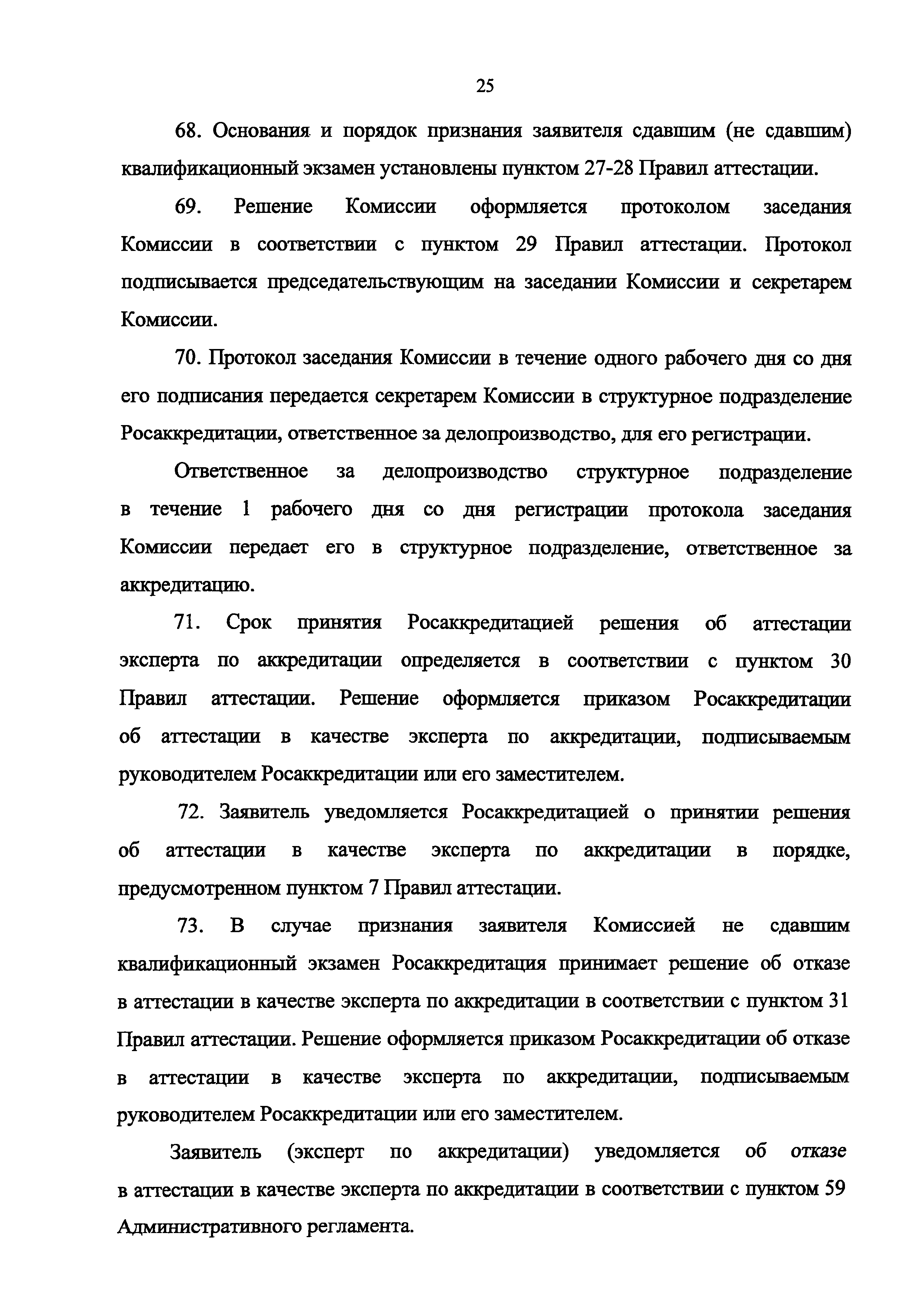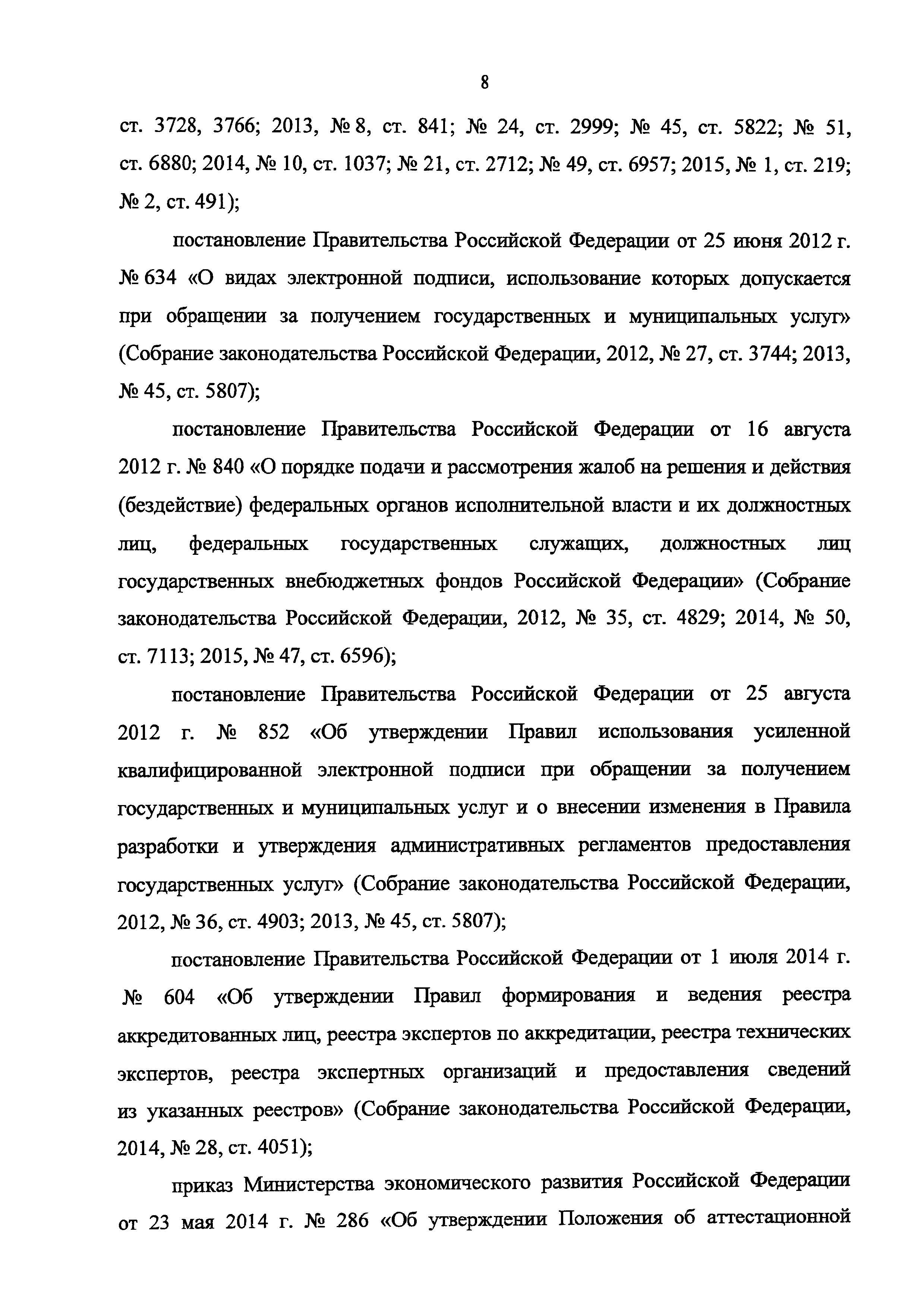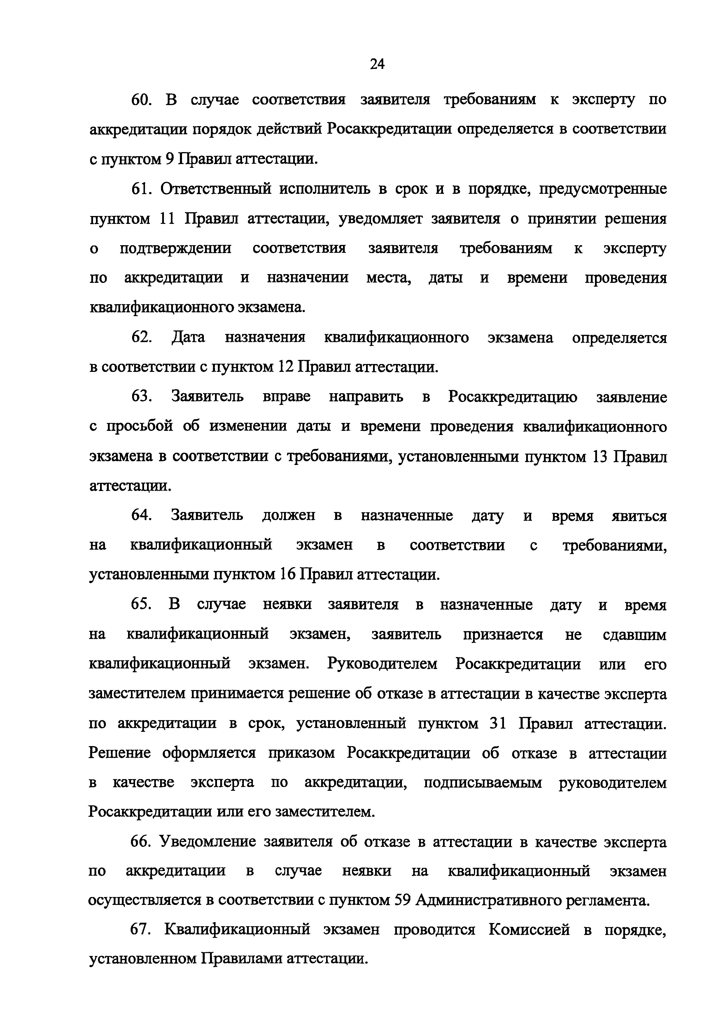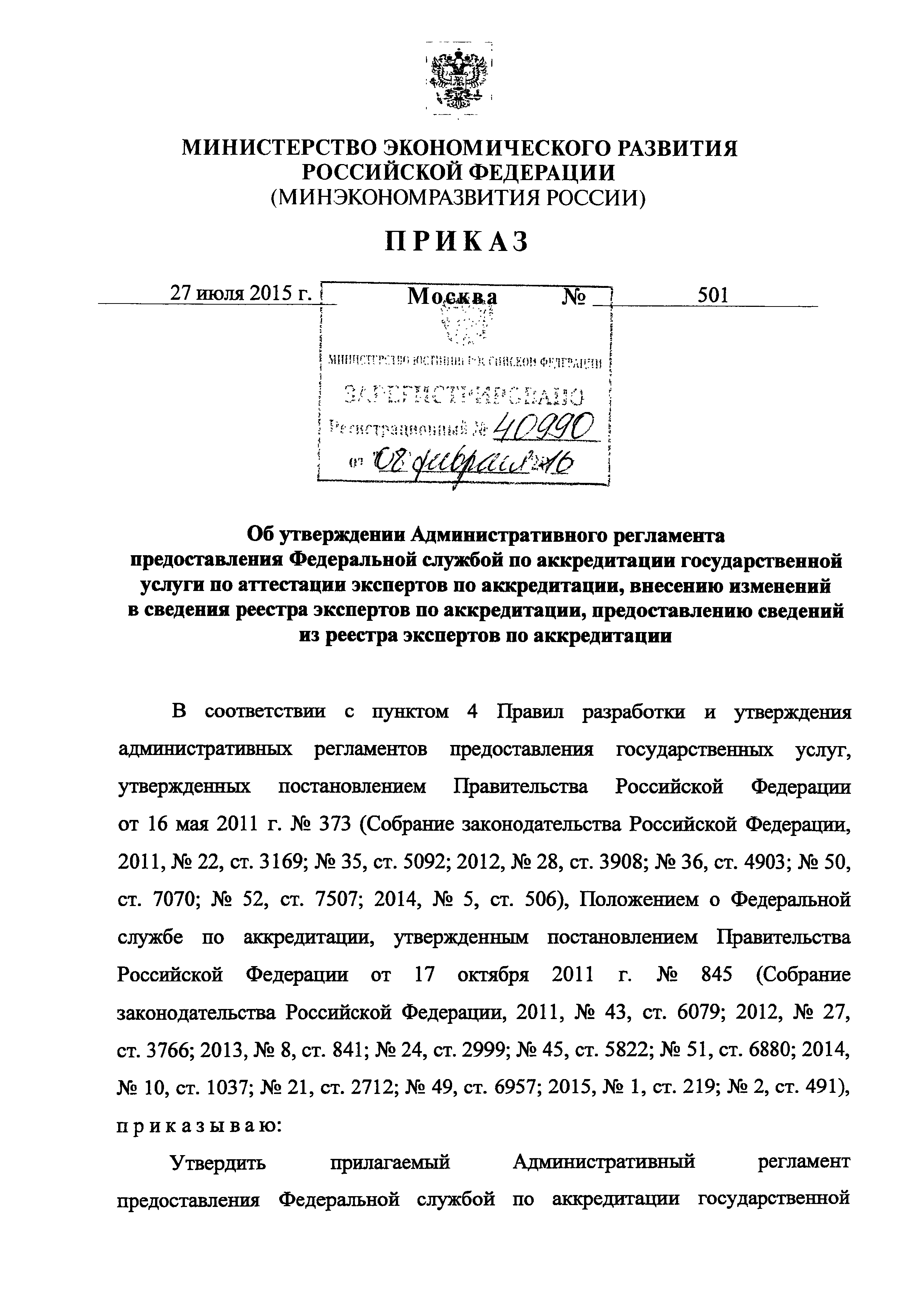 | | Нормативные ссылки: |   Федеральный закон 63-ФЗ «Об электронной подписи» Постановление 373 «О разработке и утверждении административных регламентов осуществления государственного контроля (надзора) и административных регламентов предоставления государственных услуг»  Федеральный закон 210-ФЗ «Об организации предоставления государственных и муниципальных услуг» Постановление 845 «О Федеральной службе по аккредитации»  Федеральный закон 412-ФЗ «Об аккредитации в национальной системе аккредитации»  «Методика отбора экспертов по аккредитации для выполнения работ в области аккредитации» Приказ 282 «Об утверждении формы заявления о выборе экспертной организации экспертом по аккредитации» Приказ 289 «Об утверждении Требований к эксперту по аккредитации и Правил аттестации экспертов по аккредитации» «Перечень областей аттестации экспертов по аккредитации» «Правила формирования и ведения реестра аккредитованных лиц, реестра экспертов по аккредитации, реестра технических экспертов, реестра экспертных организаций и предоставления сведений из указанных реестров» Указ 86 «О единой национальной системе аккредитации» «Правила подачи и рассмотрения жалоб на решения и действия (бездействие) федеральных органов исполнительной власти и их должностных лиц, федеральных государственных служащих, должностных лиц государственных внебюджетных фондов Российской Федерации, государственных корпораций, наделенных в соответствии с федеральными законами полномочиями по предоставлению государственных услуг в установленной сфере деятельности, и их должностных лиц, организаций, предусмотренных частью 1.1 статьи 16 Федерального закона "Об организации предоставления государственных и муниципальных услуг", и их работников, а также многофункциональных центров предоставления государственных и муниципальных услуг и их работников» «Правила определения видов электронной подписи, использование которых допускается при обращении за получением государственных и муниципальных услуг»  «Положение об аттестационной комиссии Федеральной службы по аккредитации» Приказ 671 «О признании утратившим силу приказа Минэкономразвития России от 27 июля 2015 г. N 501 "Об утверждении Административного регламента предоставления Федеральной службой по аккредитации государственной услуги по аттестации экспертов по аккредитации, внесению изменений в сведения реестра экспертов по аккредитации, предоставлению сведений из реестра экспертов по аккредитации"»