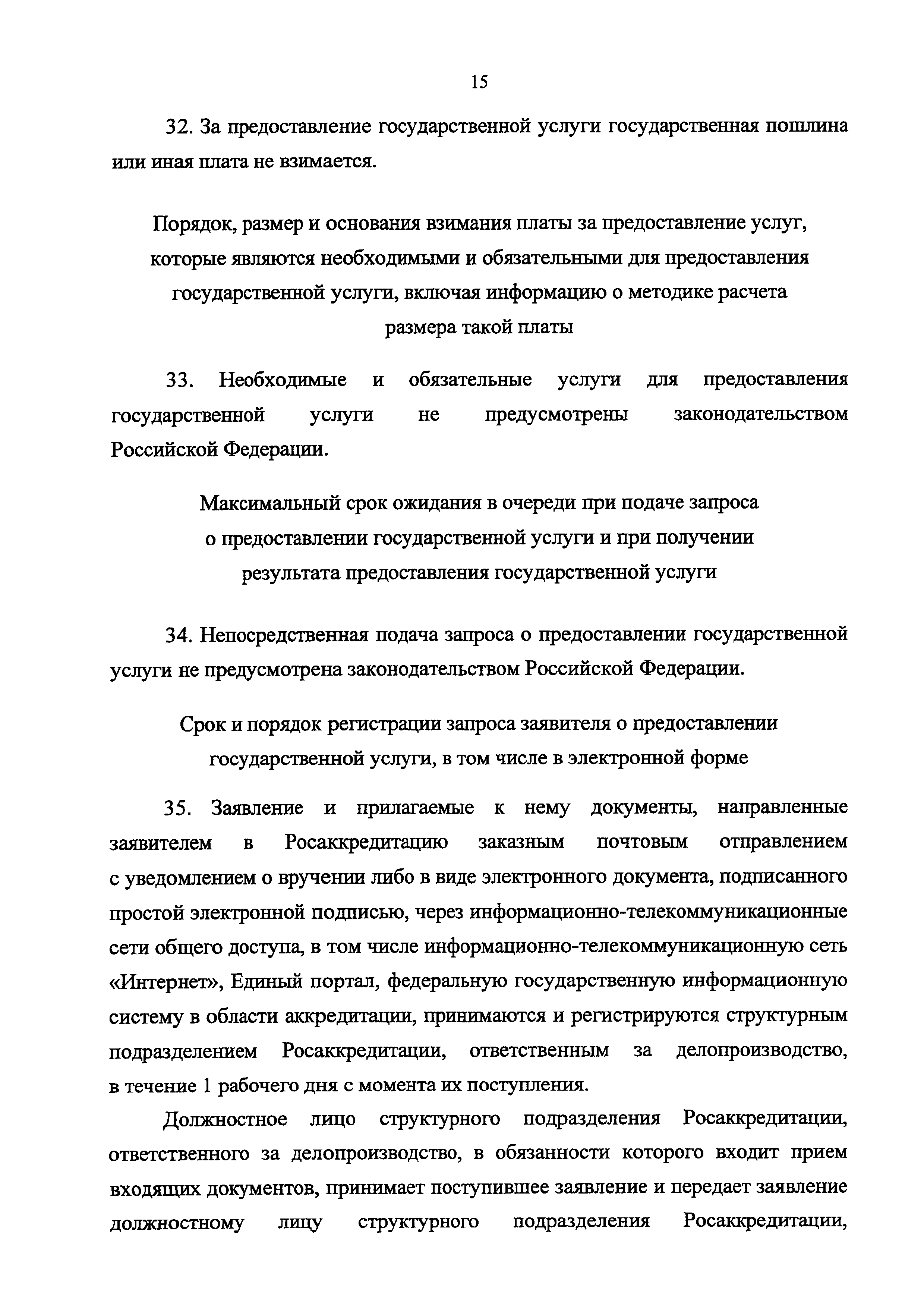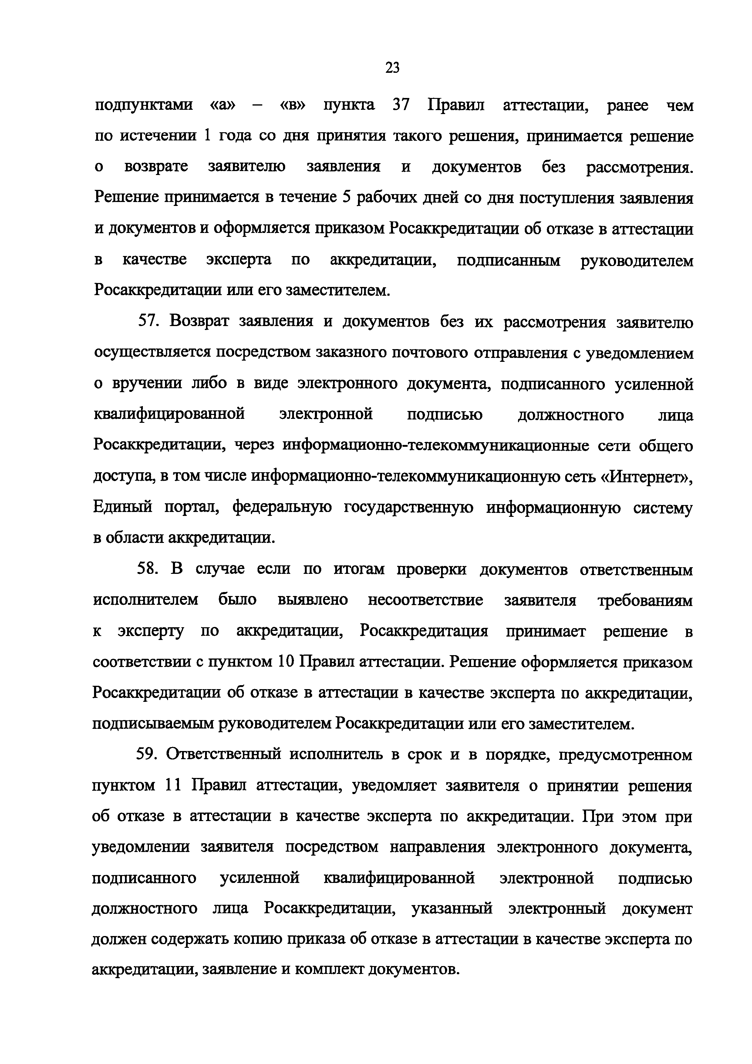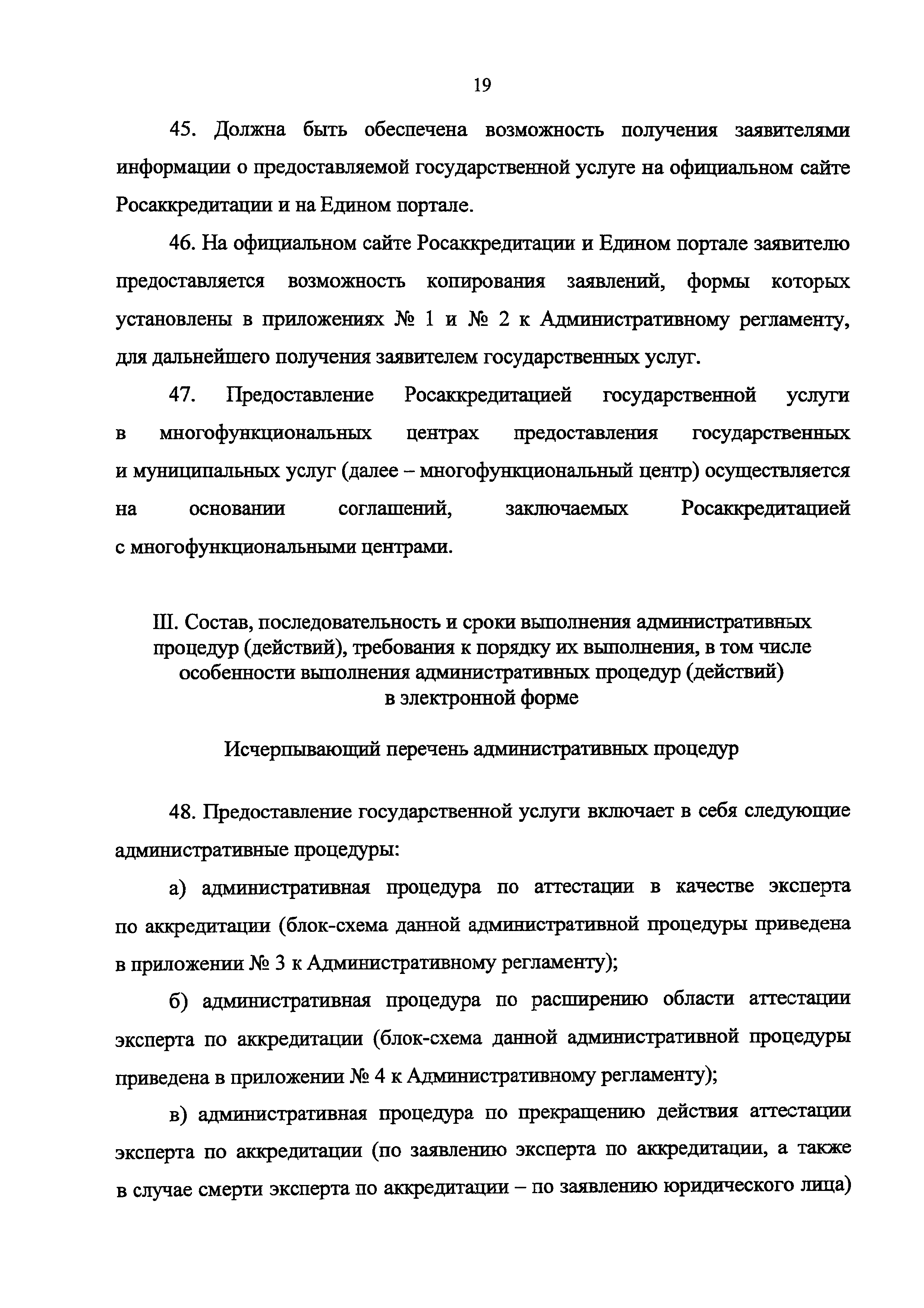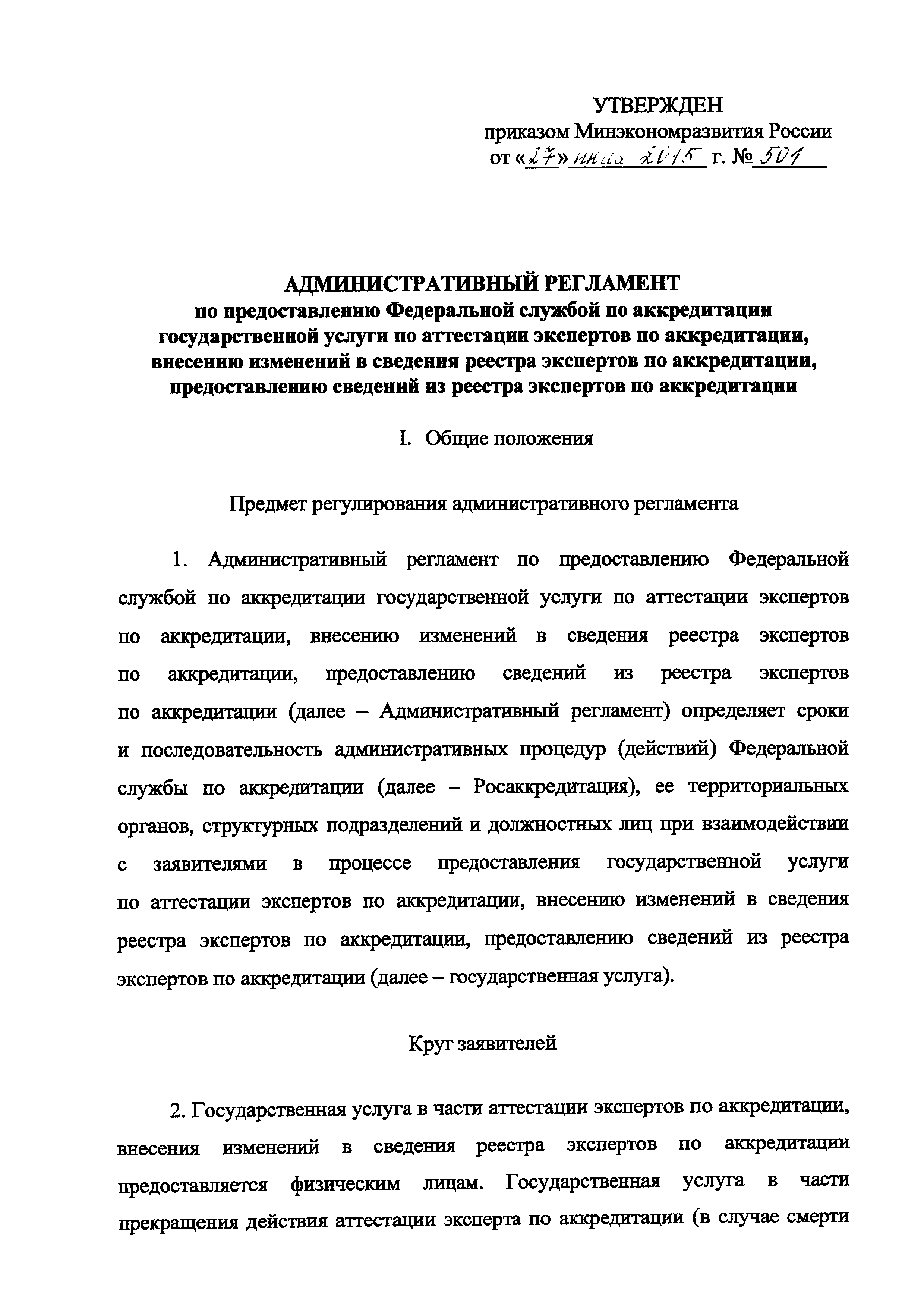 | | Нормативные ссылки: |   Федеральный закон 63-ФЗ «Об электронной подписи» Постановление 373 «О разработке и утверждении административных регламентов осуществления государственного контроля (надзора) и административных регламентов предоставления государственных услуг»  Федеральный закон 210-ФЗ «Об организации предоставления государственных и муниципальных услуг» Постановление 845 «О Федеральной службе по аккредитации»  Федеральный закон 412-ФЗ «Об аккредитации в национальной системе аккредитации»  «Методика отбора экспертов по аккредитации для выполнения работ в области аккредитации» Приказ 282 «Об утверждении формы заявления о выборе экспертной организации экспертом по аккредитации» Приказ 289 «Об утверждении Требований к эксперту по аккредитации и Правил аттестации экспертов по аккредитации» «Перечень областей аттестации экспертов по аккредитации» «Правила формирования и ведения реестра аккредитованных лиц, реестра экспертов по аккредитации, реестра технических экспертов, реестра экспертных организаций и предоставления сведений из указанных реестров» Указ 86 «О единой национальной системе аккредитации» «Правила подачи и рассмотрения жалоб на решения и действия (бездействие) федеральных органов исполнительной власти и их должностных лиц, федеральных государственных служащих, должностных лиц государственных внебюджетных фондов Российской Федерации, государственных корпораций, наделенных в соответствии с федеральными законами полномочиями по предоставлению государственных услуг в установленной сфере деятельности, и их должностных лиц, организаций, предусмотренных частью 1.1 статьи 16 Федерального закона "Об организации предоставления государственных и муниципальных услуг", и их работников, а также многофункциональных центров предоставления государственных и муниципальных услуг и их работников» «Правила определения видов электронной подписи, использование которых допускается при обращении за получением государственных и муниципальных услуг»  «Положение об аттестационной комиссии Федеральной службы по аккредитации» Приказ 671 «О признании утратившим силу приказа Минэкономразвития России от 27 июля 2015 г. N 501 "Об утверждении Административного регламента предоставления Федеральной службой по аккредитации государственной услуги по аттестации экспертов по аккредитации, внесению изменений в сведения реестра экспертов по аккредитации, предоставлению сведений из реестра экспертов по аккредитации"»