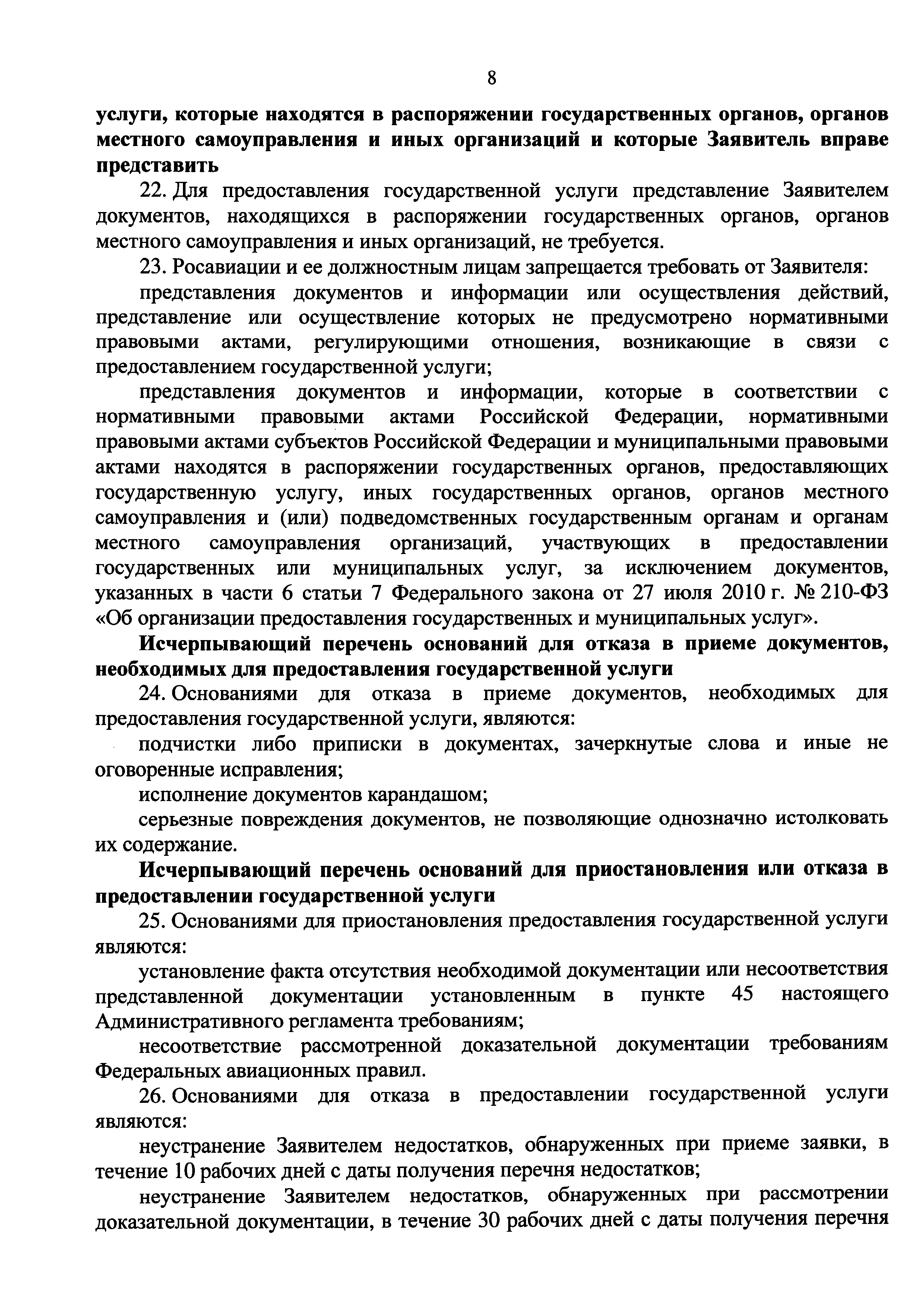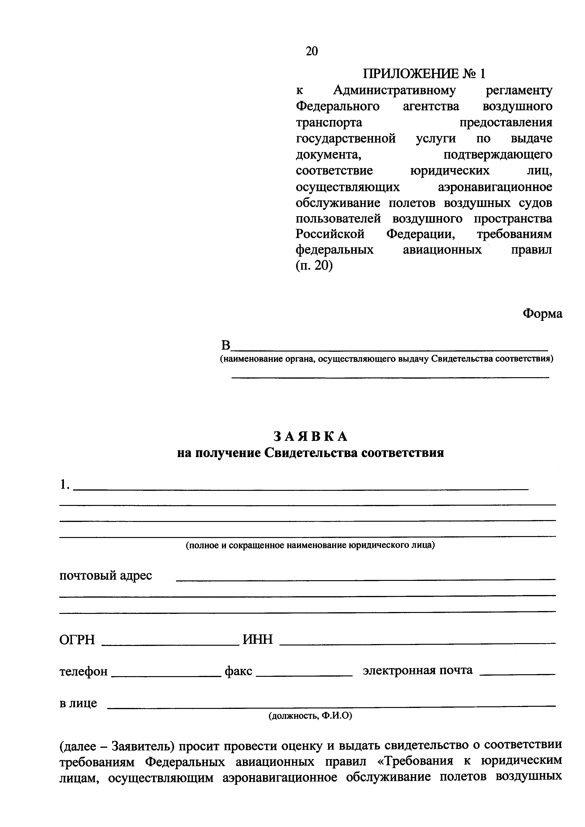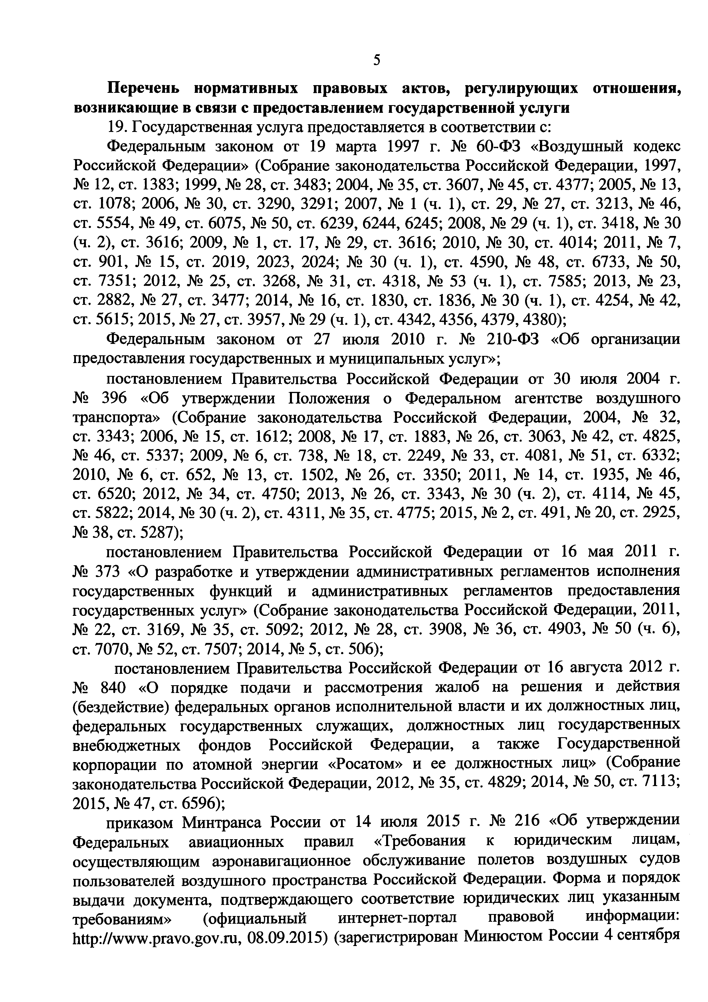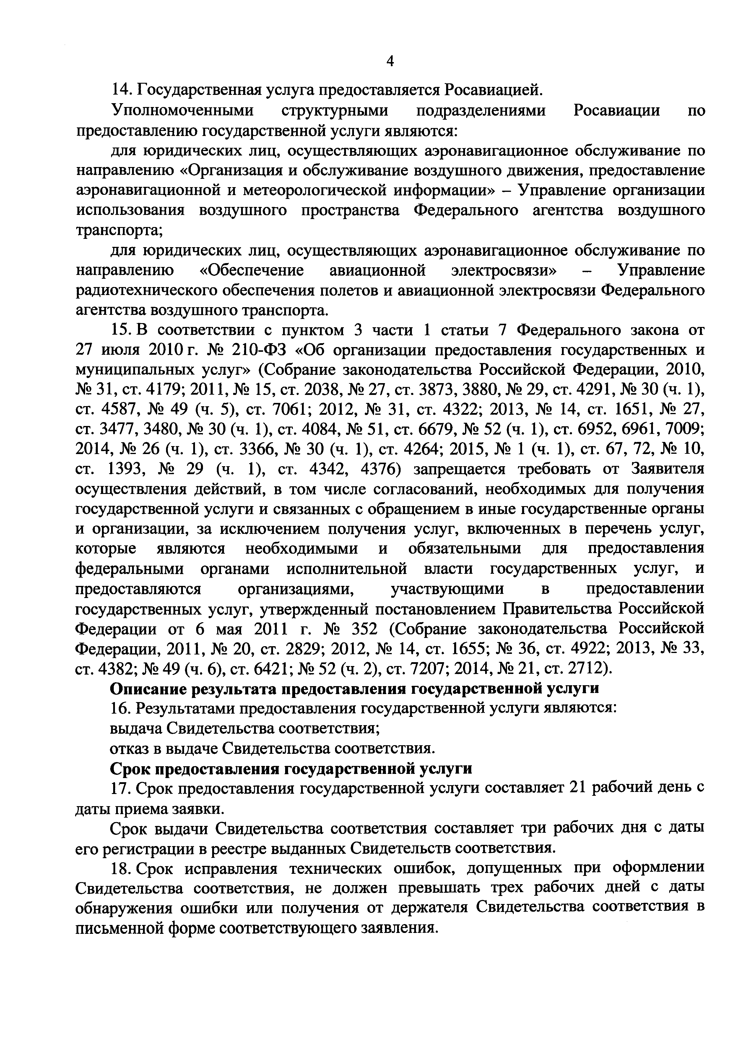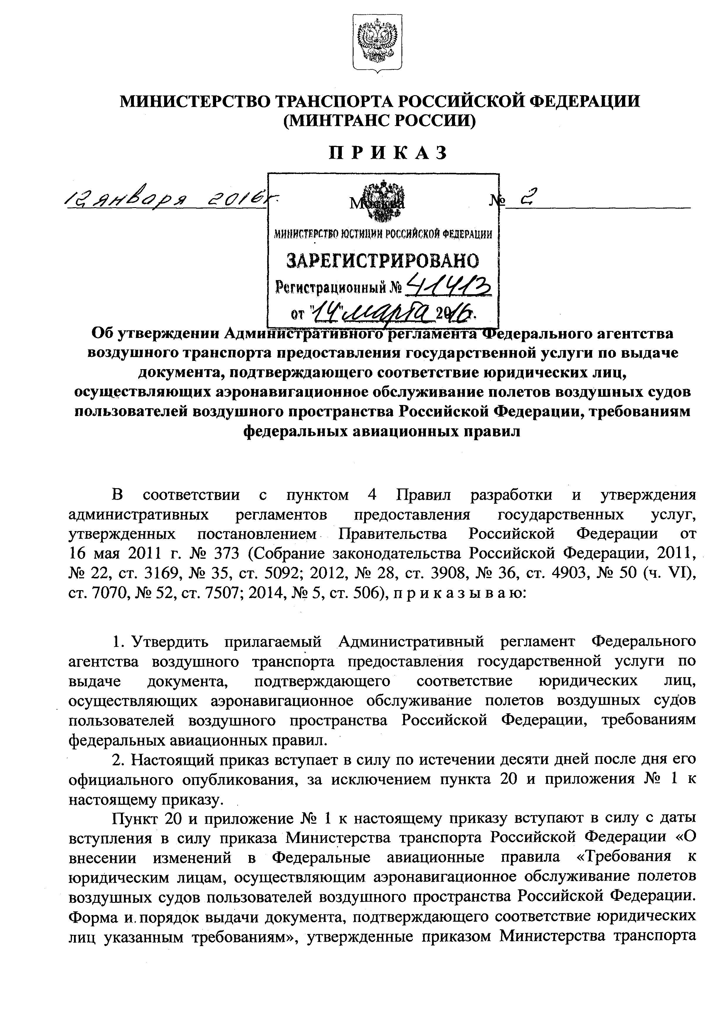 | Название рус.: | Административный регламент Федерального агентства воздушного транспорта предоставления государственной услуги по выдаче документа, подтверждающего соответствие юридических лиц, осуществляющих аэронавигационное обслуживание полетов воздушных судов пользователей воздушного пространства Российской Федерации, требованиям федеральных авиационных правил |