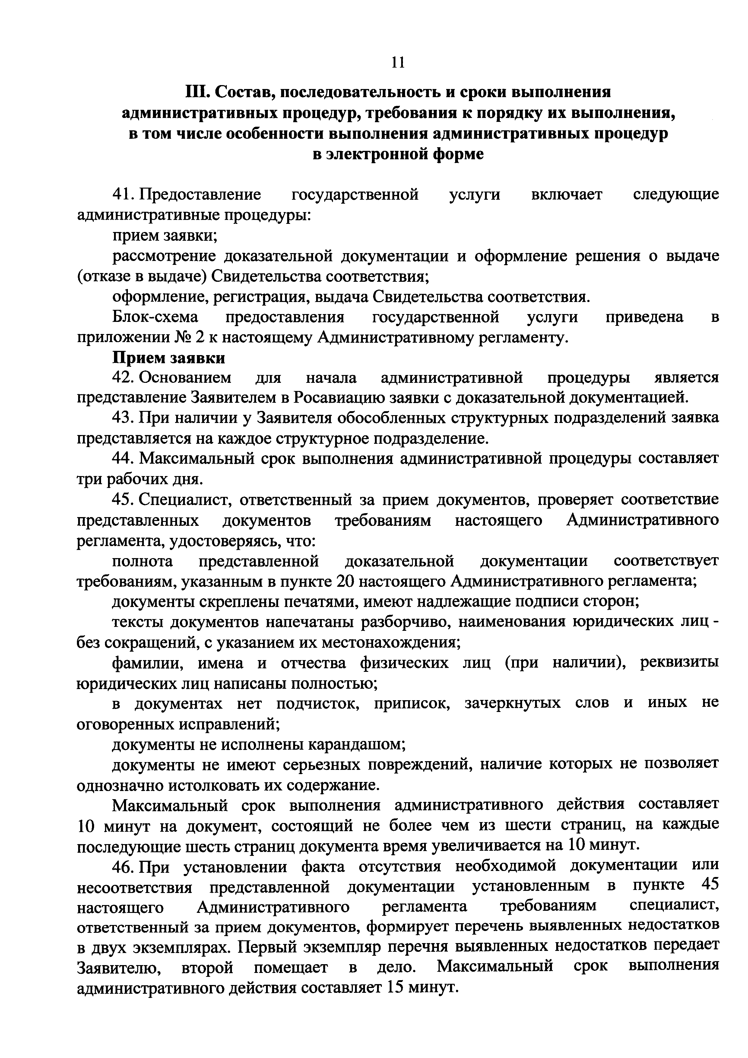 | Оглавление: | I. Общие положения II. Стандарт предоставления государственной услуги III. Состав, последовательность и сроки выполнения административных процедур, требования к порядку их выполнения, в том числе особенности выполнения административных процедур в электронной форме IV. Формы контроля за исполнением настоящего Административного регламента Приложение № 1. Заявка на получение Свидетельства соответствия Приложение № 2. Блок-схема предоставления государственной услуги |