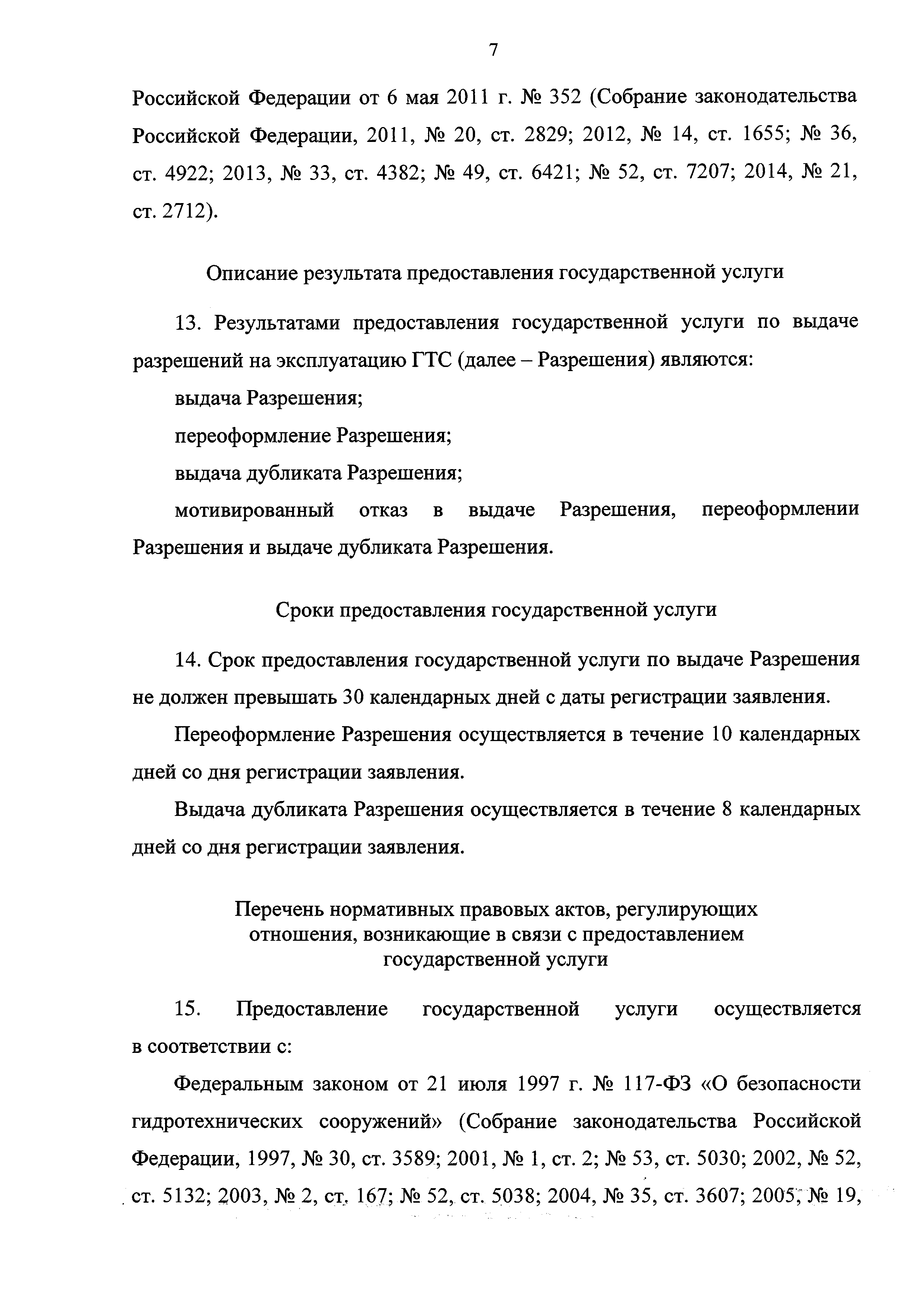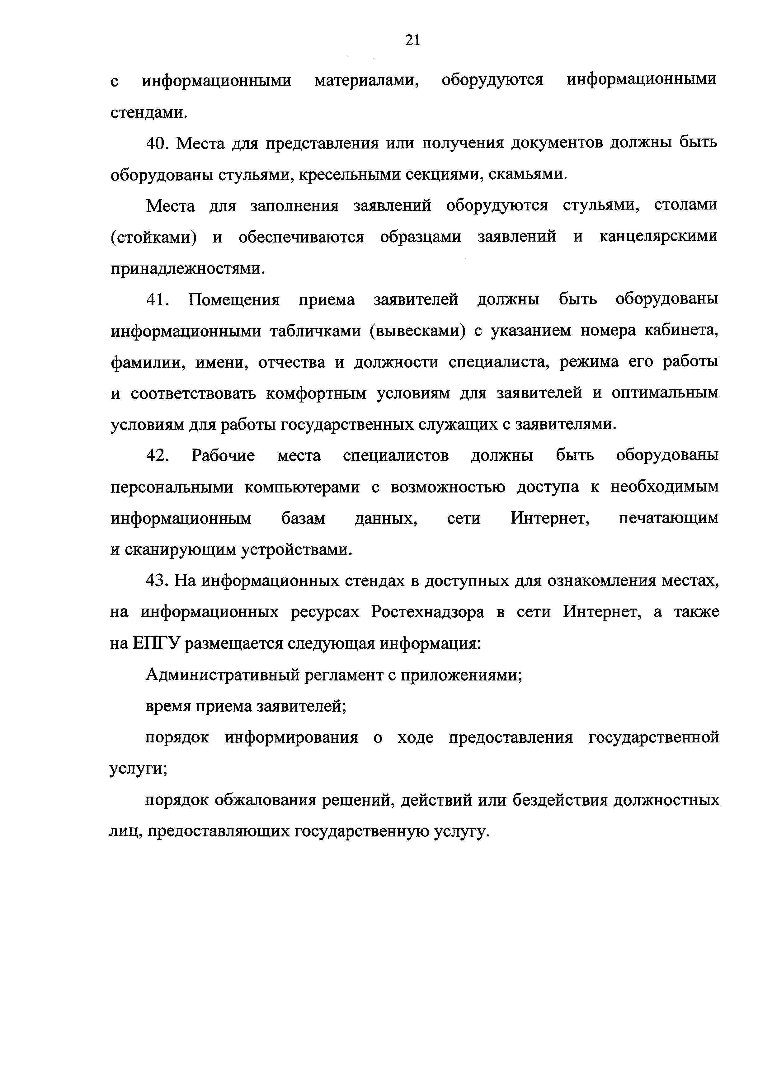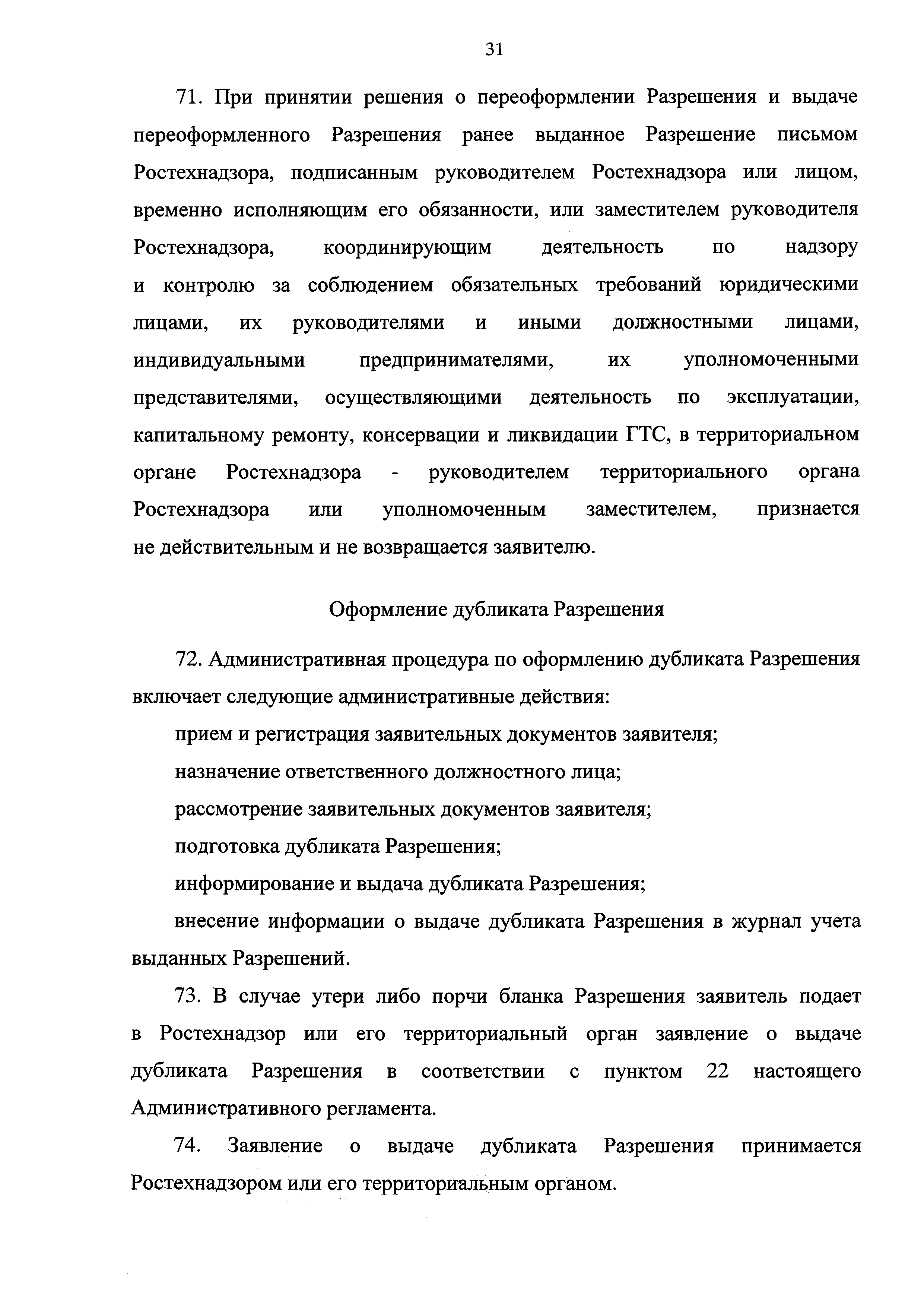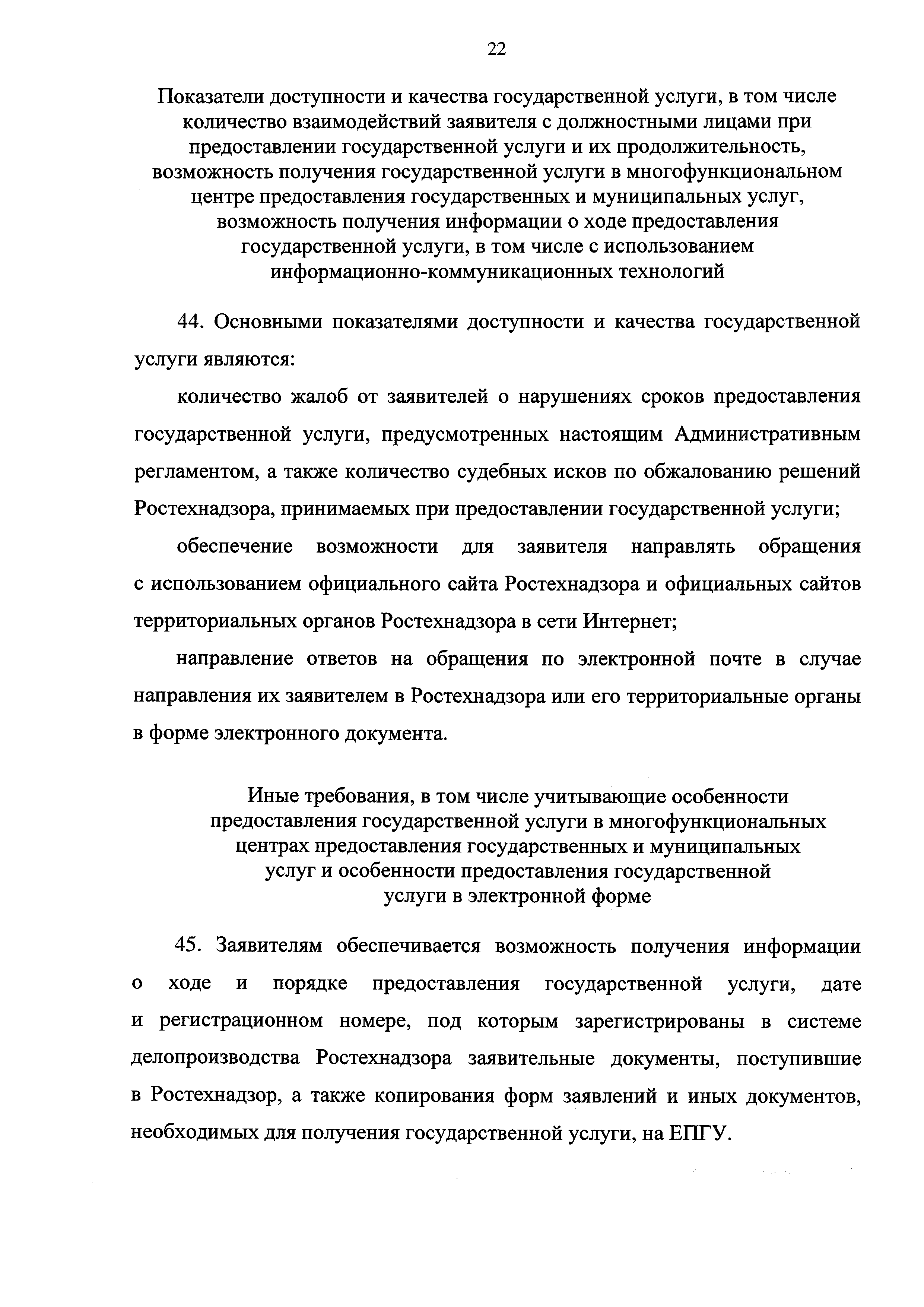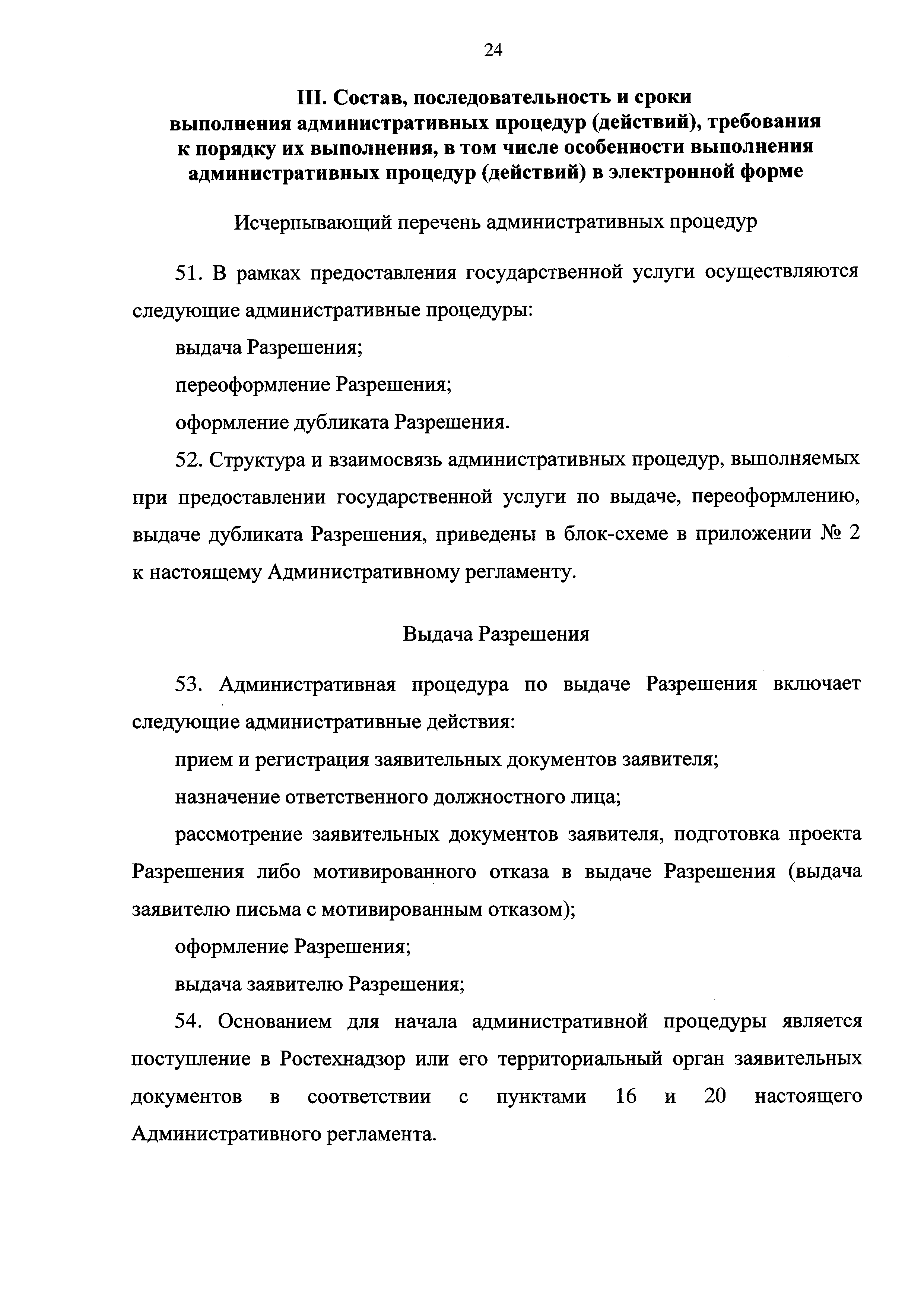 | Оглавление: | I. Общие положения II. Стандарт предоставления государственной услуги III. Состав, последовательность и сроки выполнения административных процедур (действий), требования к порядку их выполнения, в том числе особенности выполнения административных процедур (действий) в электронной форме IV. Формы контроля за предоставлением государственной услуги V. Досудебный (внесудебный) порядок обжалования решений и действий (бездействия) органа, предоставляющего государственную услугу, а также его должностных лиц Приложение № 1. Сведения о местах нахождения, контактных телефонах и адресах официальных сайтов территориальных органов Ростехнадзора Приложение № 2. Блок-схемы последовательности действий при предоставления государственной услуги по выдаче (переоформлению, выдаче дубликата, аннулированию) разрешения на эксплуатацию гидротехнических сооружений Приложение № 3. Структура регистрационного номера разрешения на эксплуатацию ГТС |