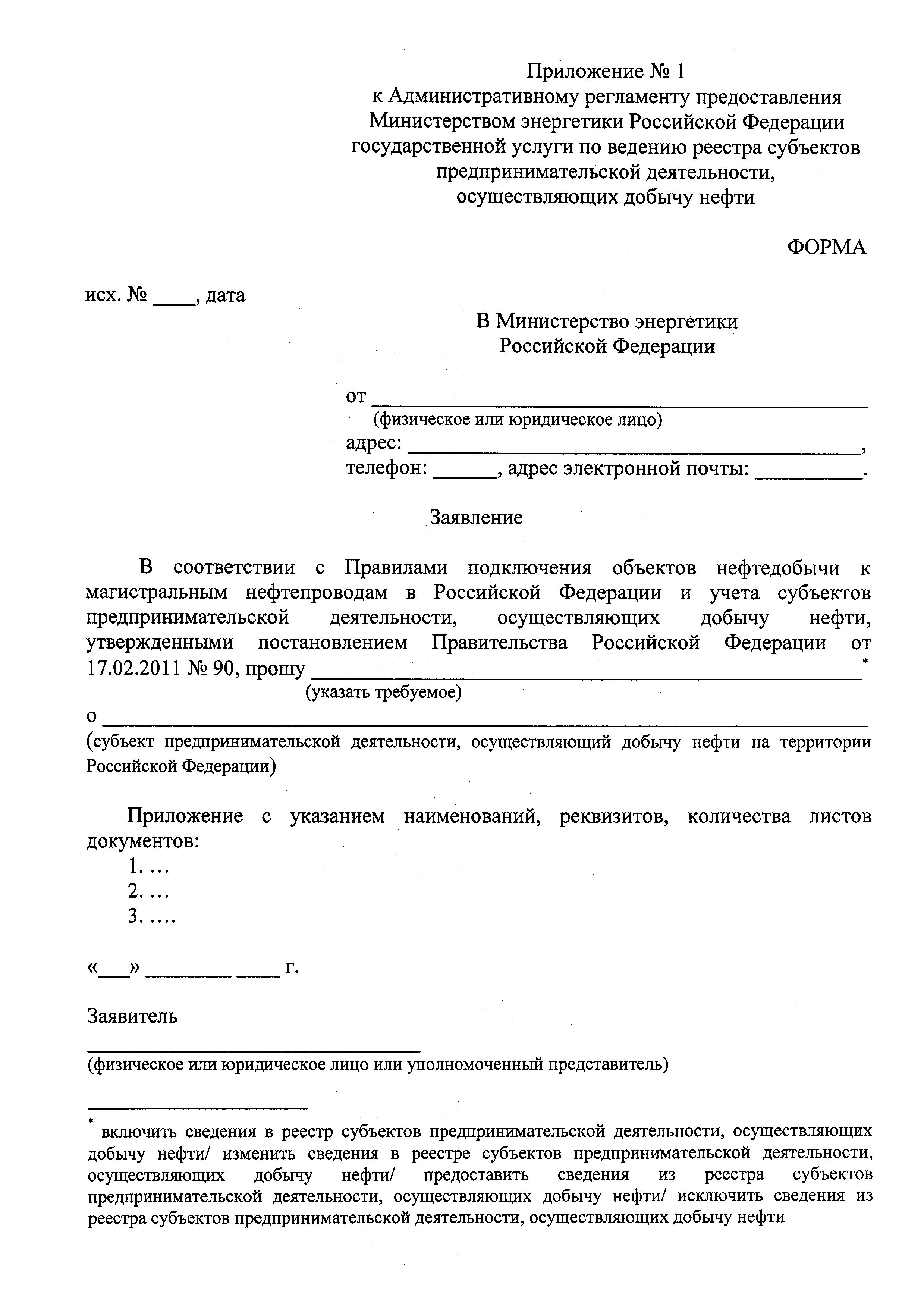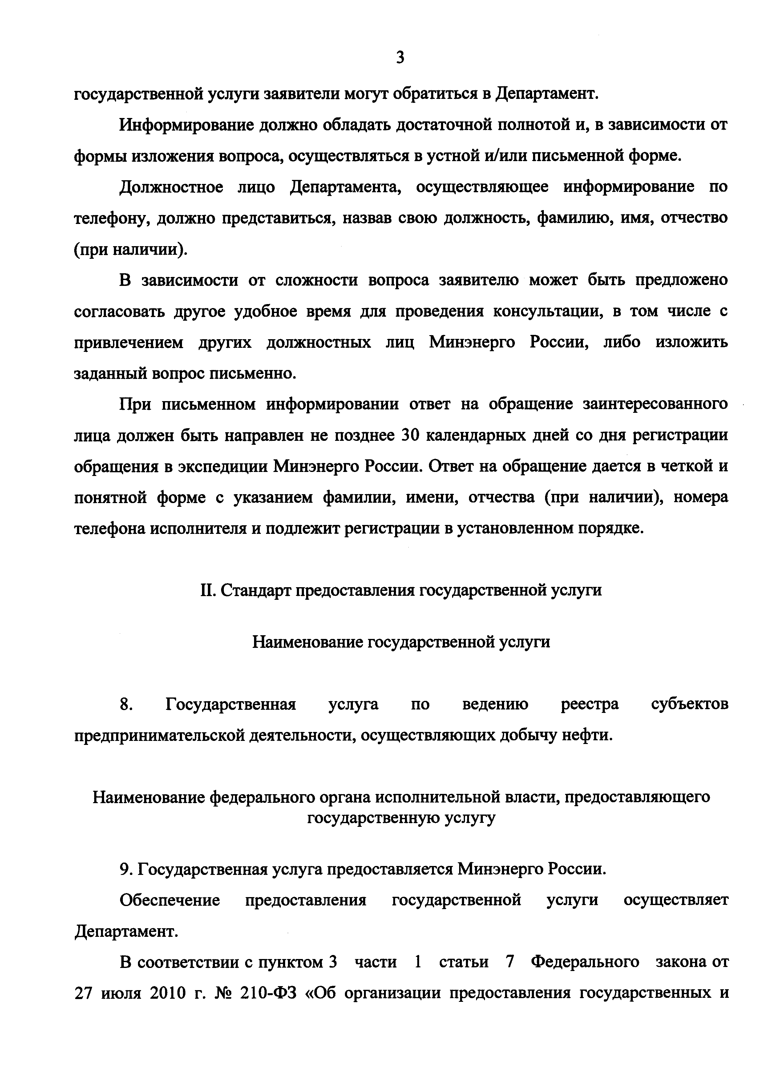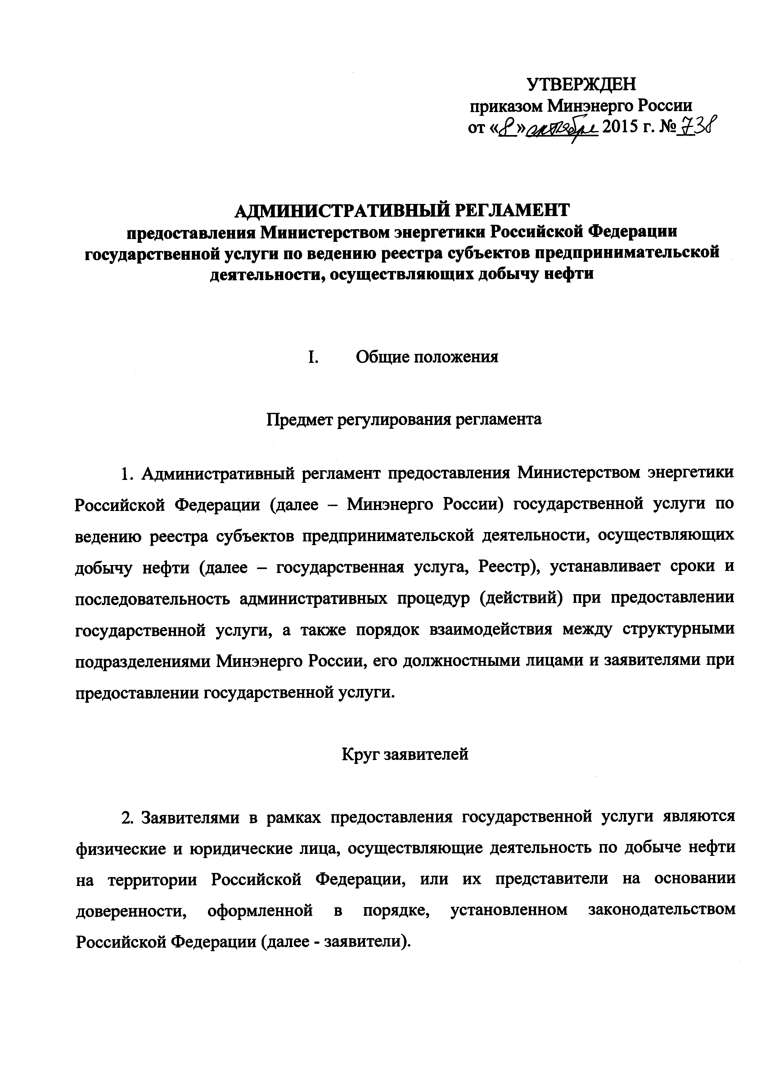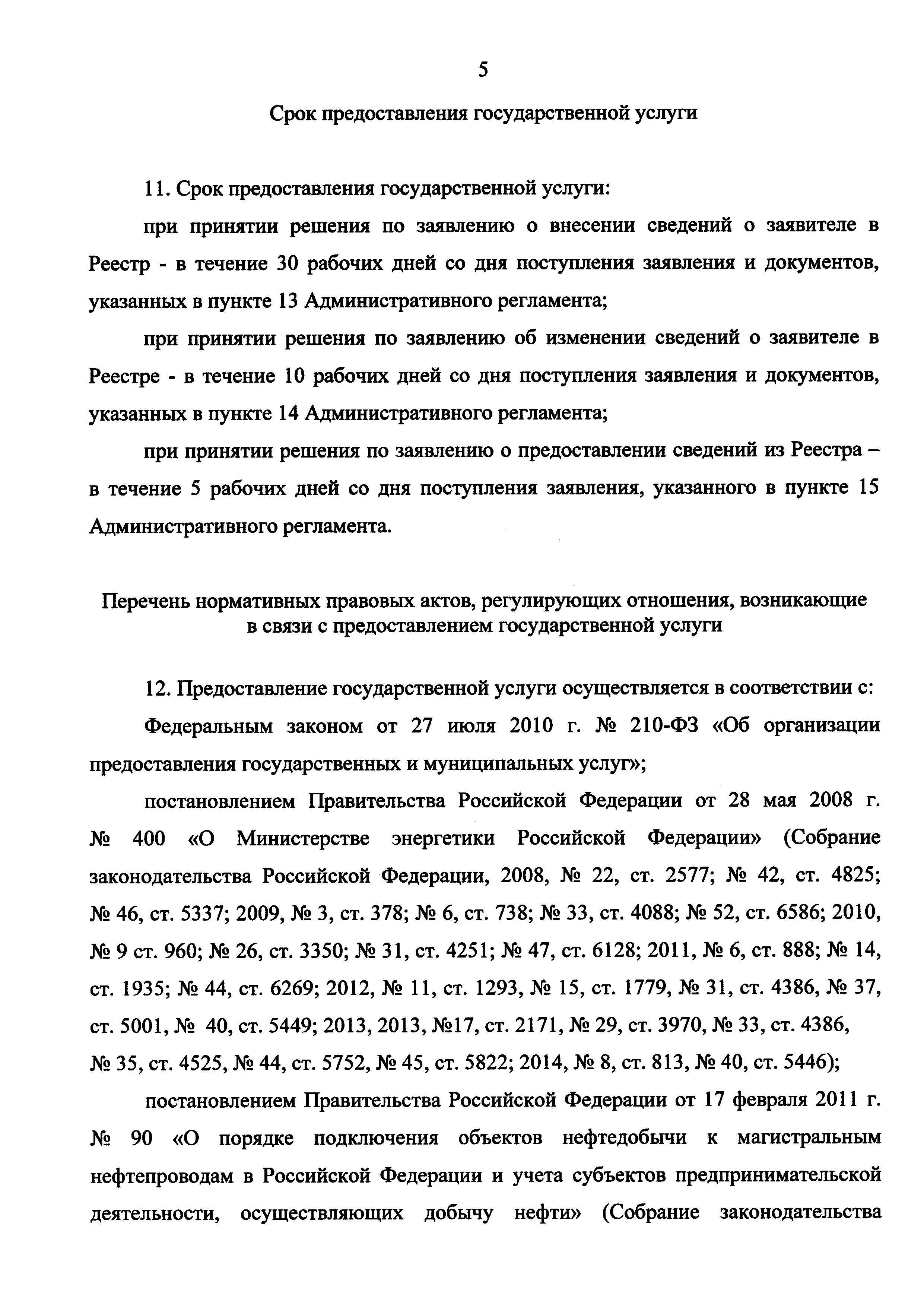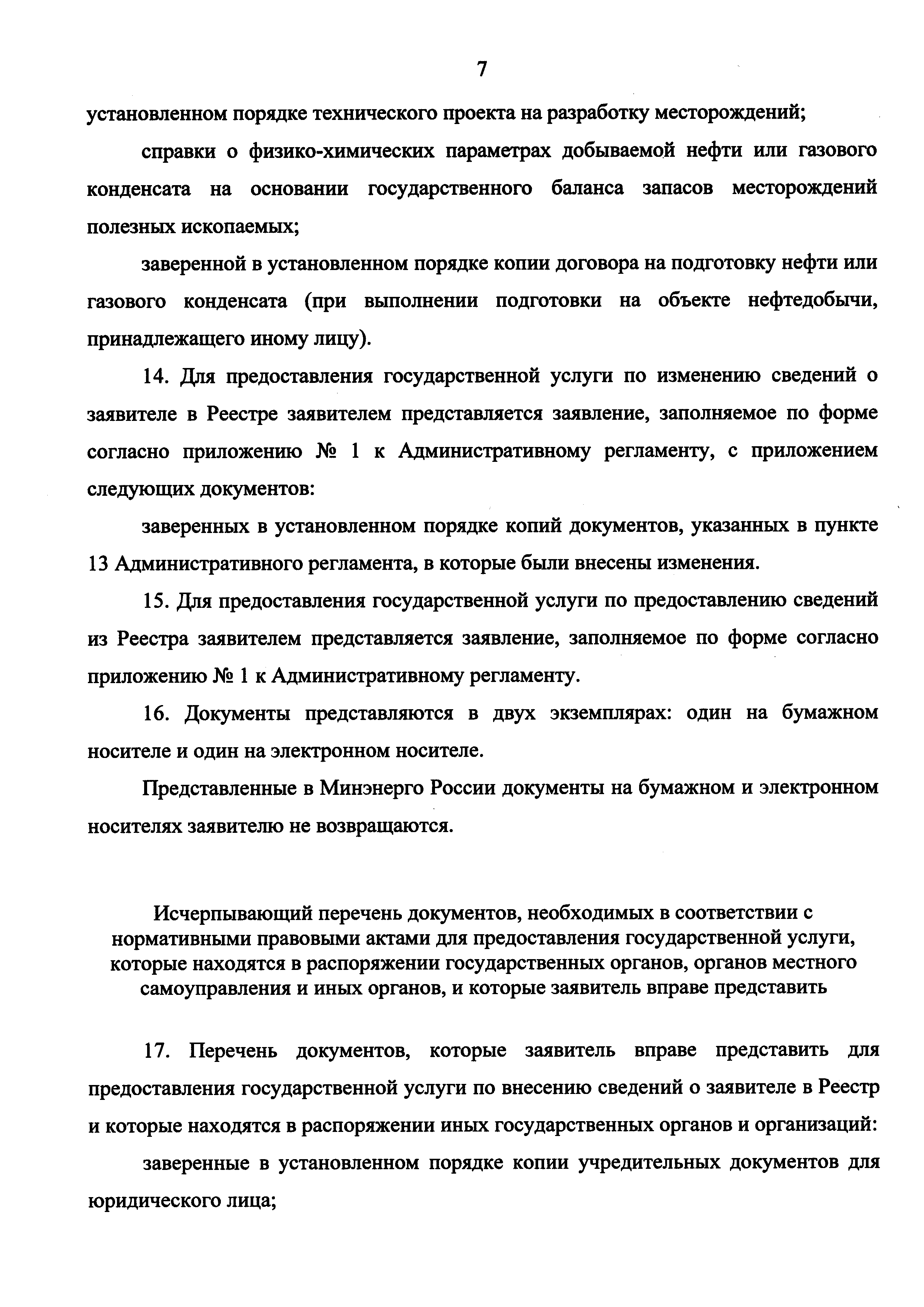 | Оглавление: | I. Общие положения II. Стандарт предоставления государственной услуги III. Состав, последовательность и сроки выполнения административных процедур (действий), требования к порядку их выполнения, в том числе особенности выполнения административных процедур (действий) в электронной форме IV. Формы контроля за предоставлением государственной услуги V. Досудебный (внесудебный) порядок обжалования решений и действий (бездействия) Минэнерго России, а также его должностных лиц Приложение № 1. Заявление Приложение № 2. Блок-схема предоставления государственной услуги по ведению реестра субъектов предпринимательской деятельности, осуществляющих добычу нефти |