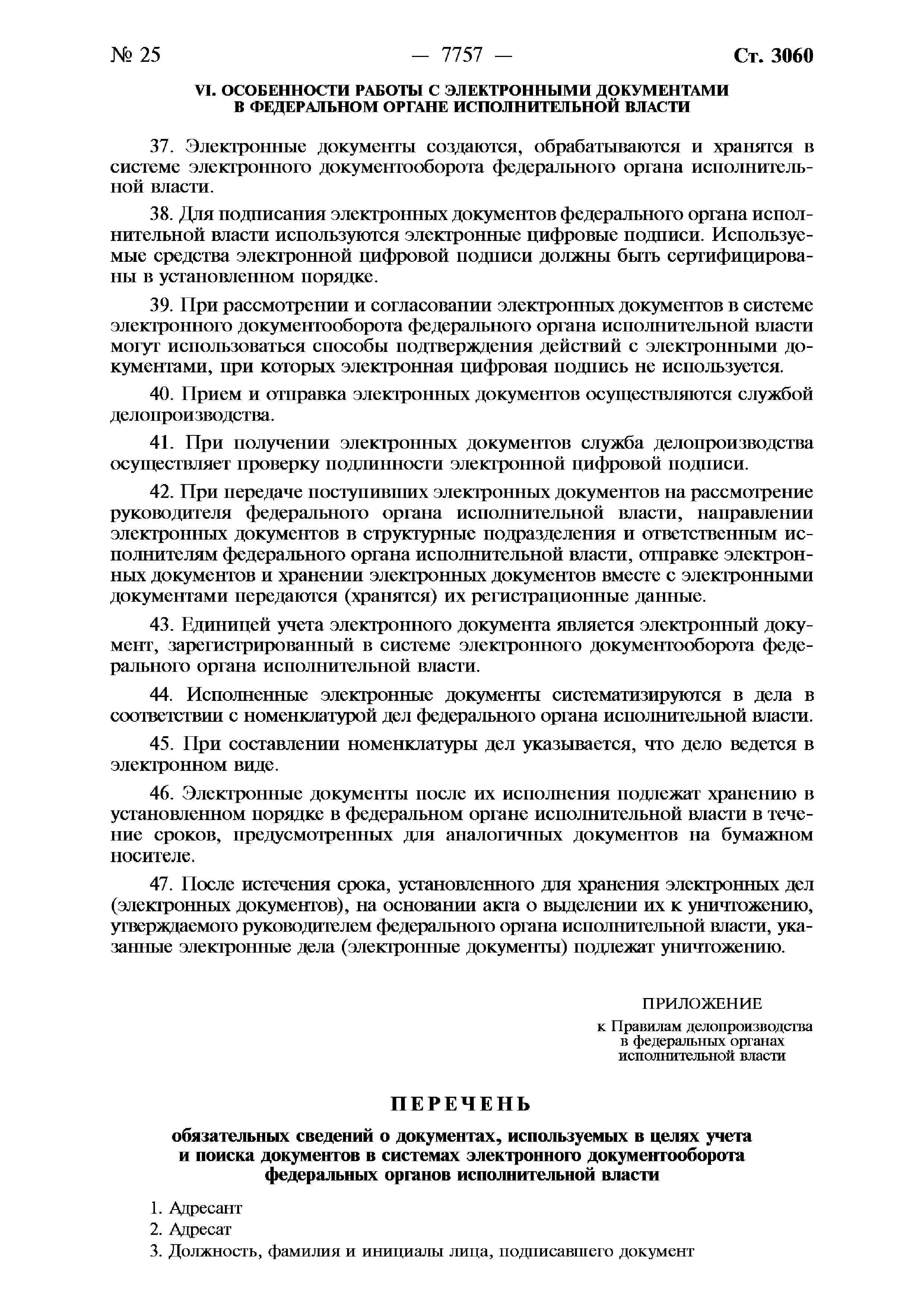 | Оглавление: | I. Общие положения II. Термины и определения III. Создание документов в федеральном органе исполнительной власти IV. Требования к организации документооборота в федеральном органе исполнительной власти V. Документальный фонд федерального органа исполнительной власти VI. Особенности работы с электронными документами в федеральном органе исполнительной власти Приложение. Перечень обязательных сведений о документах, используемых в целях учета и поиска документов в системах электронного документооборота федеральных органов исполнительной власти |