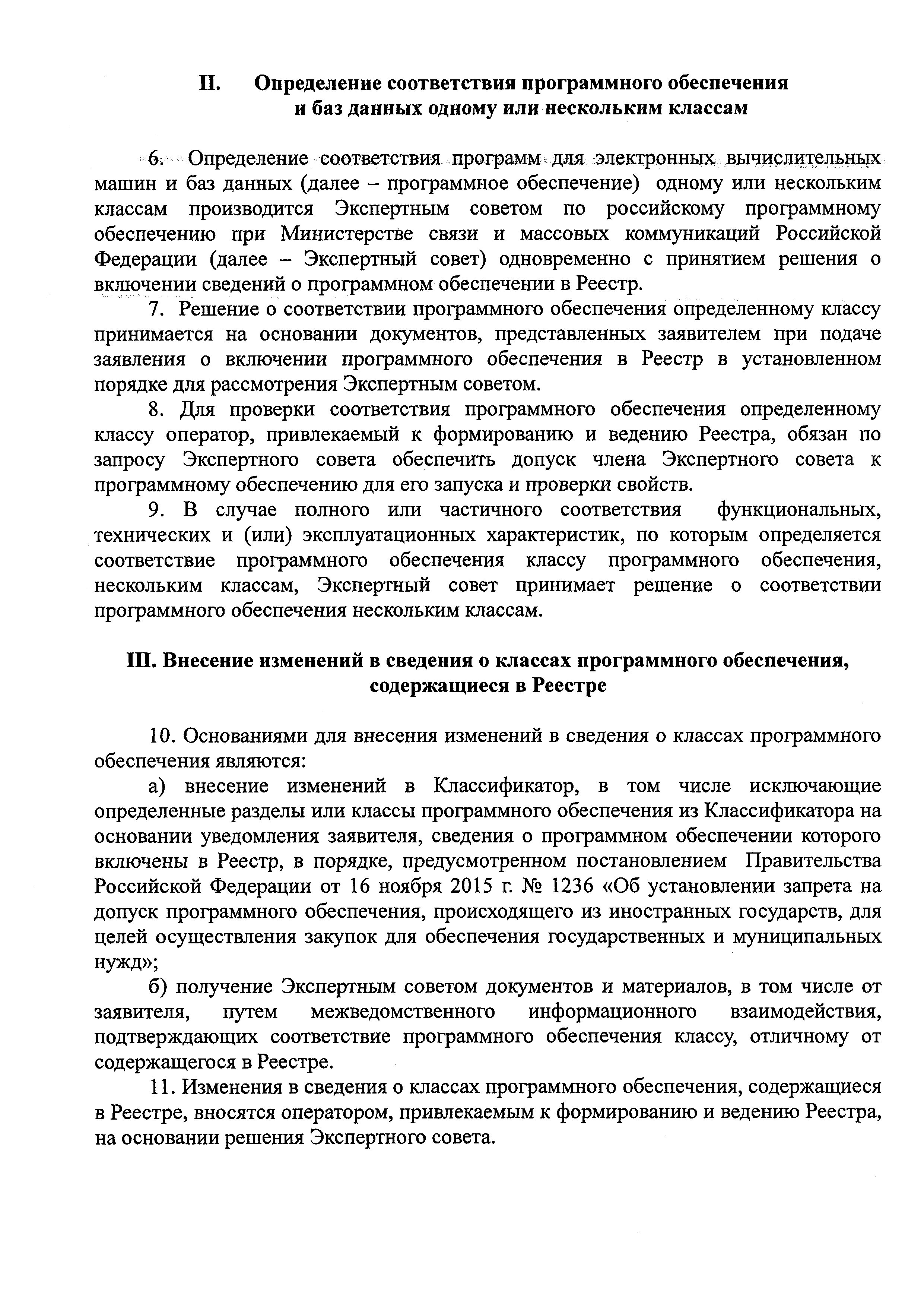 | Оглавление: | I. Общие положения II. Определение соответствия программного обеспечения и баз данных одному или нескольким классам III. Внесение изменений в сведения о классах программного обеспечения, содержащиеся в Реестре |