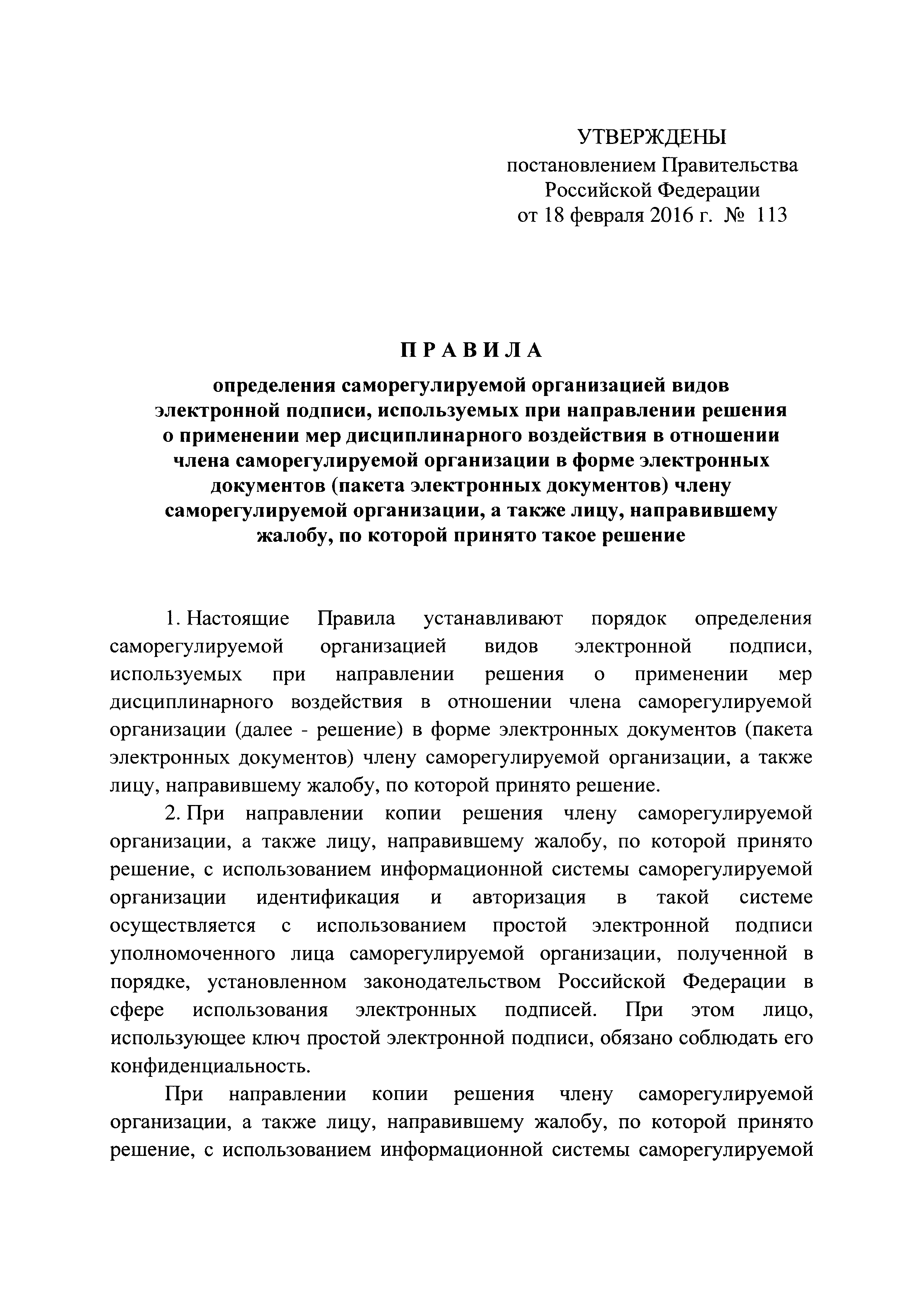 Правила определения саморегулируемой организацией видов электронной подписи, используемых при направлении решения о применении мер дисциплинарного воздействия в отношении члена саморегулируемой организации в форме электронных документов (пакета электронных документов) члену саморегулируемой организации, а также лицу, направившему жалобу, по которой принято такое решение| Статус: | действует | | Название рус.: | Правила определения саморегулируемой организацией видов электронной подписи, используемых при направлении решения о применении мер дисциплинарного воздействия в отношении члена саморегулируемой организации в форме электронных документов (пакета электронных документов) члену саморегулируемой организации, а также лицу, направившему жалобу, по которой принято такое решение | | Дата добавления в базу: | 01.02.2017 | | Дата актуализации: | 01.01.2021 | | Дата введения: | 28.02.2016 | | Дата окончания срока действия: | 31.12.2020 | | Утверждён: | 18.02.2016 Правительство Российской Федерации (113)