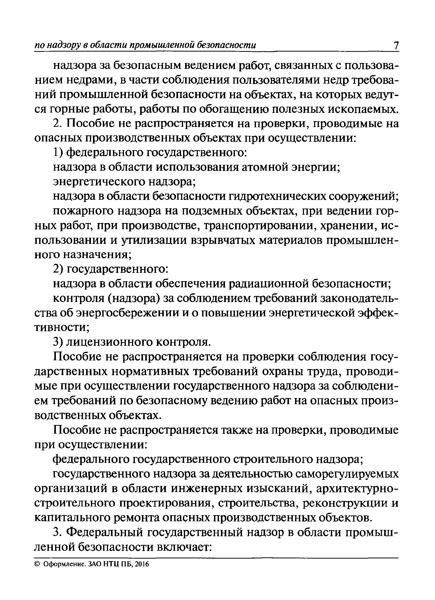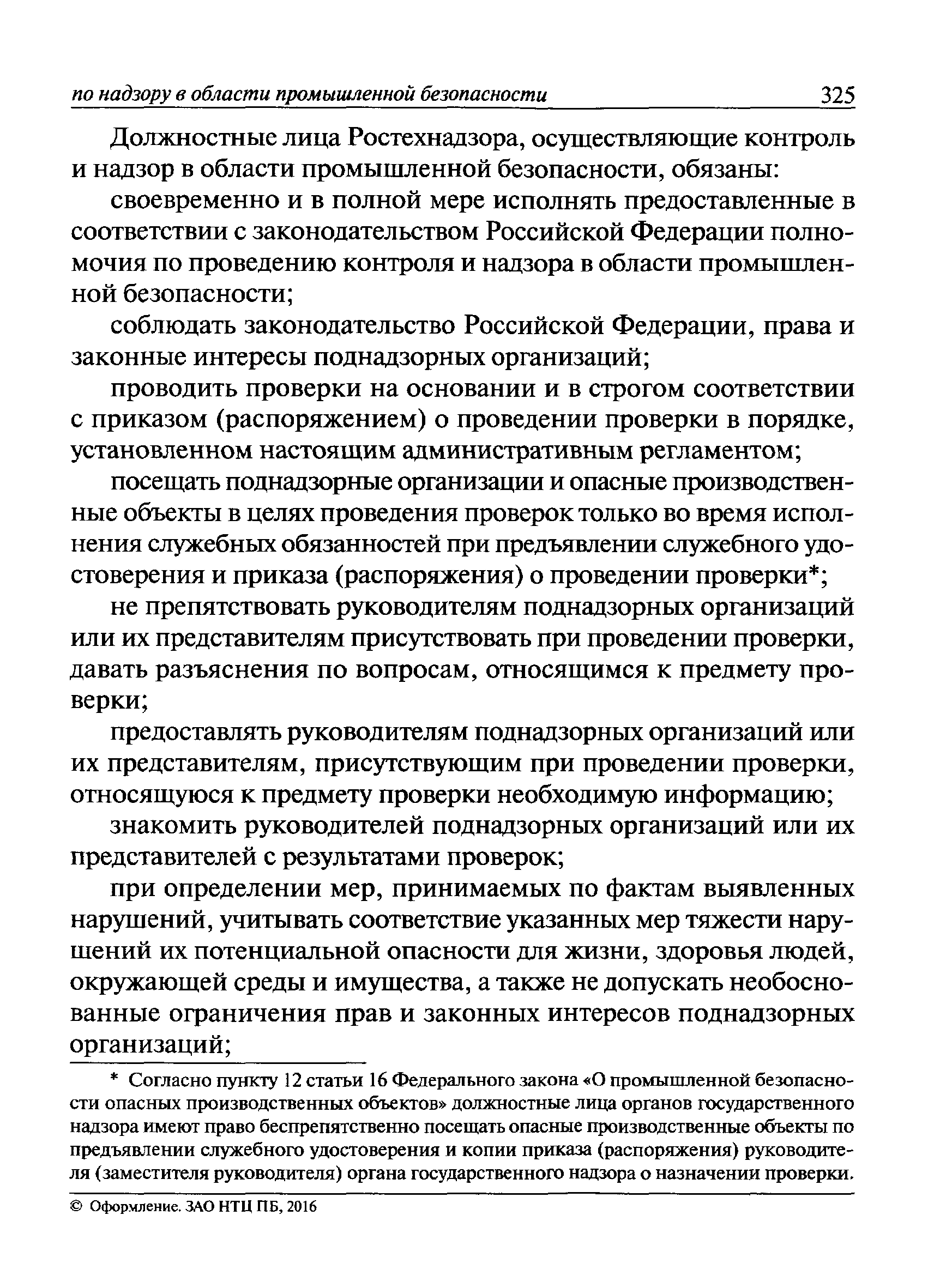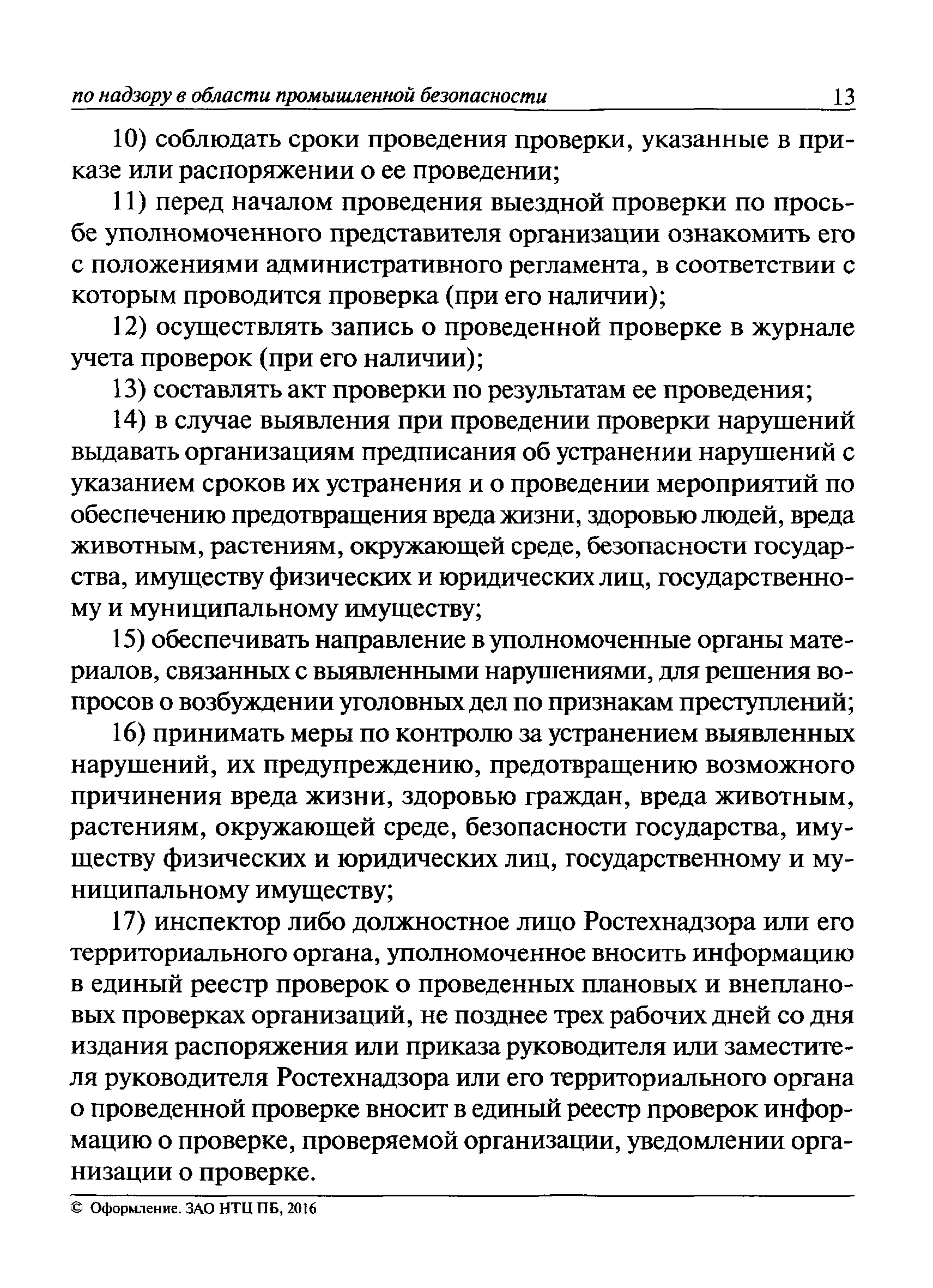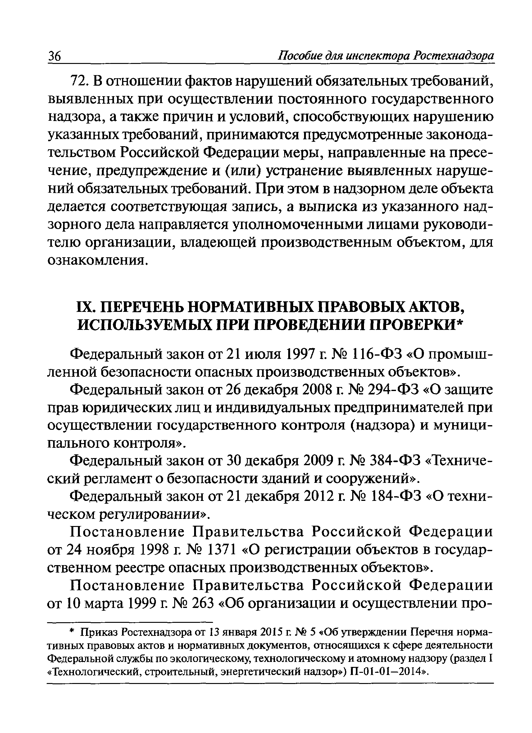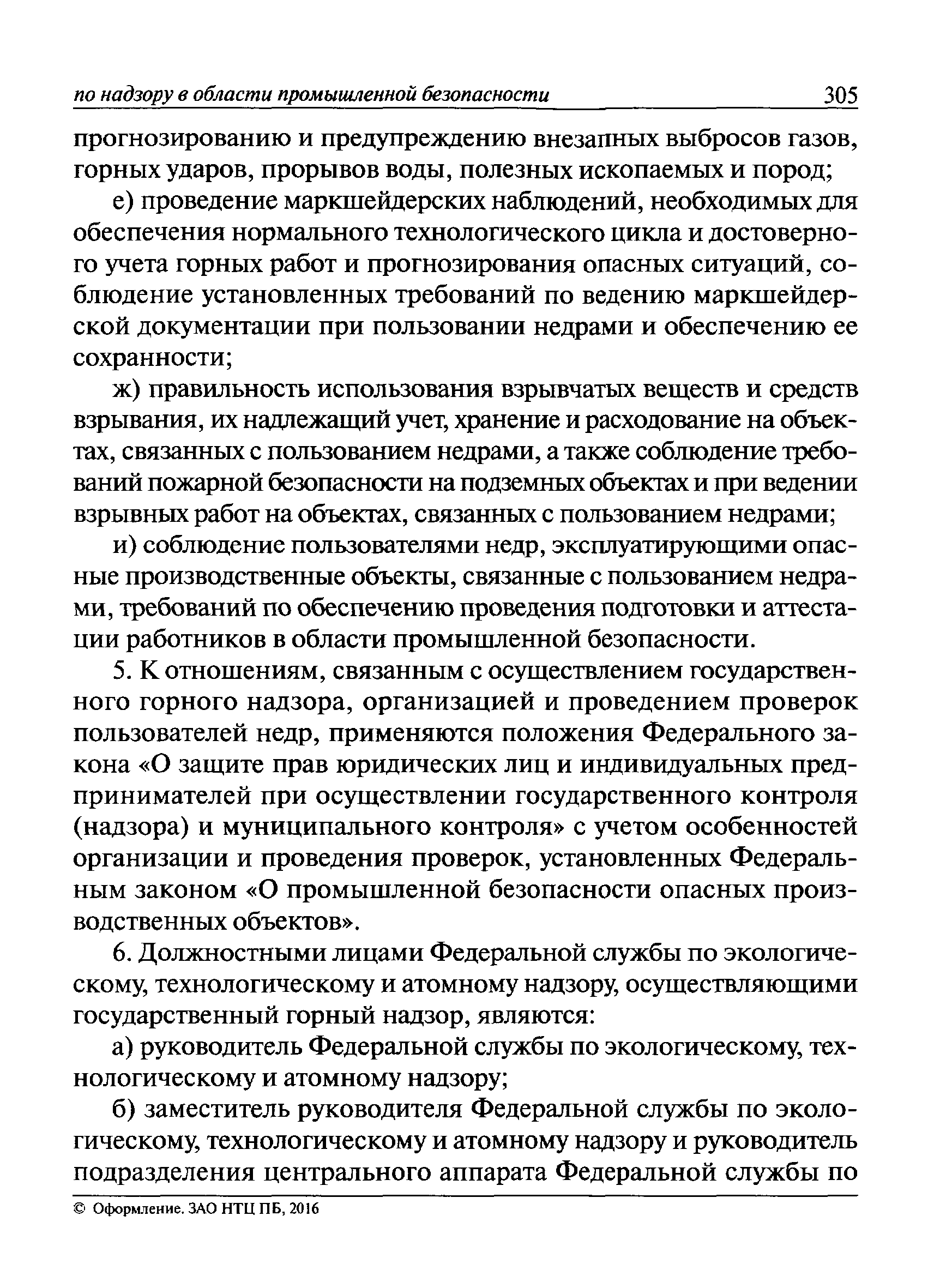 | Оглавление: | I Общие положения II Подготовка к проведению плановой проверки III Проведение плановой проверки IV Проведение документарной проверки V Особенности проведения внеплановой проверки VI Оформление результатов проверки VII Контроль исполнения выданного предписания VIII Особенности проведения проверок в режиме постоянного государственного надзора на опасных производственных объектах 1 класса опасности IХ Перечень нормативных правовых актов, используемых при проведении проверки Приложение 1. Распоряжение (приказ) Приложение 2. Акт проверки территориальным органом Ростехнадзора юридического лица, индивидуального предпринимателя Приложение 3. Предписание Законодательные и иные нормативные правовые акты к Пособию для инспектора Ростехнадзора по надзору в области промышленной безопасности Федеральный закон от 21 июля 1997 г. № 116-ФЗ "О промышленной безопасности опасных производственных объектов" Закон Российской Федерации от 21 февраля 1992 г. № 2395-1 "О недрах" (извлечения) Федеральный закон от 26 декабря 2008 г. № 294-ФЗ "О защите прав юридических лиц и индивидуальных предпринимателей при осуществлении государственного контроля (надзора) и муниципального контроля" (извлечения) Федеральный закон от 27 декабря 2002 г. № 184-ФЗ "О техническом регулировании" (извлечения) Кодекс Российской Федерации об административных правонарушениях от 30 декабря 2001 г. № 195-ФЗ (извлечения) Положение о Федеральной службе по экологическому, технологическому и атомному надзору, утвержденное постановлением Правительства Российской Федерации от 30 июля 2004 г. № 401 Положение о федеральном государственном надзоре в области промышленной безопасности, утвержденное постановлением Правительства Российской Федерации от 15 ноября 2012 г. № 1170 Положение о режиме постоянного государственного надзора на опасных производственных объектах и гидротехнических сооружениях, утвержденное постановлением Правительства Российской Федерации от 5 мая 2012 г. № 455 Положение о государственном надзоре за безопасным ведением работ, связанных с пользованием недрами, утвержденное постановлением Правительства Российской Федерации от 2 февраля 2010 г. № 39 Постановление Правительства Российской Федерации от 13 мая 2013 г. № 407 "0б уполномоченных органах Российской Федерации по обеспечению государственного контроля (надзора) за соблюдением требований технических регламентов Таможенного союза" Постановление Правительства Российской Федерации от 23 декабря 2014 г. № 1447 "0б уполномоченных органах Российской Федерации по обеспечению государственного контроля (надзора) за соблюдением требований технического регламента Таможенного союза "О безопасности взрывчатых веществ и изделий на их основе" Административный регламент по исполнению Федеральной службой по экологическом технологическому и атомному надзору государственной функции по осуществлению контроля и надзора за соблюдением требований промышленной безопасности при проектировании, строительстве, эксплуатации, консервации опасных веществ на опасных производственных объектах, утвержденный приказом Минприроды России от 30 октября 2008 г. № 280 |