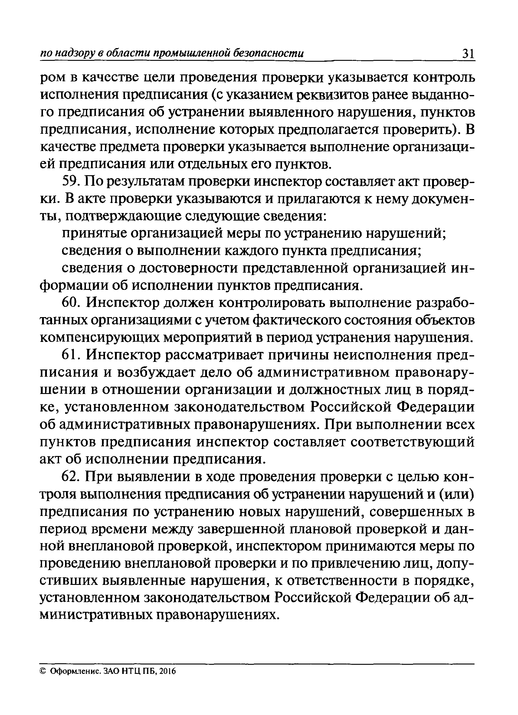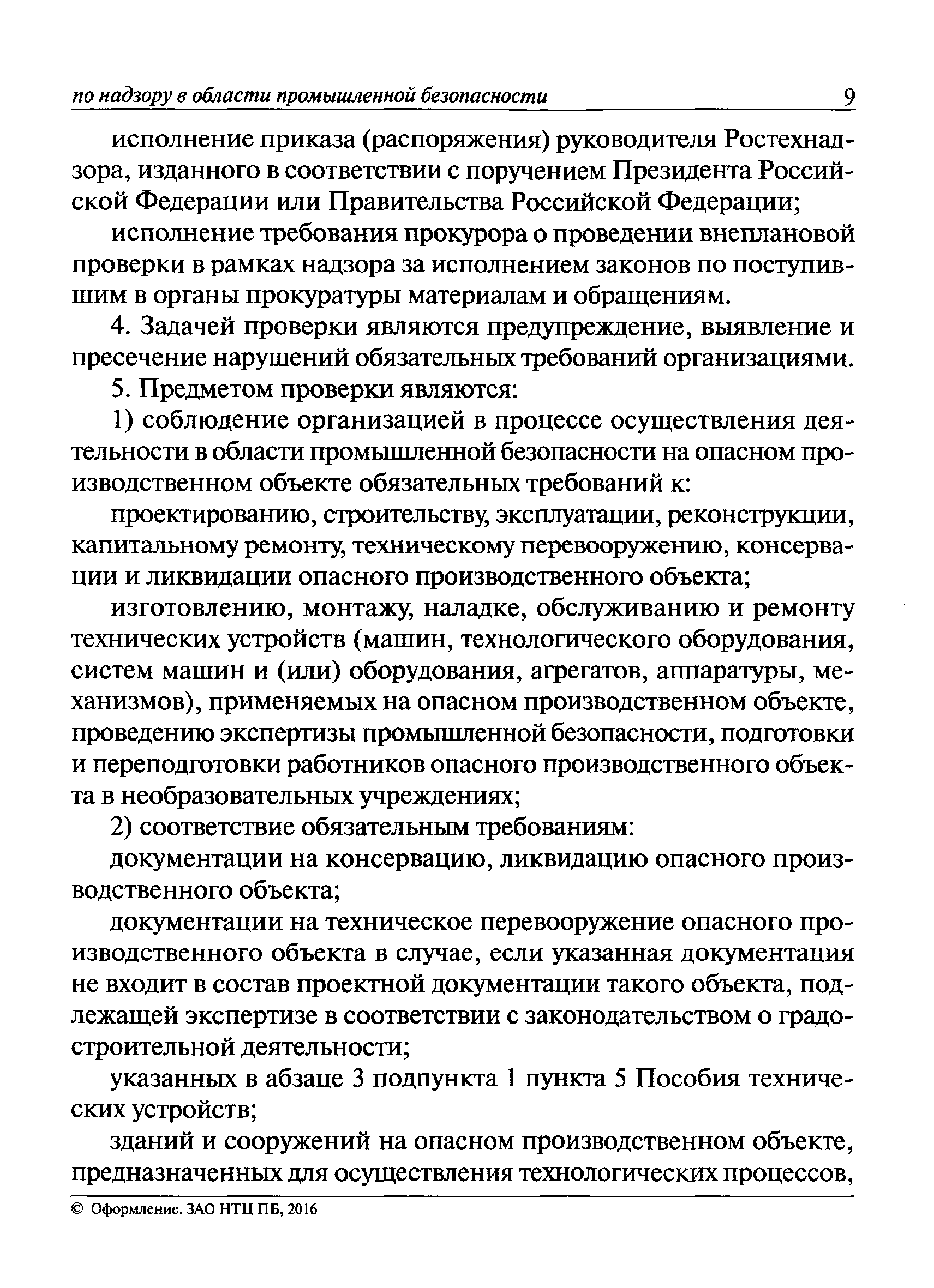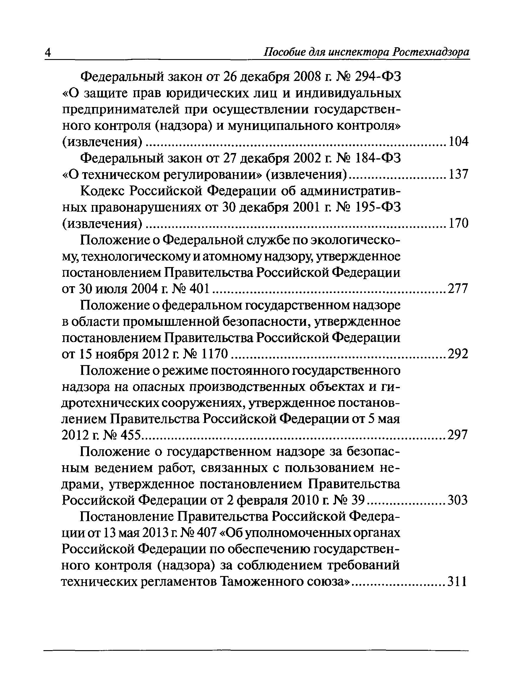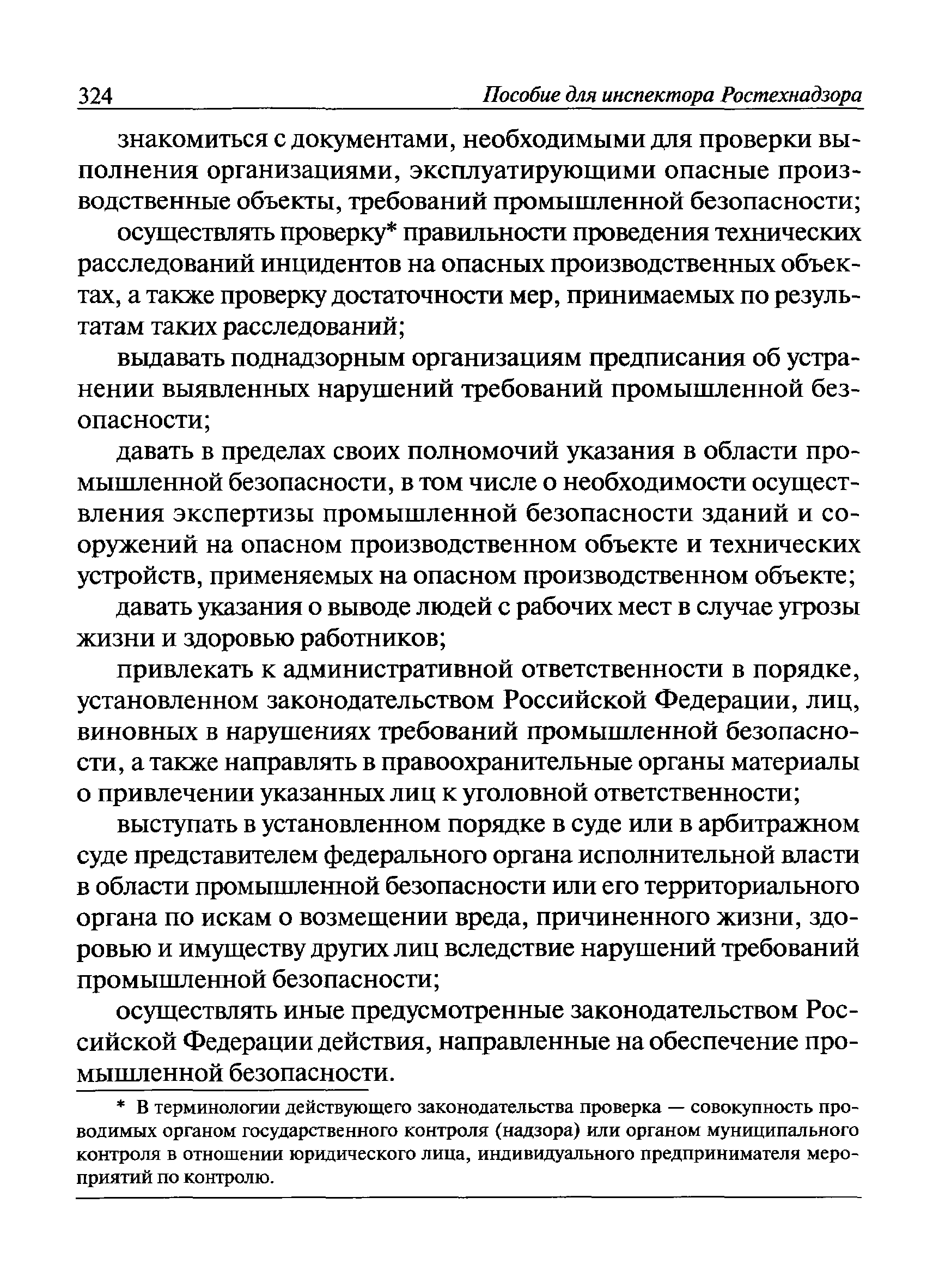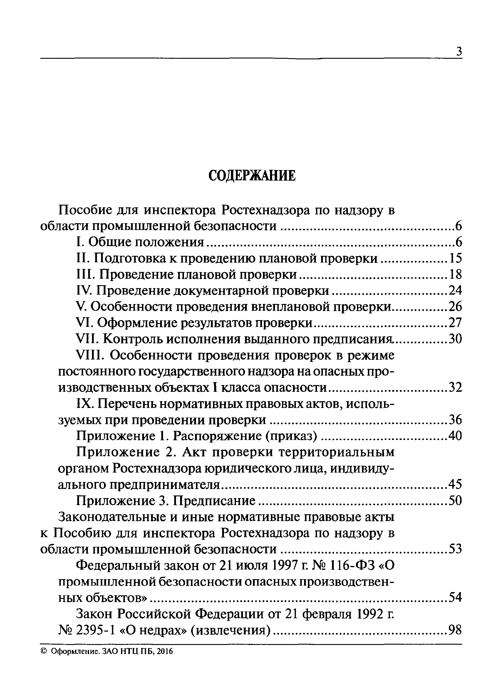 | Оглавление: | I Общие положения II Подготовка к проведению плановой проверки III Проведение плановой проверки IV Проведение документарной проверки V Особенности проведения внеплановой проверки VI Оформление результатов проверки VII Контроль исполнения выданного предписания VIII Особенности проведения проверок в режиме постоянного государственного надзора на опасных производственных объектах 1 класса опасности IХ Перечень нормативных правовых актов, используемых при проведении проверки Приложение 1. Распоряжение (приказ) Приложение 2. Акт проверки территориальным органом Ростехнадзора юридического лица, индивидуального предпринимателя Приложение 3. Предписание Законодательные и иные нормативные правовые акты к Пособию для инспектора Ростехнадзора по надзору в области промышленной безопасности Федеральный закон от 21 июля 1997 г. № 116-ФЗ "О промышленной безопасности опасных производственных объектов" Закон Российской Федерации от 21 февраля 1992 г. № 2395-1 "О недрах" (извлечения) Федеральный закон от 26 декабря 2008 г. № 294-ФЗ "О защите прав юридических лиц и индивидуальных предпринимателей при осуществлении государственного контроля (надзора) и муниципального контроля" (извлечения) Федеральный закон от 27 декабря 2002 г. № 184-ФЗ "О техническом регулировании" (извлечения) Кодекс Российской Федерации об административных правонарушениях от 30 декабря 2001 г. № 195-ФЗ (извлечения) Положение о Федеральной службе по экологическому, технологическому и атомному надзору, утвержденное постановлением Правительства Российской Федерации от 30 июля 2004 г. № 401 Положение о федеральном государственном надзоре в области промышленной безопасности, утвержденное постановлением Правительства Российской Федерации от 15 ноября 2012 г. № 1170 Положение о режиме постоянного государственного надзора на опасных производственных объектах и гидротехнических сооружениях, утвержденное постановлением Правительства Российской Федерации от 5 мая 2012 г. № 455 Положение о государственном надзоре за безопасным ведением работ, связанных с пользованием недрами, утвержденное постановлением Правительства Российской Федерации от 2 февраля 2010 г. № 39 Постановление Правительства Российской Федерации от 13 мая 2013 г. № 407 "0б уполномоченных органах Российской Федерации по обеспечению государственного контроля (надзора) за соблюдением требований технических регламентов Таможенного союза" Постановление Правительства Российской Федерации от 23 декабря 2014 г. № 1447 "0б уполномоченных органах Российской Федерации по обеспечению государственного контроля (надзора) за соблюдением требований технического регламента Таможенного союза "О безопасности взрывчатых веществ и изделий на их основе" Административный регламент по исполнению Федеральной службой по экологическом технологическому и атомному надзору государственной функции по осуществлению контроля и надзора за соблюдением требований промышленной безопасности при проектировании, строительстве, эксплуатации, консервации опасных веществ на опасных производственных объектах, утвержденный приказом Минприроды России от 30 октября 2008 г. № 280 |