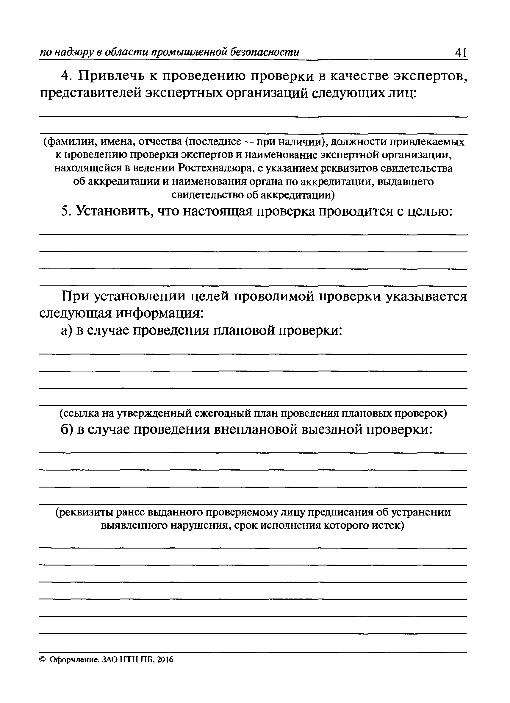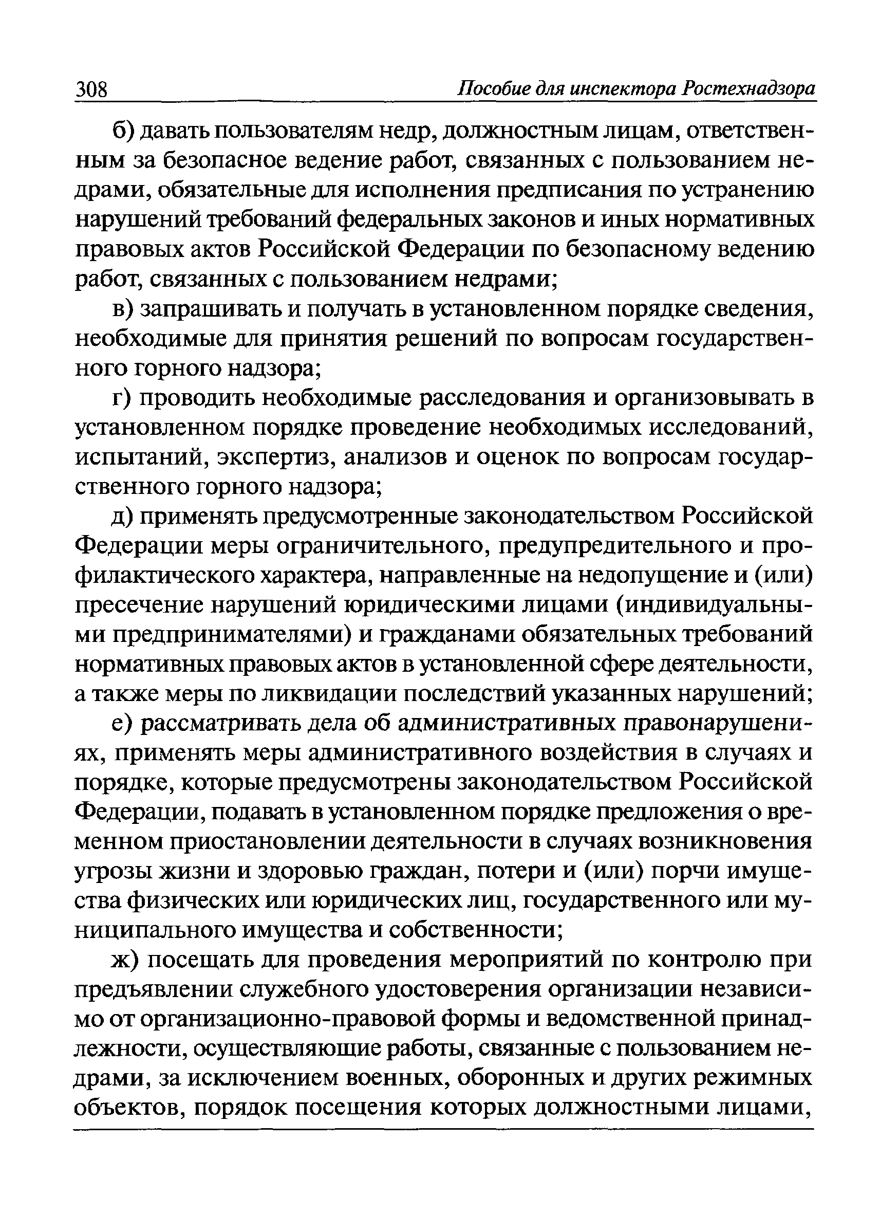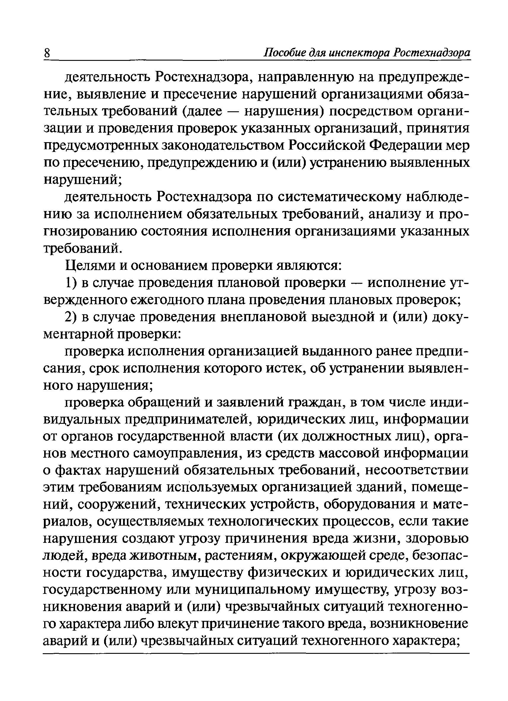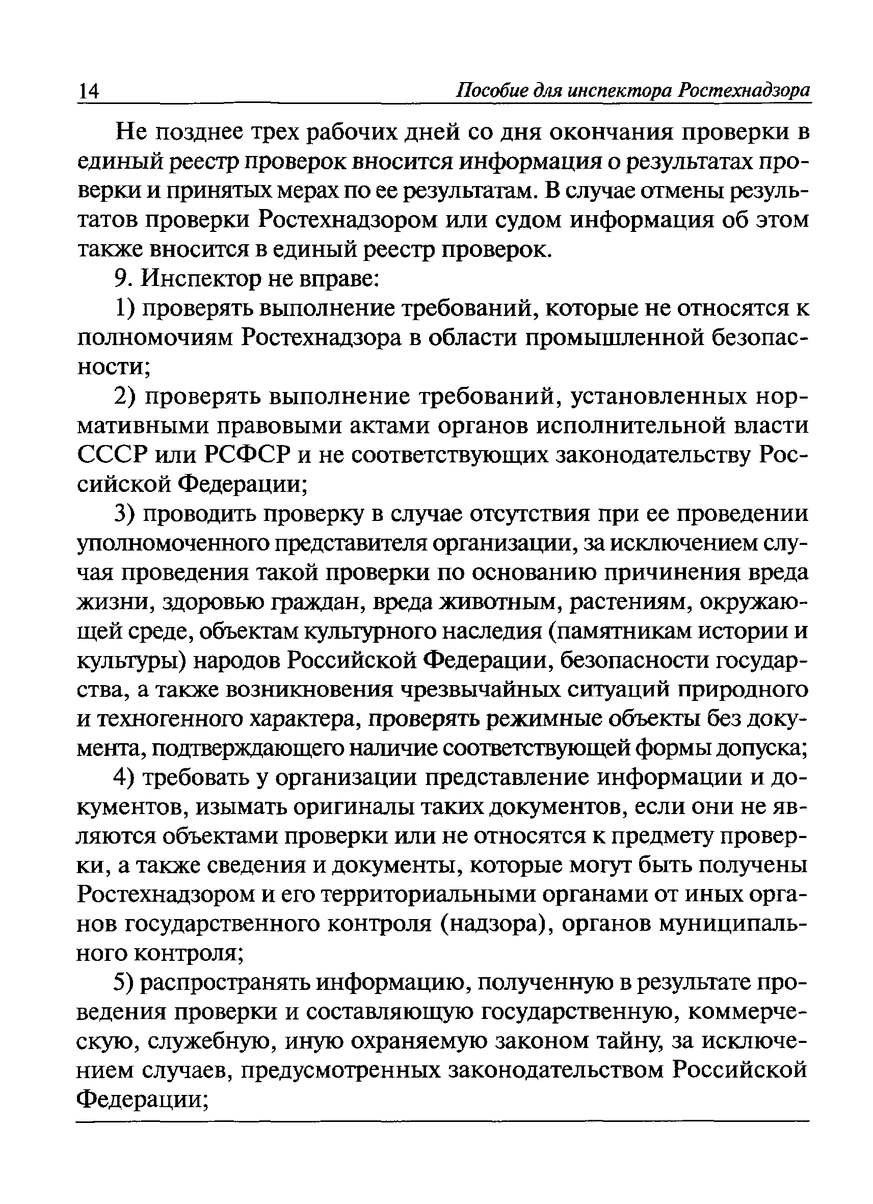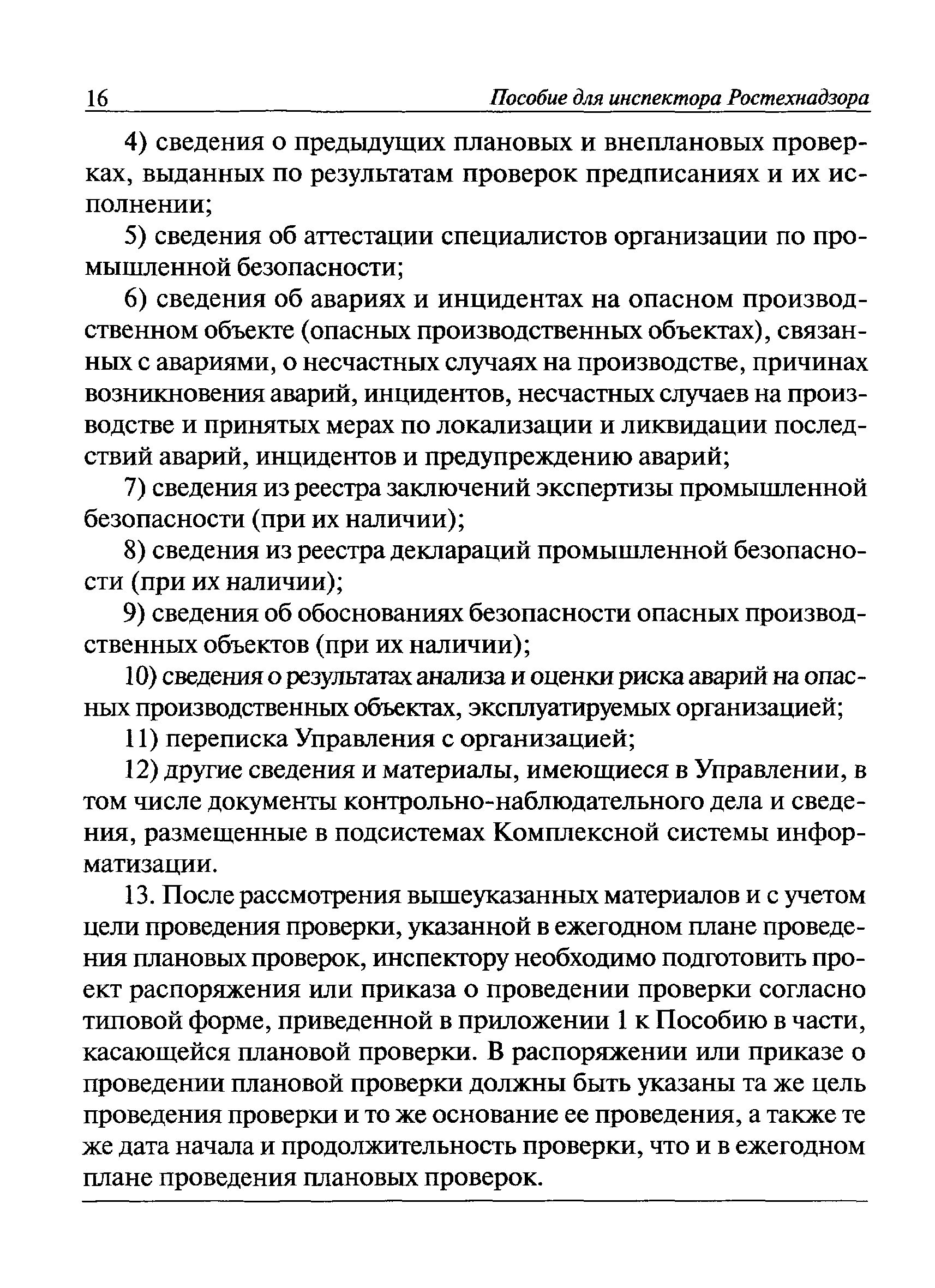 | Оглавление: | I Общие положения II Подготовка к проведению плановой проверки III Проведение плановой проверки IV Проведение документарной проверки V Особенности проведения внеплановой проверки VI Оформление результатов проверки VII Контроль исполнения выданного предписания VIII Особенности проведения проверок в режиме постоянного государственного надзора на опасных производственных объектах 1 класса опасности IХ Перечень нормативных правовых актов, используемых при проведении проверки Приложение 1. Распоряжение (приказ) Приложение 2. Акт проверки территориальным органом Ростехнадзора юридического лица, индивидуального предпринимателя Приложение 3. Предписание Законодательные и иные нормативные правовые акты к Пособию для инспектора Ростехнадзора по надзору в области промышленной безопасности Федеральный закон от 21 июля 1997 г. № 116-ФЗ "О промышленной безопасности опасных производственных объектов" Закон Российской Федерации от 21 февраля 1992 г. № 2395-1 "О недрах" (извлечения) Федеральный закон от 26 декабря 2008 г. № 294-ФЗ "О защите прав юридических лиц и индивидуальных предпринимателей при осуществлении государственного контроля (надзора) и муниципального контроля" (извлечения) Федеральный закон от 27 декабря 2002 г. № 184-ФЗ "О техническом регулировании" (извлечения) Кодекс Российской Федерации об административных правонарушениях от 30 декабря 2001 г. № 195-ФЗ (извлечения) Положение о Федеральной службе по экологическому, технологическому и атомному надзору, утвержденное постановлением Правительства Российской Федерации от 30 июля 2004 г. № 401 Положение о федеральном государственном надзоре в области промышленной безопасности, утвержденное постановлением Правительства Российской Федерации от 15 ноября 2012 г. № 1170 Положение о режиме постоянного государственного надзора на опасных производственных объектах и гидротехнических сооружениях, утвержденное постановлением Правительства Российской Федерации от 5 мая 2012 г. № 455 Положение о государственном надзоре за безопасным ведением работ, связанных с пользованием недрами, утвержденное постановлением Правительства Российской Федерации от 2 февраля 2010 г. № 39 Постановление Правительства Российской Федерации от 13 мая 2013 г. № 407 "0б уполномоченных органах Российской Федерации по обеспечению государственного контроля (надзора) за соблюдением требований технических регламентов Таможенного союза" Постановление Правительства Российской Федерации от 23 декабря 2014 г. № 1447 "0б уполномоченных органах Российской Федерации по обеспечению государственного контроля (надзора) за соблюдением требований технического регламента Таможенного союза "О безопасности взрывчатых веществ и изделий на их основе" Административный регламент по исполнению Федеральной службой по экологическом технологическому и атомному надзору государственной функции по осуществлению контроля и надзора за соблюдением требований промышленной безопасности при проектировании, строительстве, эксплуатации, консервации опасных веществ на опасных производственных объектах, утвержденный приказом Минприроды России от 30 октября 2008 г. № 280 |