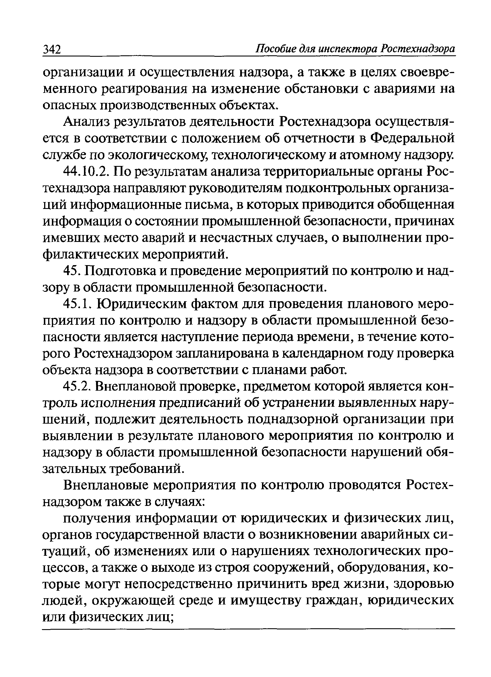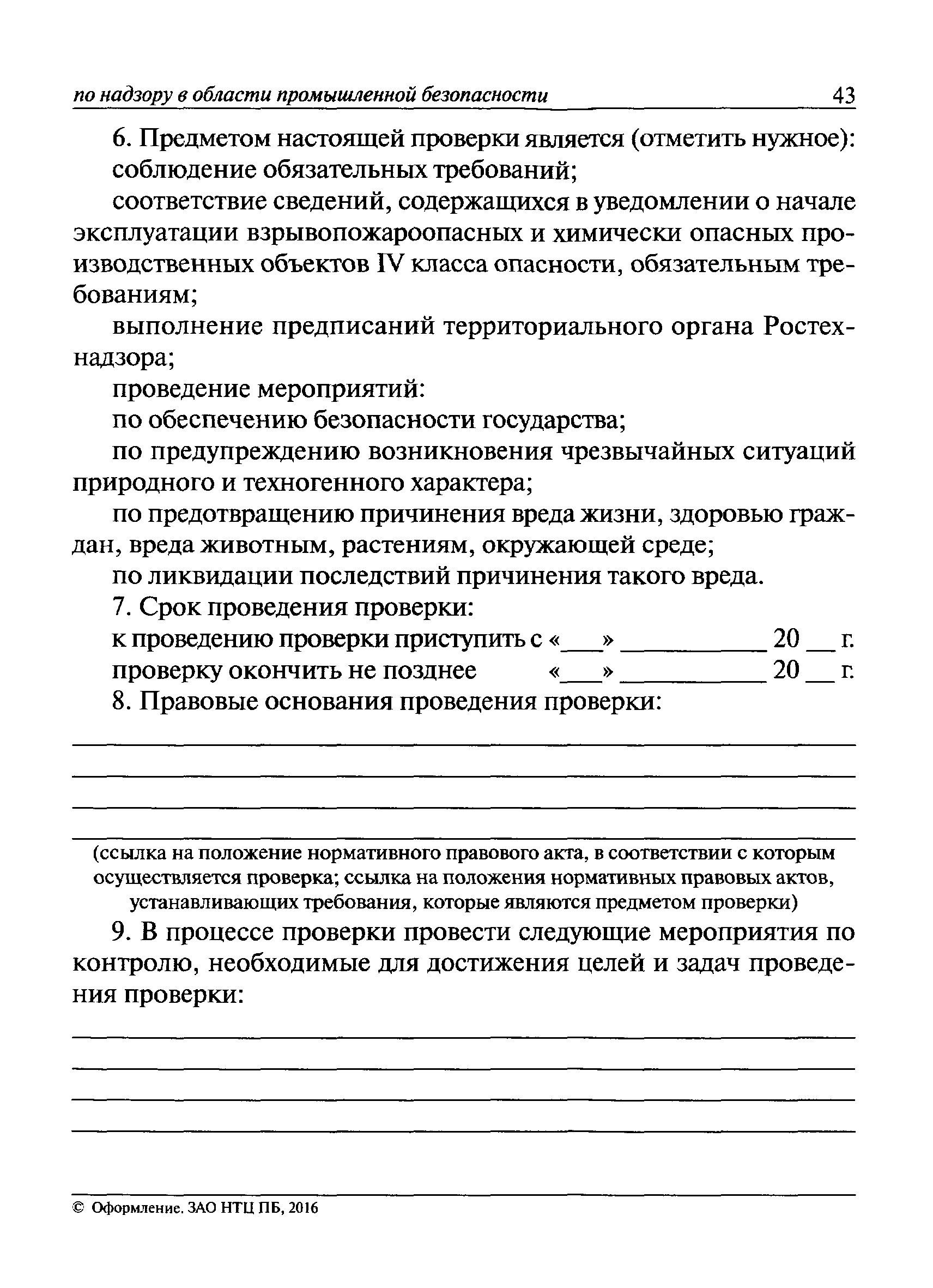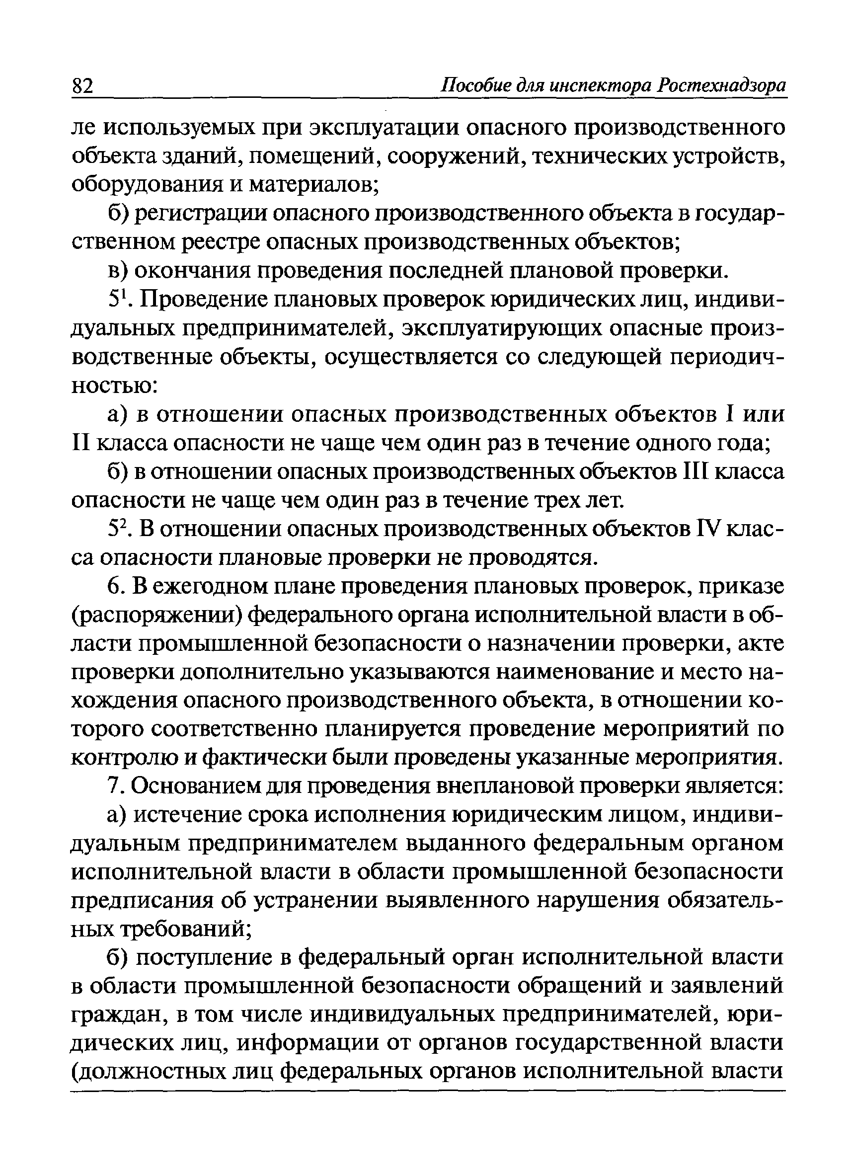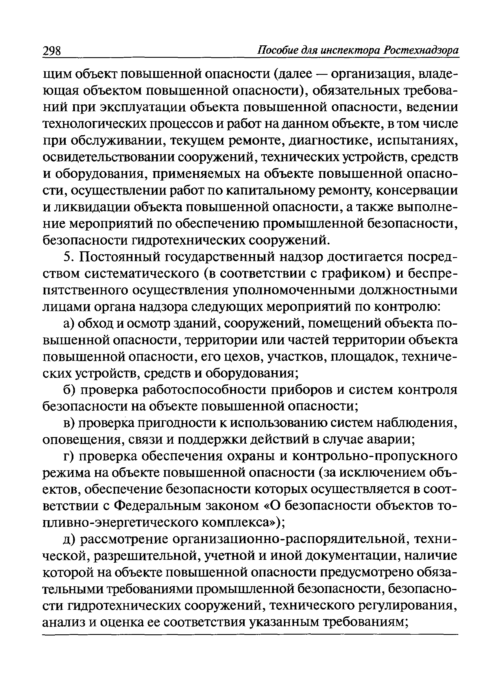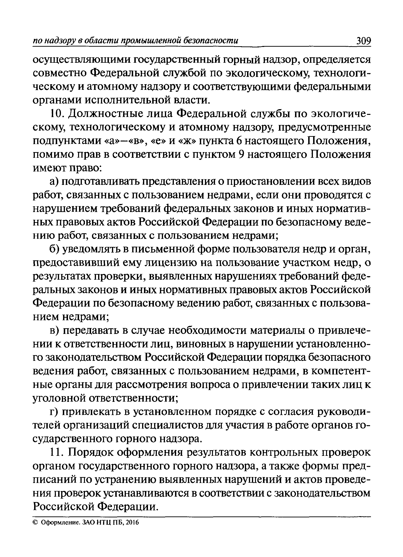 | Оглавление: | I Общие положения II Подготовка к проведению плановой проверки III Проведение плановой проверки IV Проведение документарной проверки V Особенности проведения внеплановой проверки VI Оформление результатов проверки VII Контроль исполнения выданного предписания VIII Особенности проведения проверок в режиме постоянного государственного надзора на опасных производственных объектах 1 класса опасности IХ Перечень нормативных правовых актов, используемых при проведении проверки Приложение 1. Распоряжение (приказ) Приложение 2. Акт проверки территориальным органом Ростехнадзора юридического лица, индивидуального предпринимателя Приложение 3. Предписание Законодательные и иные нормативные правовые акты к Пособию для инспектора Ростехнадзора по надзору в области промышленной безопасности Федеральный закон от 21 июля 1997 г. № 116-ФЗ "О промышленной безопасности опасных производственных объектов" Закон Российской Федерации от 21 февраля 1992 г. № 2395-1 "О недрах" (извлечения) Федеральный закон от 26 декабря 2008 г. № 294-ФЗ "О защите прав юридических лиц и индивидуальных предпринимателей при осуществлении государственного контроля (надзора) и муниципального контроля" (извлечения) Федеральный закон от 27 декабря 2002 г. № 184-ФЗ "О техническом регулировании" (извлечения) Кодекс Российской Федерации об административных правонарушениях от 30 декабря 2001 г. № 195-ФЗ (извлечения) Положение о Федеральной службе по экологическому, технологическому и атомному надзору, утвержденное постановлением Правительства Российской Федерации от 30 июля 2004 г. № 401 Положение о федеральном государственном надзоре в области промышленной безопасности, утвержденное постановлением Правительства Российской Федерации от 15 ноября 2012 г. № 1170 Положение о режиме постоянного государственного надзора на опасных производственных объектах и гидротехнических сооружениях, утвержденное постановлением Правительства Российской Федерации от 5 мая 2012 г. № 455 Положение о государственном надзоре за безопасным ведением работ, связанных с пользованием недрами, утвержденное постановлением Правительства Российской Федерации от 2 февраля 2010 г. № 39 Постановление Правительства Российской Федерации от 13 мая 2013 г. № 407 "0б уполномоченных органах Российской Федерации по обеспечению государственного контроля (надзора) за соблюдением требований технических регламентов Таможенного союза" Постановление Правительства Российской Федерации от 23 декабря 2014 г. № 1447 "0б уполномоченных органах Российской Федерации по обеспечению государственного контроля (надзора) за соблюдением требований технического регламента Таможенного союза "О безопасности взрывчатых веществ и изделий на их основе" Административный регламент по исполнению Федеральной службой по экологическом технологическому и атомному надзору государственной функции по осуществлению контроля и надзора за соблюдением требований промышленной безопасности при проектировании, строительстве, эксплуатации, консервации опасных веществ на опасных производственных объектах, утвержденный приказом Минприроды России от 30 октября 2008 г. № 280 |